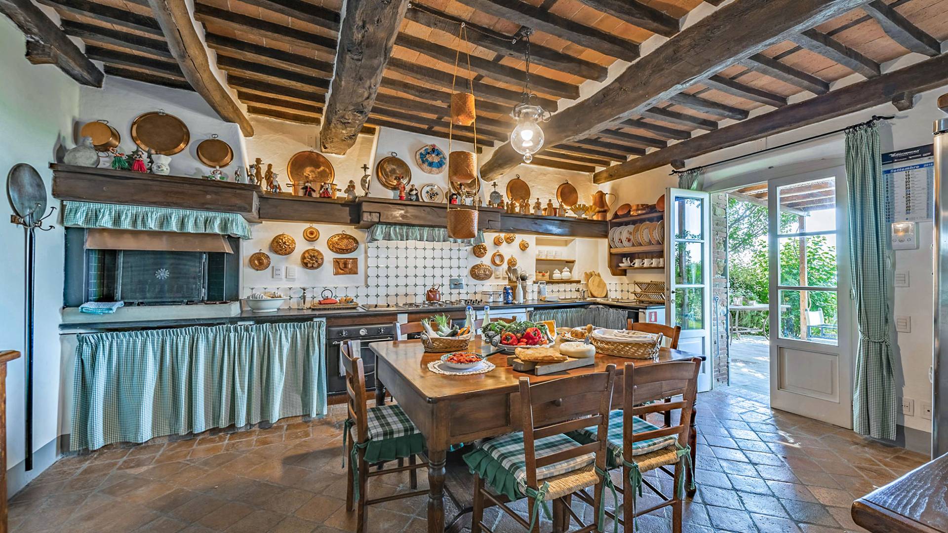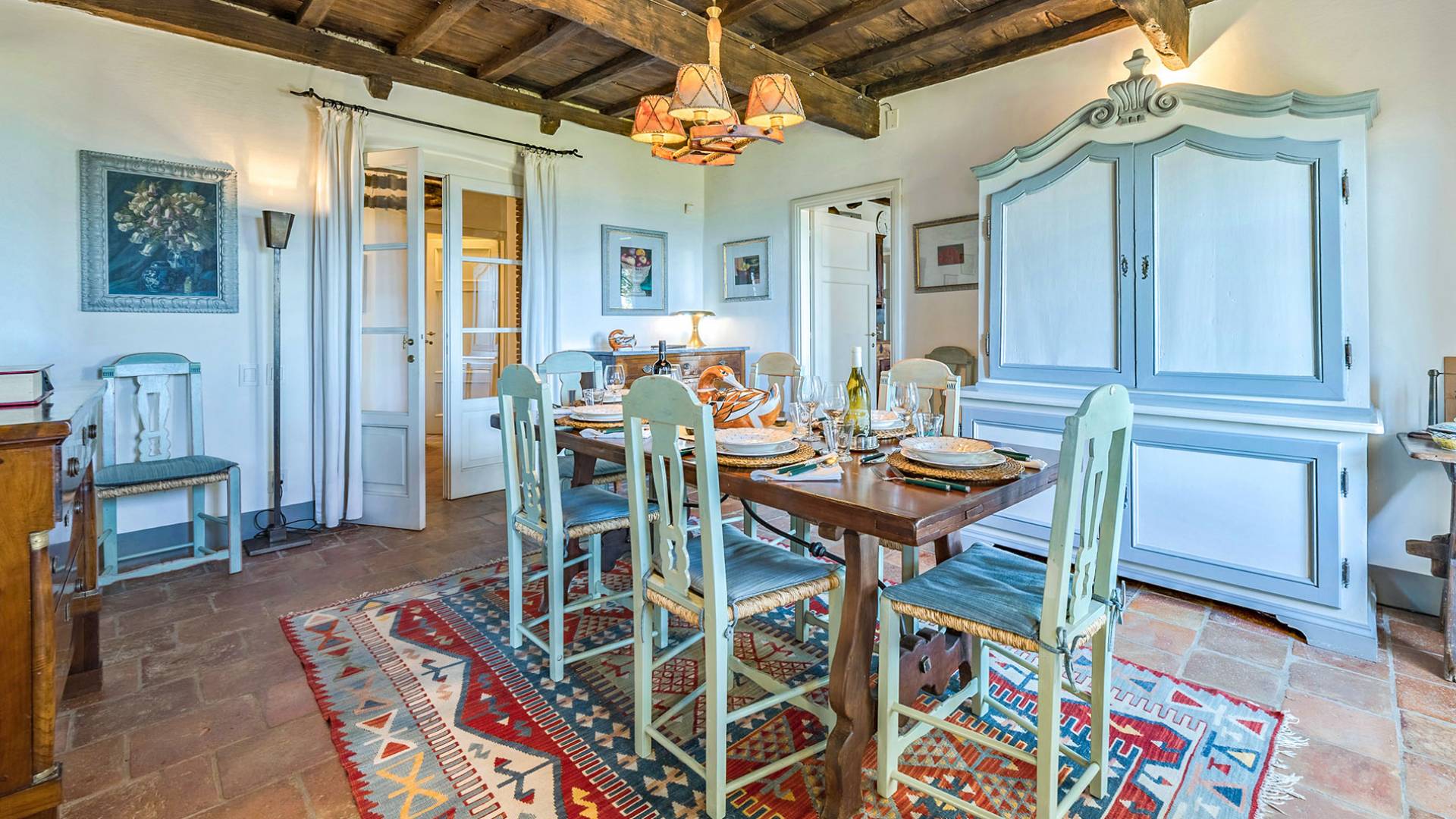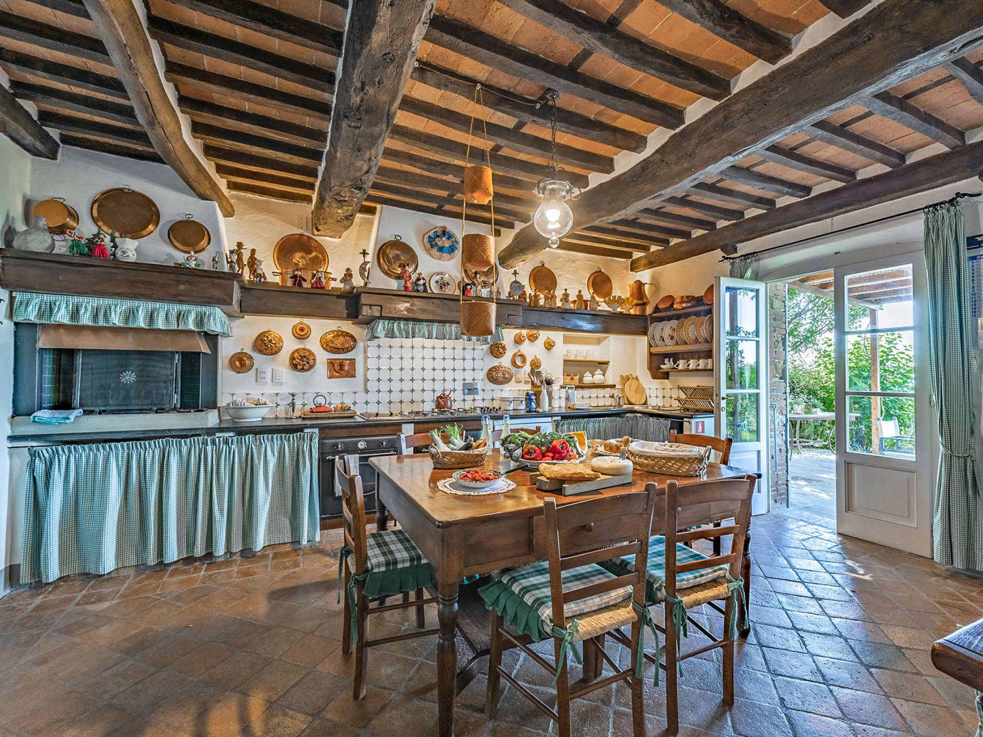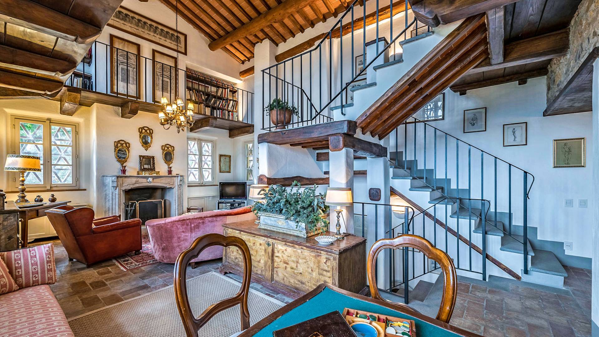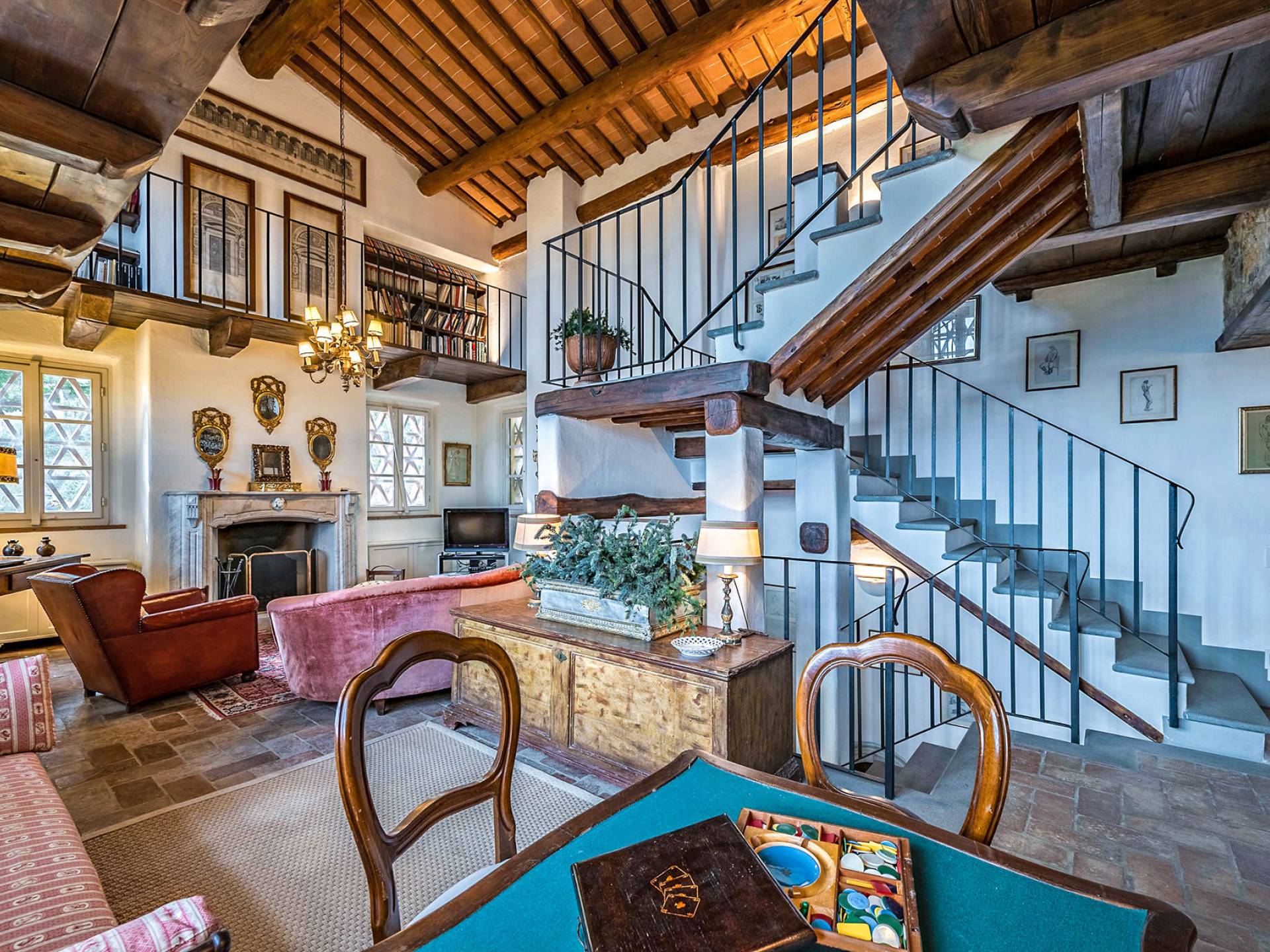The villa's interior presents a perfect fusion of modern and functional furnishings mixed together with elegant and antique pieces. The rooms are spacious with high ceilings displaying their original wooden beams. The floors have maintained their original red terracotta tiles, and the warm and traditional atmosphere is completed with fine furniture.