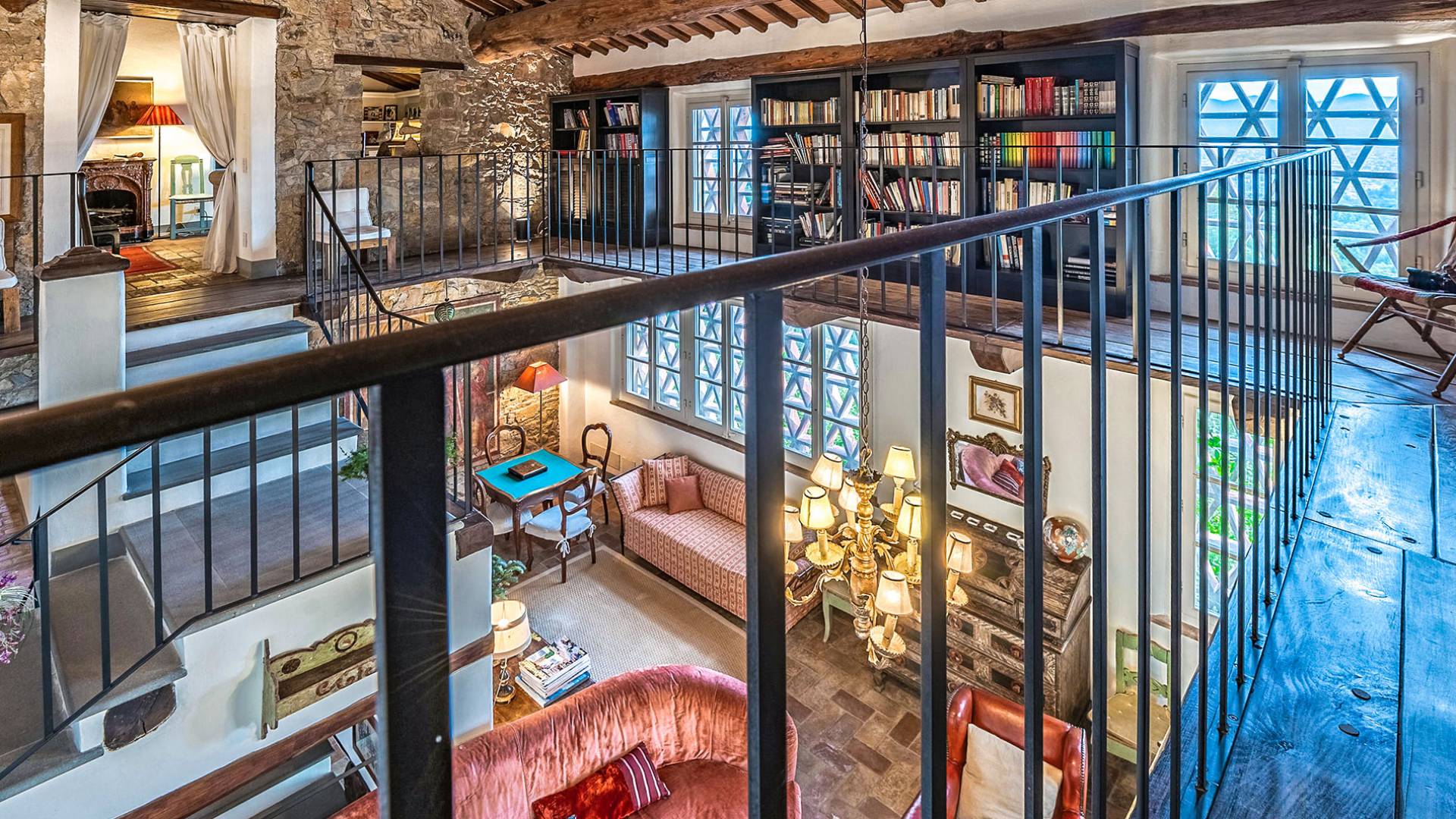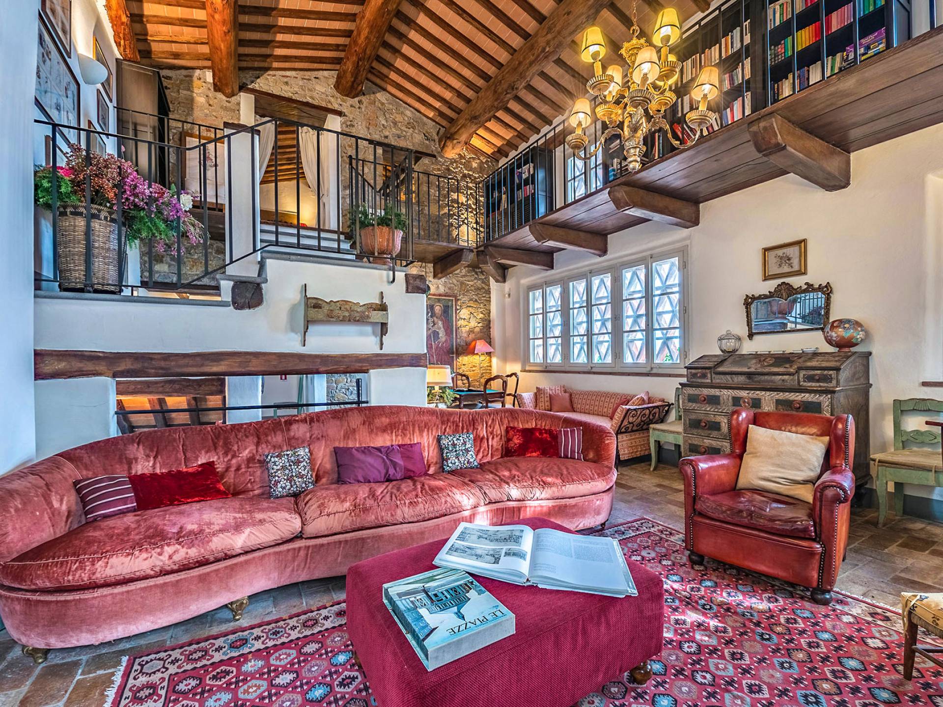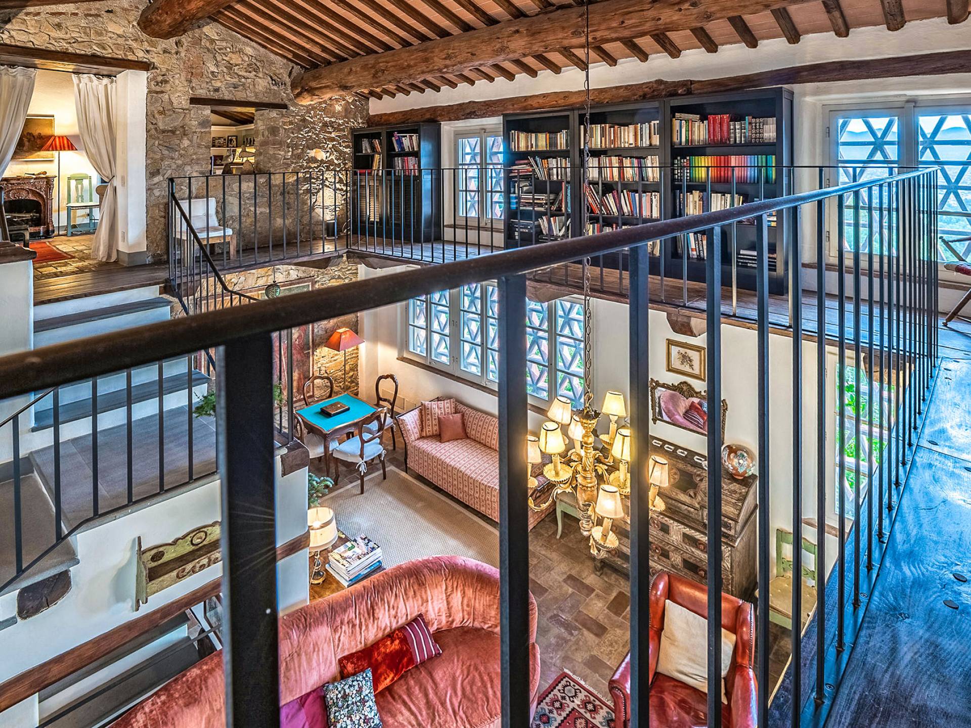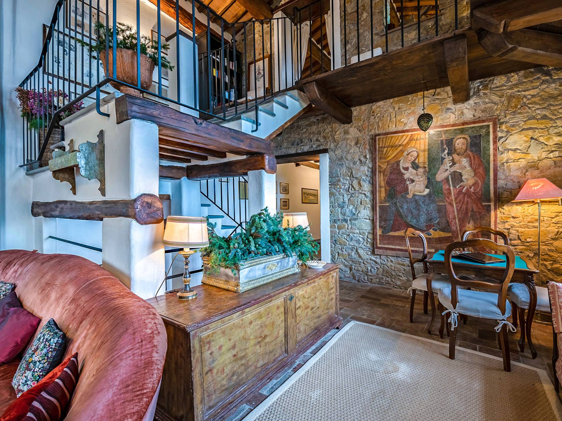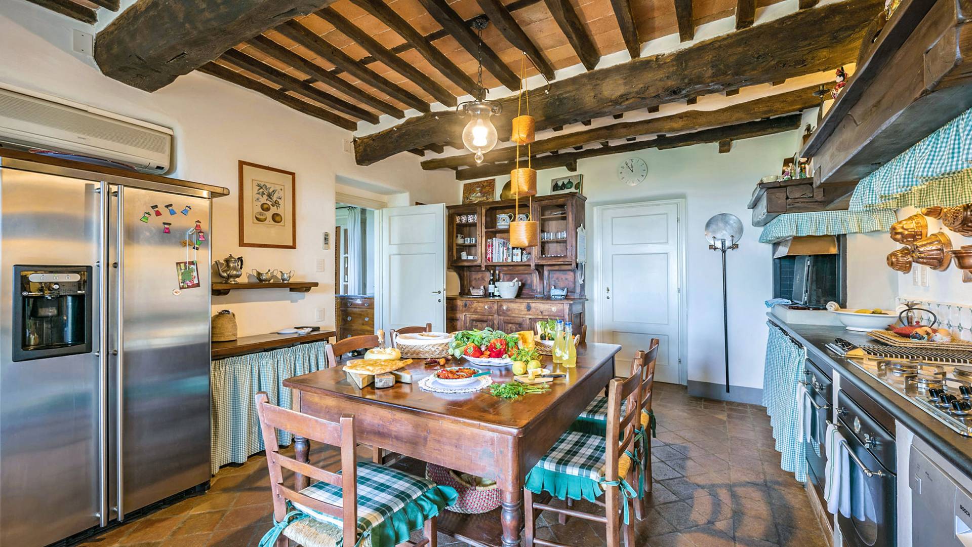 The villa's interior presents a perfect fusion of modern and functional furnishings mixed together with elegant and antique pieces. The rooms are spacious with high ceilings displaying their original wooden beams. The floors have maintained their original red terracotta tiles, and the warm and traditional atmosphere is completed with fine furniture.