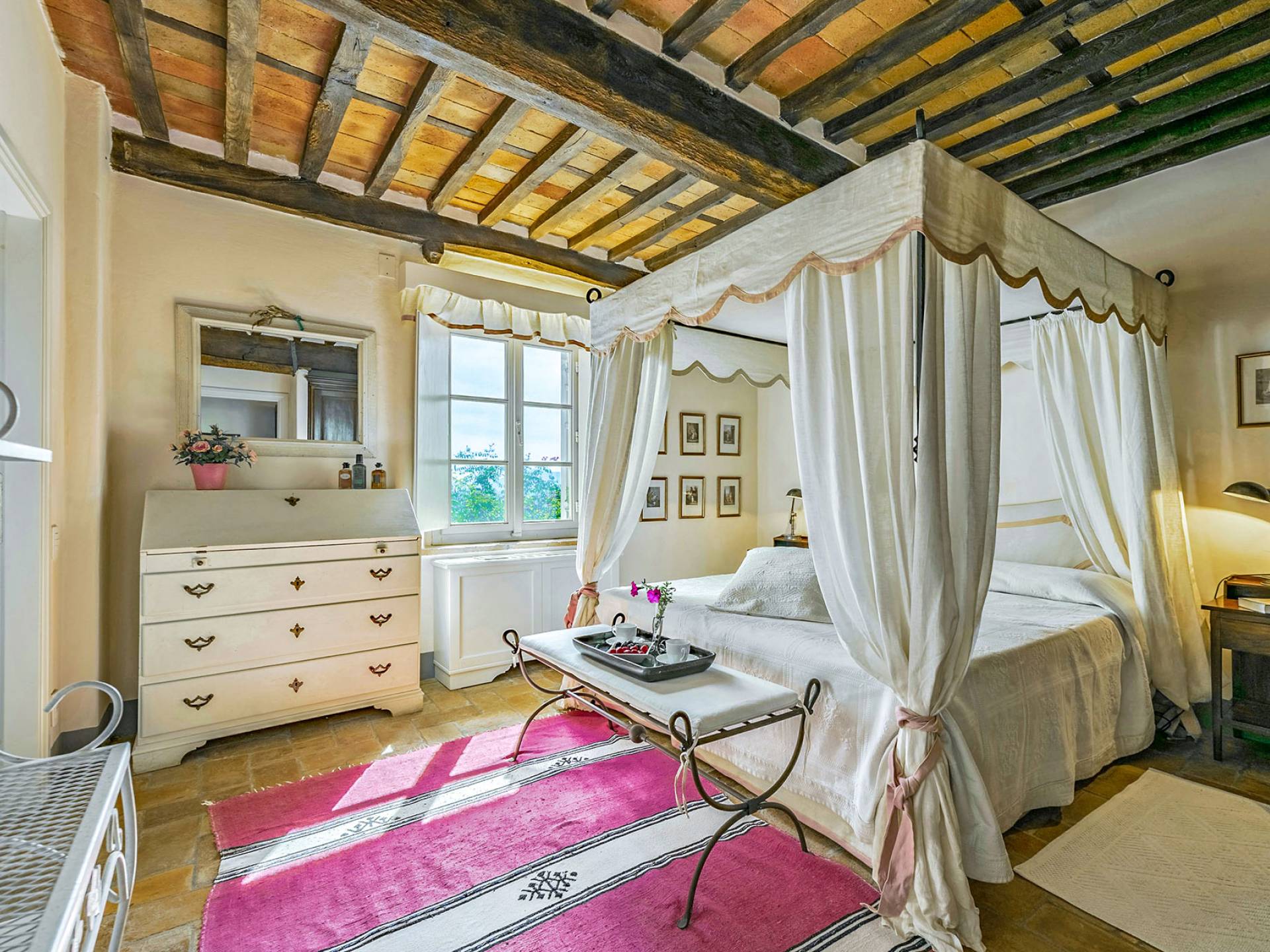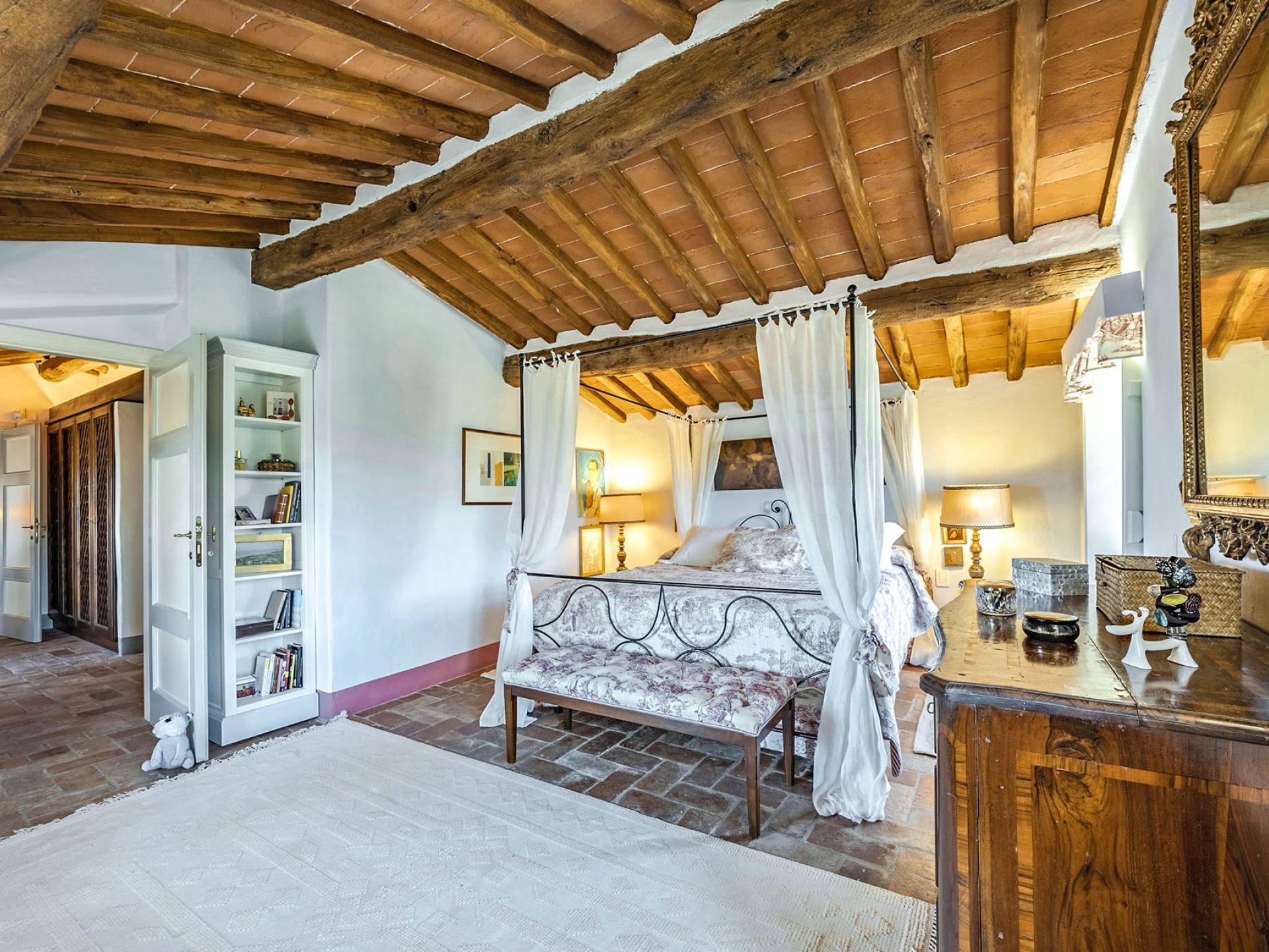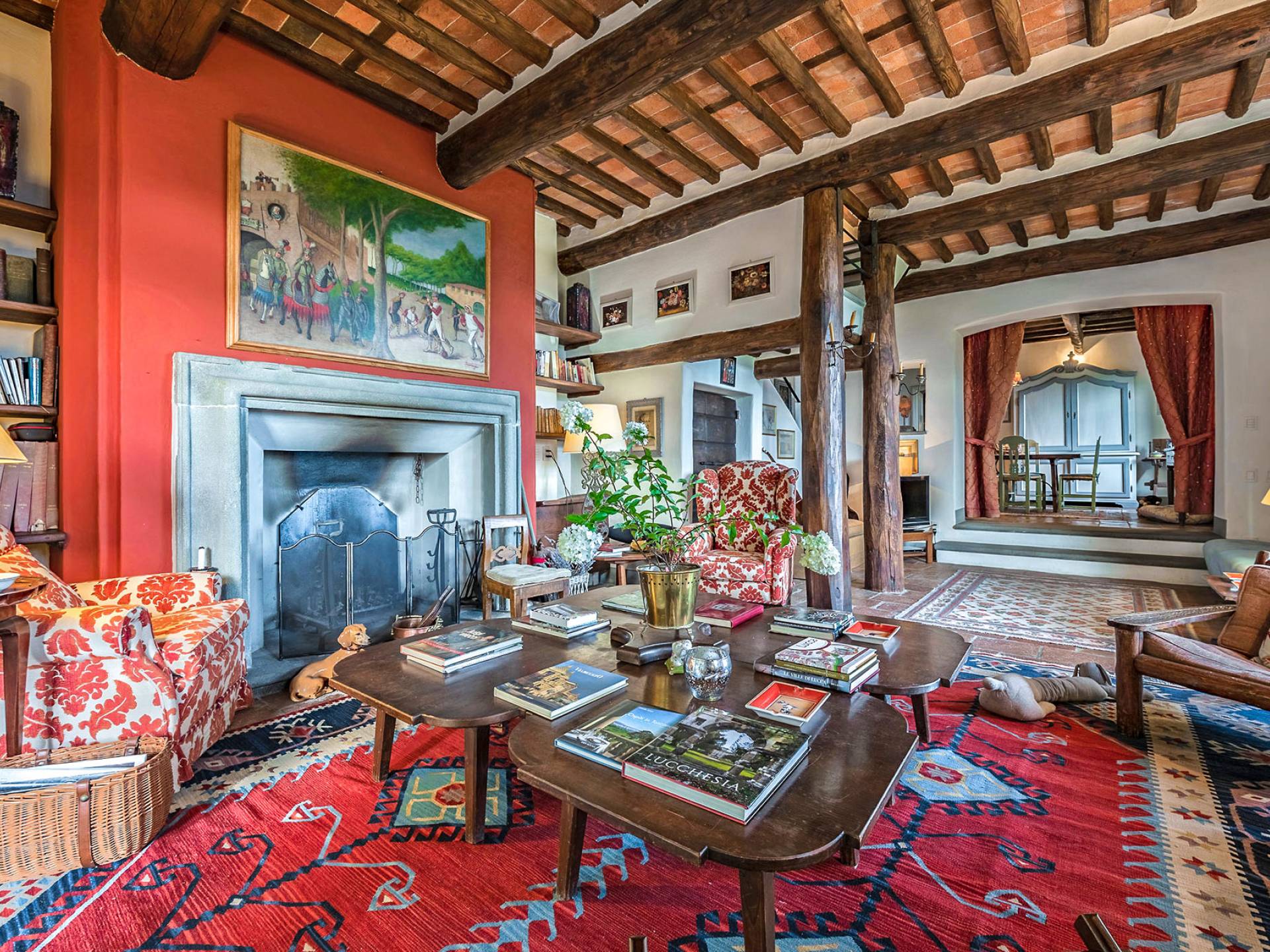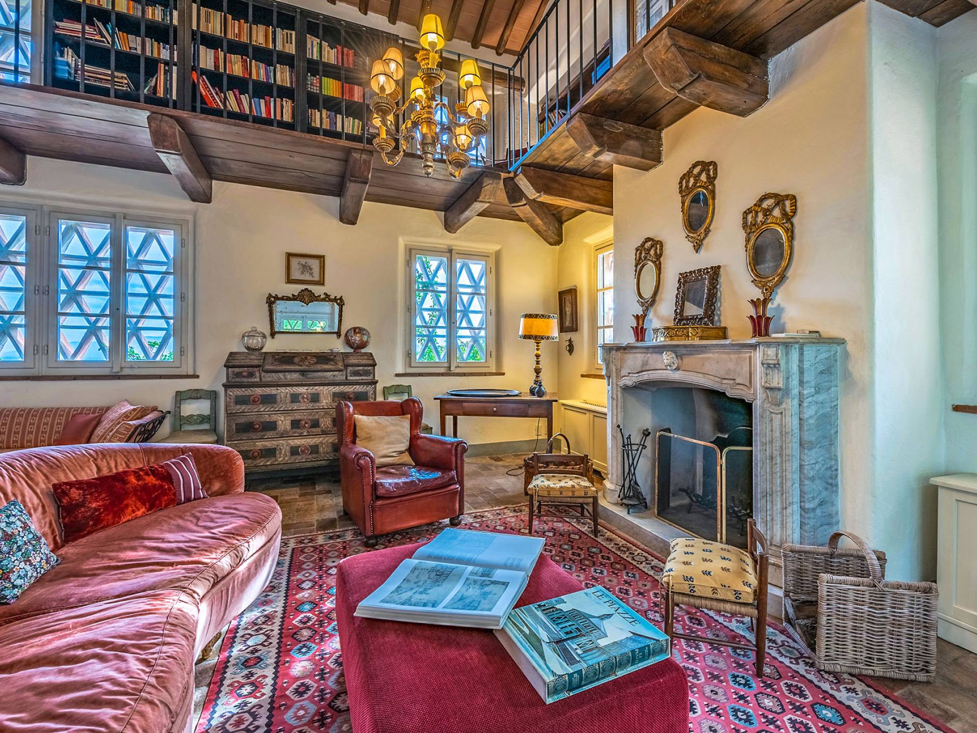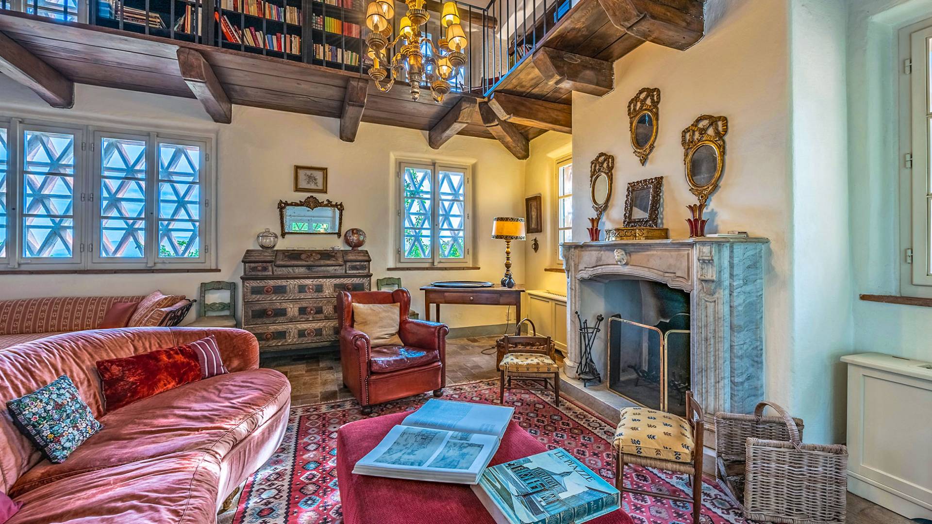 The villa's interior presents a perfect fusion of modern and functional furnishings mixed together with elegant and antique pieces. The rooms are spacious with high ceilings displaying their original wooden beams. The floors have maintained their original red terracotta tiles, and the warm and traditional atmosphere is completed with fine furniture.