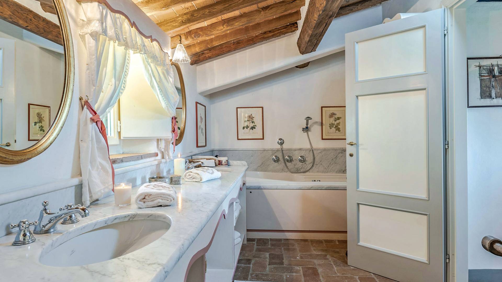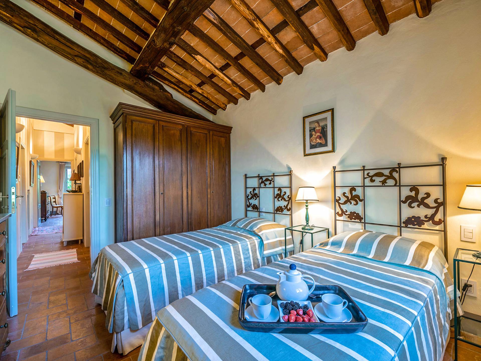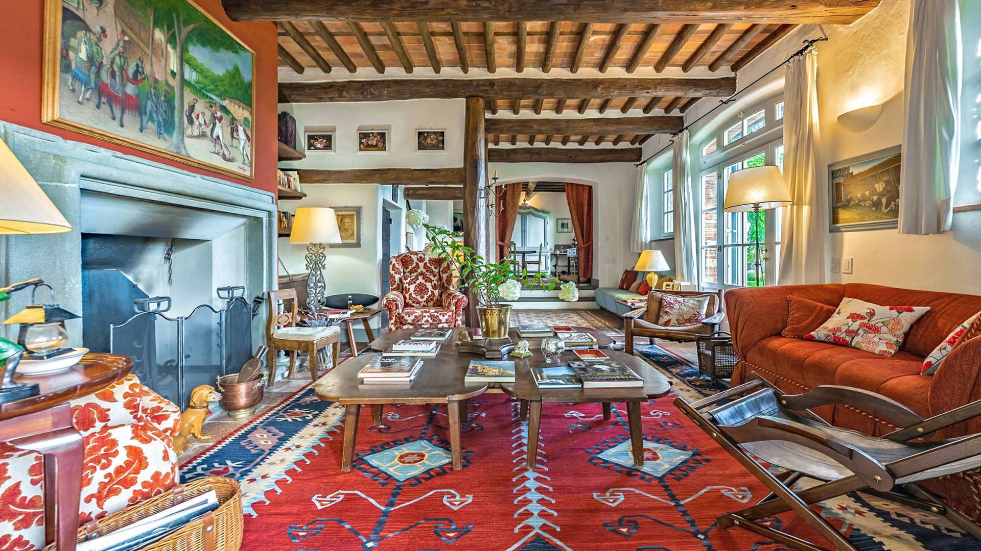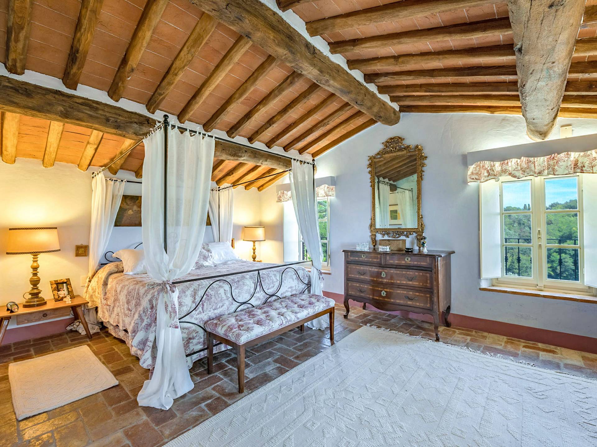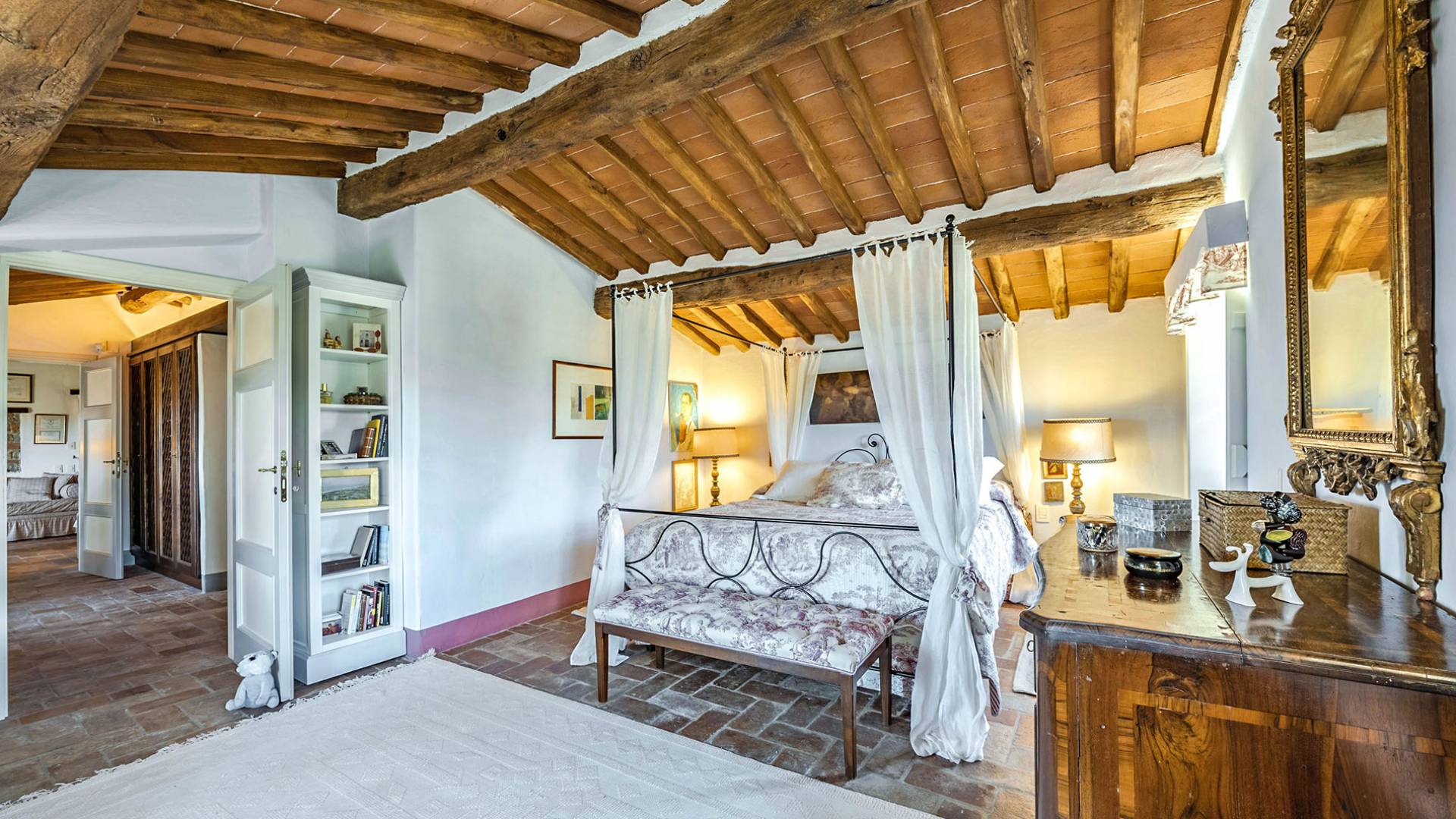 The villa's interior presents a perfect fusion of modern and functional furnishings mixed together with elegant and antique pieces. The rooms are spacious with high ceilings displaying their original wooden beams. The floors have maintained their original red terracotta tiles, and the warm and traditional atmosphere is completed with fine furniture.