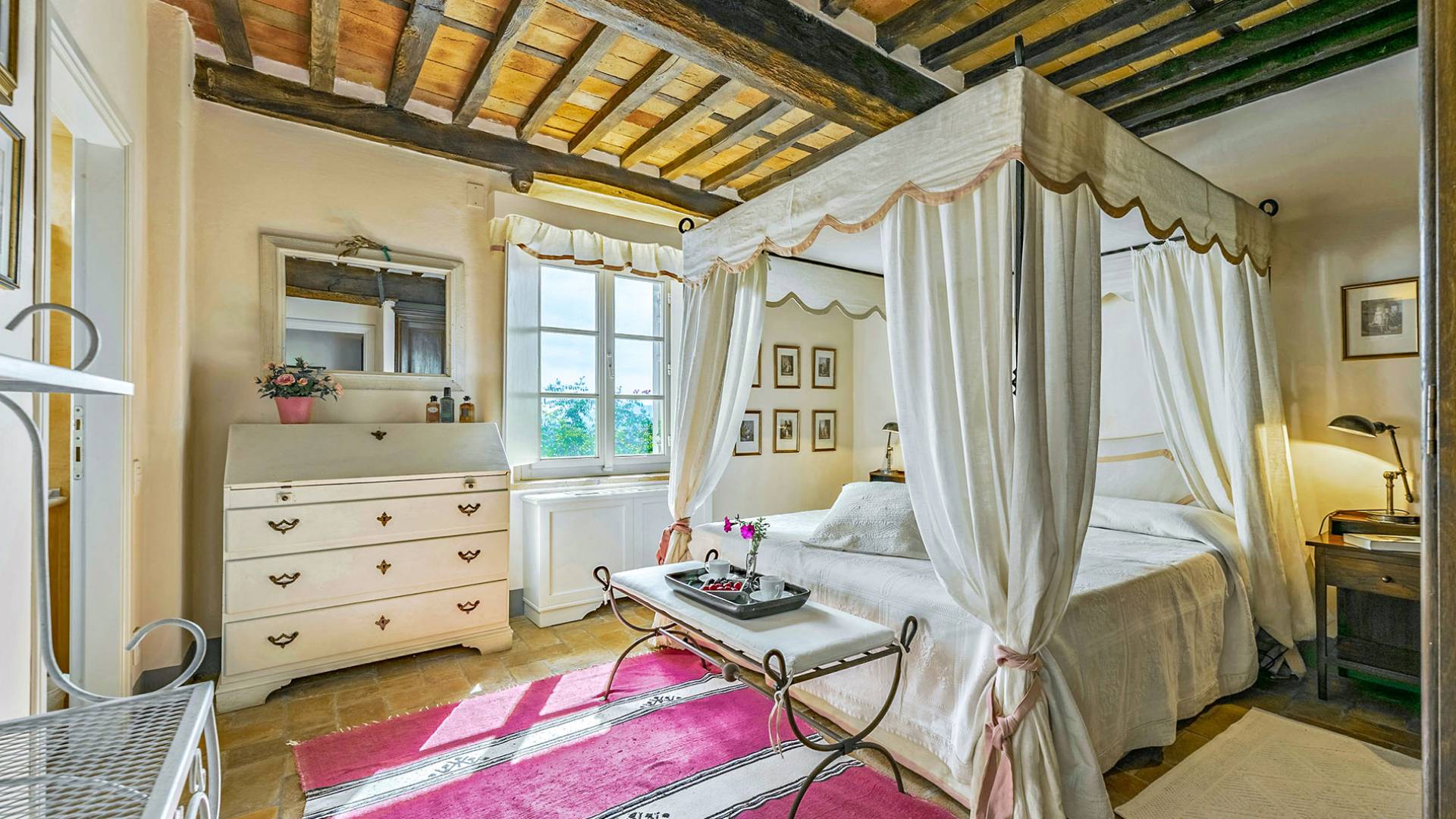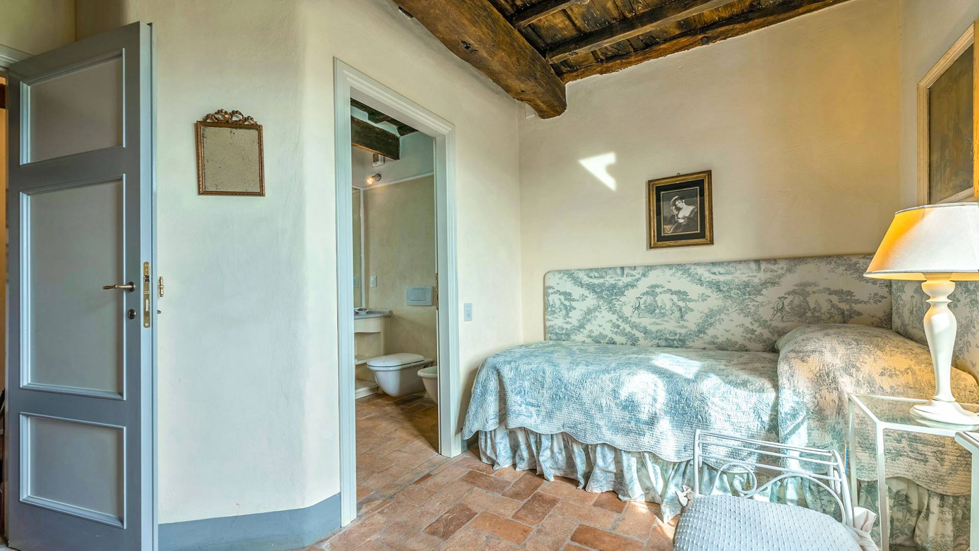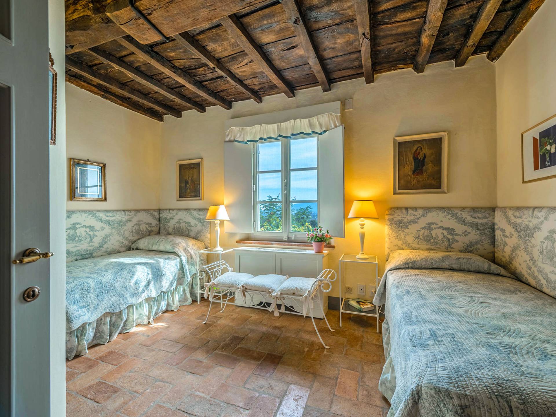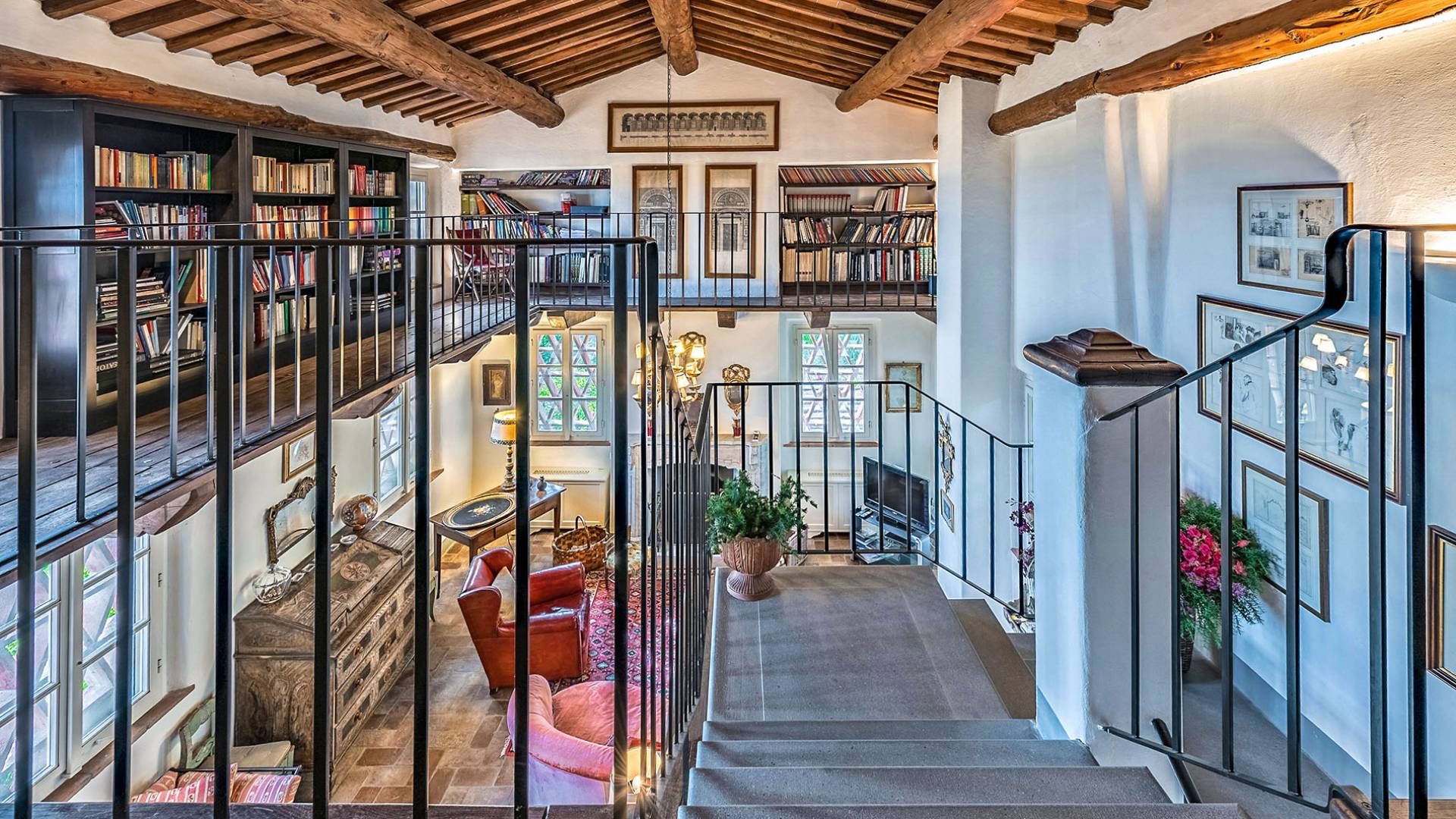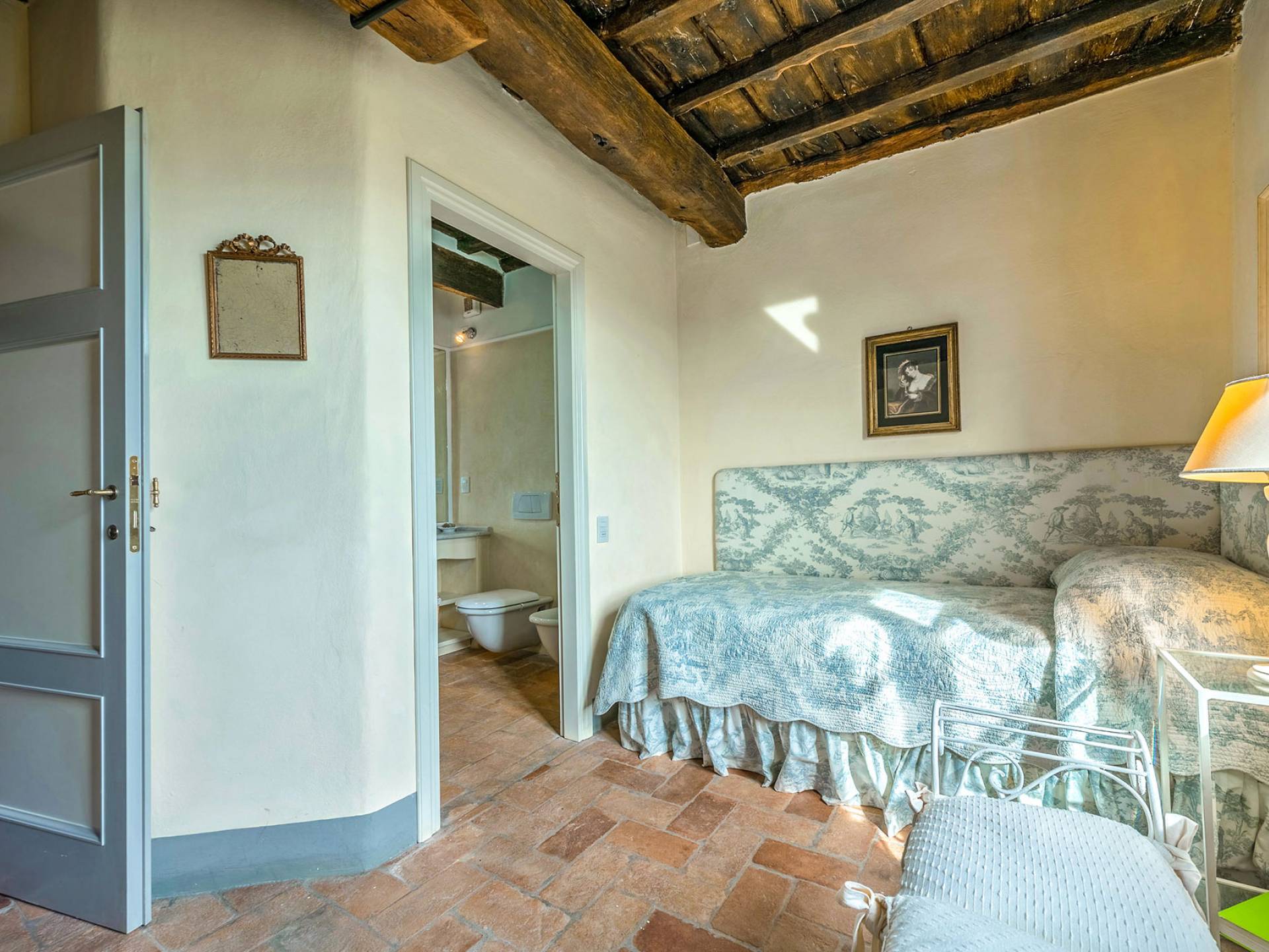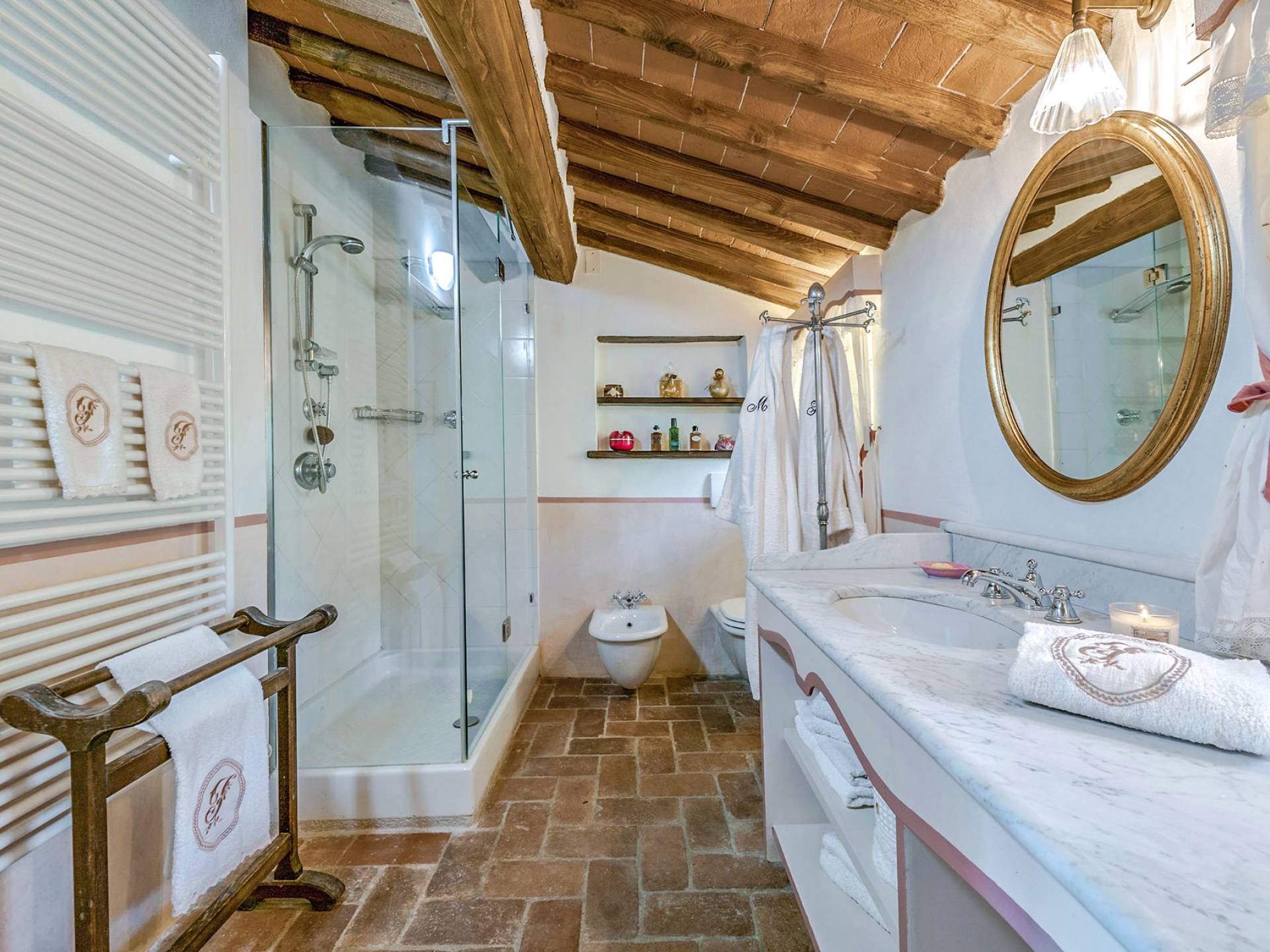 The villa's interior presents a perfect fusion of modern and functional furnishings mixed together with elegant and antique pieces. The rooms are spacious with high ceilings displaying their original wooden beams. The floors have maintained their original red terracotta tiles, and the warm and traditional atmosphere is completed with fine furniture.
