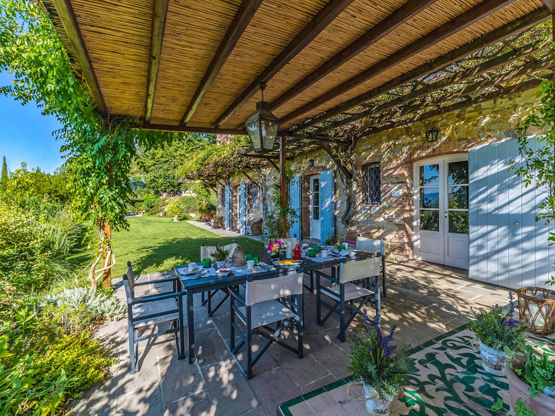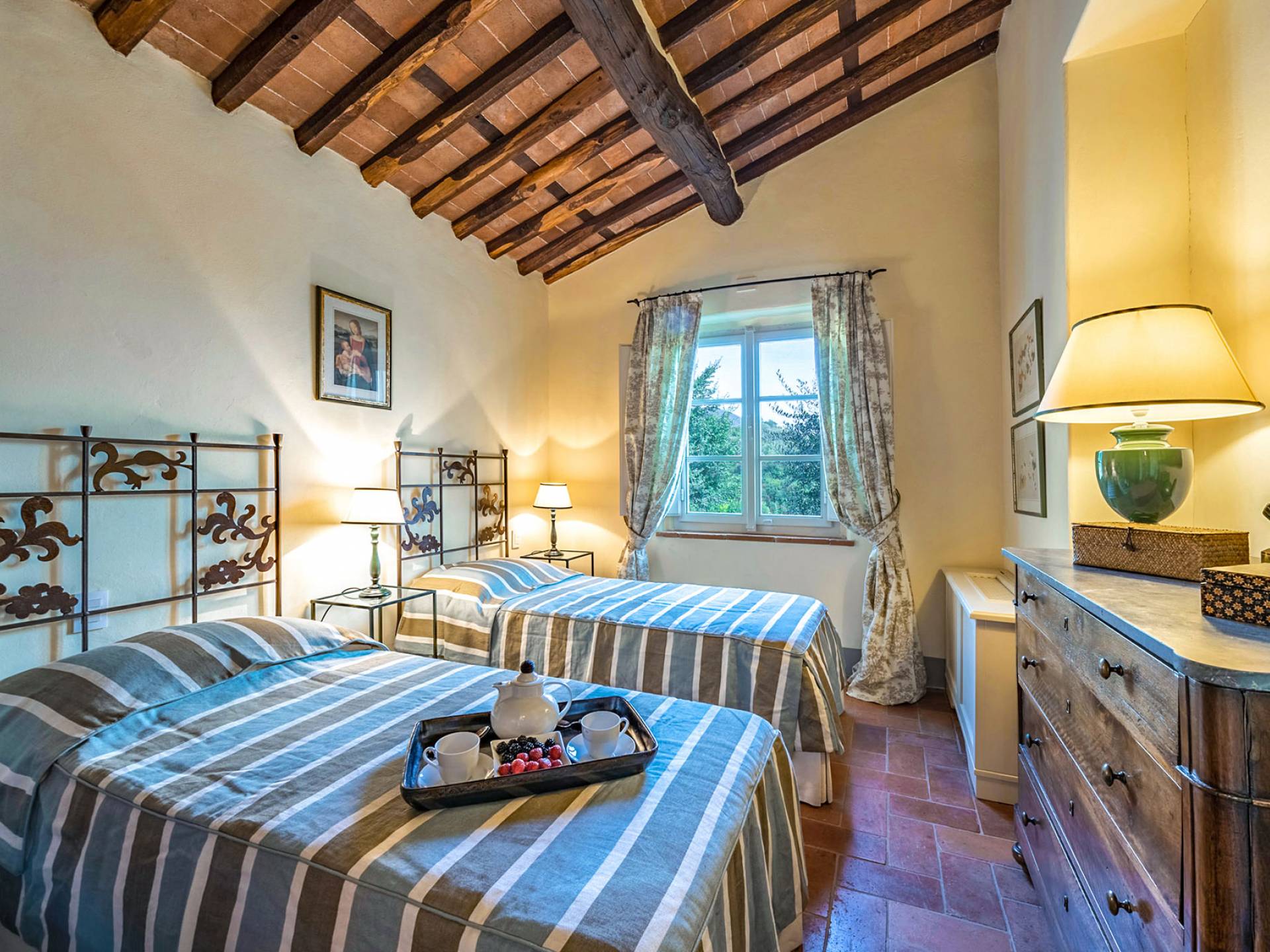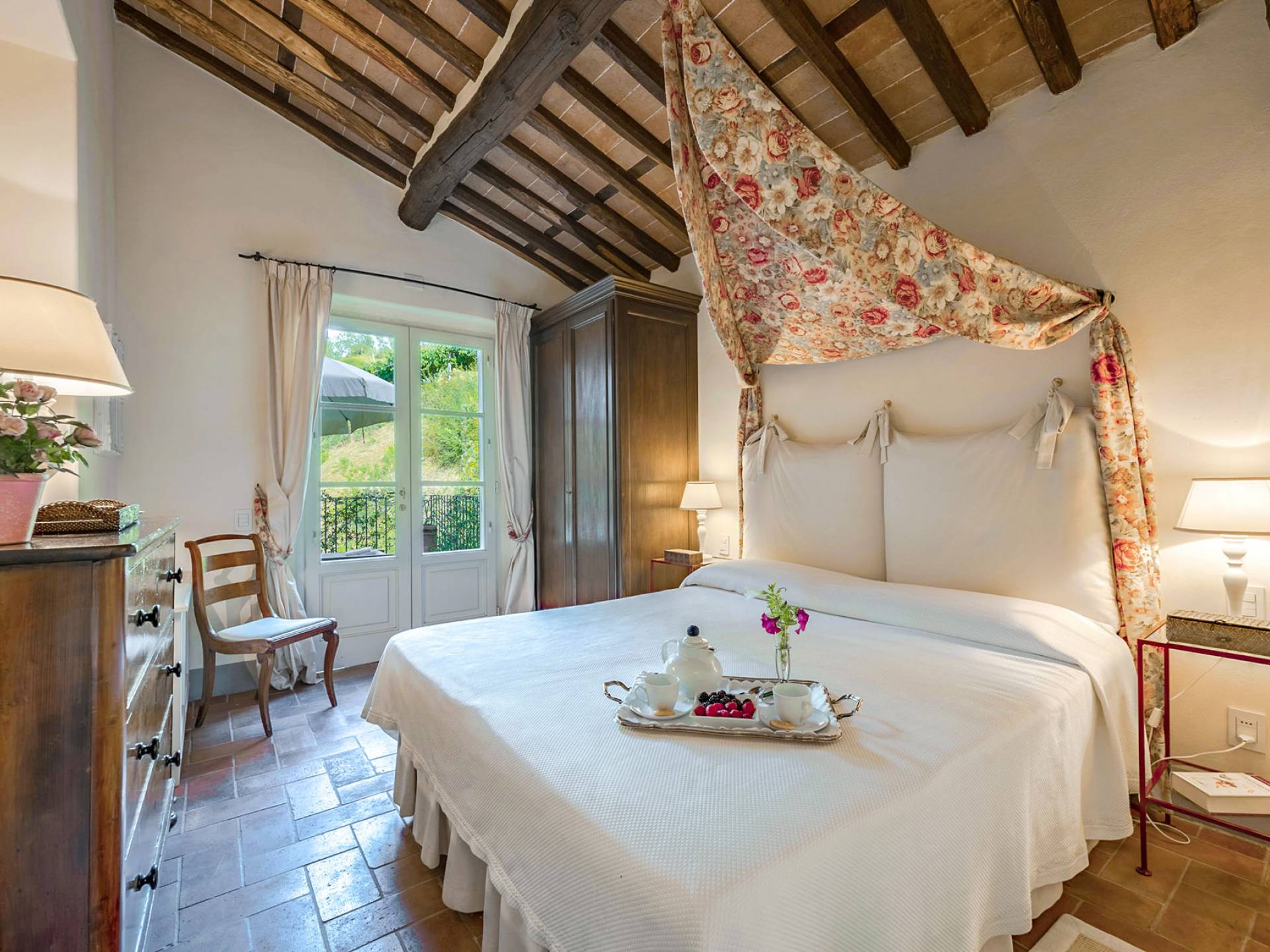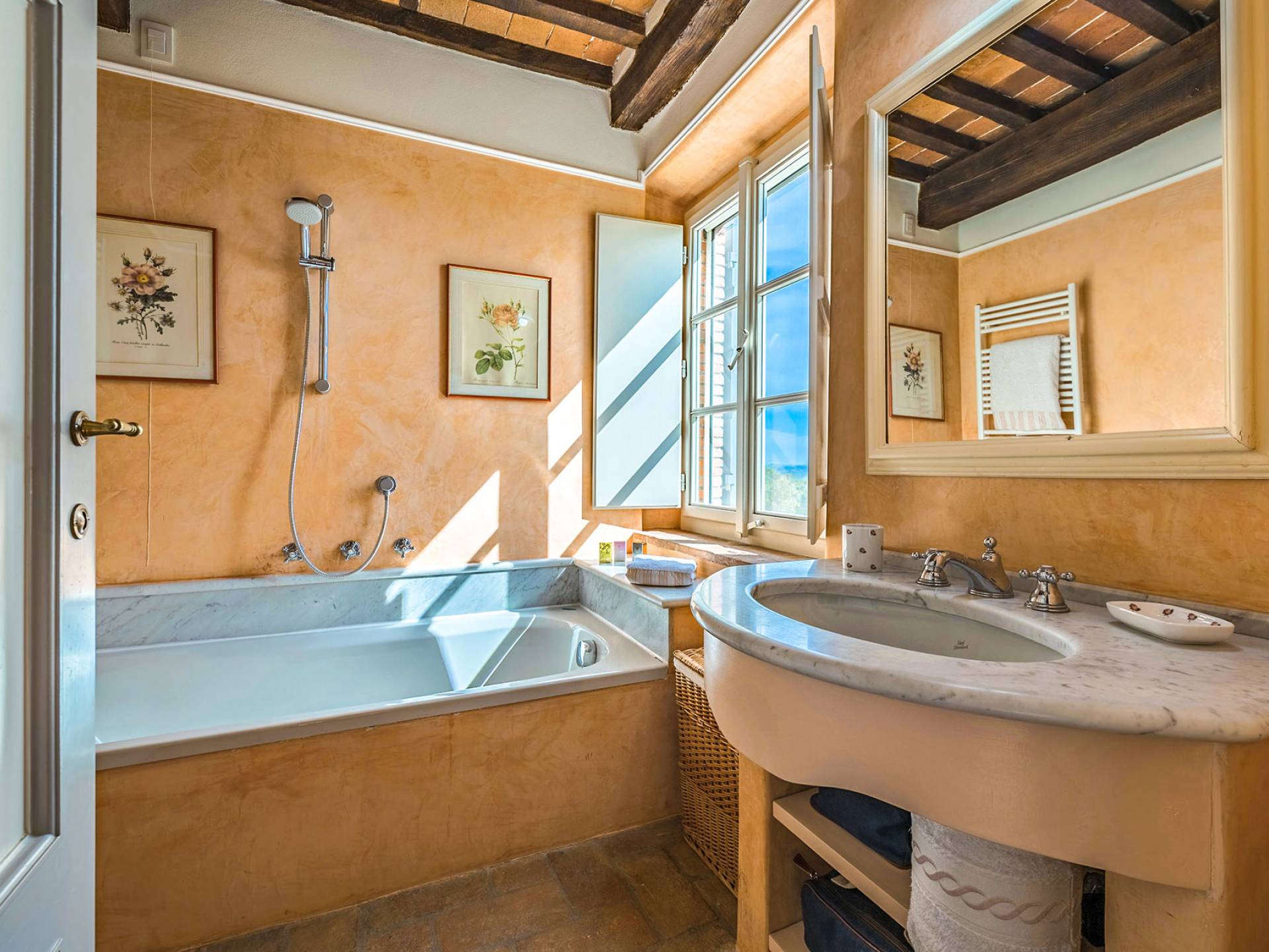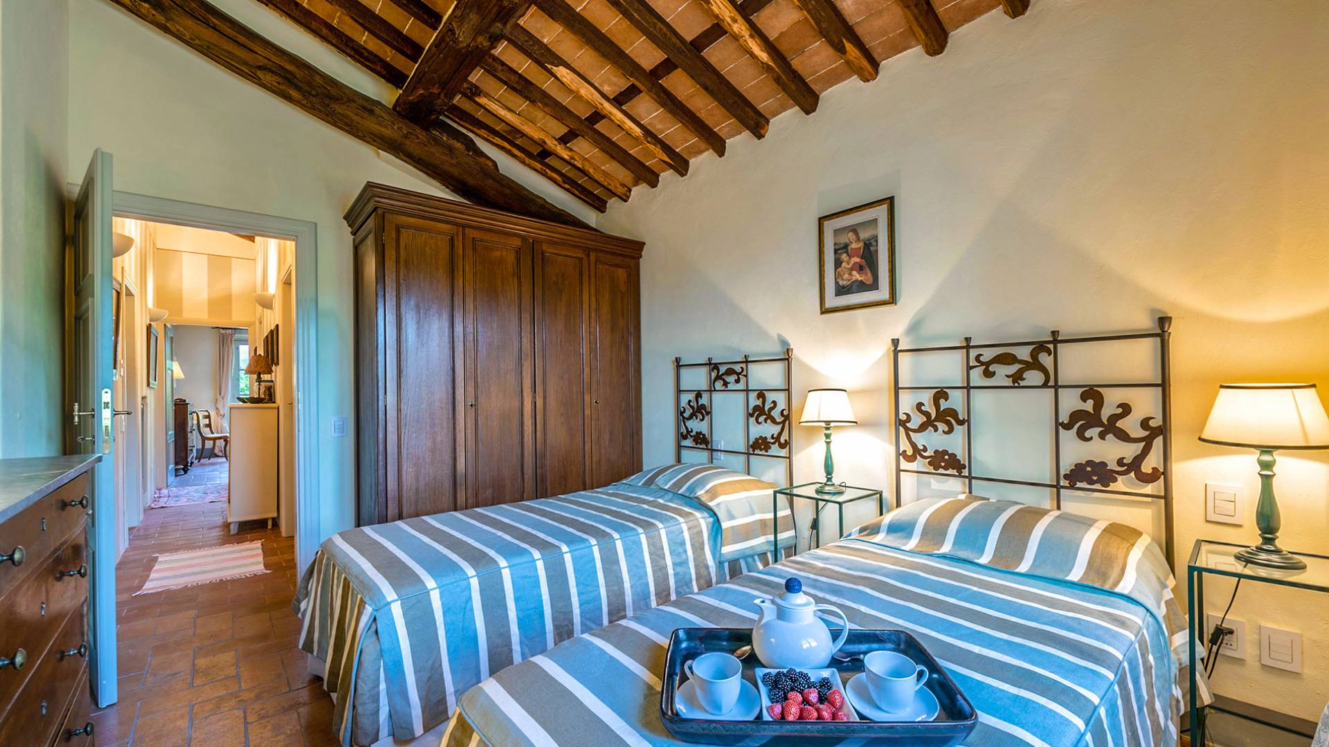 The villa's interior presents a perfect fusion of modern and functional furnishings mixed together with elegant and antique pieces. The rooms are spacious with high ceilings displaying their original wooden beams. The floors have maintained their original red terracotta tiles, and the warm and traditional atmosphere is completed with fine furniture.