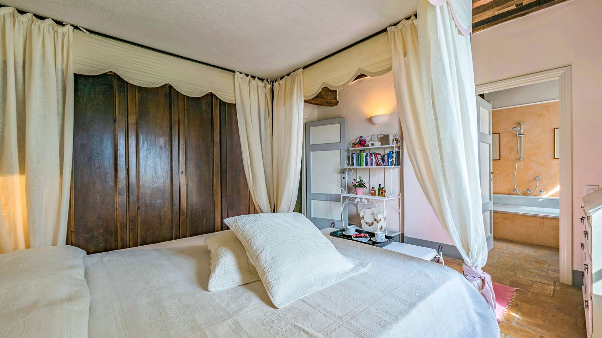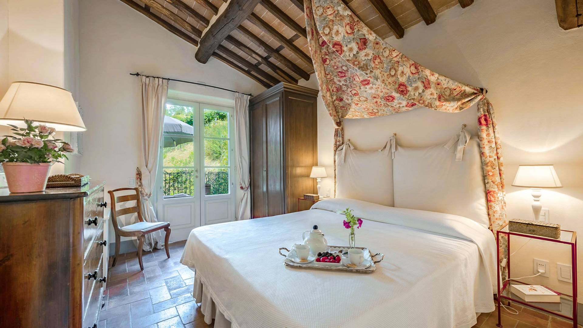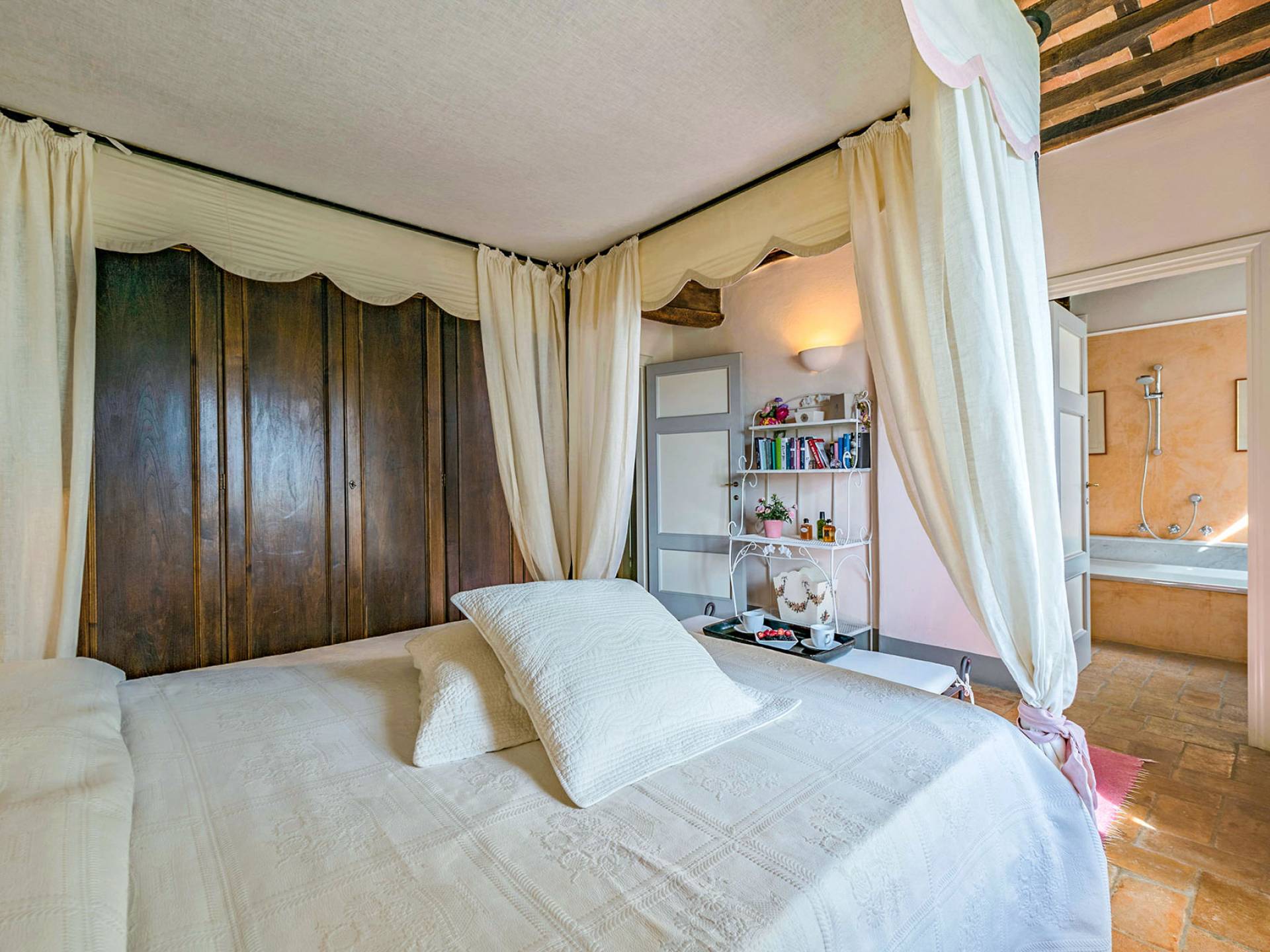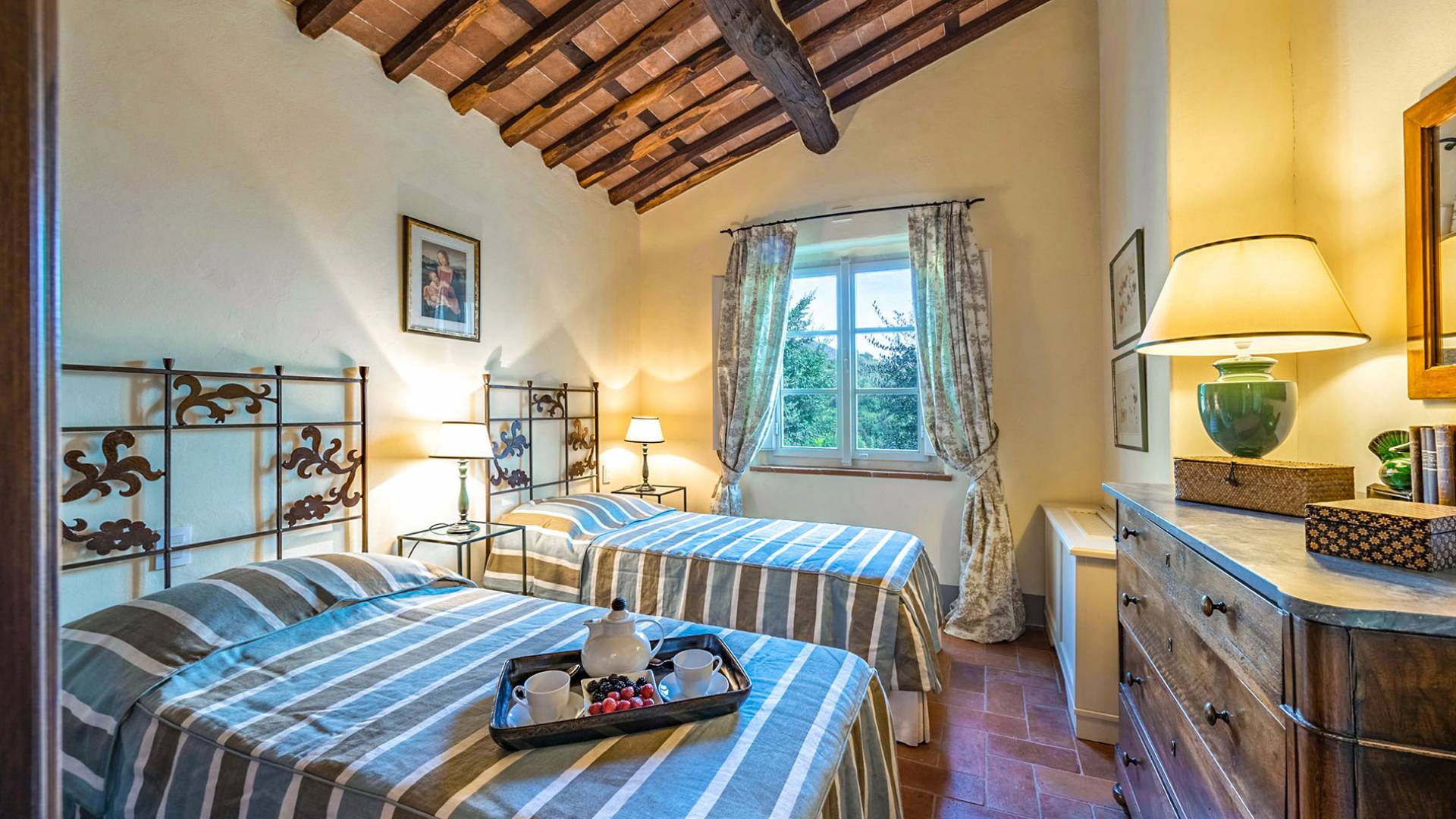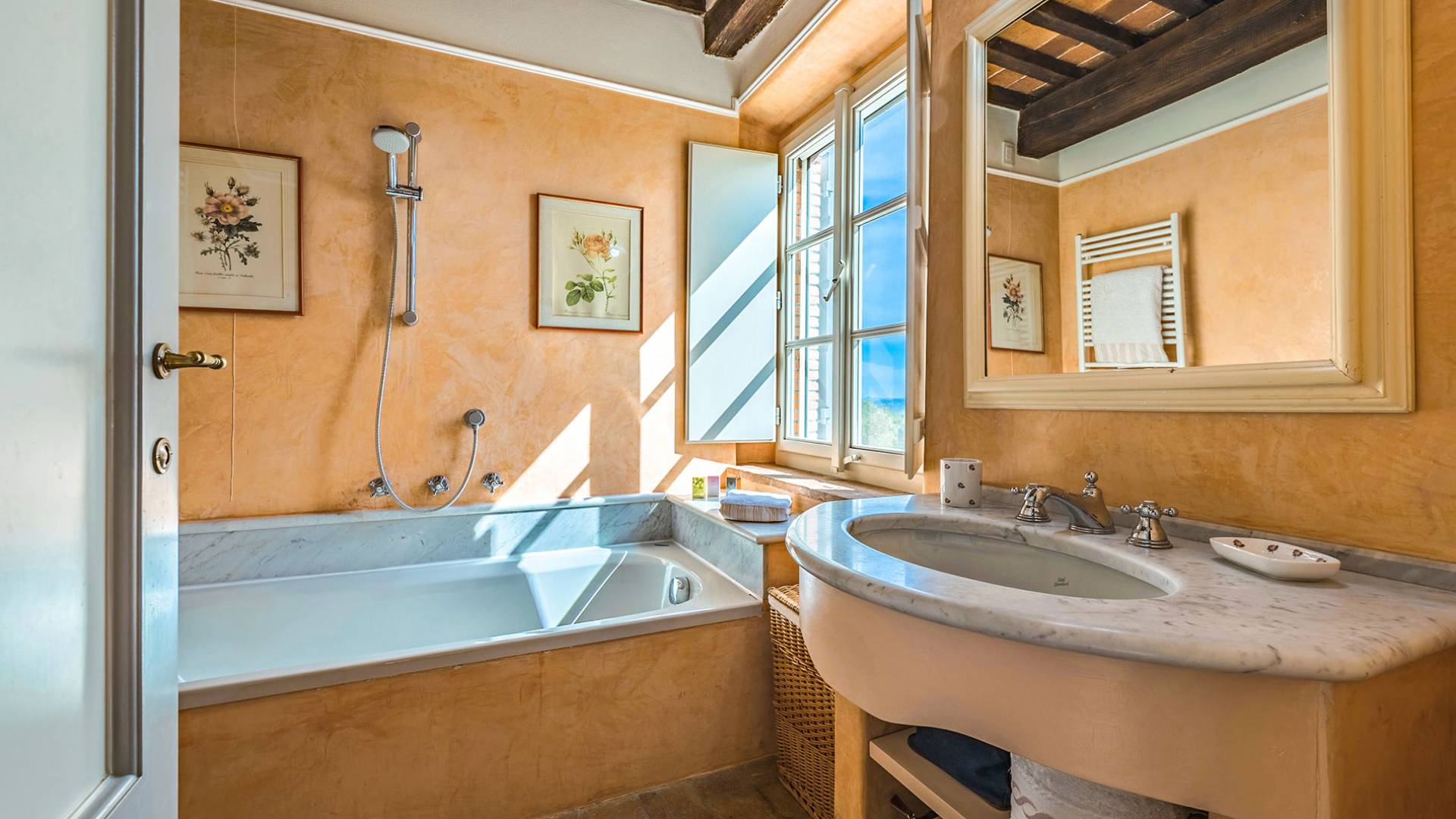 The villa's interior presents a perfect fusion of modern and functional furnishings mixed together with elegant and antique pieces. The rooms are spacious with high ceilings displaying their original wooden beams. The floors have maintained their original red terracotta tiles, and the warm and traditional atmosphere is completed with fine furniture.
