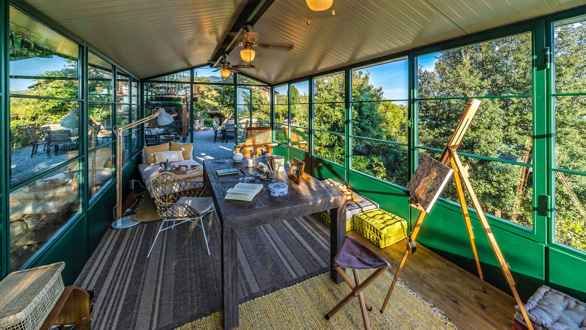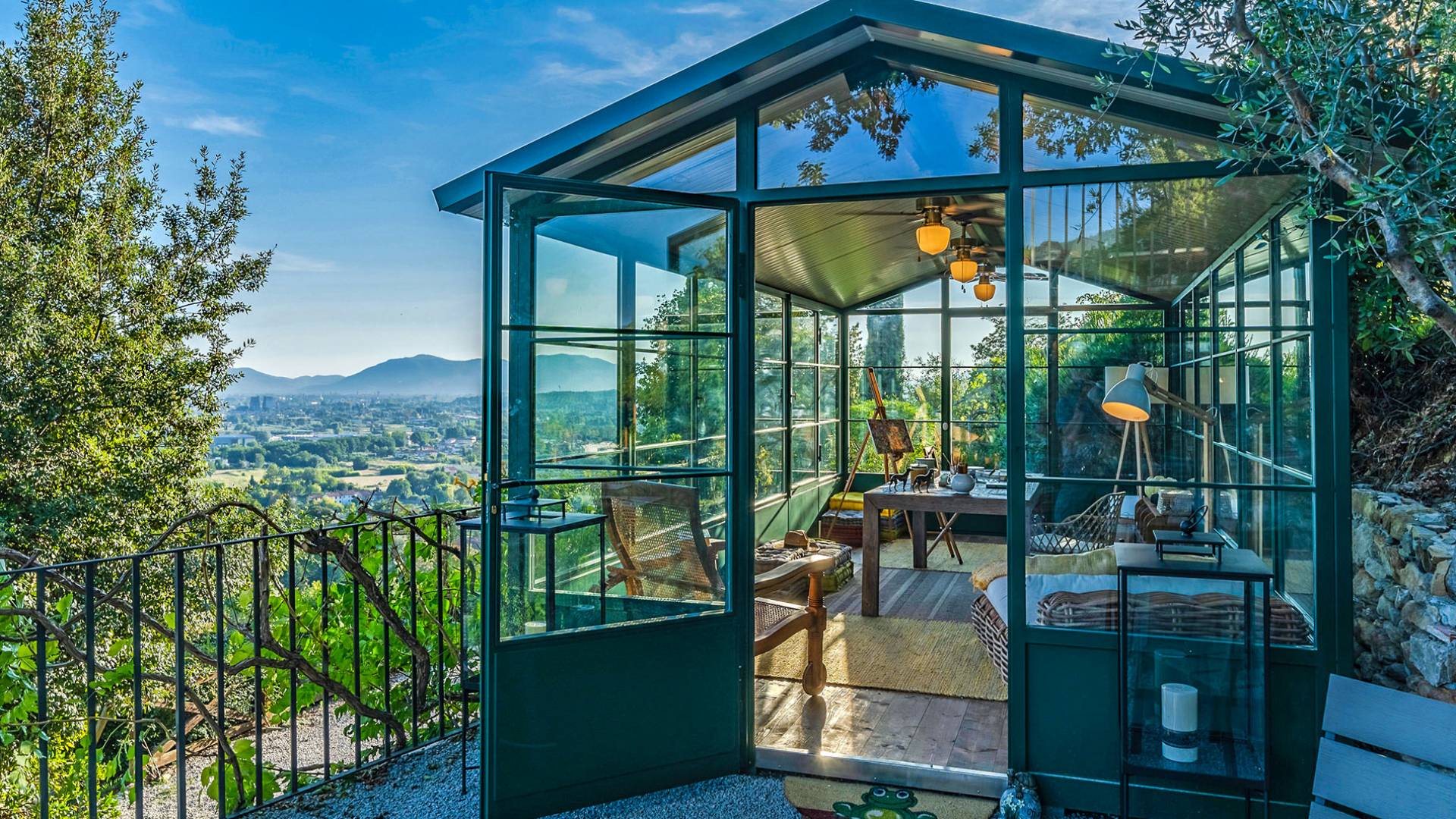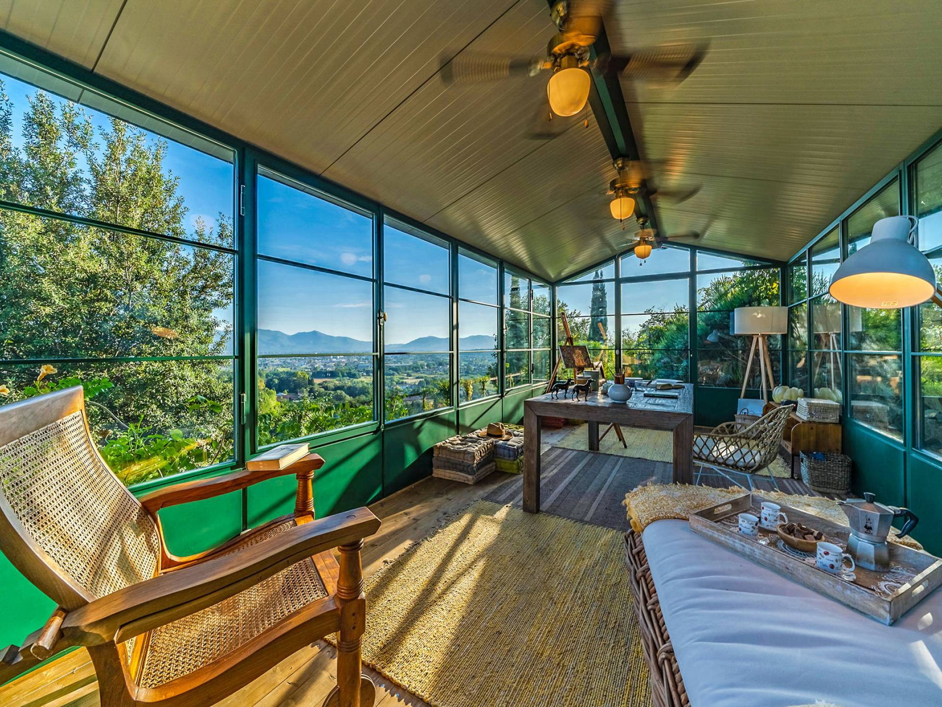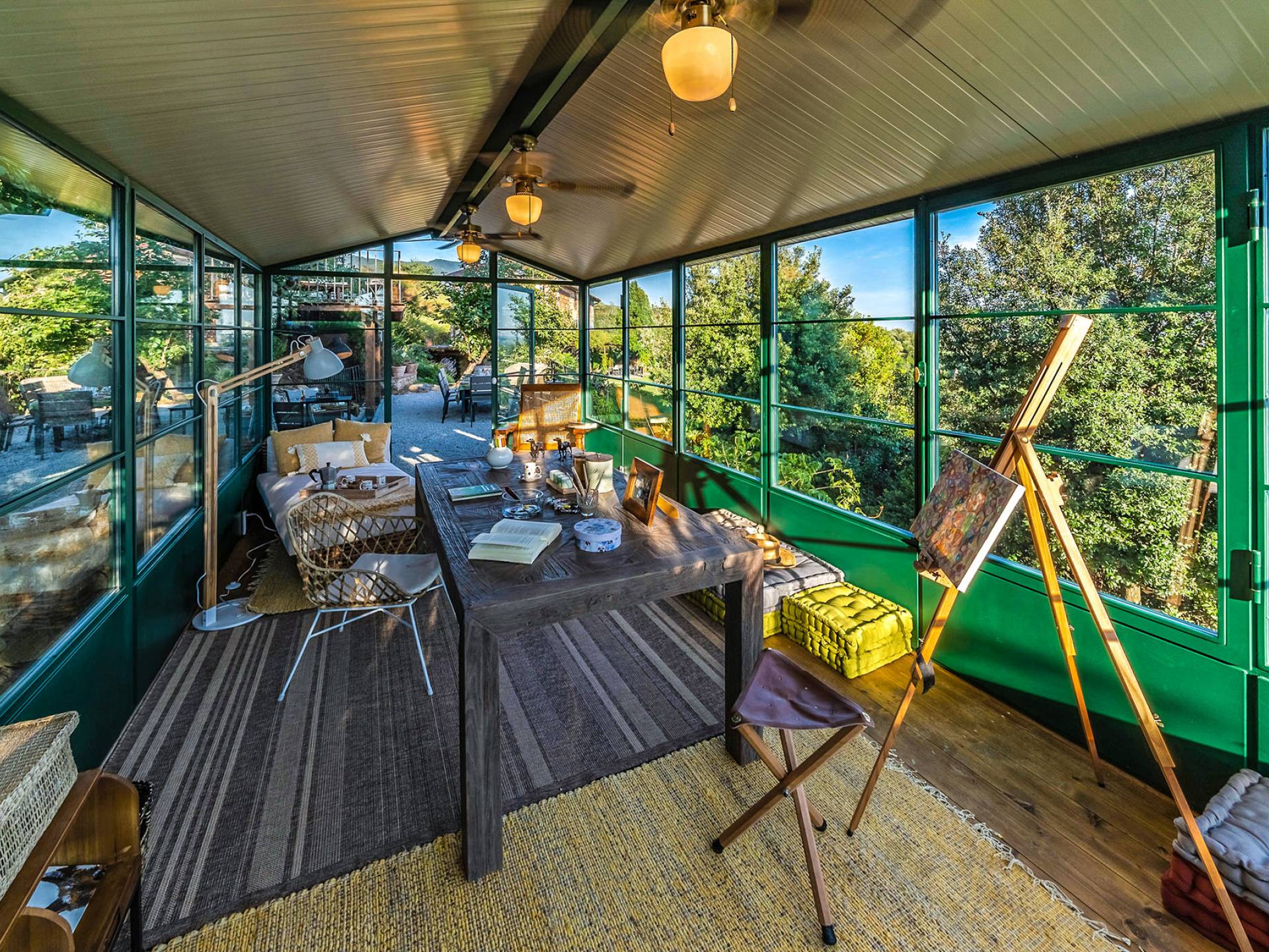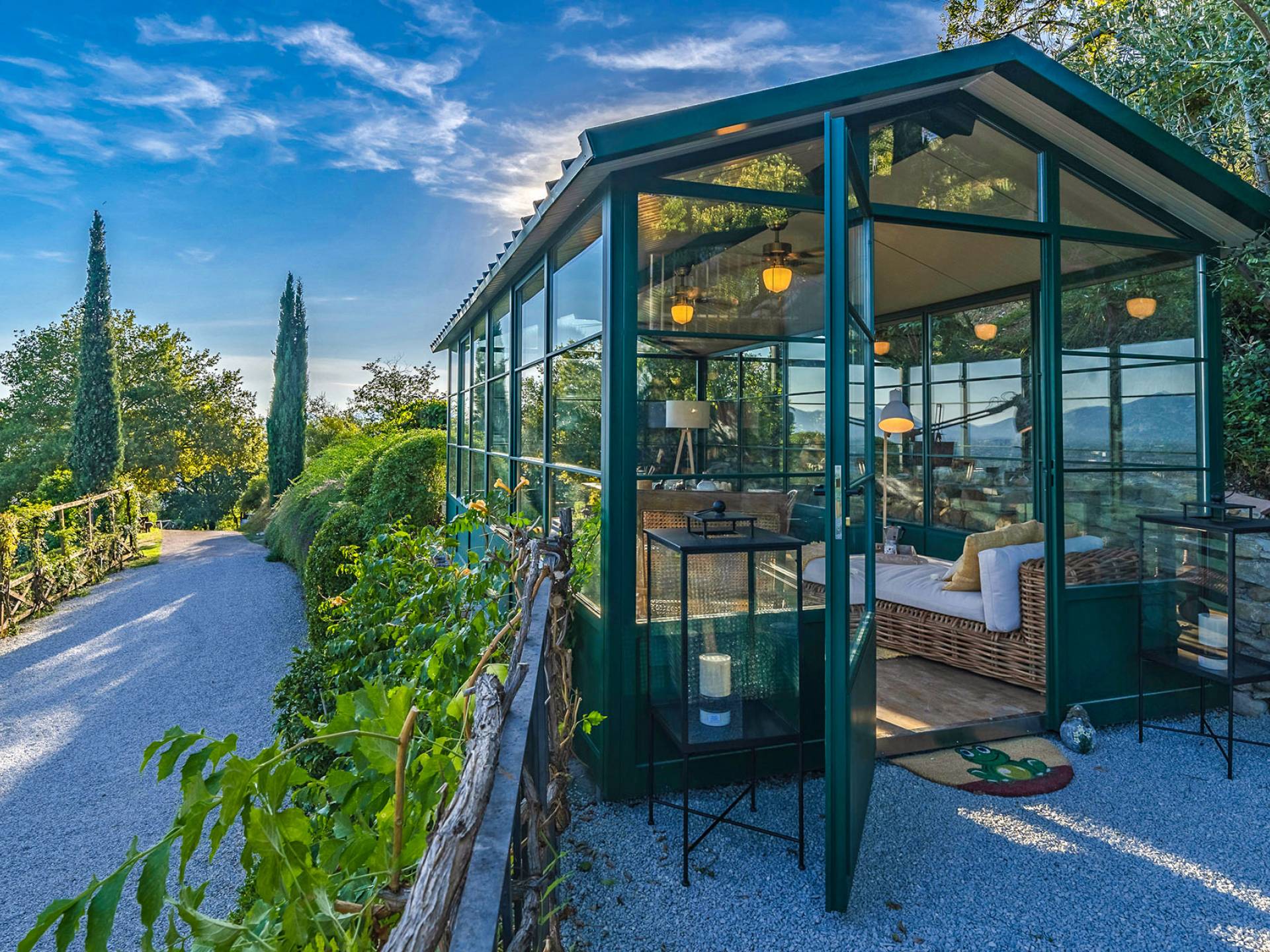 From the lounge area, the stairs go up to a greenhouse, a welcoming and intimate refuge where you can relax, have a good coffee, practice yoga, and, why not, gather inspiration for some painting. Further up you will arrive at a delightful panoramic terrace, under the shade of trees, where you can relax and enjoy the spectacular view of the valley reading a book, and enjoying a glass of good wine.