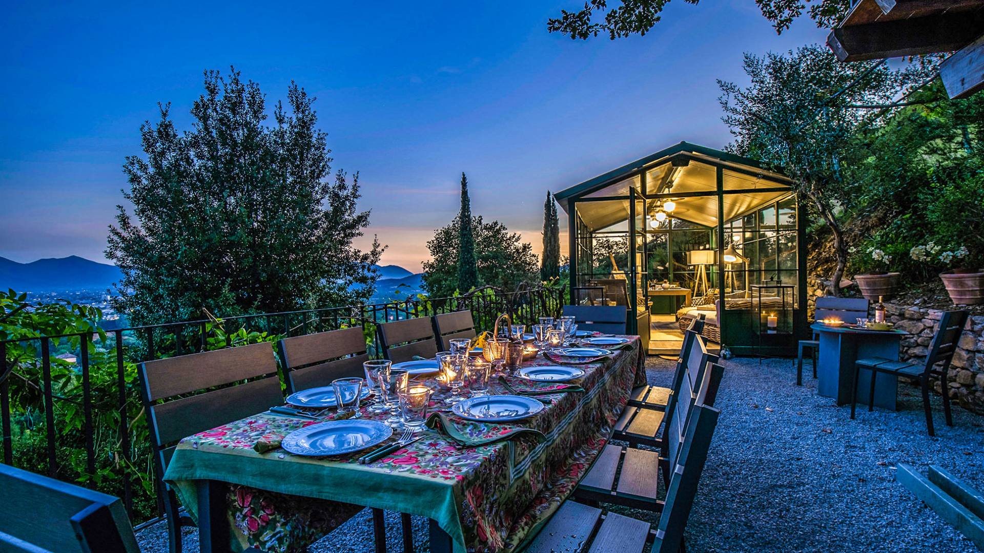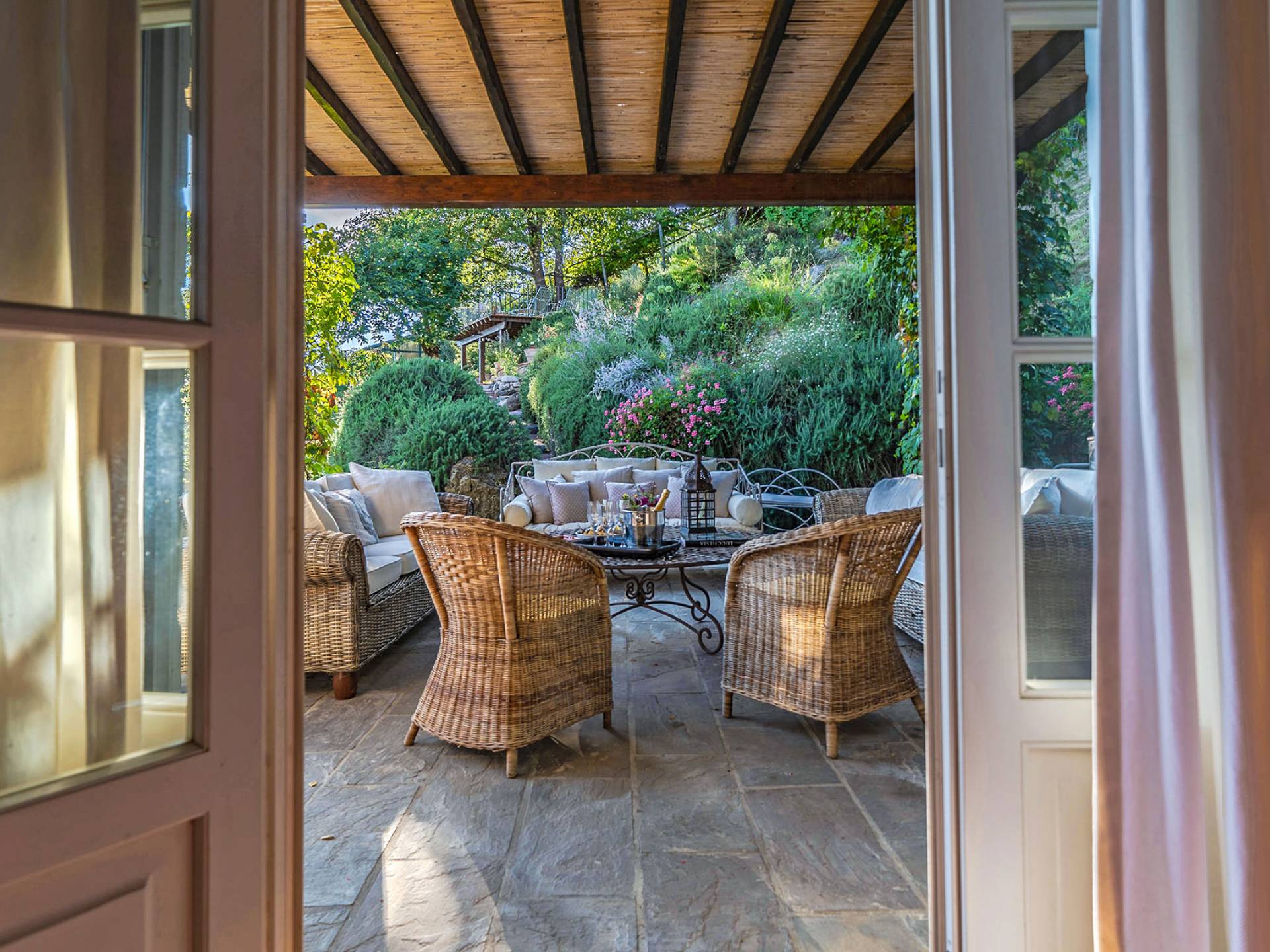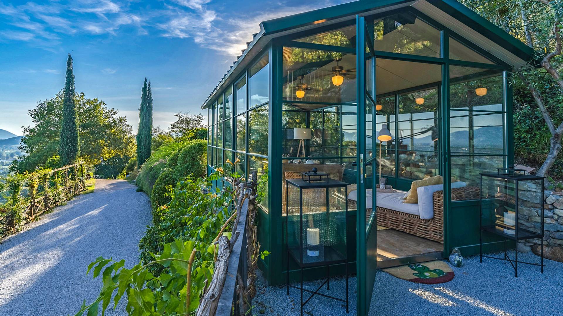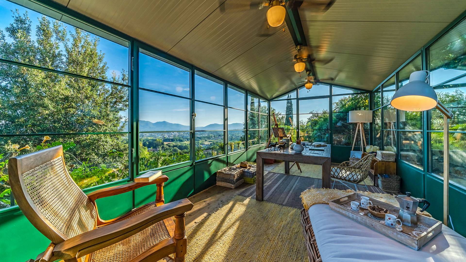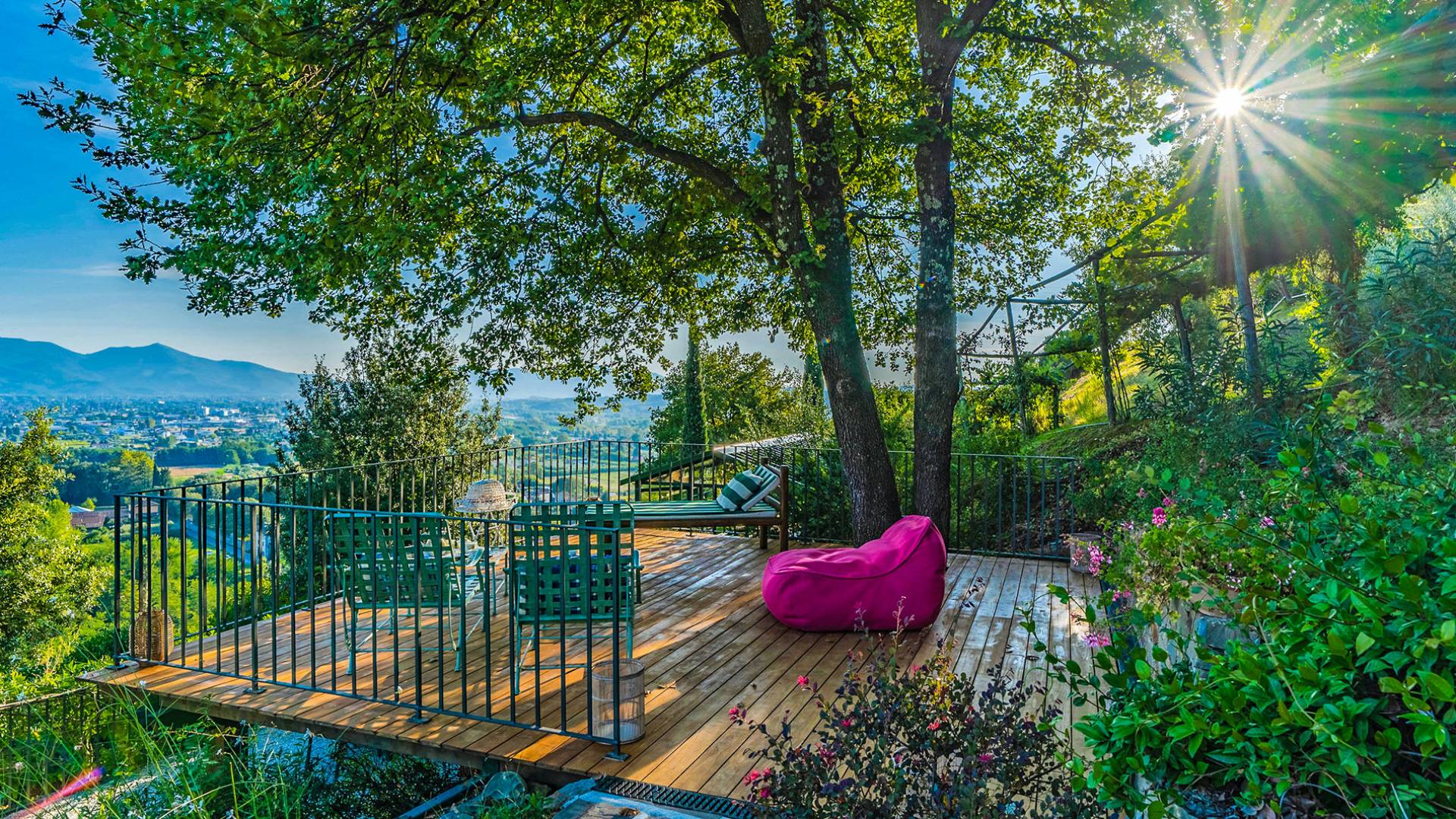 From the lounge area, the stairs go up to a greenhouse, a welcoming and intimate refuge where you can relax, have a good coffee, practice yoga, and, why not, gather inspiration for some painting. Further up you will arrive at a delightful panoramic terrace, under the shade of trees, where you can relax and enjoy the spectacular view of the valley reading a book, and enjoying a glass of good wine.