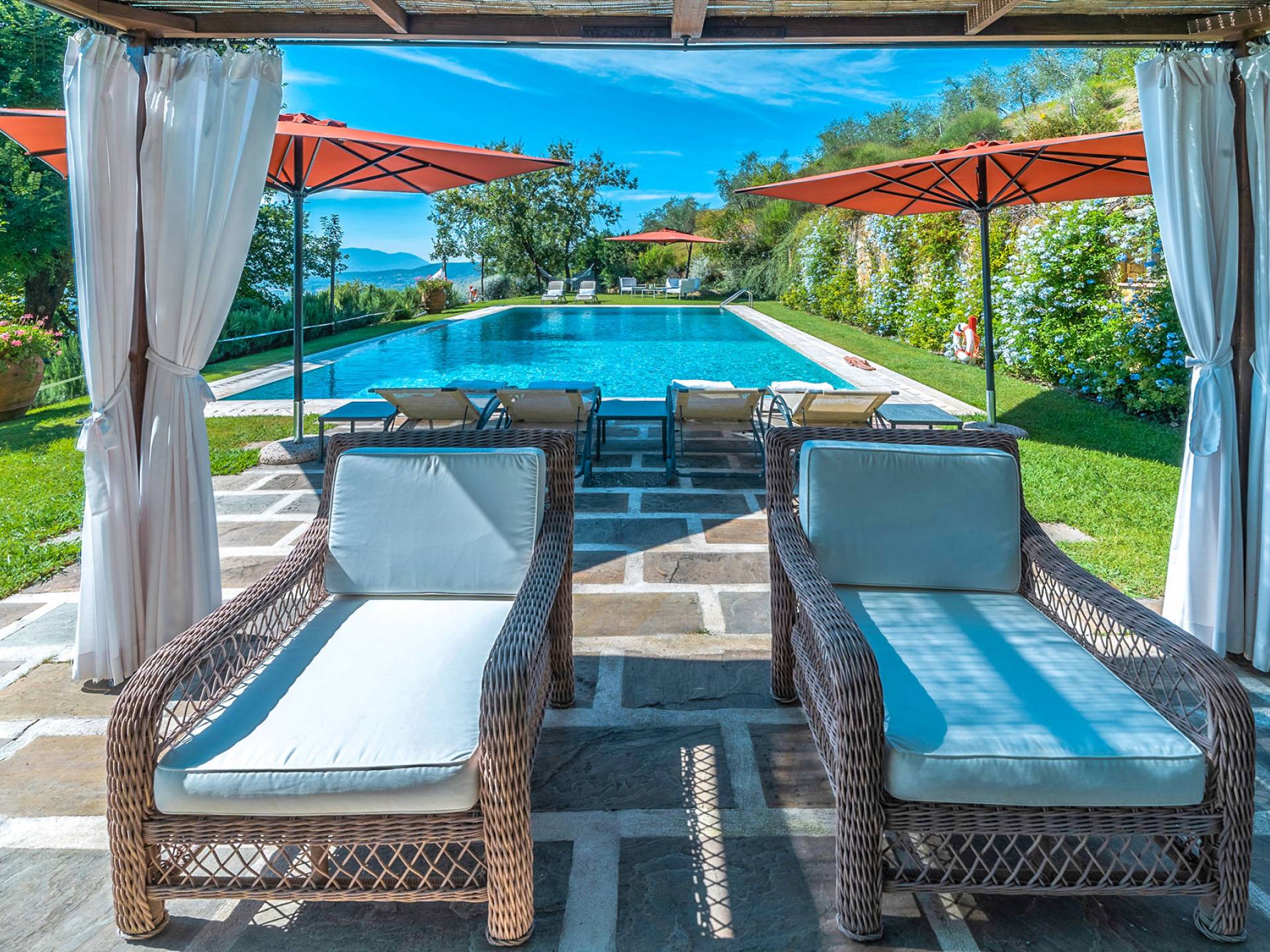 Villa i Pinoni Tuscany is a luxury villa rental with 6 bedrooms and a private pool. Villa i Pinoni is a spectacular residence perched high on the green hills outside of Lucca. Its particularly elongated form and hillside position bring to mind an ancient strategy of dominion and protection as if the villa had been built to effectively monitor the movements of any unannounced visitor.