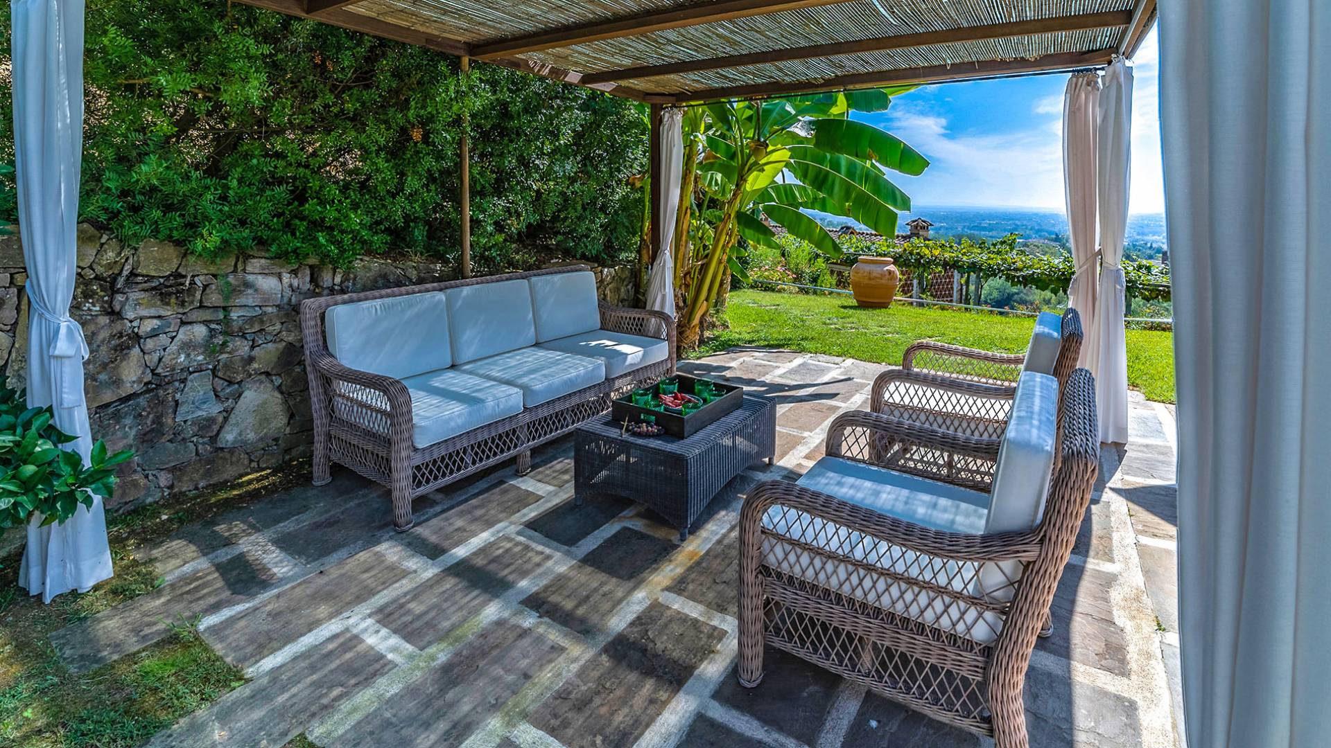 The garden is characterized by an English lawn embellished with large vases containing flowers, citrus trees, aromatic plants, and creeping vines. In fact, running all around the building is an arbor covered with different varieties of climbing plants that guarantee cool shade in the living and dining area. The house has two outdoor areas: the first, flanking the shorter wall, where couches, armchairs, and small tables provide a comfortable lounge area for relaxing moments; the second, located near the kitchen, where a table and chairs are set up for dining in the cool shade.