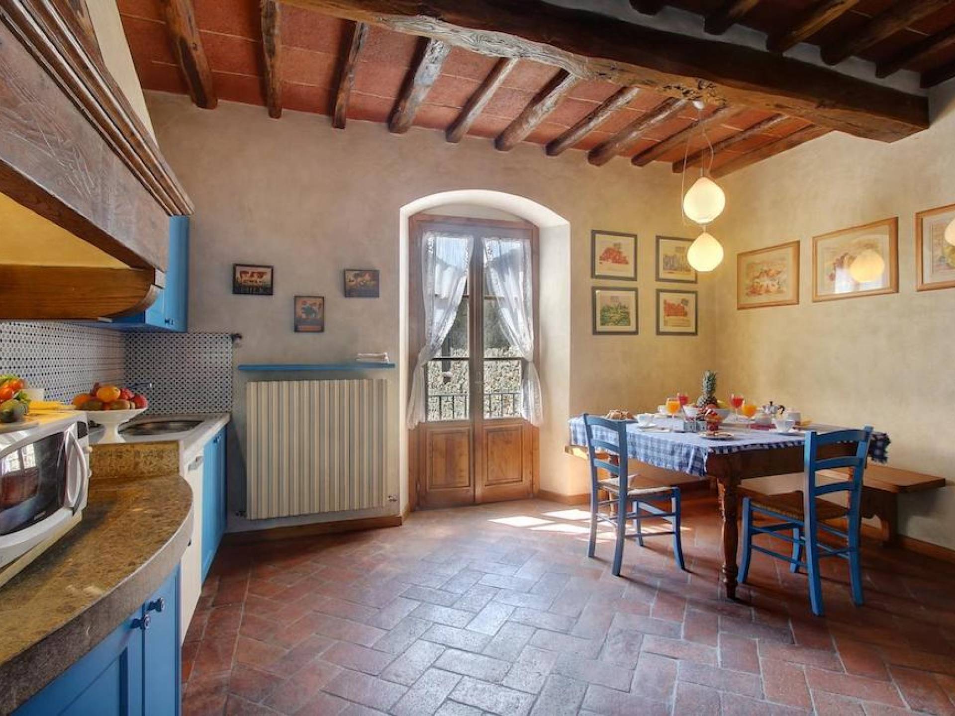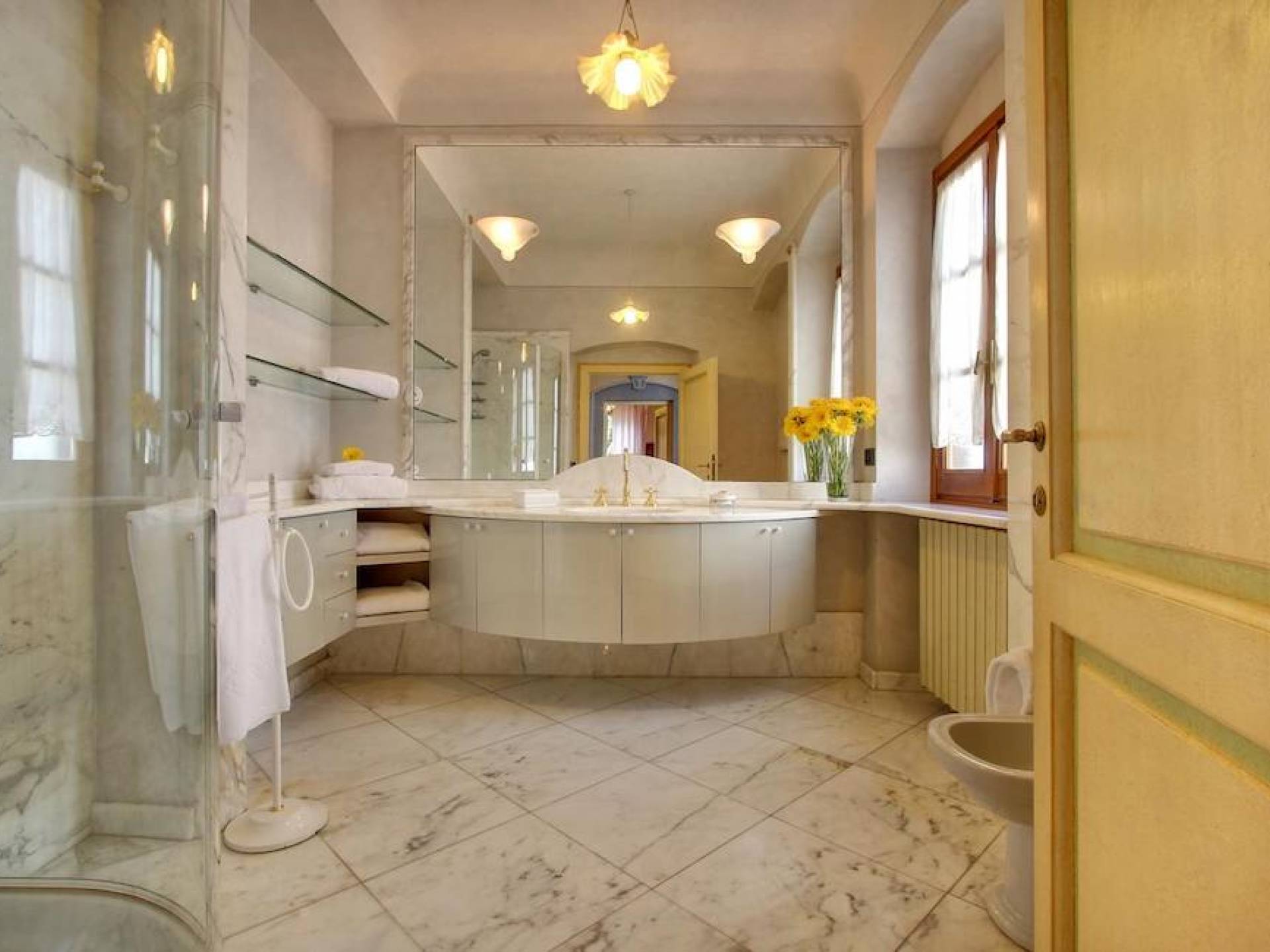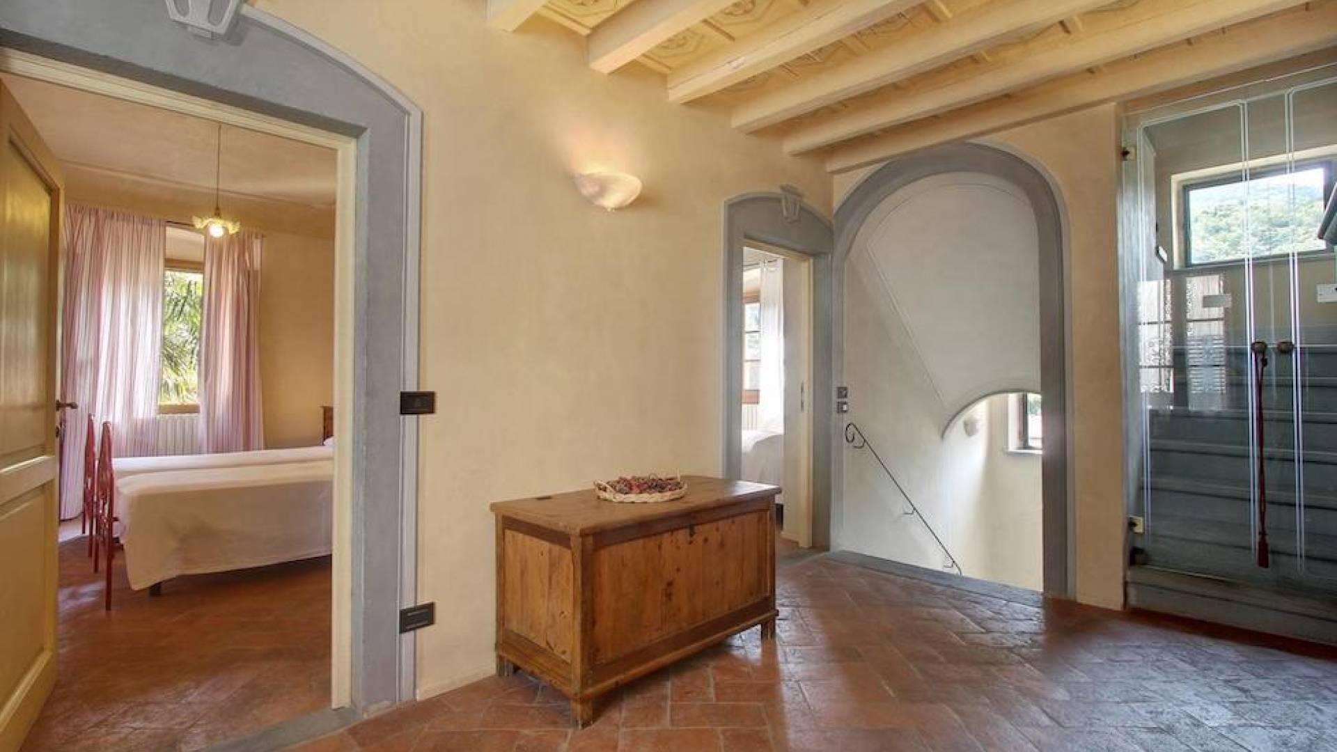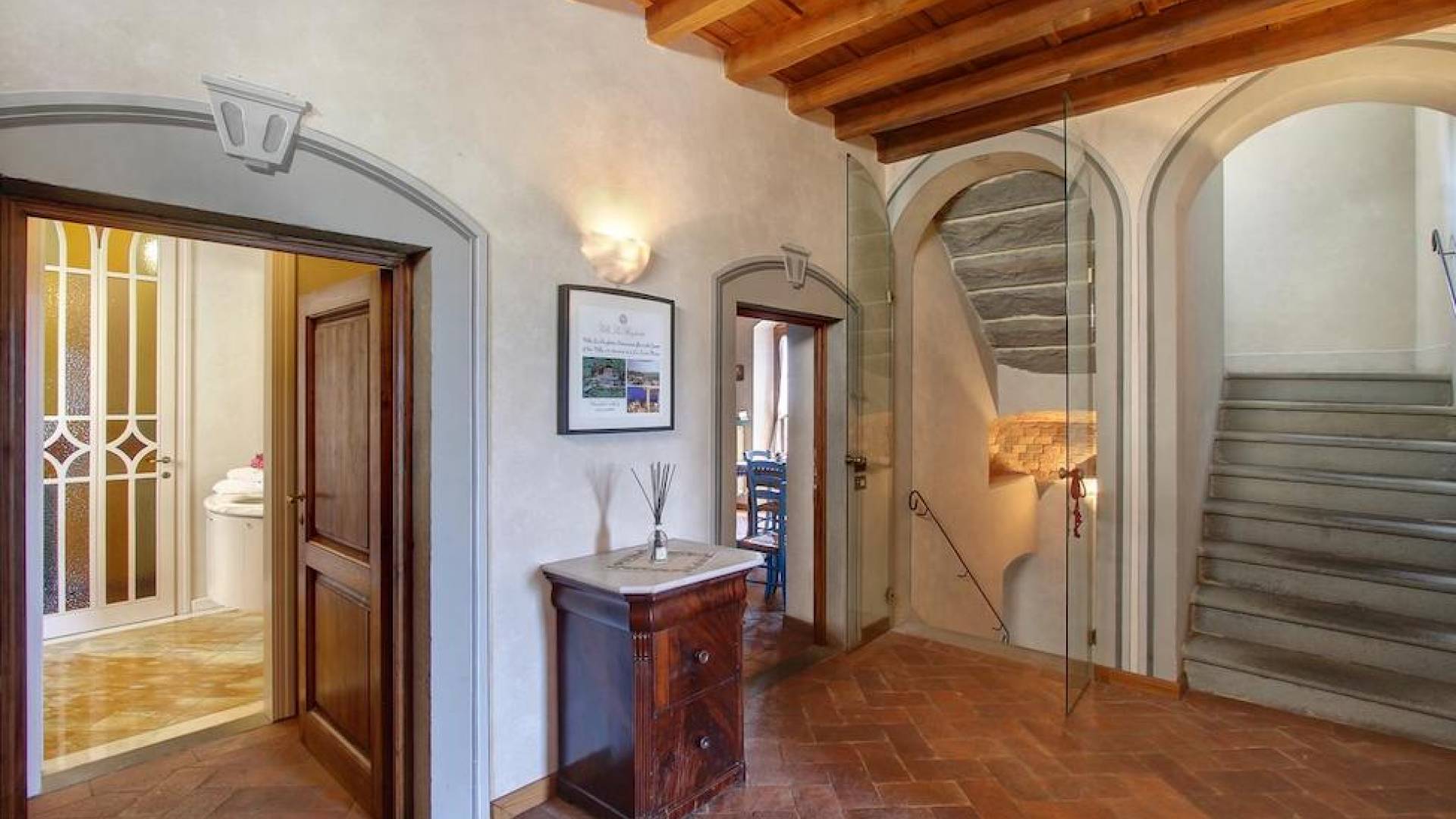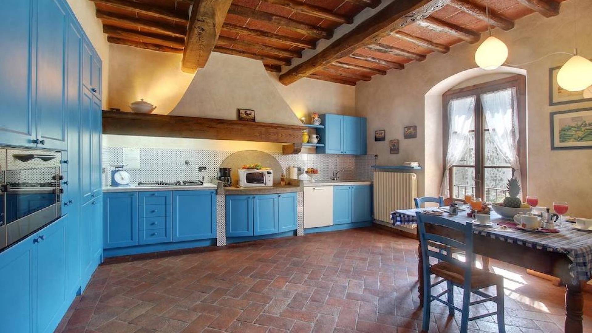 The garden leads down to the swimming pool. The swimming pool has been bordered in natural stone, which in turn is bordered with a lawn to lend an ample area around the pool for relaxing in the warm Tuscany sun. Villa Luce Tuscany has been beautifully decorated; the owner’s original intention was to use Casa Puliti for his own family country home. Some of the best features – the ancient wooden doorway, heavy wooden beams, and terracotta floors – have been restored to their former glory, while the bathrooms have been finished in marble.
