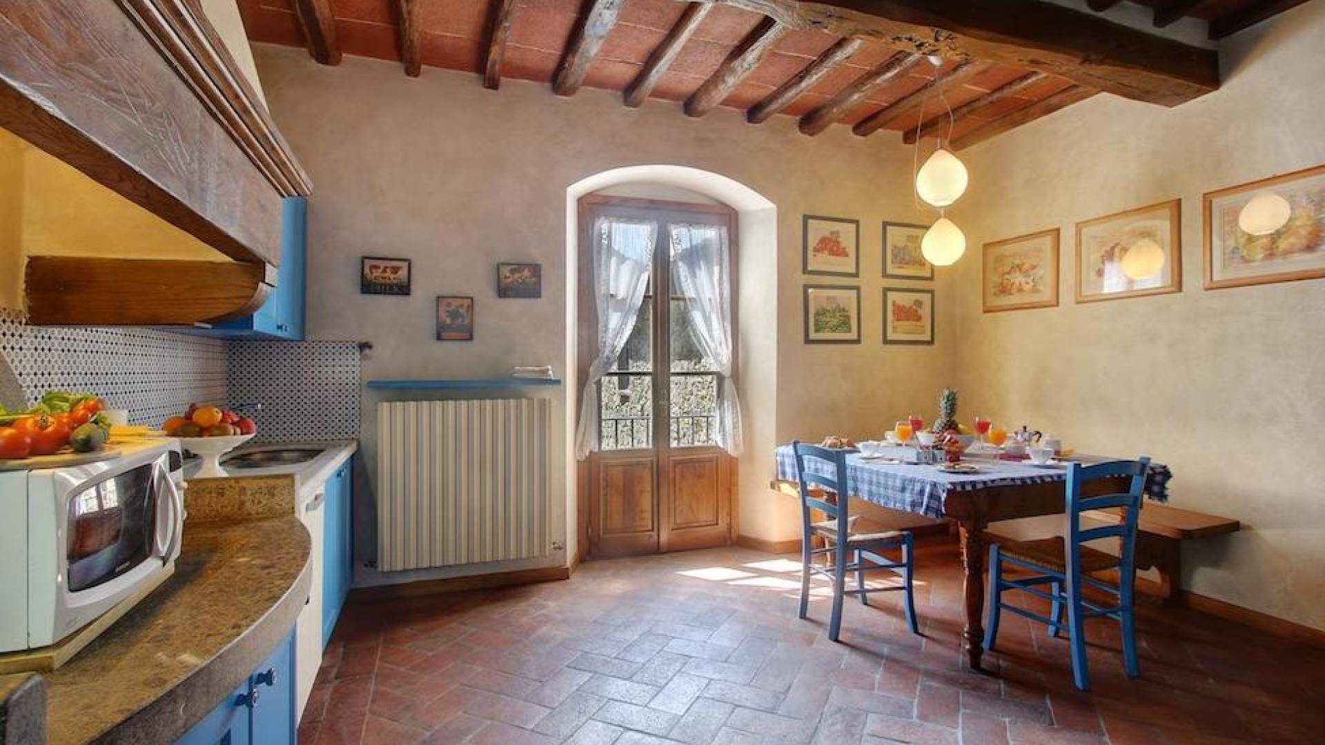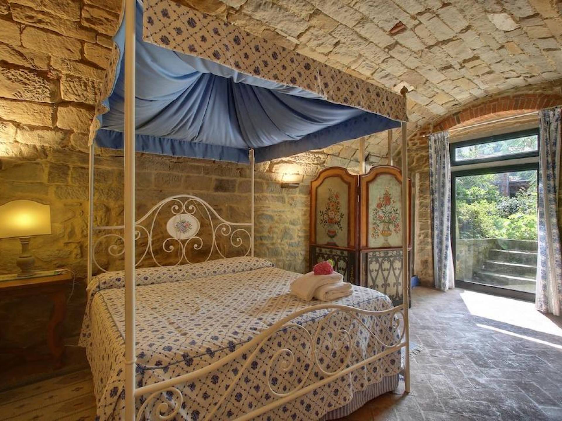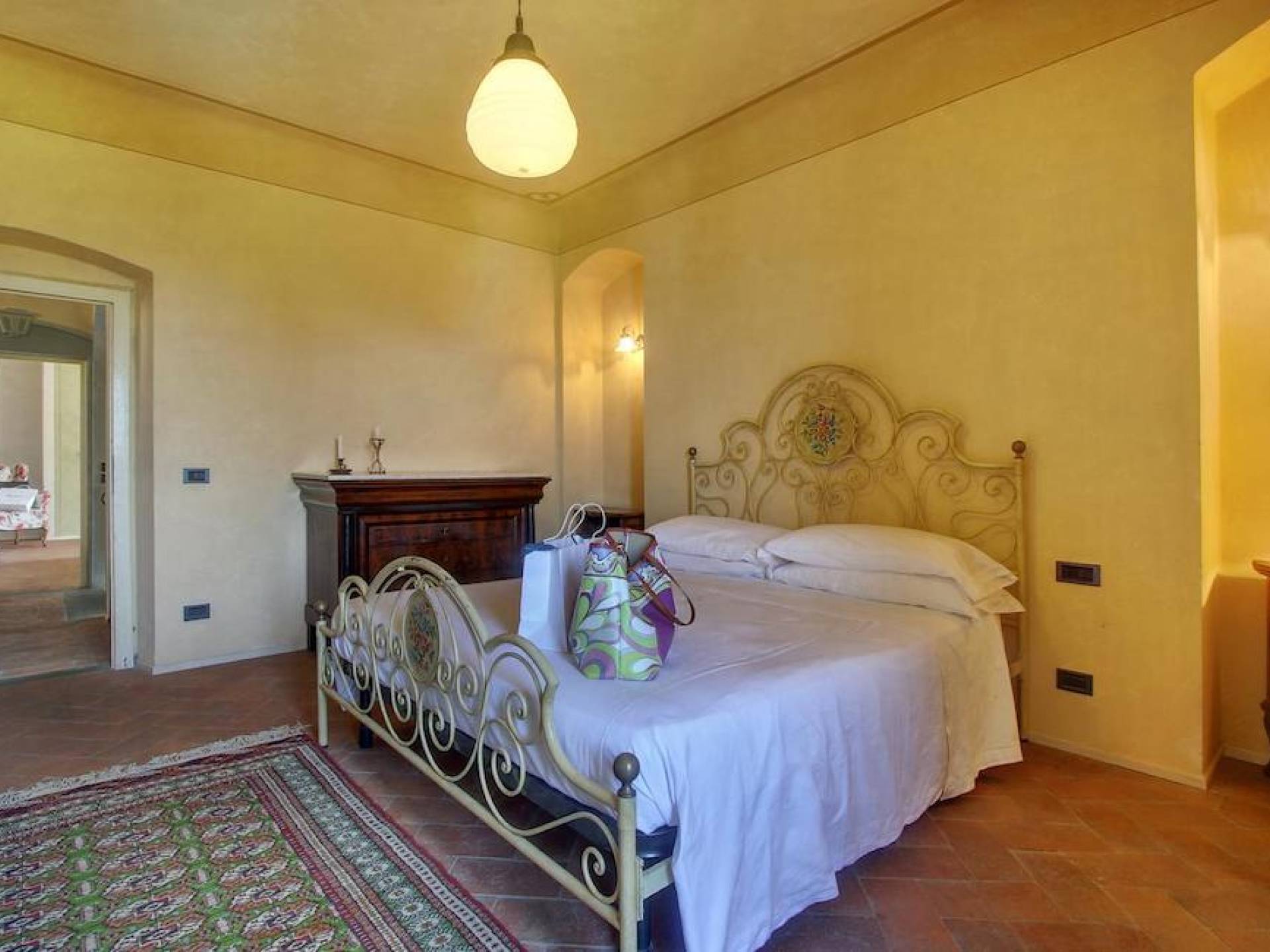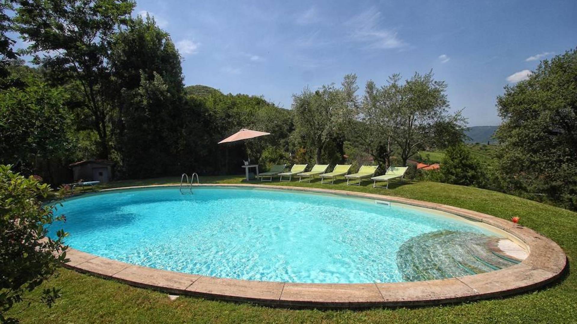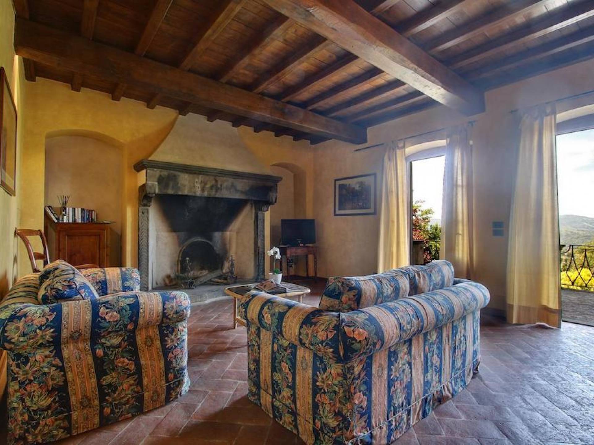 The garden leads down to the swimming pool. The swimming pool has been bordered in natural stone, which in turn is bordered with a lawn to lend an ample area around the pool for relaxing in the warm Tuscany sun. Villa Luce Tuscany has been beautifully decorated; the owner’s original intention was to use Casa Puliti for his own family country home. Some of the best features – the ancient wooden doorway, heavy wooden beams, and terracotta floors – have been restored to their former glory, while the bathrooms have been finished in marble.