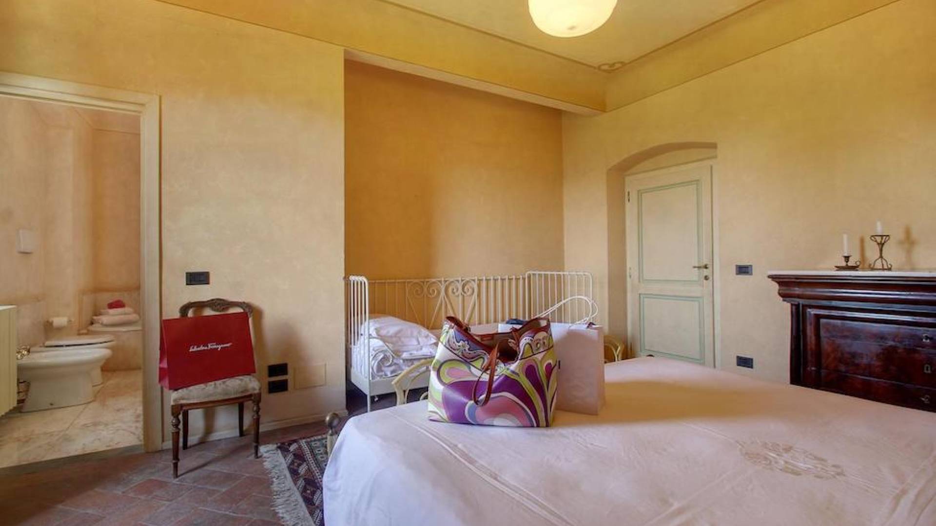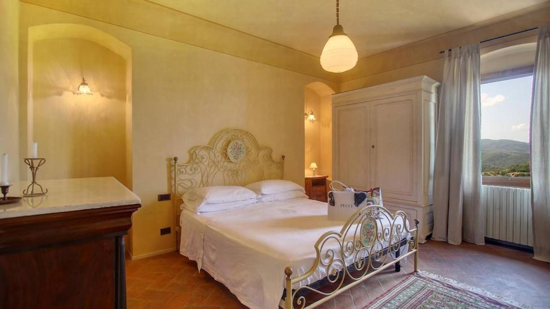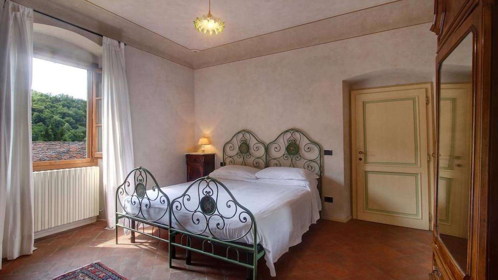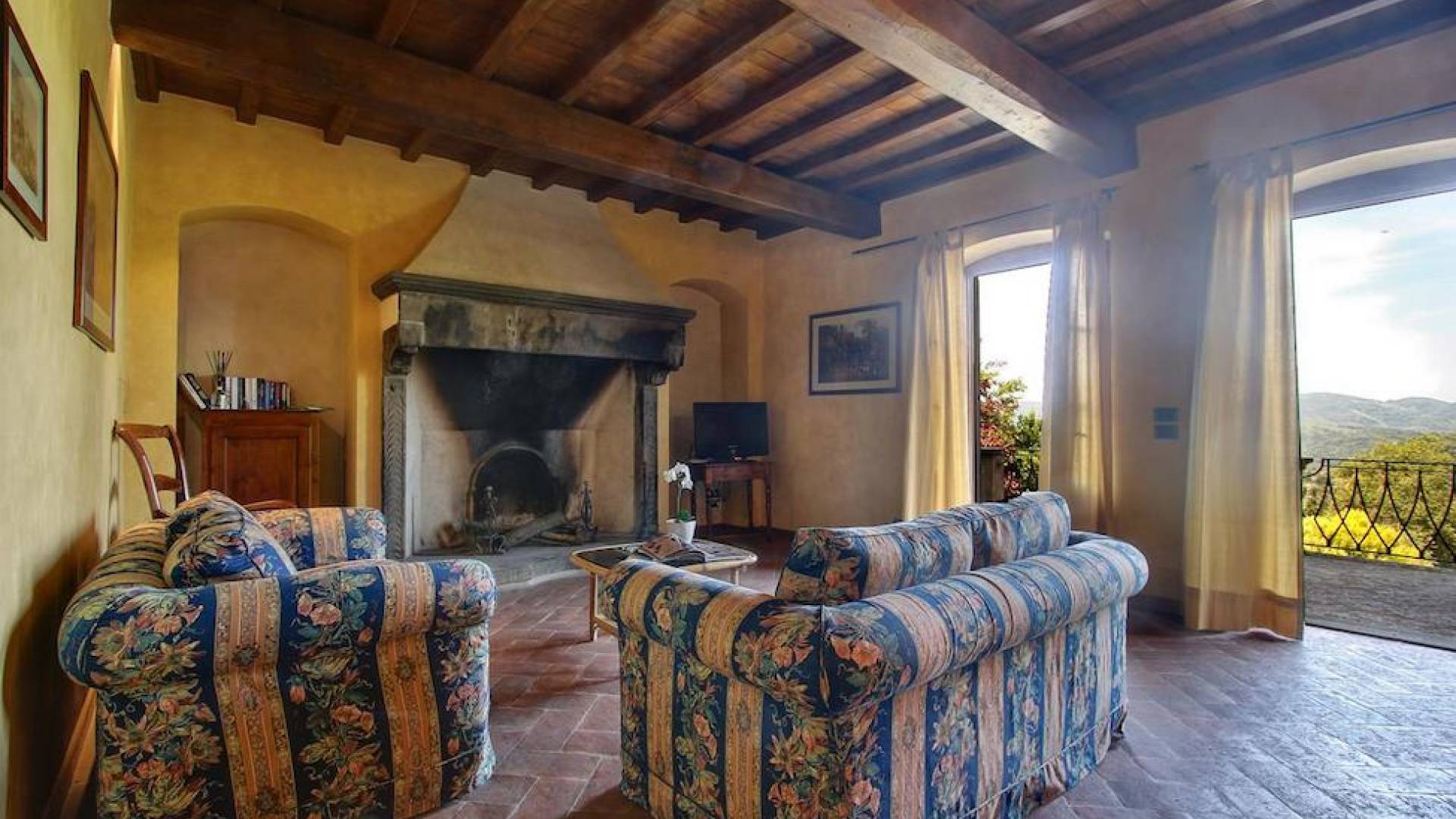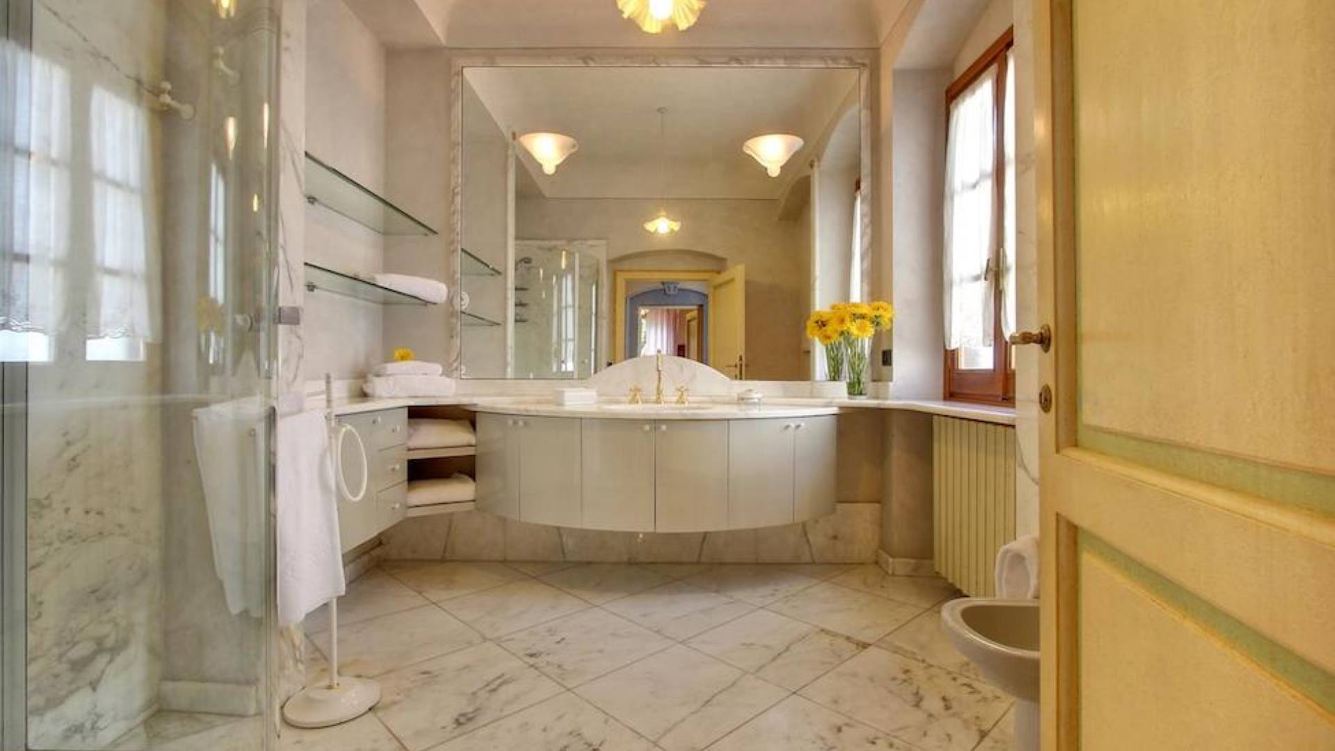 The garden leads down to the swimming pool. The swimming pool has been bordered in natural stone, which in turn is bordered with a lawn to lend an ample area around the pool for relaxing in the warm Tuscany sun. Villa Luce Tuscany has been beautifully decorated; the owner’s original intention was to use Casa Puliti for his own family country home. Some of the best features – the ancient wooden doorway, heavy wooden beams, and terracotta floors – have been restored to their former glory, while the bathrooms have been finished in marble.