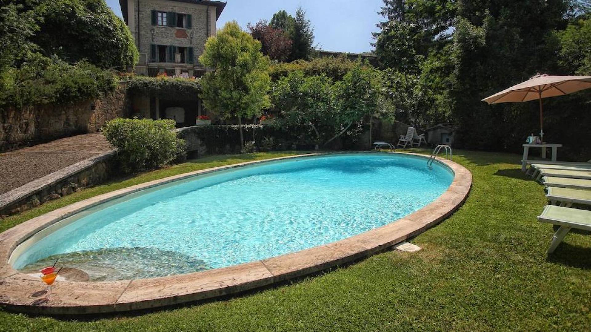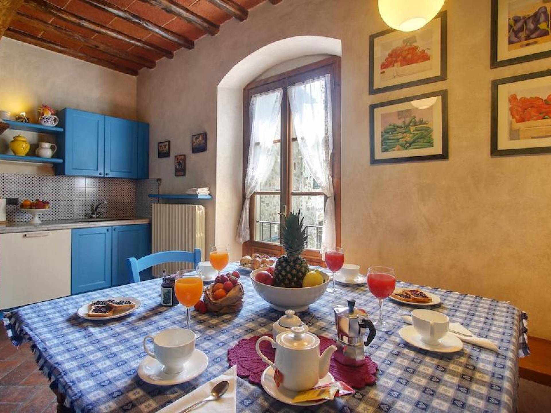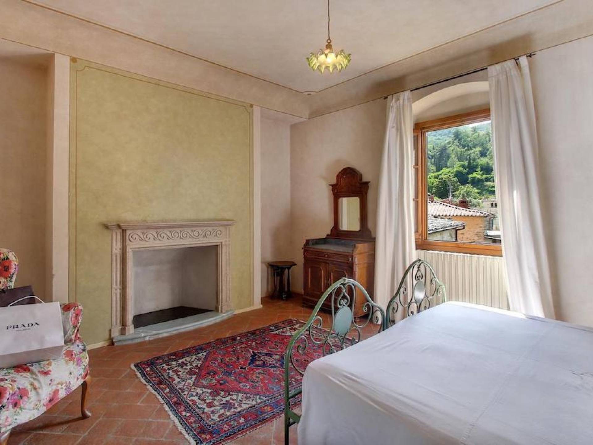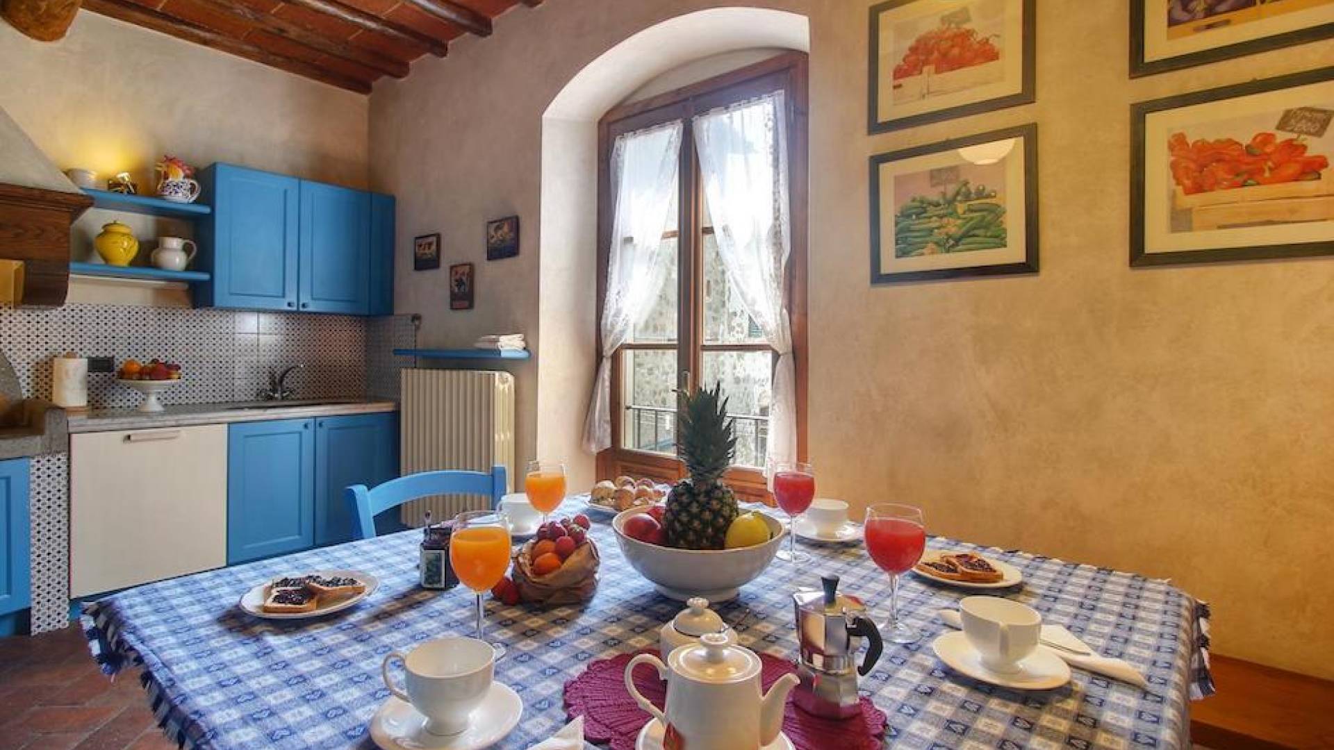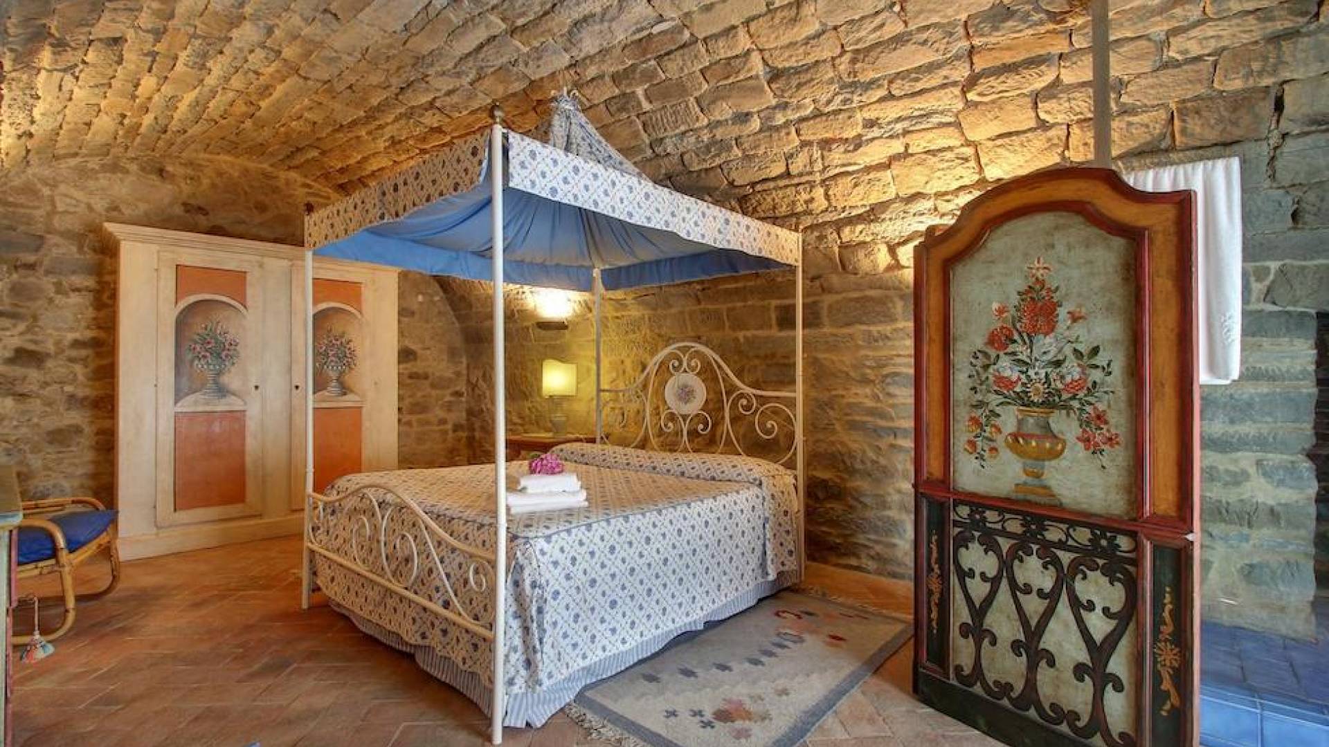 The garden leads down to the swimming pool. The swimming pool has been bordered in natural stone, which in turn is bordered with a lawn to lend an ample area around the pool for relaxing in the warm Tuscany sun. Villa Luce Tuscany has been beautifully decorated; the owner’s original intention was to use Casa Puliti for his own family country home. Some of the best features – the ancient wooden doorway, heavy wooden beams, and terracotta floors – have been restored to their former glory, while the bathrooms have been finished in marble.