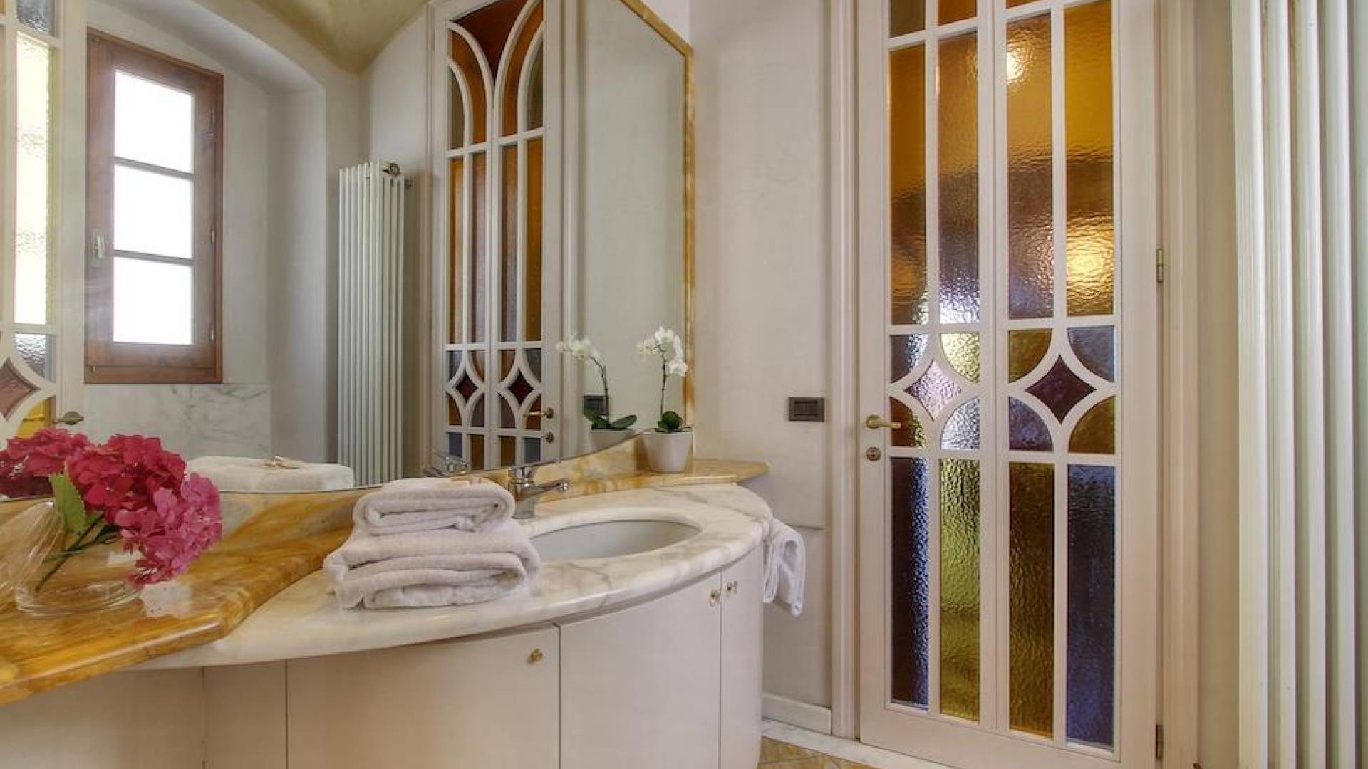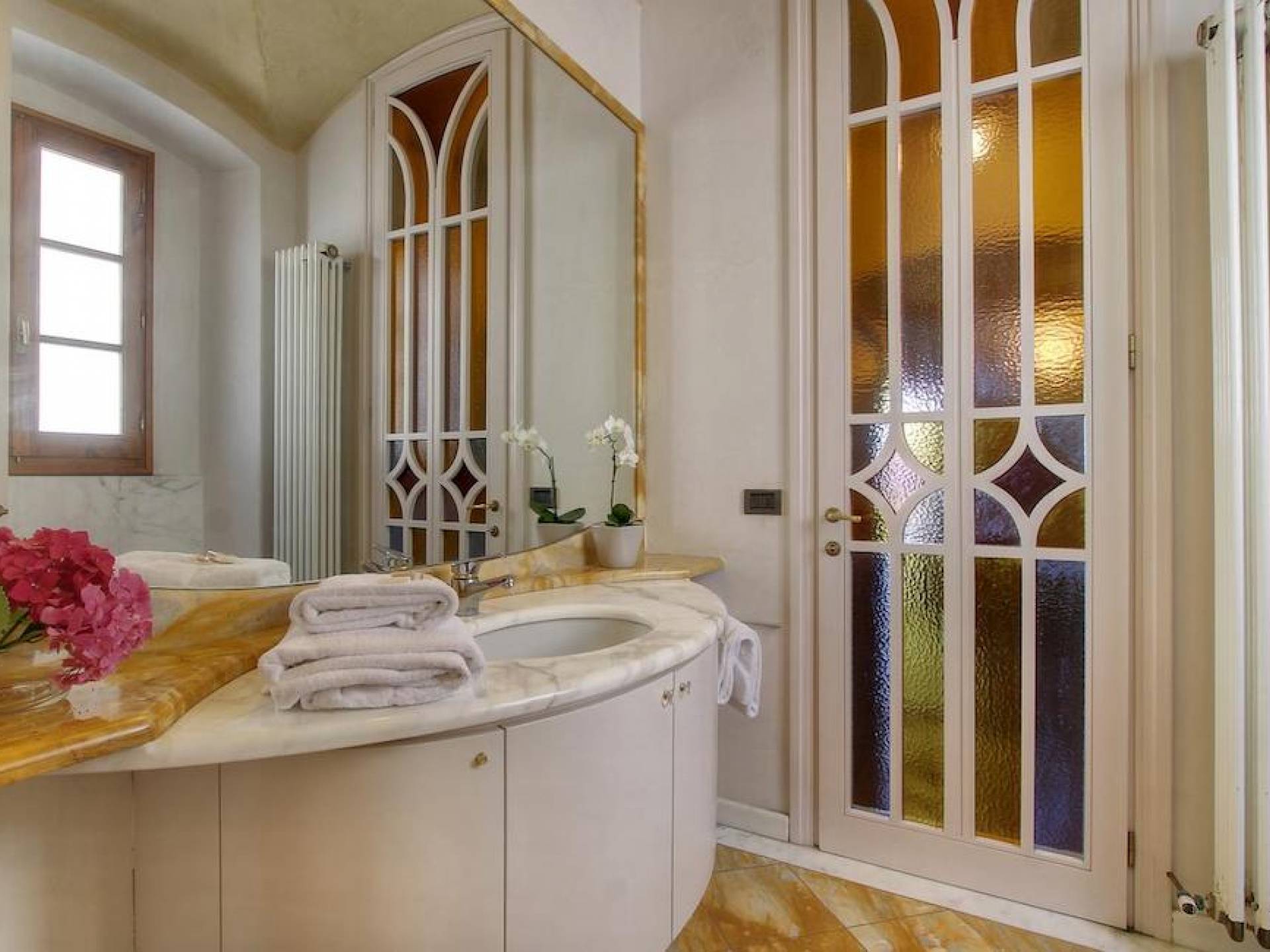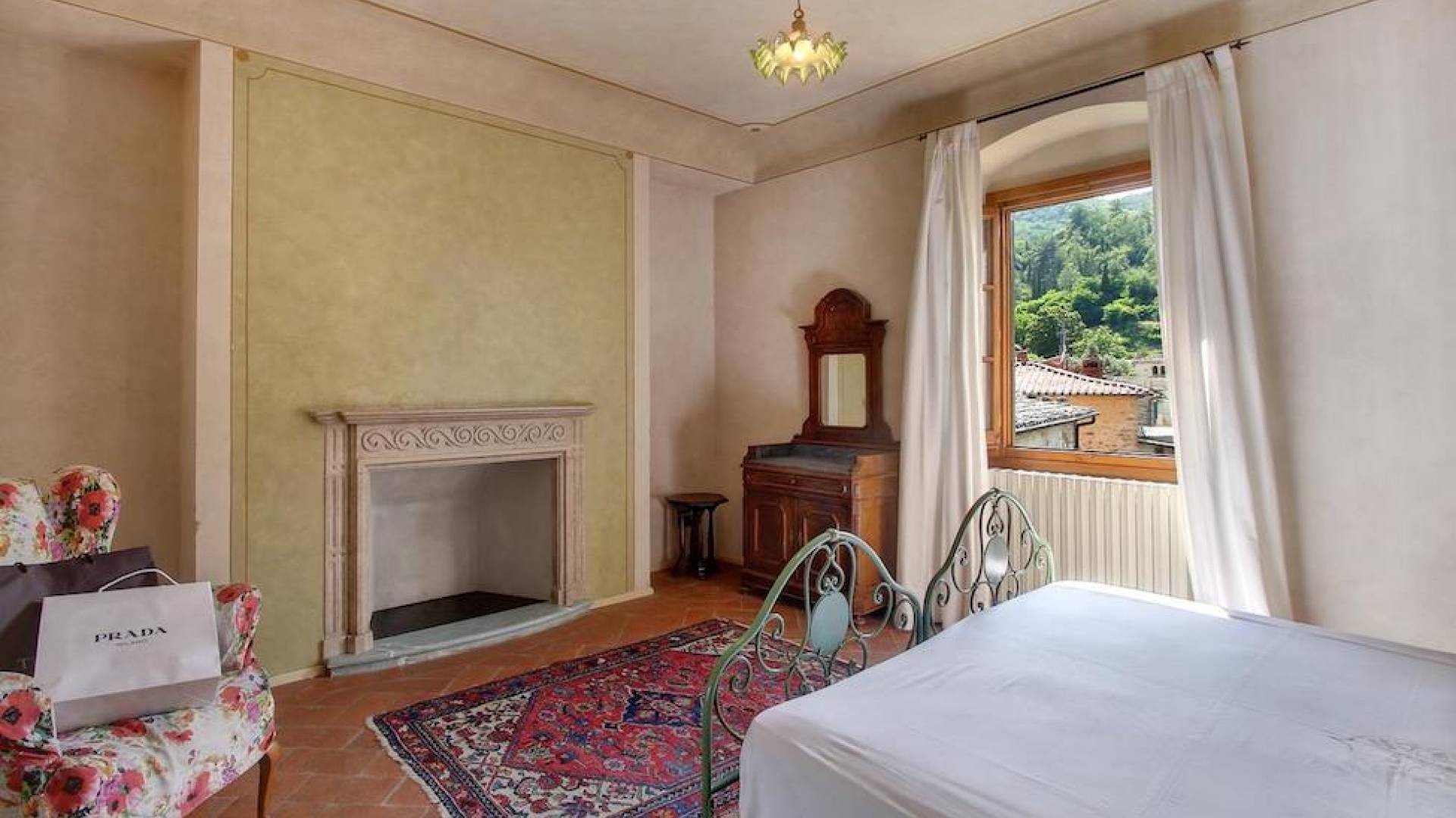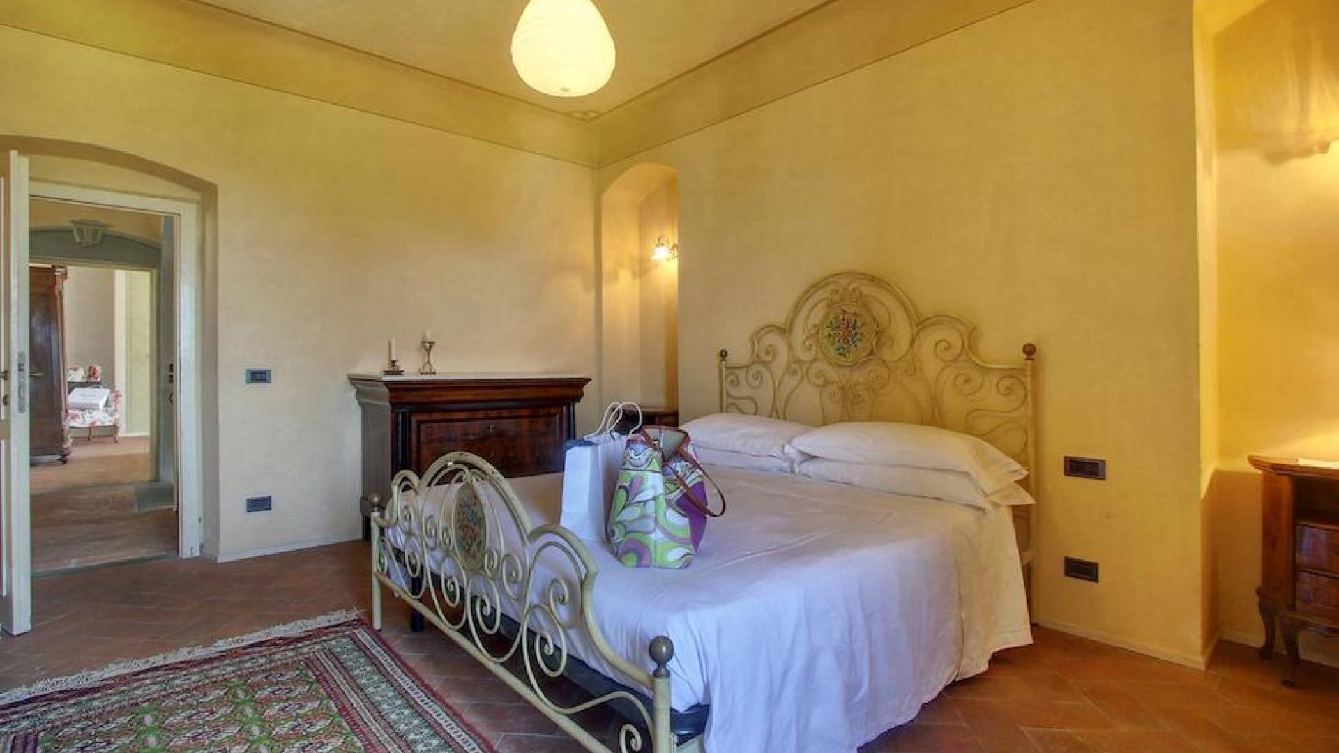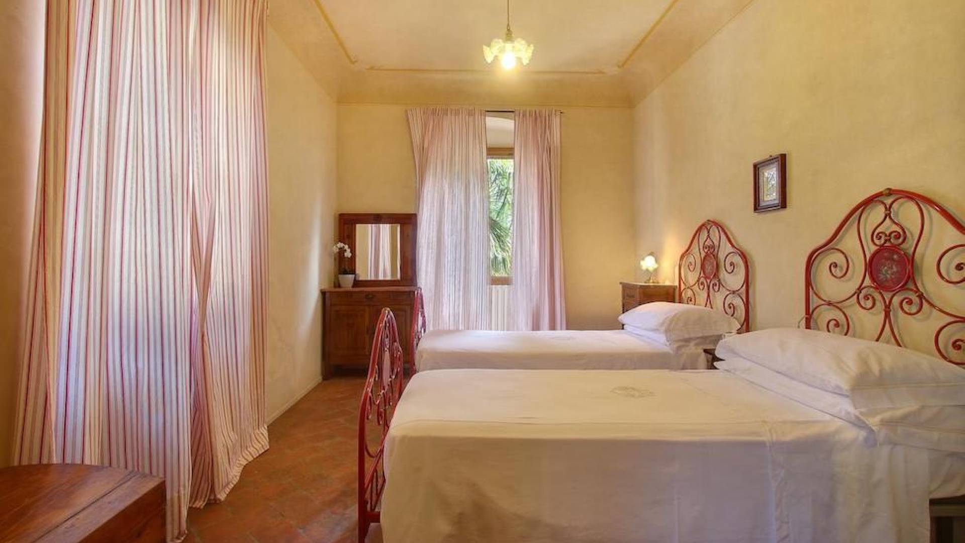 The garden leads down to the swimming pool. The swimming pool has been bordered in natural stone, which in turn is bordered with a lawn to lend an ample area around the pool for relaxing in the warm Tuscany sun. Villa Luce Tuscany has been beautifully decorated; the owner’s original intention was to use Casa Puliti for his own family country home. Some of the best features – the ancient wooden doorway, heavy wooden beams, and terracotta floors – have been restored to their former glory, while the bathrooms have been finished in marble.