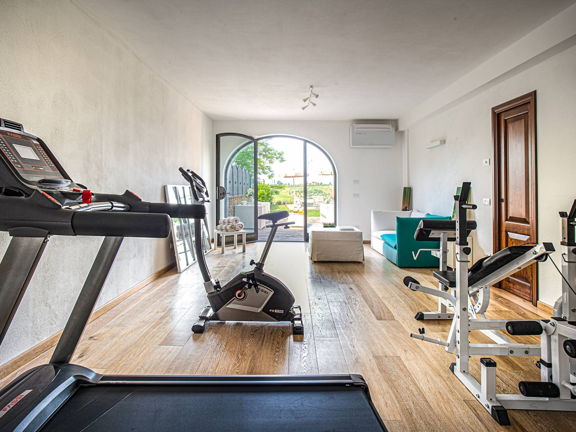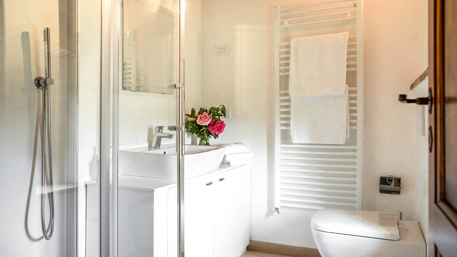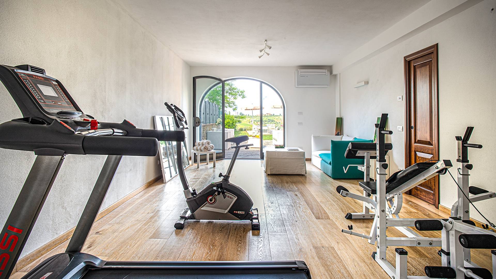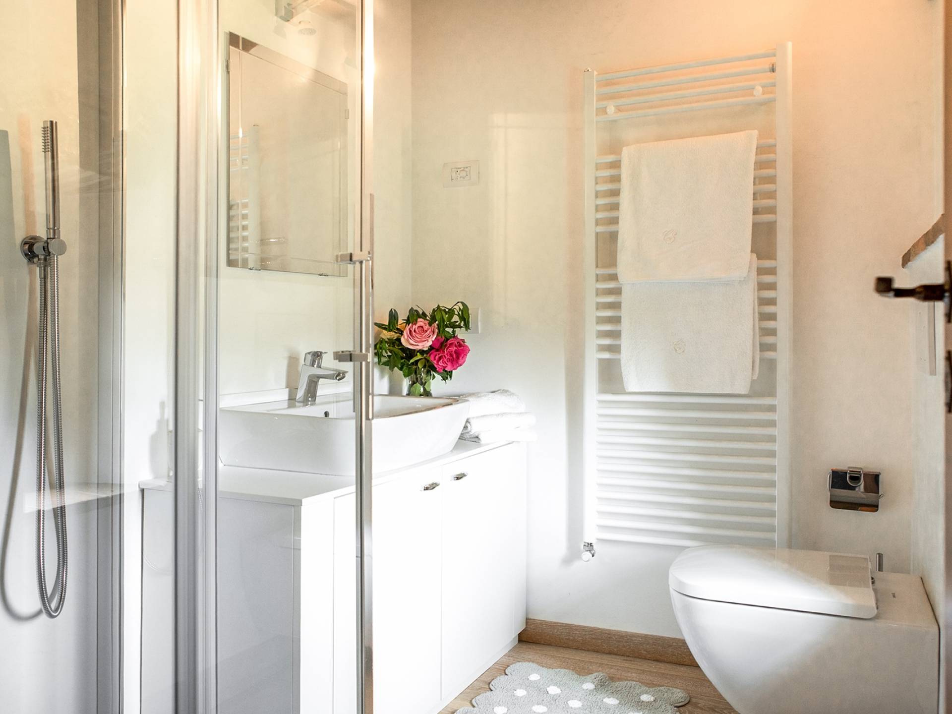 On the Villa lower floor you can find the RELAX room equipped with a treadmill, a stationary bike, a Sofa, and a bathroom with the shower.On the Villa’s ground floor you will find a living space with a sofa and a large terrace for your al fresco dining. On the Villa first floor are located the three bedrooms Rosa, Girasole and Peonia. Two have double beds and one have two single beds. All the bedrooms have an ensuite bathroom with a shower.