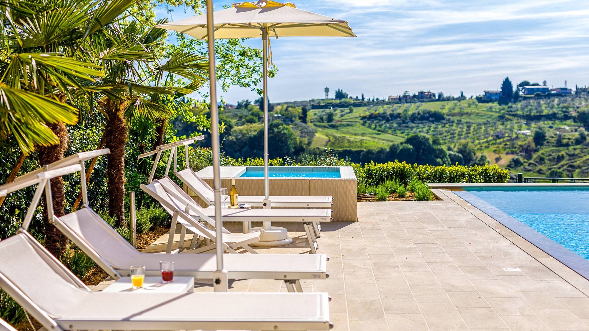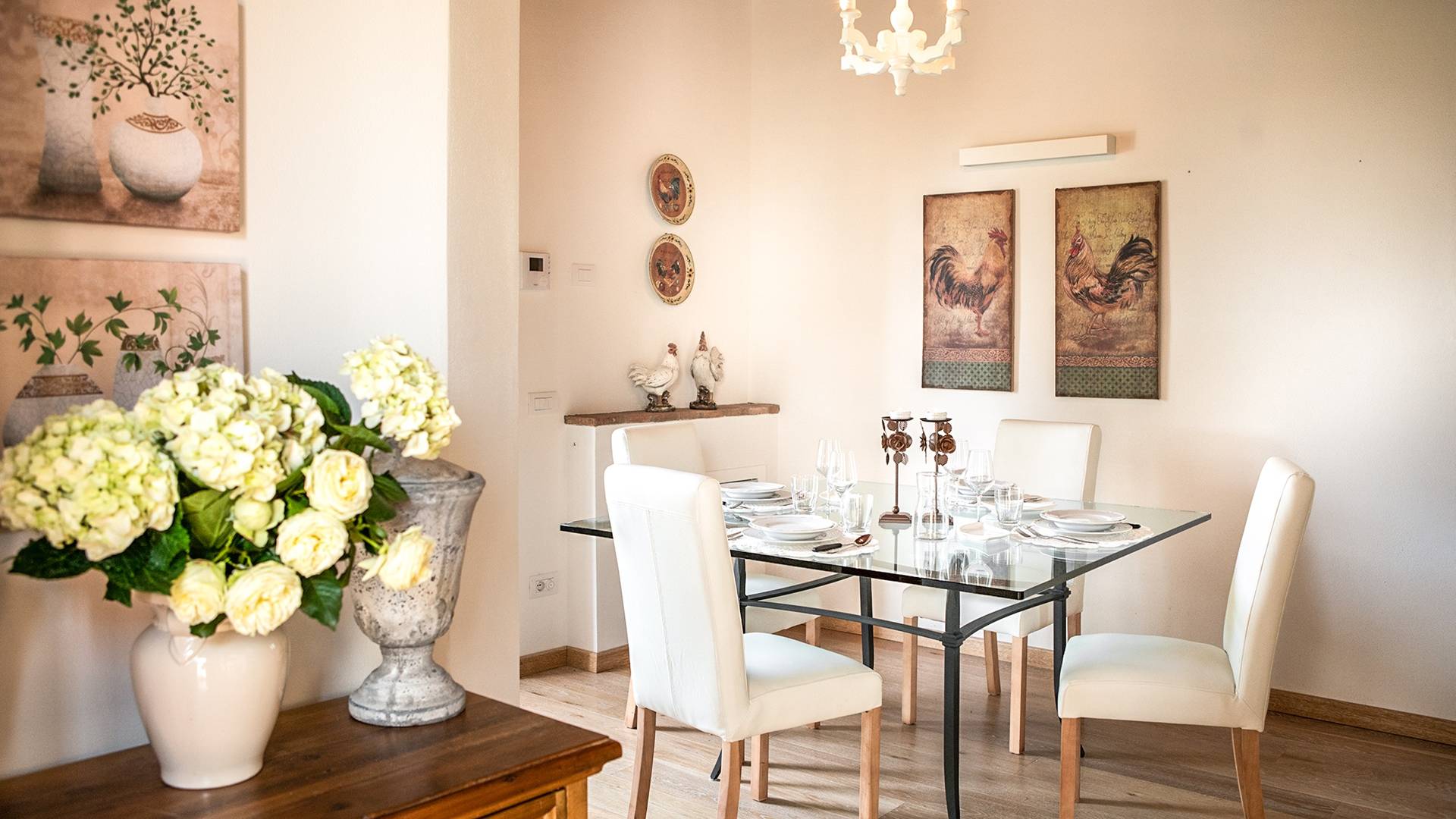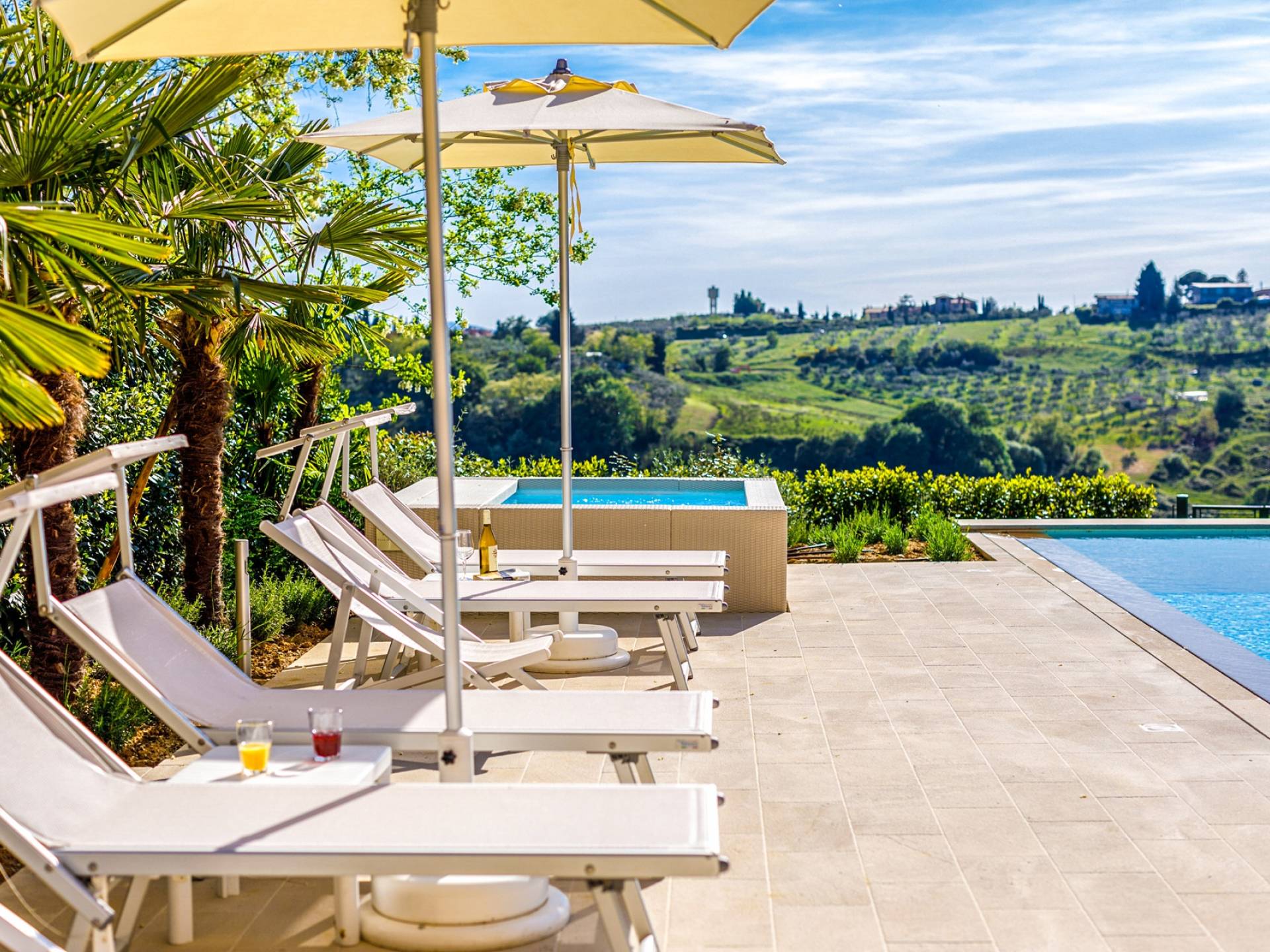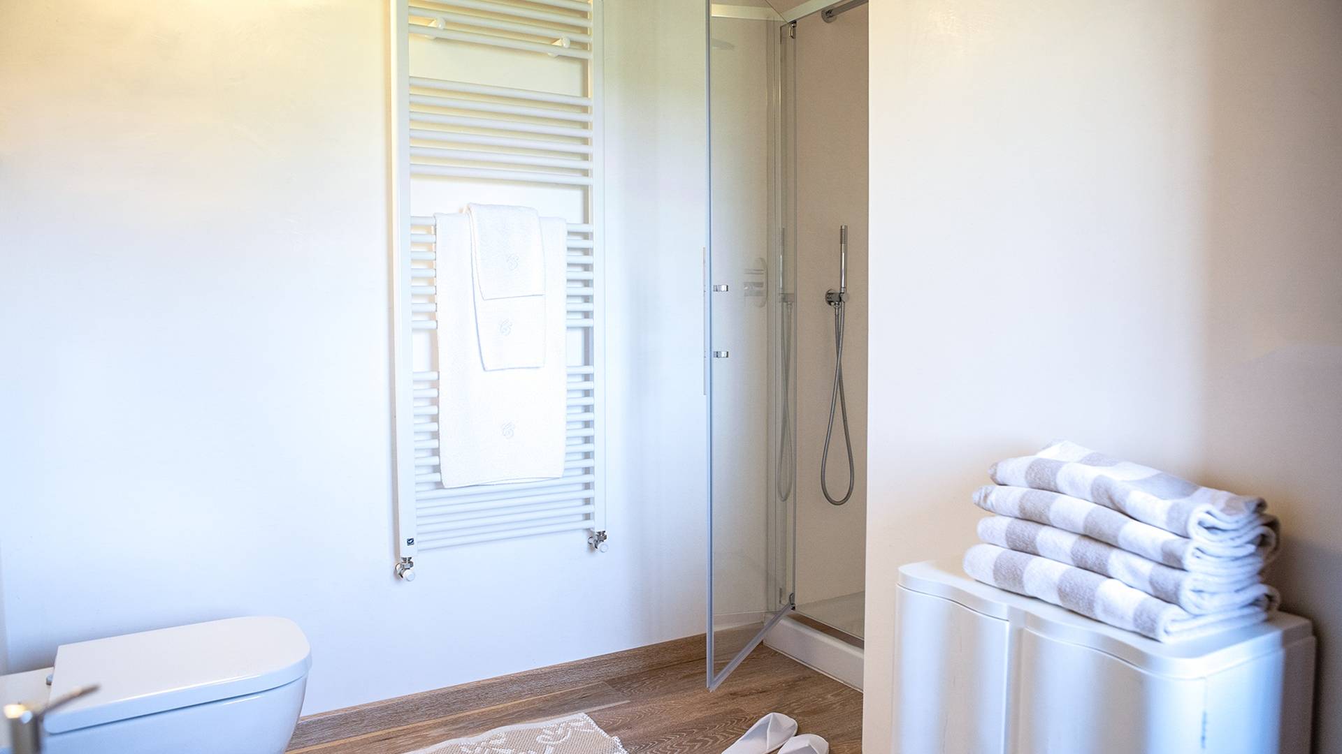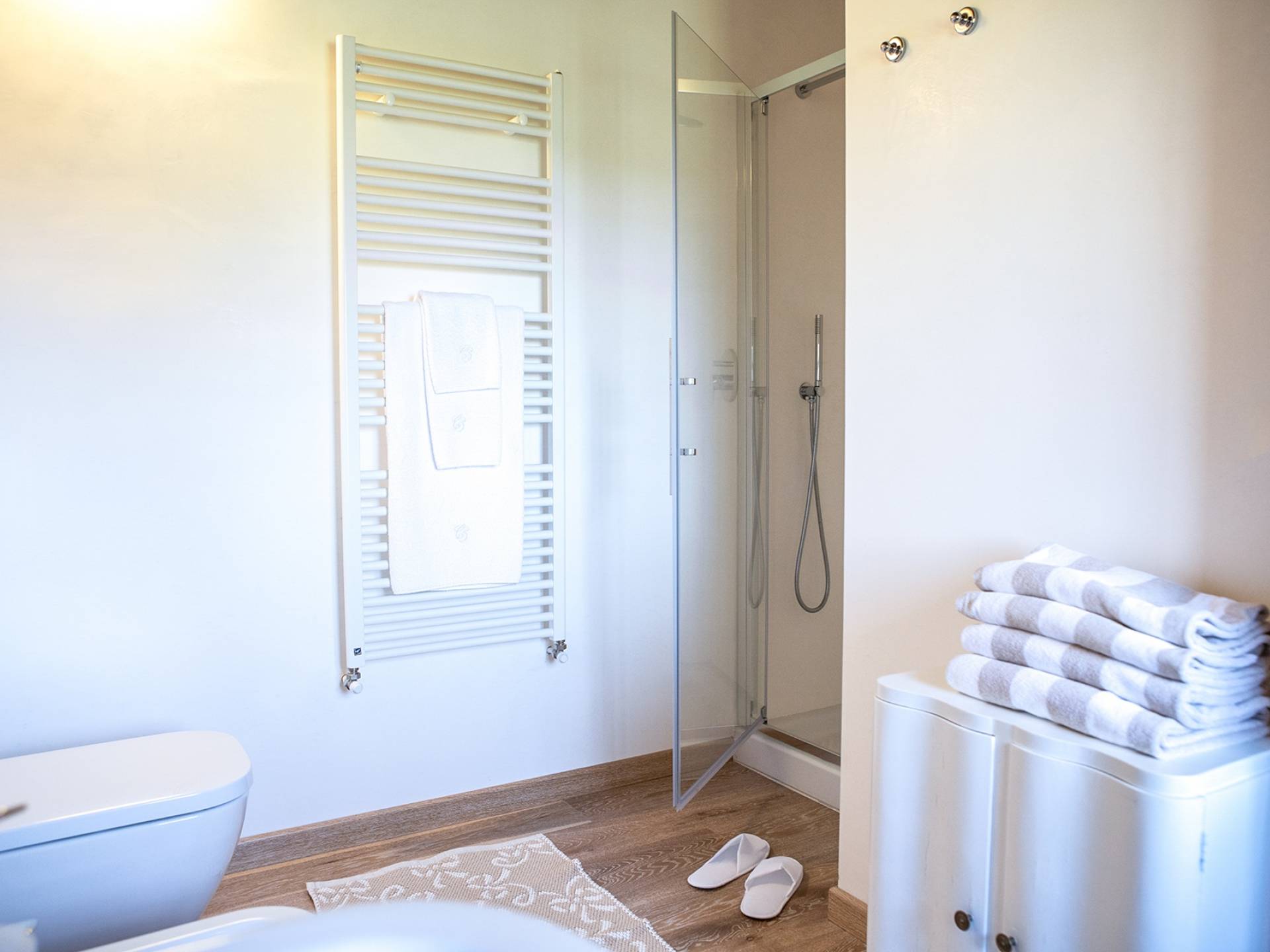On the Villa lower floor you can find the RELAX room equipped with a treadmill, a stationary bike, a Sofa, and a bathroom with the shower.On the Villa’s ground floor you will find a living space with a sofa and a large terrace for your al fresco dining. On the Villa first floor are located the three bedrooms Rosa, Girasole and Peonia. Two have double beds and one have two single beds. All the bedrooms have an ensuite bathroom with a shower.