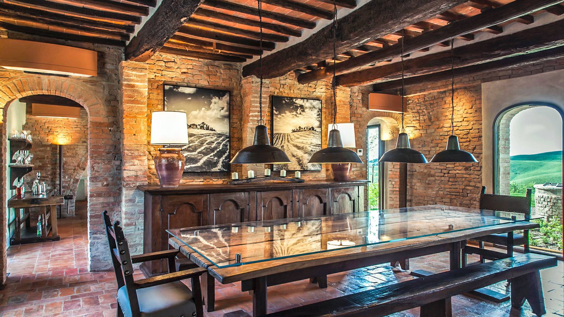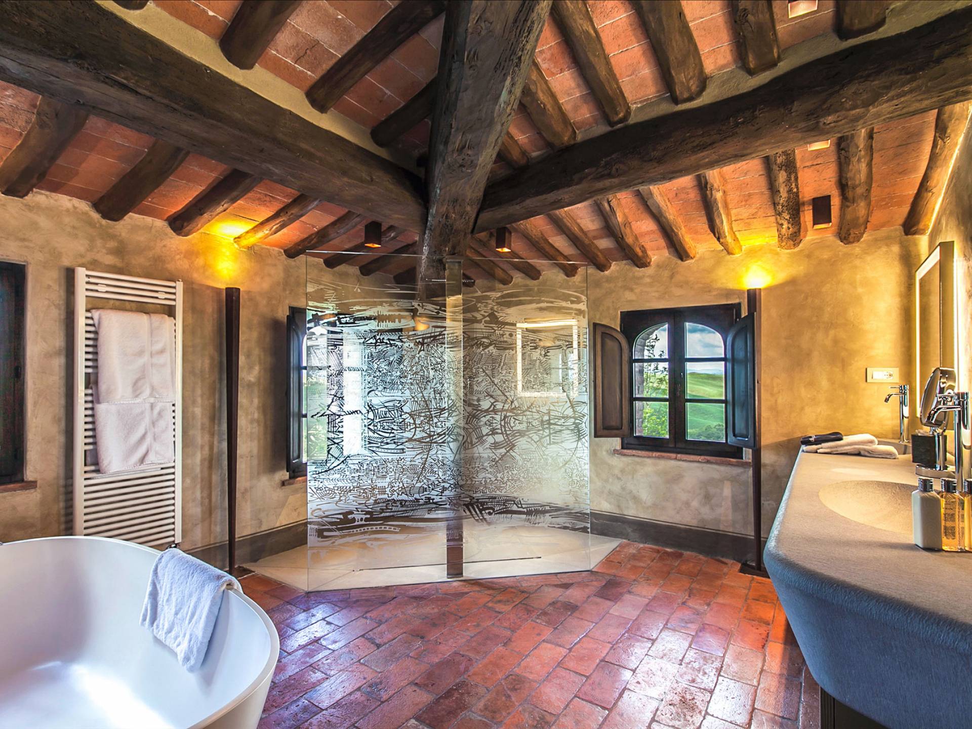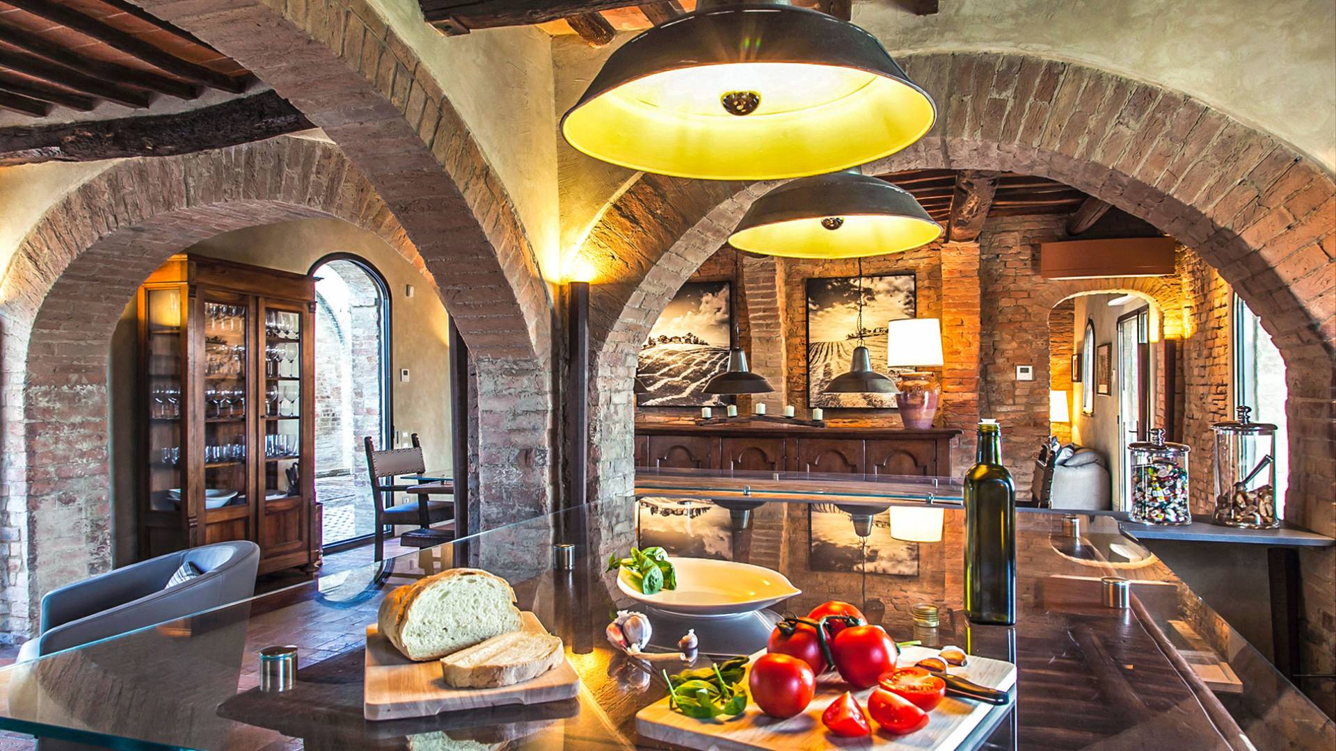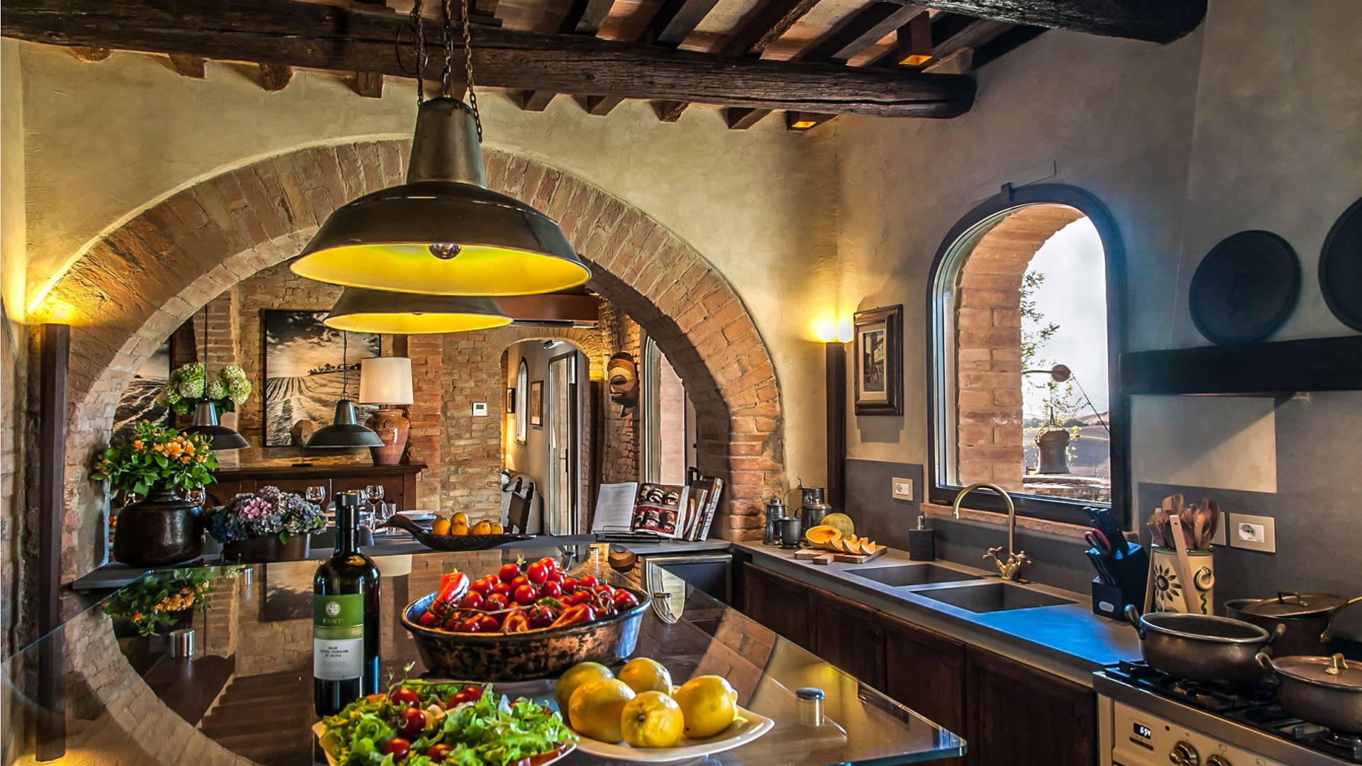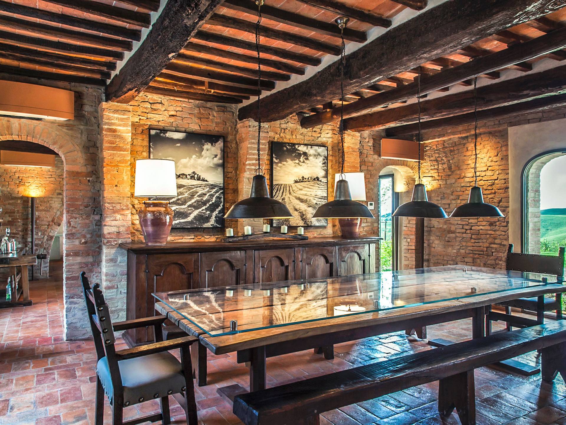 Villa Prode Tuscany open floor plan seamlessly blends contemporary standards, including modern plumbing and state-of-the-art appliances, with authentic Tuscan living. Each of the three master bedrooms and three king bed guest suites include modern en-suites, which allows this property to comfortably accommodate large family or group retreats. The generous kitchen, original forno oven, and traditional Tuscan fireplace make this farmhouse ideal for culinary adventures, while the outdoor swimming pool is the perfect location to relax and soak up the stunning landscapes. As guests gaze out the expansive windows across the horizon, drawn in by the changing seasonal colours of the crops and the details under the big skies – scattered olive groves, the lunar landscape, golden ochre, and the towers of Siena.