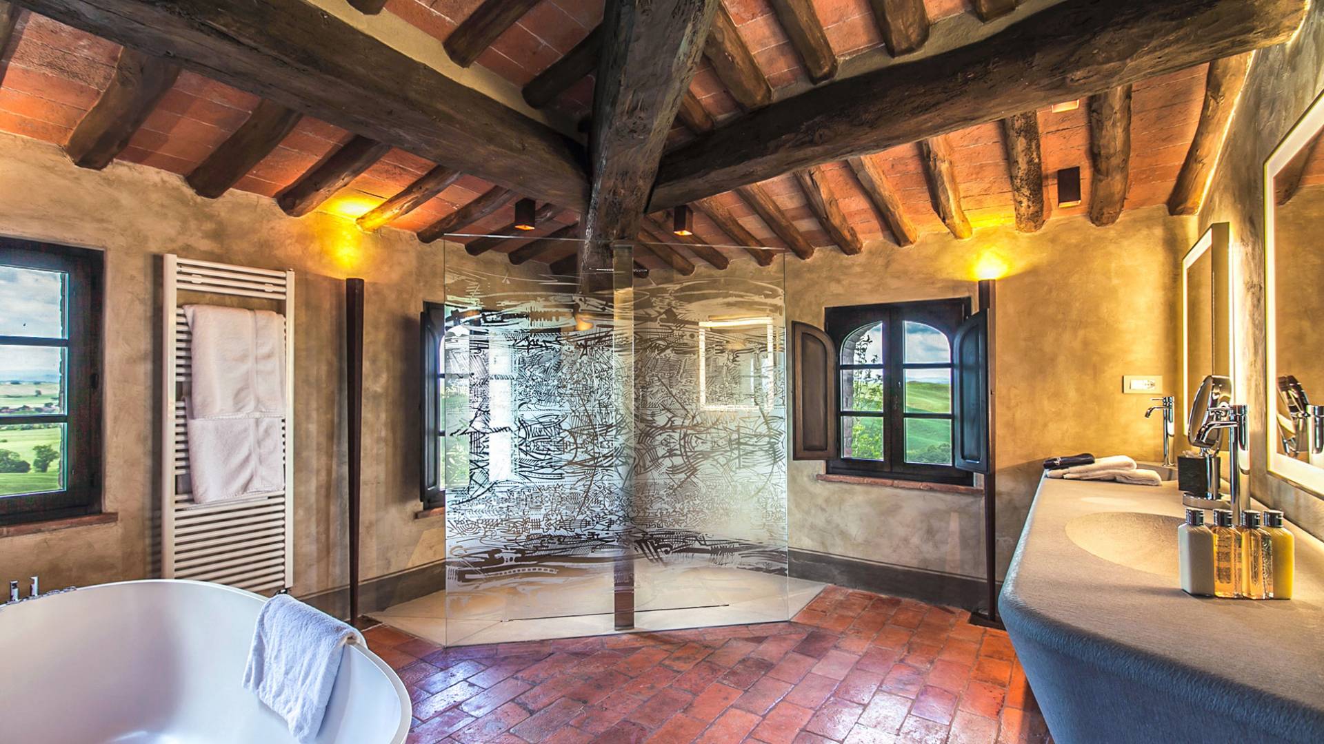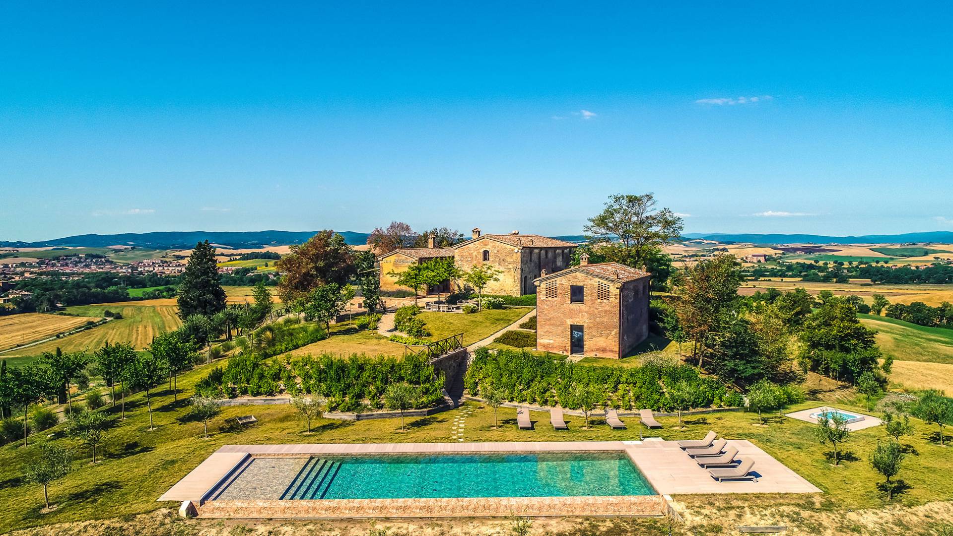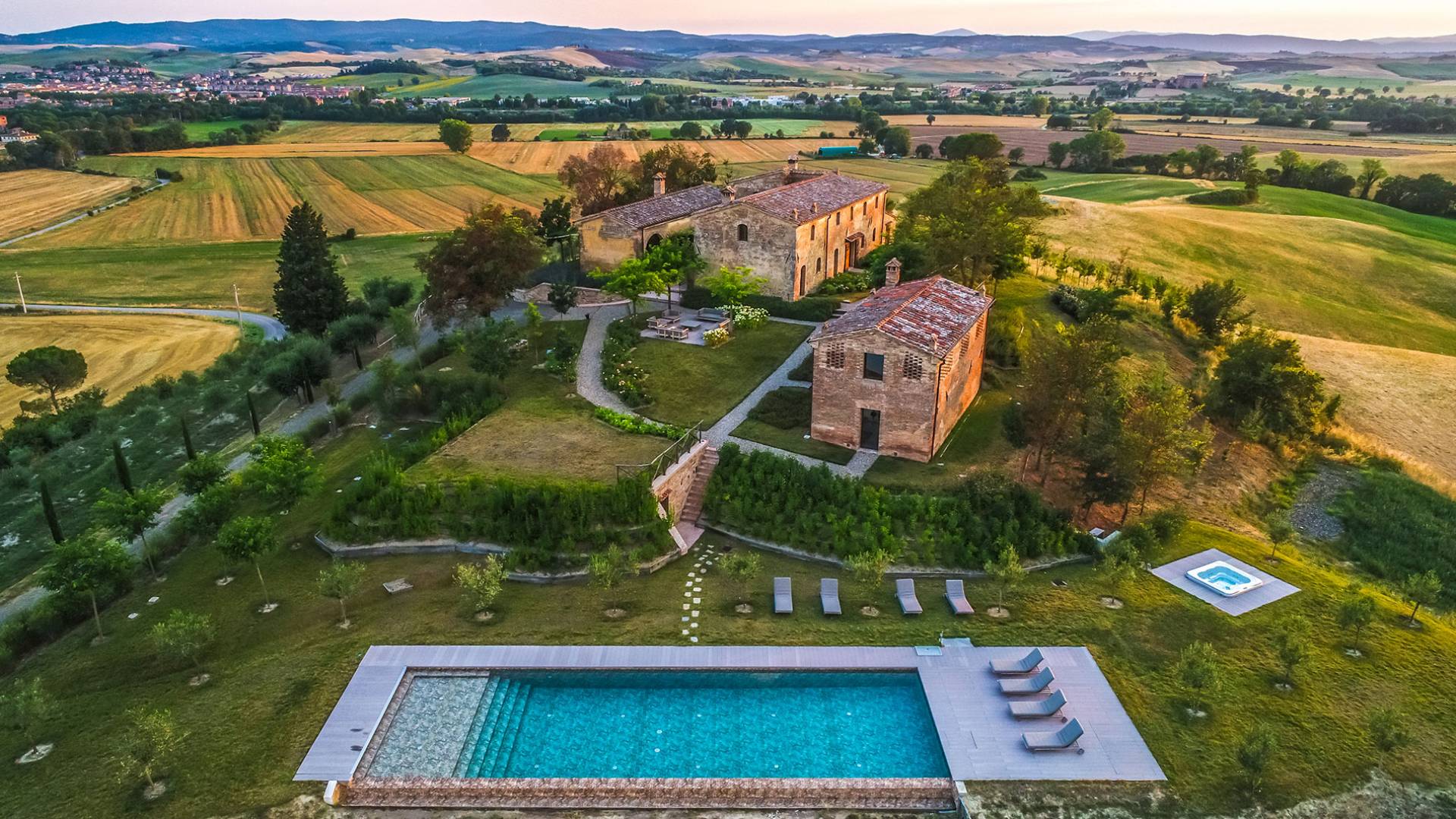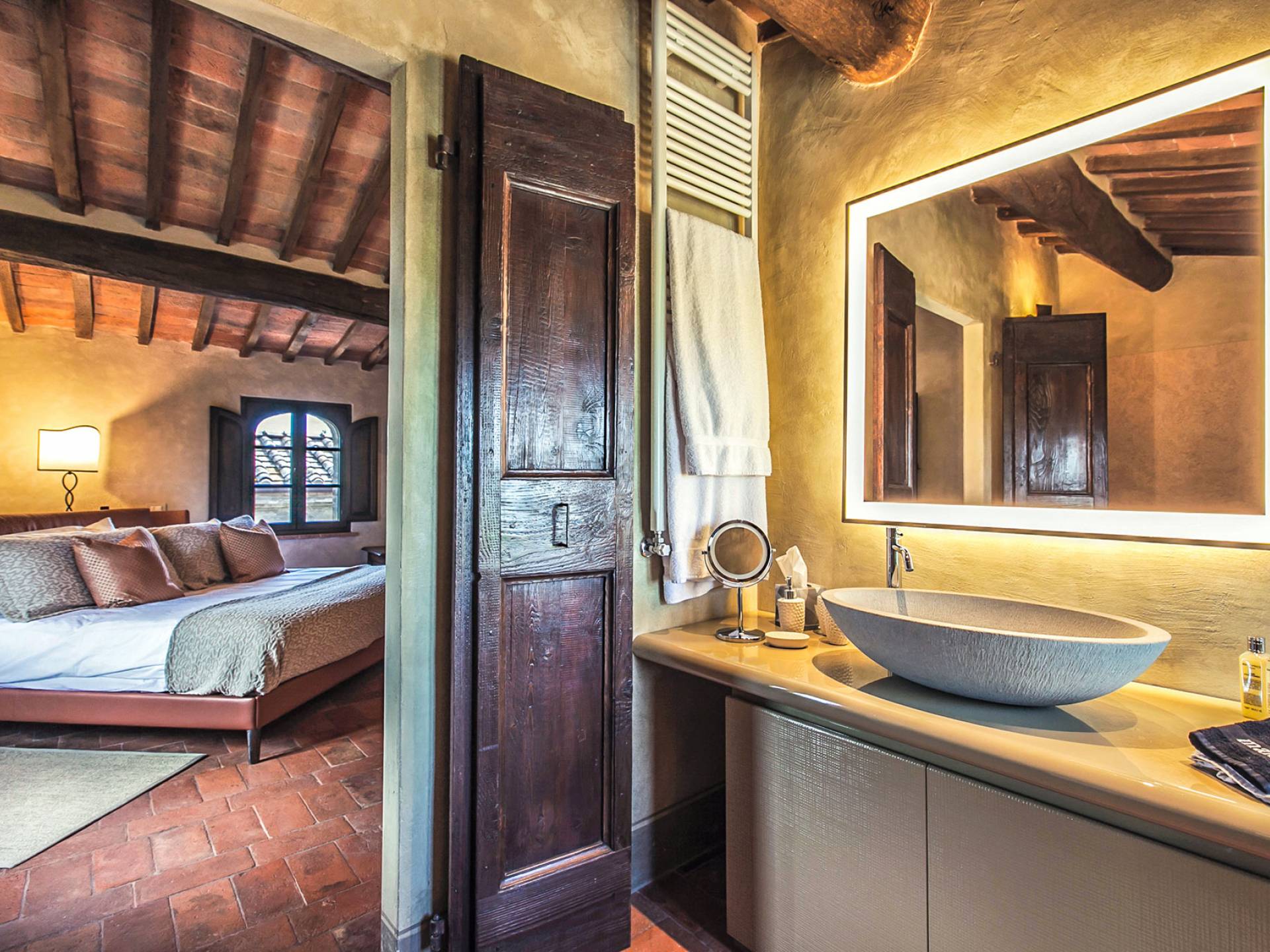 Villa Prode Tuscany open floor plan seamlessly blends contemporary standards, including modern plumbing and state-of-the-art appliances, with authentic Tuscan living. Each of the three master bedrooms and three king bed guest suites include modern en-suites, which allows this property to comfortably accommodate large family or group retreats. The generous kitchen, original forno oven, and traditional Tuscan fireplace make this farmhouse ideal for culinary adventures, while the outdoor swimming pool is the perfect location to relax and soak up the stunning landscapes. As guests gaze out the expansive windows across the horizon, drawn in by the changing seasonal colours of the crops and the details under the big skies – scattered olive groves, the lunar landscape, golden ochre, and the towers of Siena.