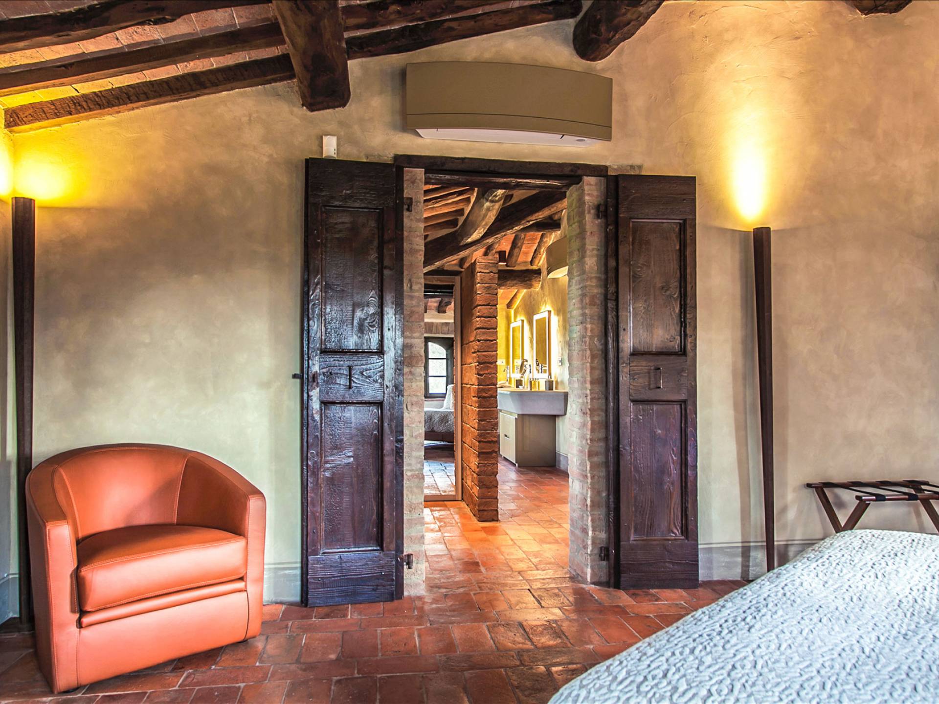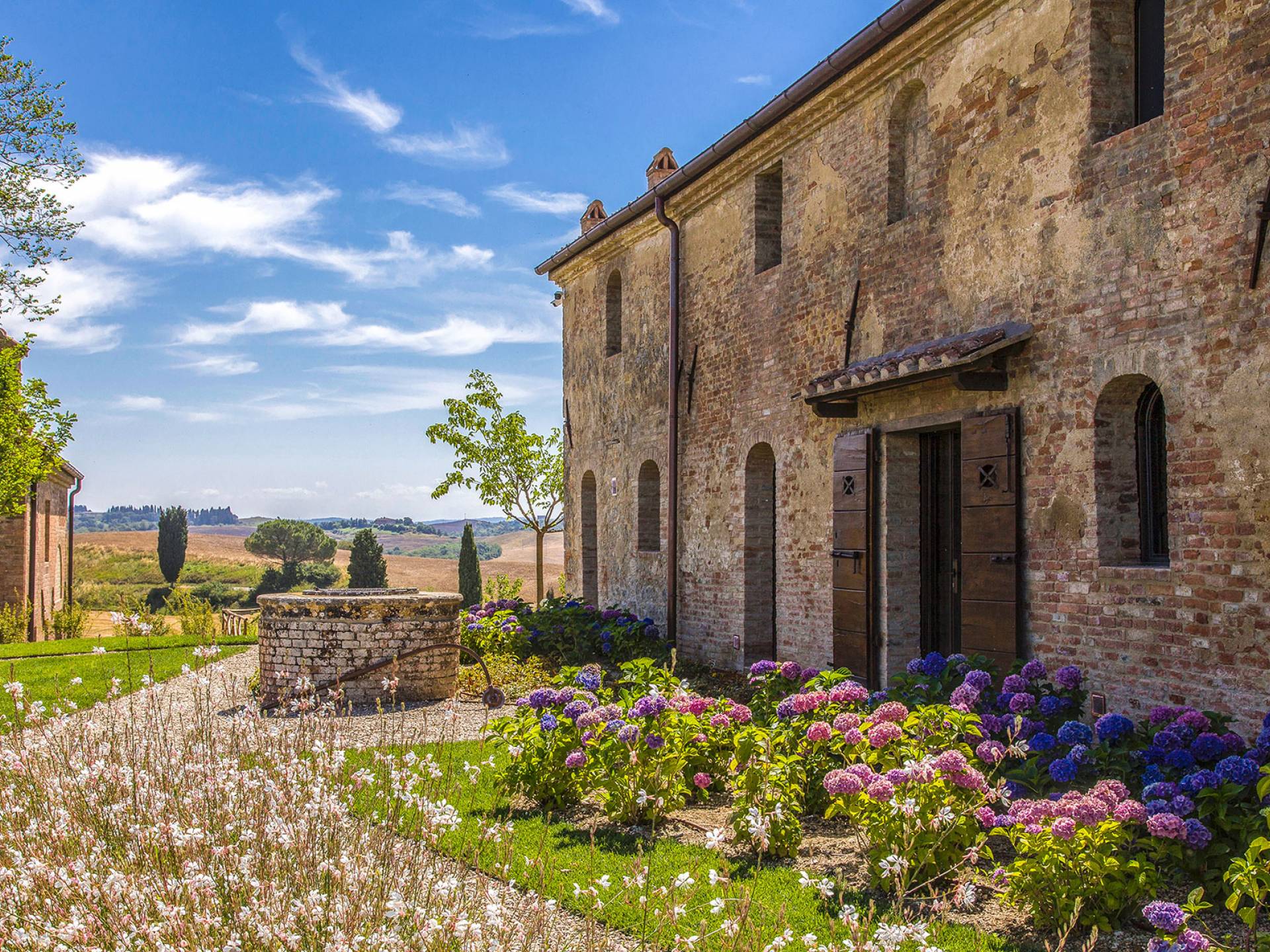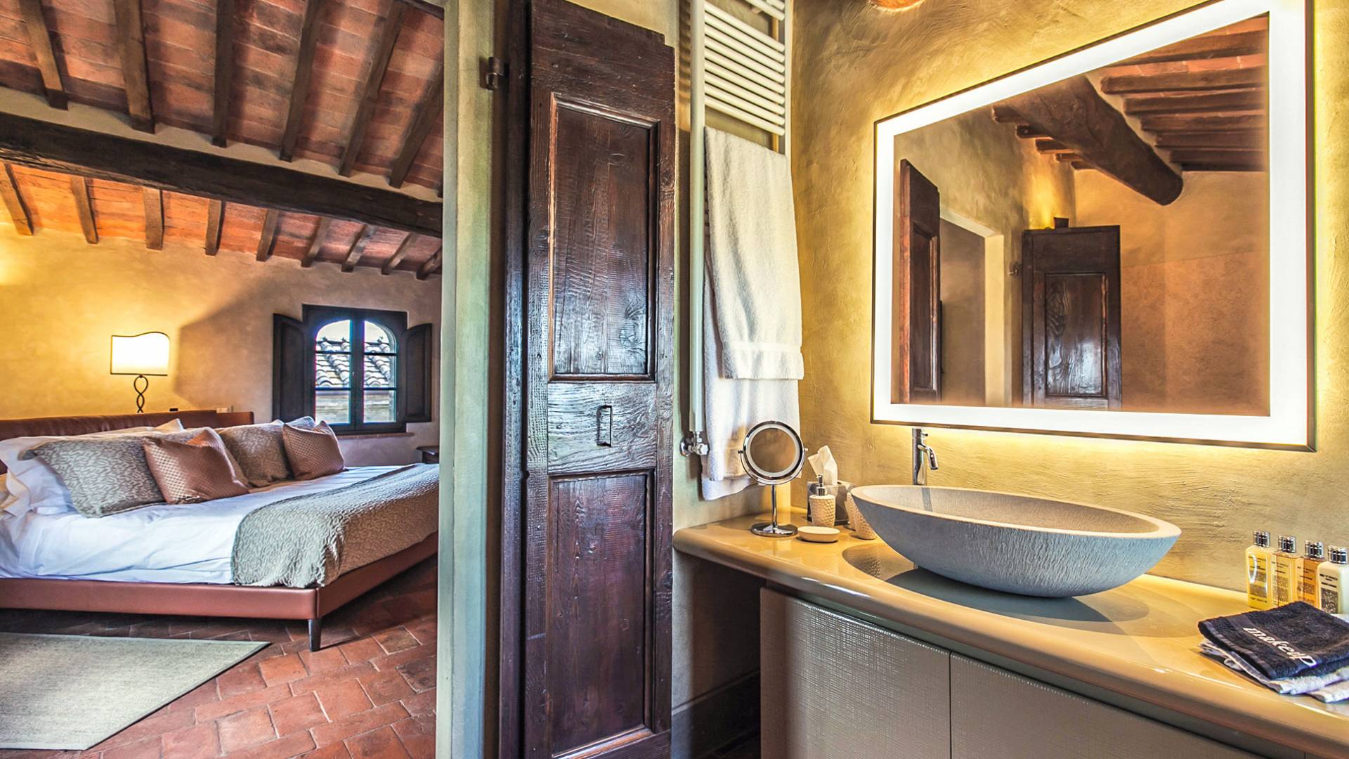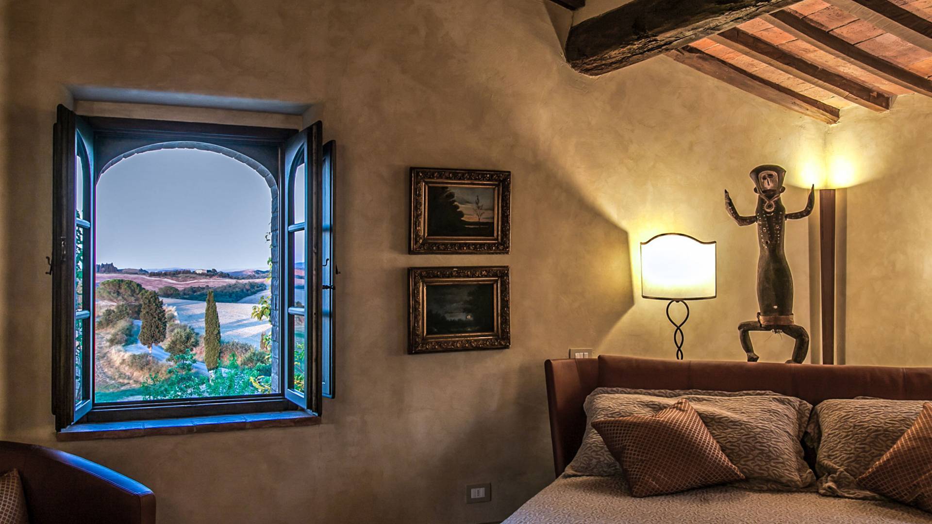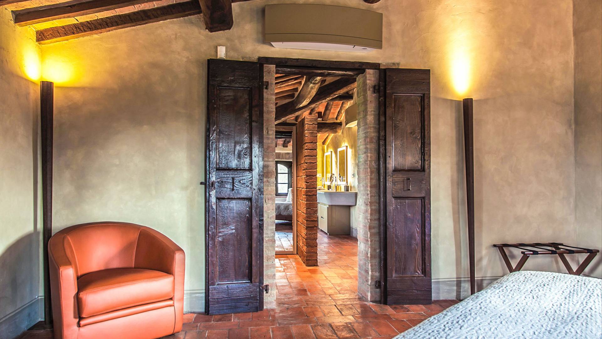 Villa Prode Tuscany open floor plan seamlessly blends contemporary standards, including modern plumbing and state-of-the-art appliances, with authentic Tuscan living. Each of the three master bedrooms and three king bed guest suites include modern en-suites, which allows this property to comfortably accommodate large family or group retreats. The generous kitchen, original forno oven, and traditional Tuscan fireplace make this farmhouse ideal for culinary adventures, while the outdoor swimming pool is the perfect location to relax and soak up the stunning landscapes. As guests gaze out the expansive windows across the horizon, drawn in by the changing seasonal colours of the crops and the details under the big skies – scattered olive groves, the lunar landscape, golden ochre, and the towers of Siena.