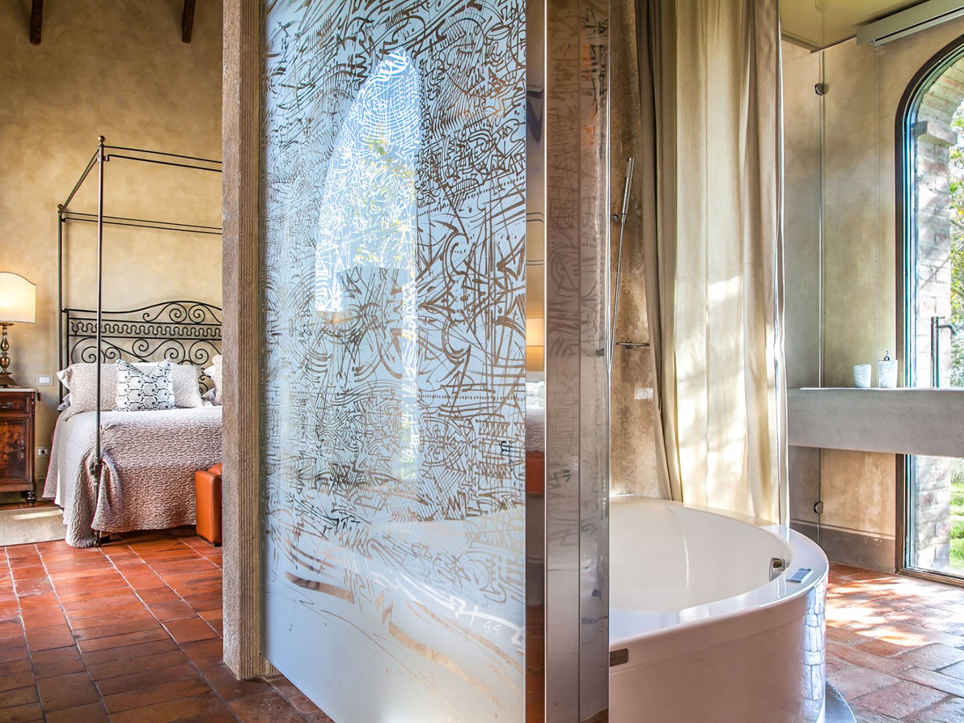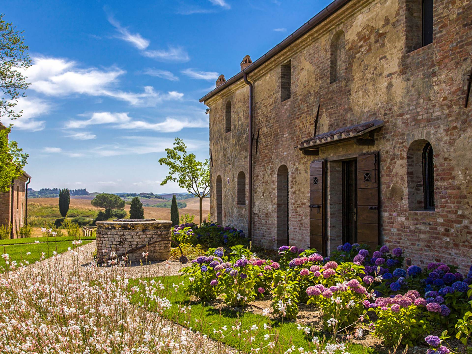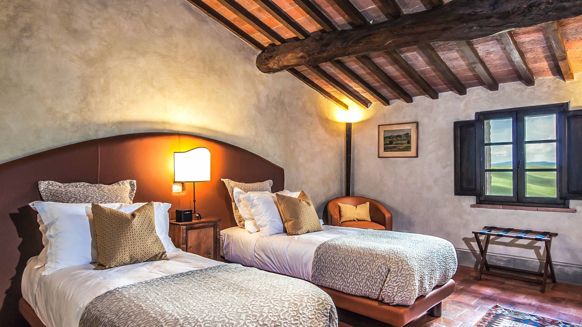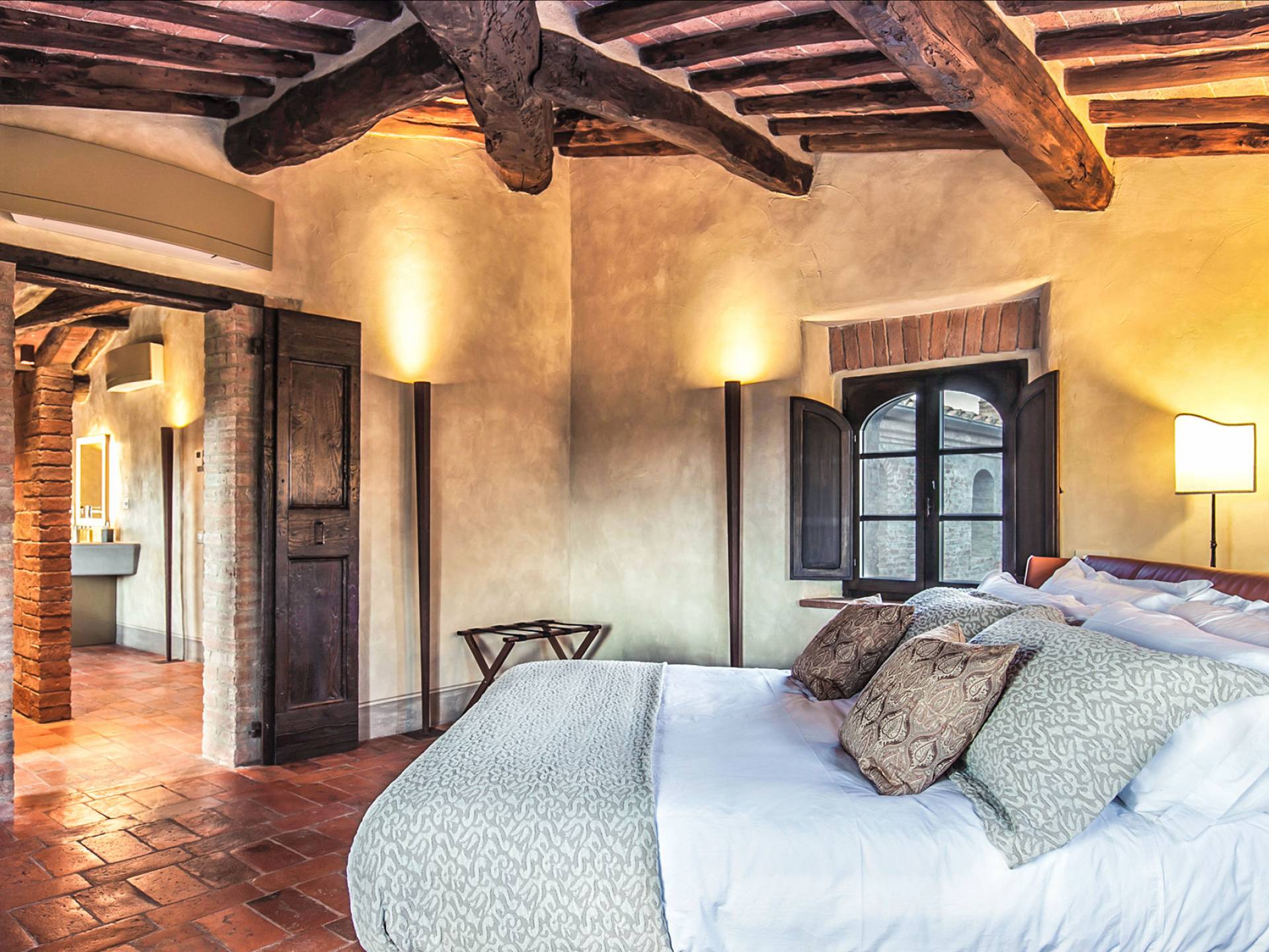 Villa Prode Tuscany open floor plan seamlessly blends contemporary standards, including modern plumbing and state-of-the-art appliances, with authentic Tuscan living. Each of the three master bedrooms and three king bed guest suites include modern en-suites, which allows this property to comfortably accommodate large family or group retreats. The generous kitchen, original forno oven, and traditional Tuscan fireplace make this farmhouse ideal for culinary adventures, while the outdoor swimming pool is the perfect location to relax and soak up the stunning landscapes. As guests gaze out the expansive windows across the horizon, drawn in by the changing seasonal colours of the crops and the details under the big skies – scattered olive groves, the lunar landscape, golden ochre, and the towers of Siena.