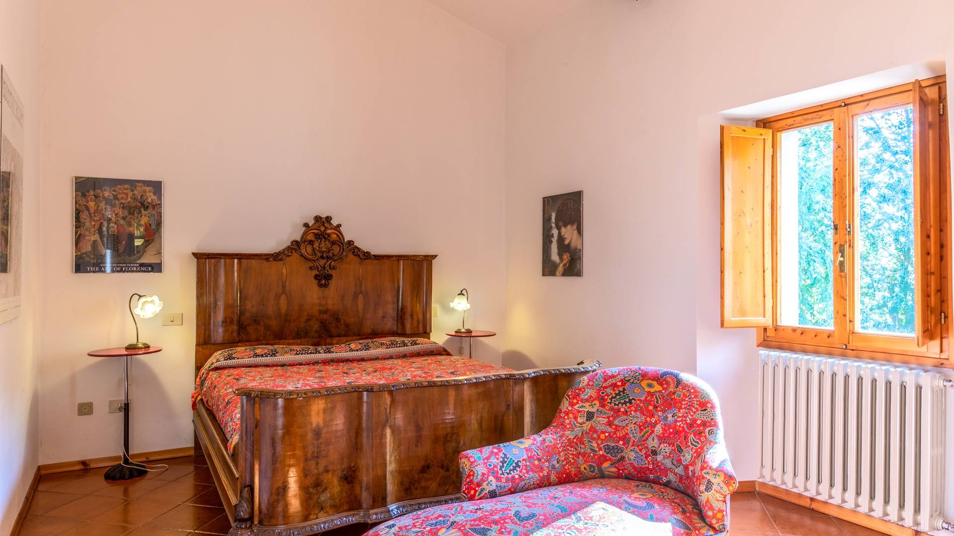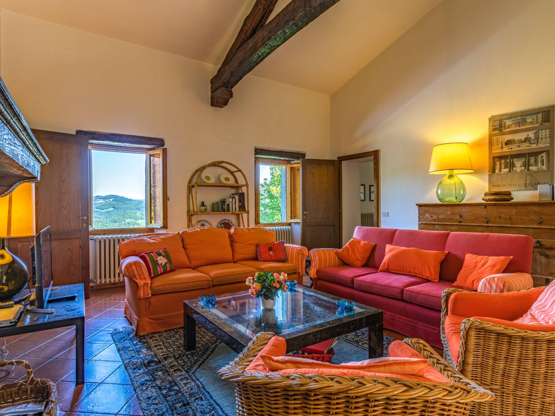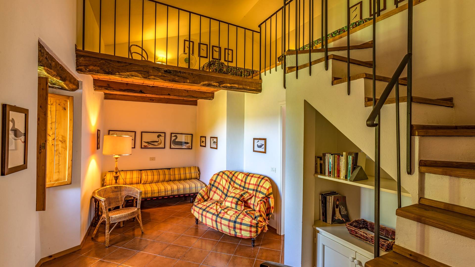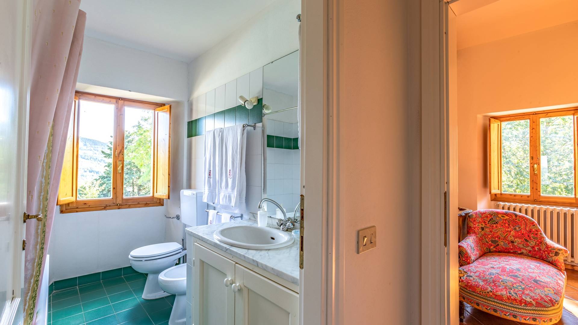 The living room on the first floor is particularly large and bright. The large space is directly connected to the dining room which, in turn, has access to the kitchen. The openings to the outside give all the rooms lots of light but also unique views. The mezzanine and first floor rooms are also spacious and comfortable, wherefrom the windows you can admire the hills with evergreen trees and the village of Tredozio in the valley below.