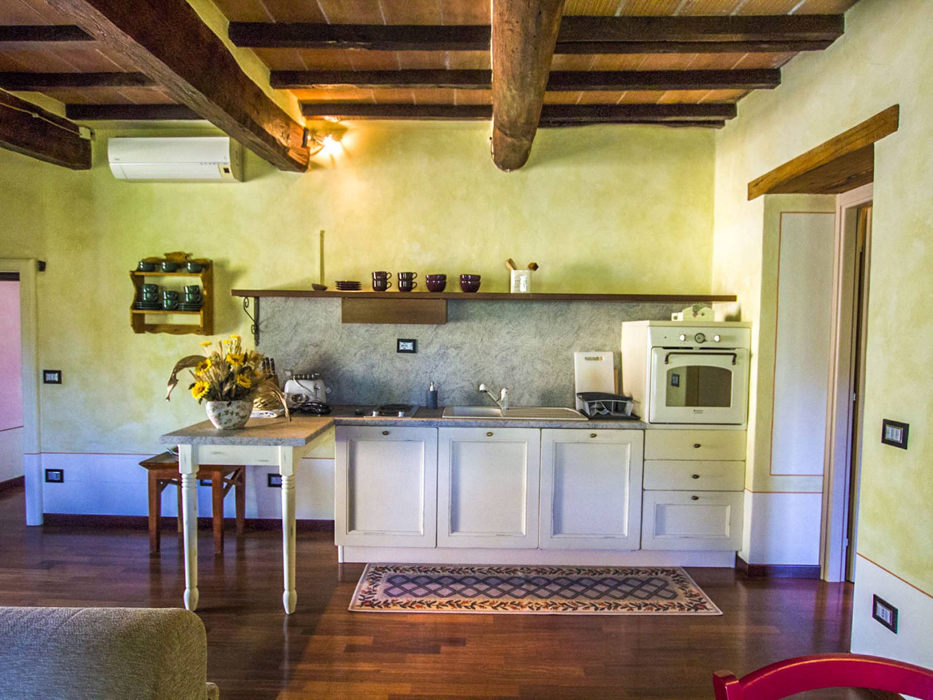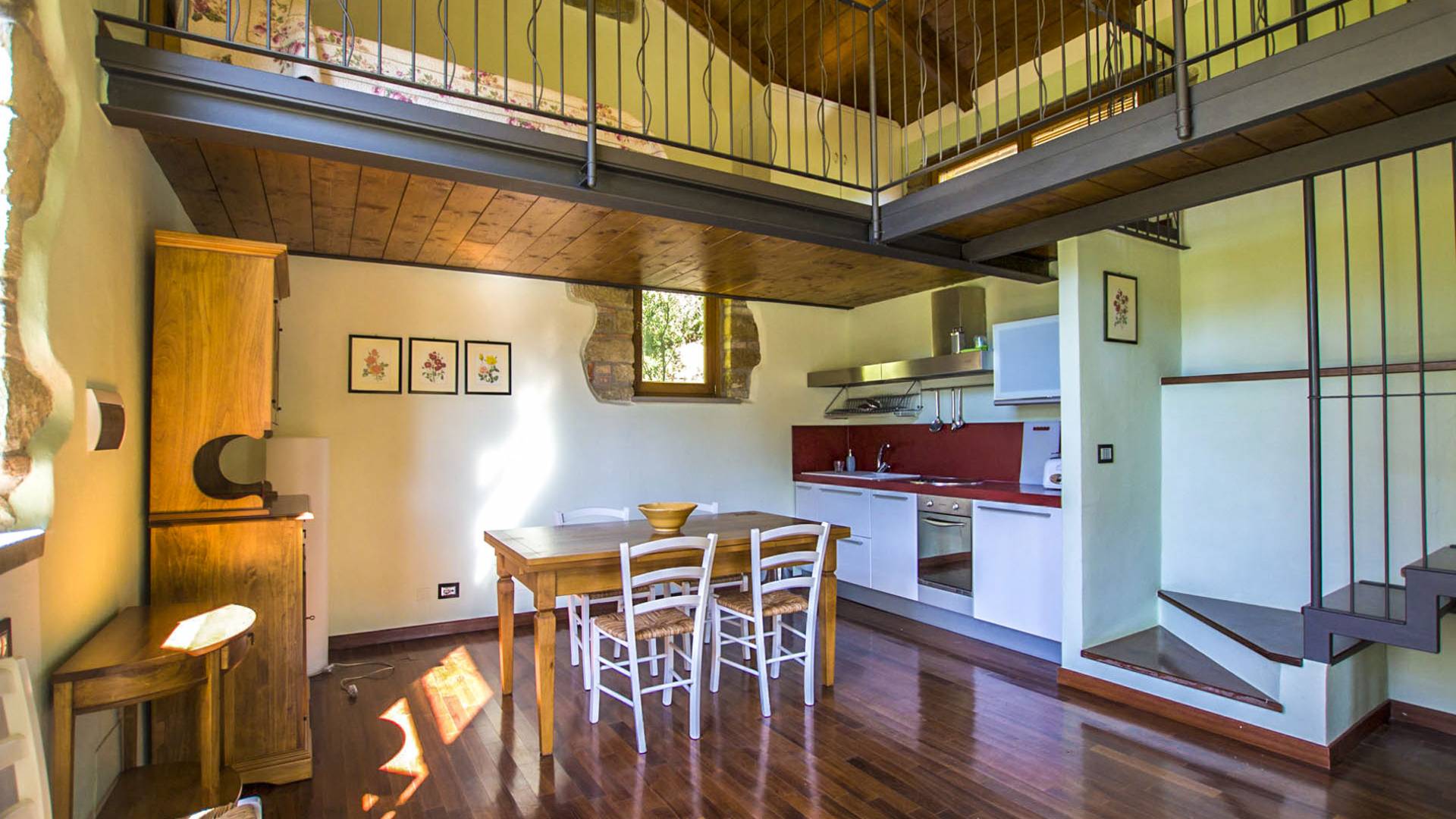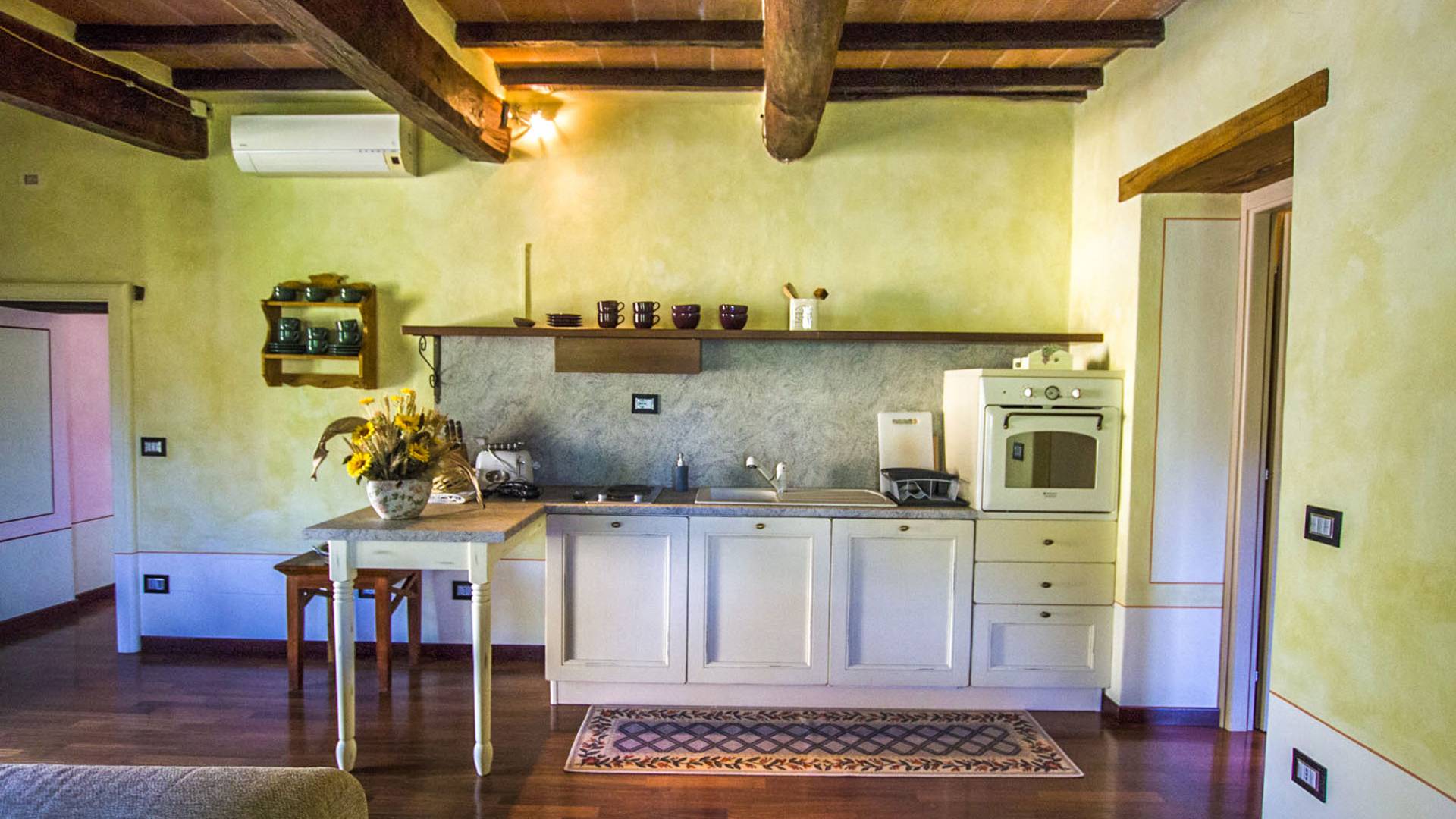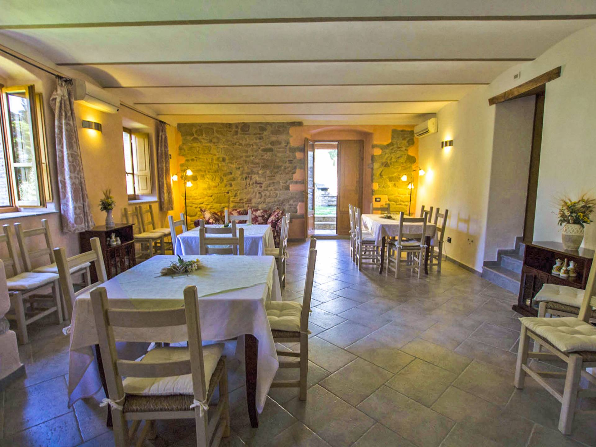 The interiors are light and airy, with floors that range between artisan terracotta and parquet. The wooden ceilings give a rustic air and at the same time refined to all spaces. The 6 apartments can accommodate a total of 19 people, divided into 9 comfortable double rooms and 2 single rooms. Each room is characterized by typical rustic elements of local craftsmanship. In addition to the 10 bathrooms equipped with all modern comforts, guests also have a common room with double ovens and a stove capable of accommodating up to 25 people.
