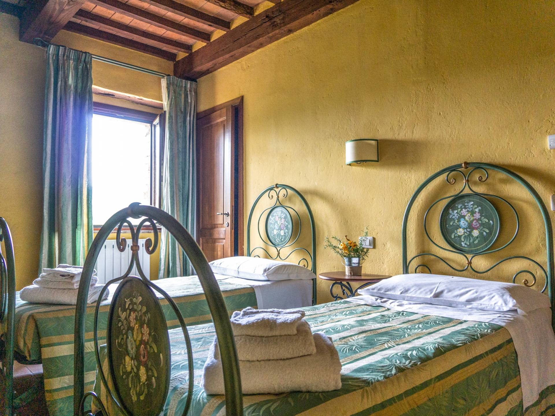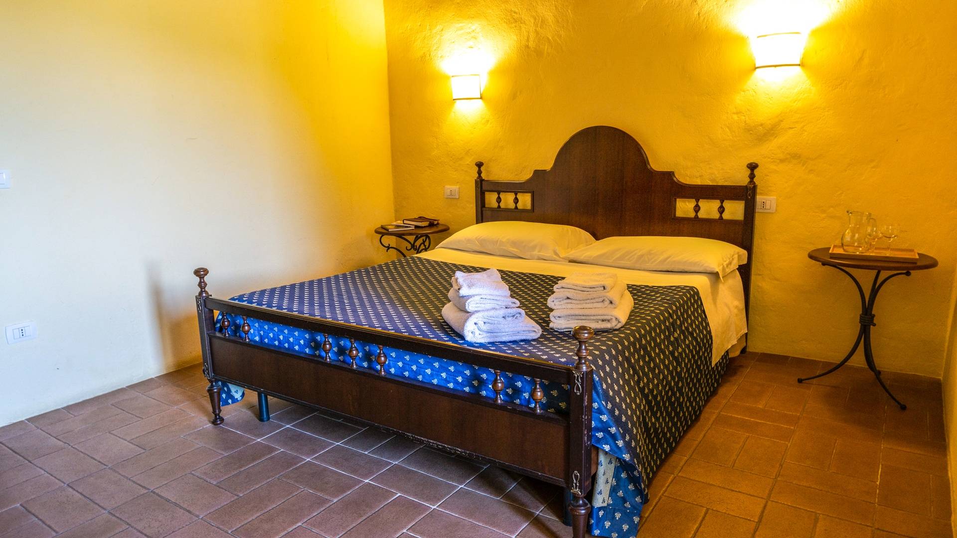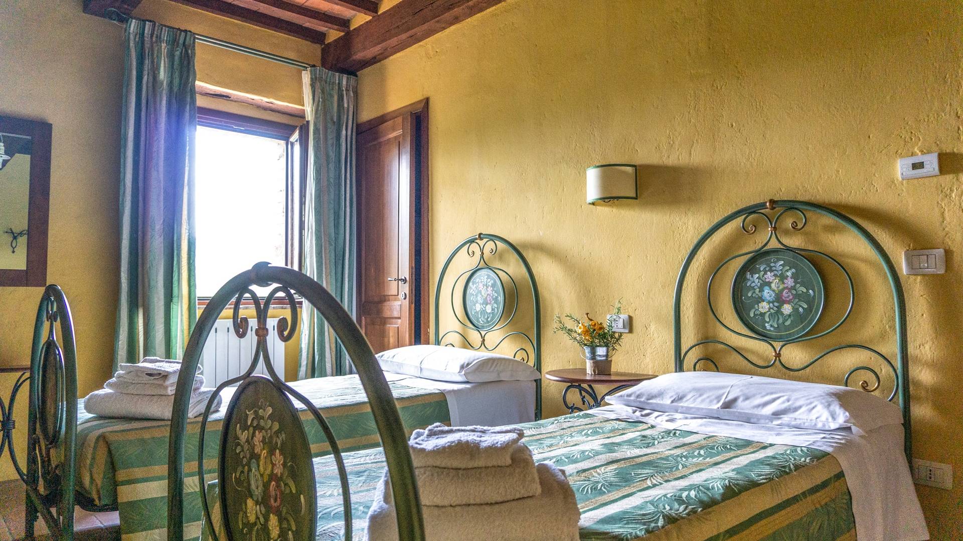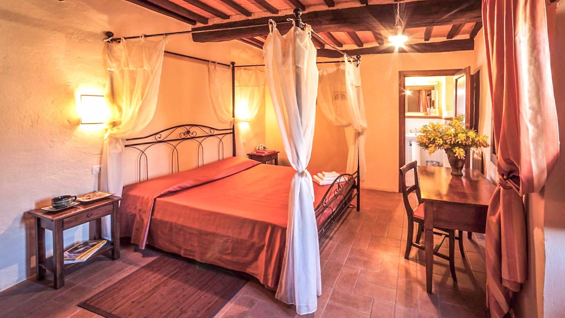 In the sleeping area, with brightly colored walls, four-poster beds, terracotta floors, wooden beams on the ceilings, walnut writing desks, painted wrought iron headboards, bathroom furniture made by the skilled hands of the Umbrian artisans, will make you find the dreamy atmosphere that inspired the tales of a thousand and one nights, that began with “Once upon a time …”