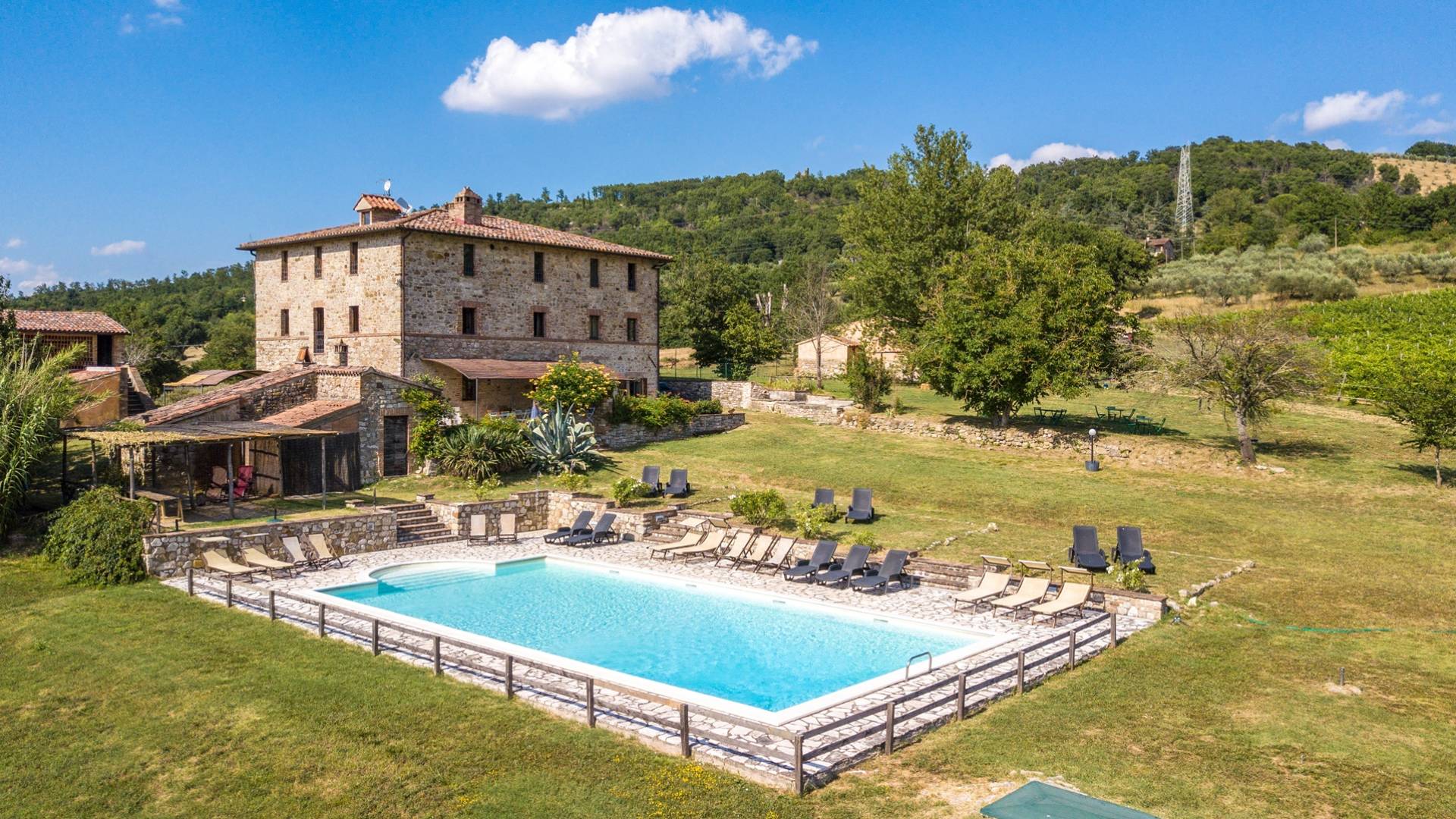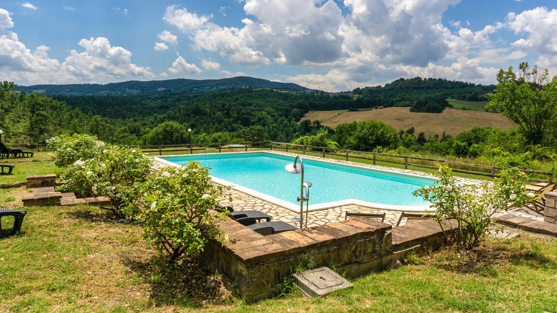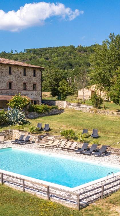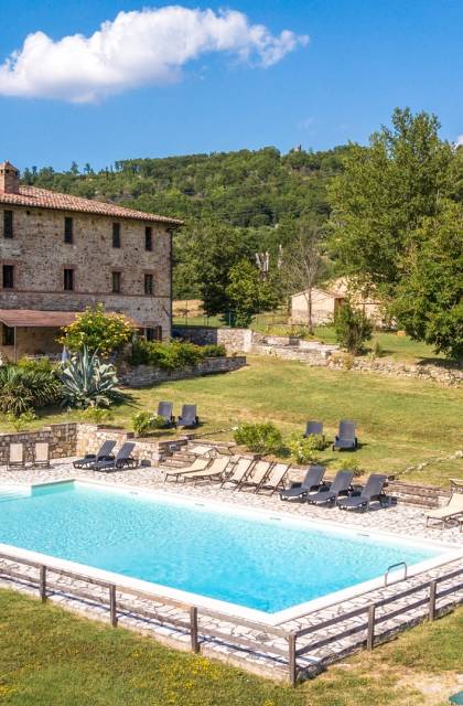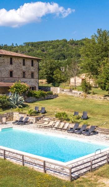 In the heart of a large farm of 12 hectares of land, planted with woods, vineyards, and olive groves; Villa La Prateria is an oasis of peace ready to welcome you and open the doors of an ancient rural complex completely restored respecting the Umbrian tradition, the green heart region of Italy that houses this charming residence where everything has the flavor of conviviality.