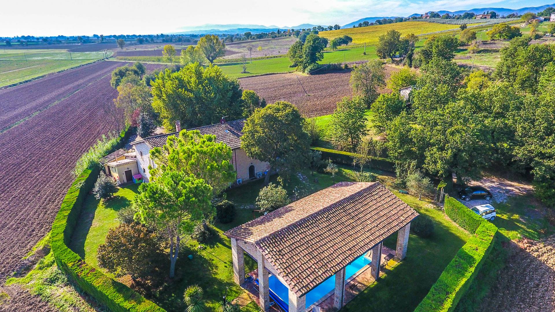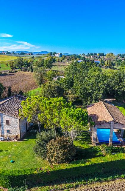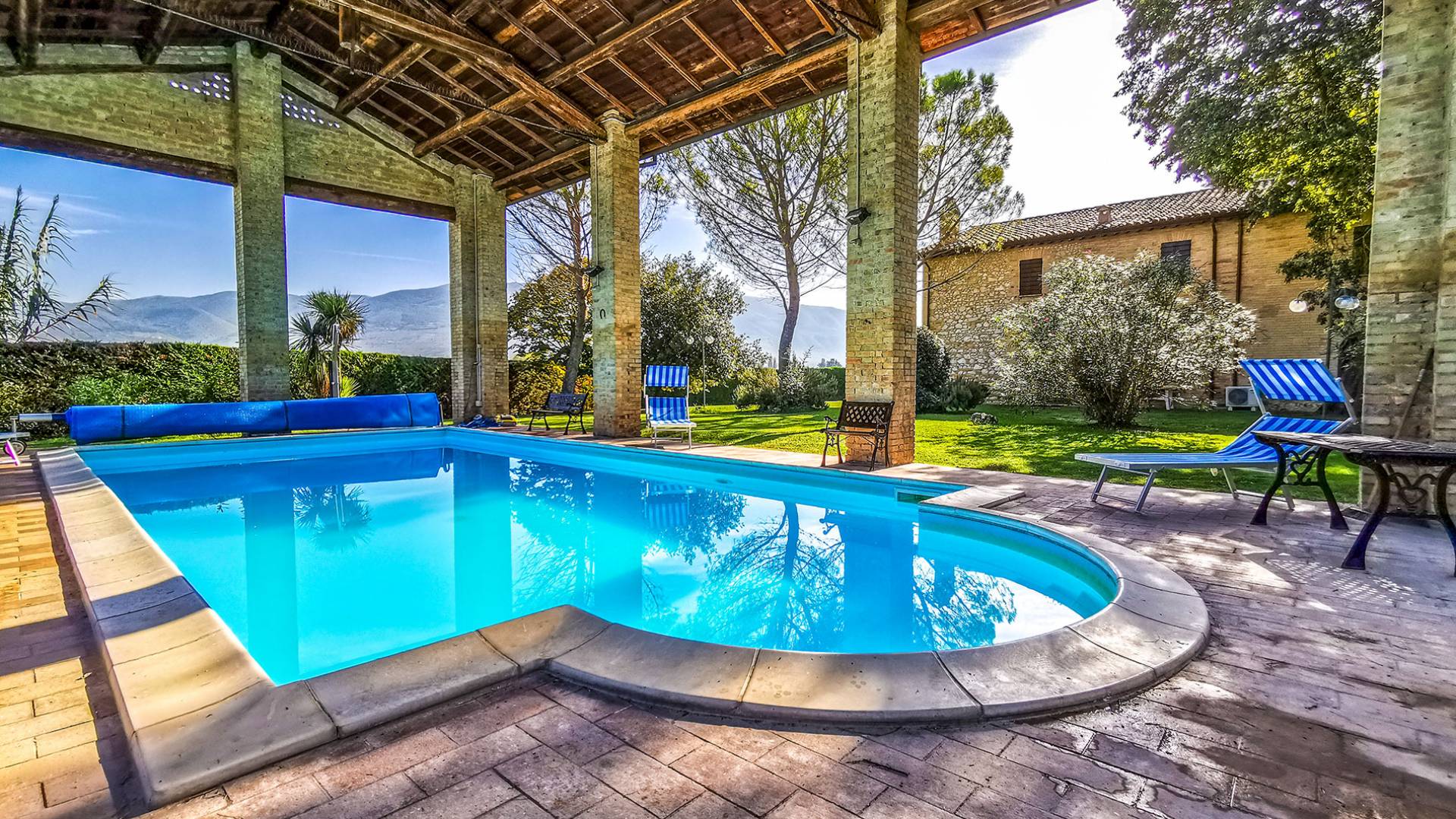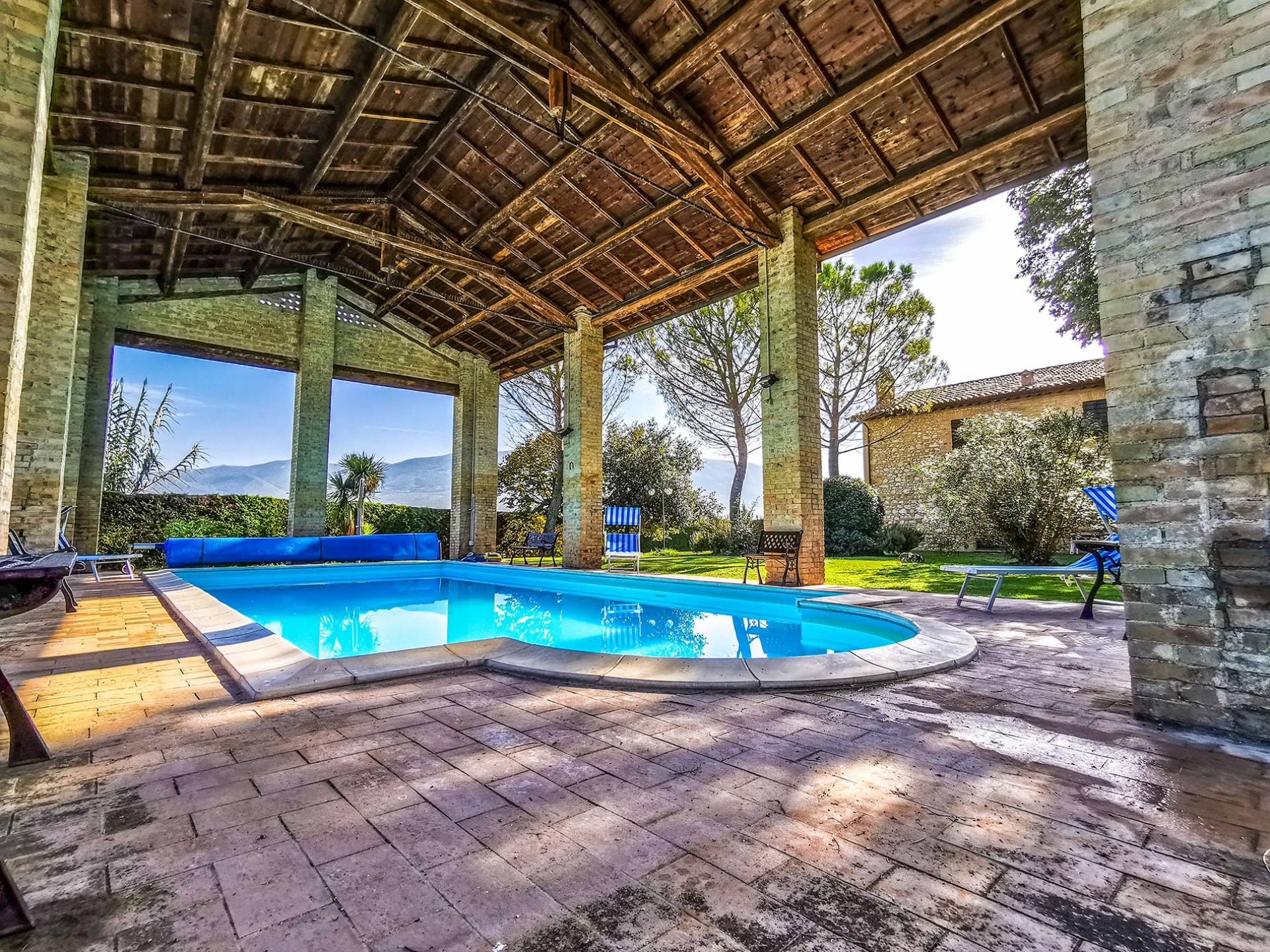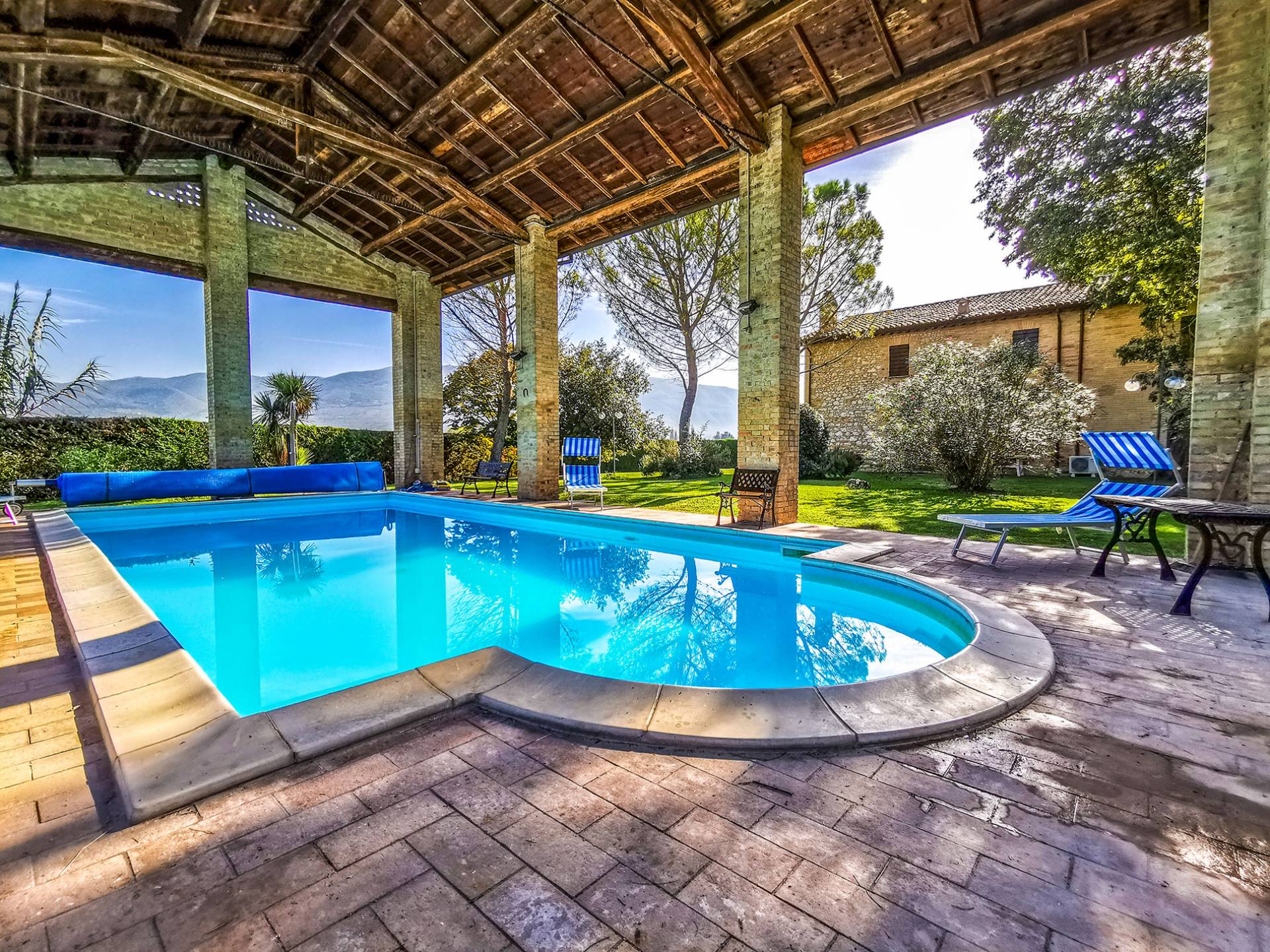Arranged on two levels, the structure is able to receive up to 12 people, giving them the opportunity to enjoy, as well as a strategic position that allows reaching characteristic towns such as Spoleto, Todi, Perugia, and Assisi in a few minutes, even a large outdoor pool, but protected by a roof, and a bright covered veranda in the center of which is a relaxing Jacuzzi tub. The ground floor consists of a large living room, dining room, kitchen, double bedroom with a private bathroom with shower, utility room, service bathroom, and bright enclosed veranda. On the first floor, there is a small hallway, three double