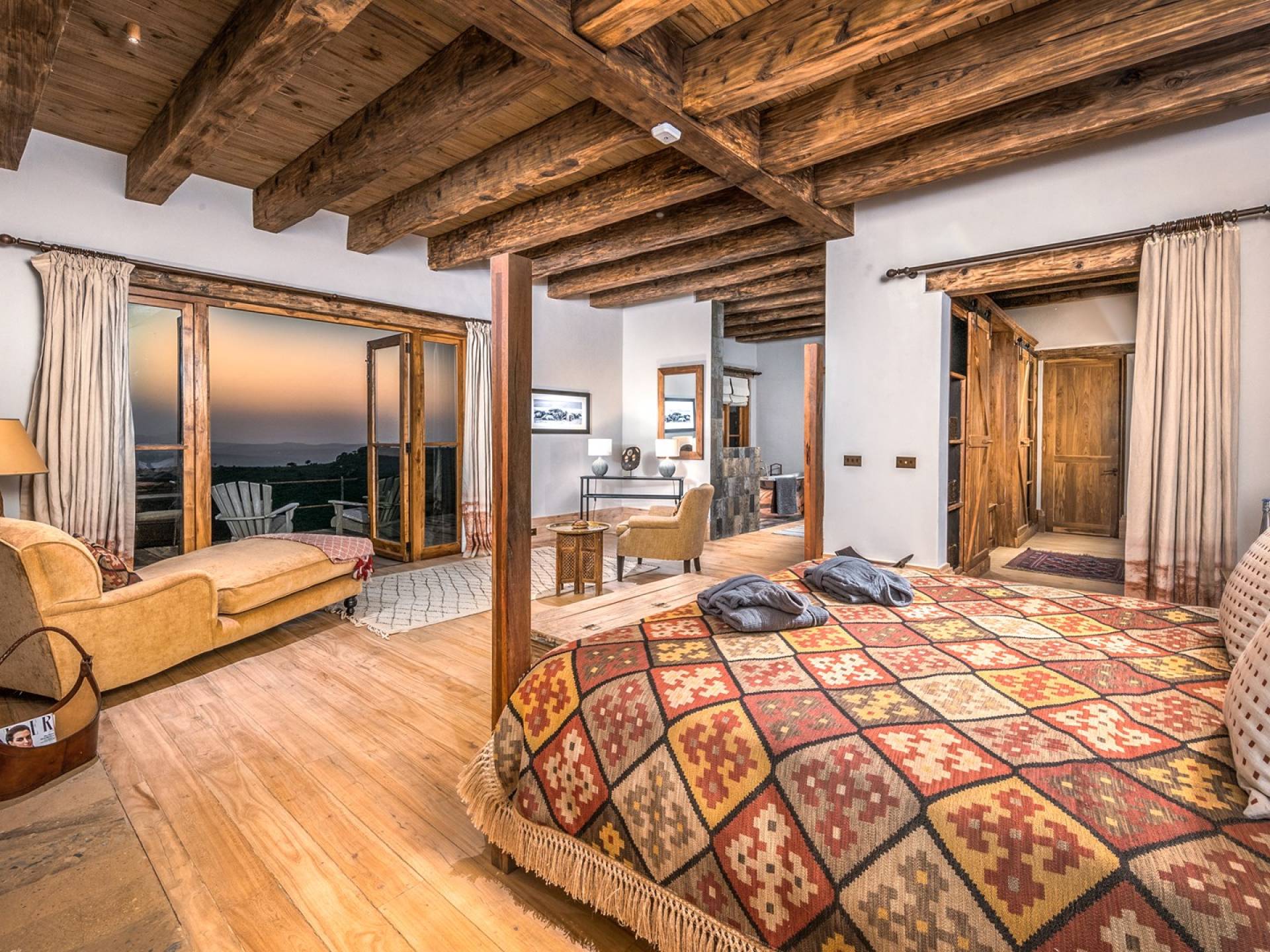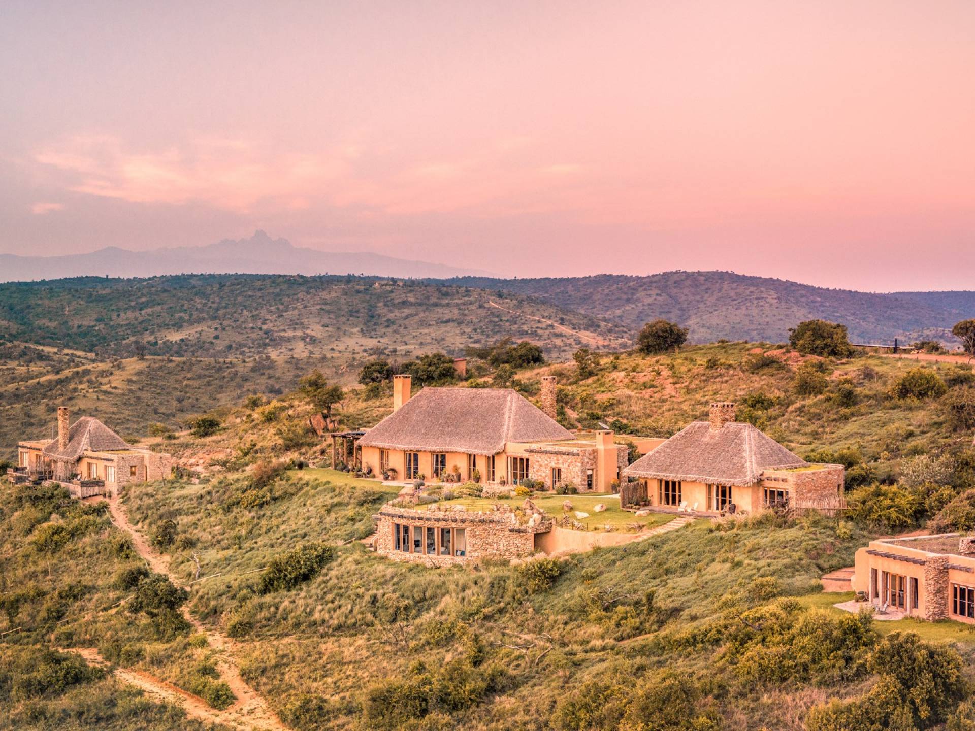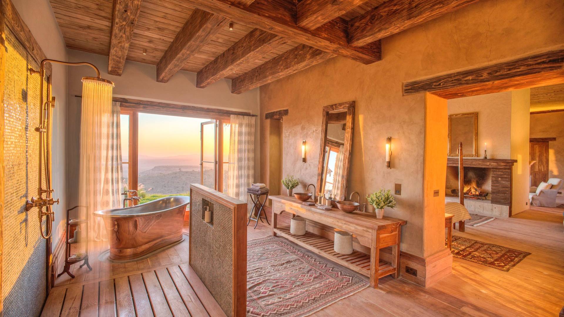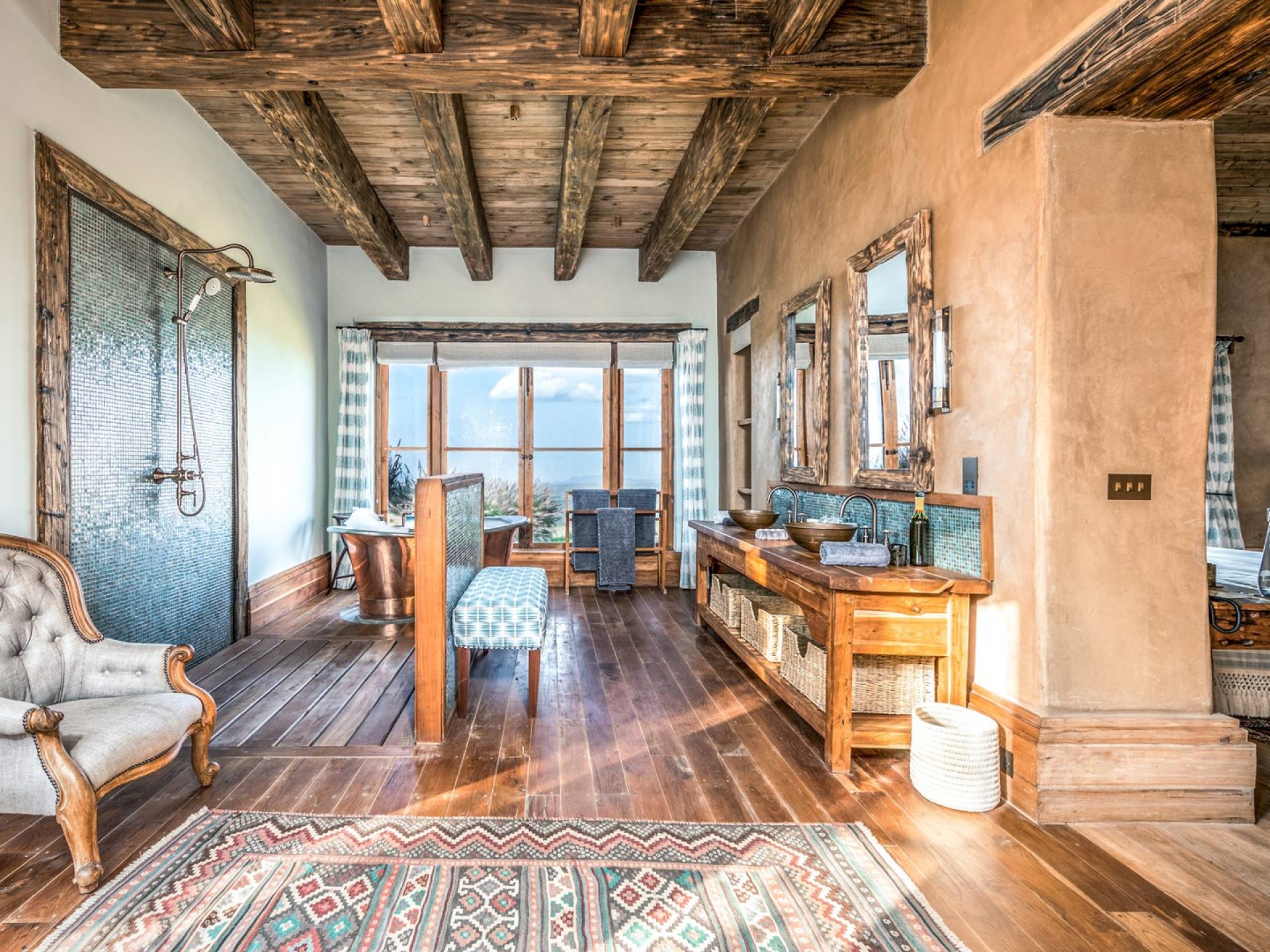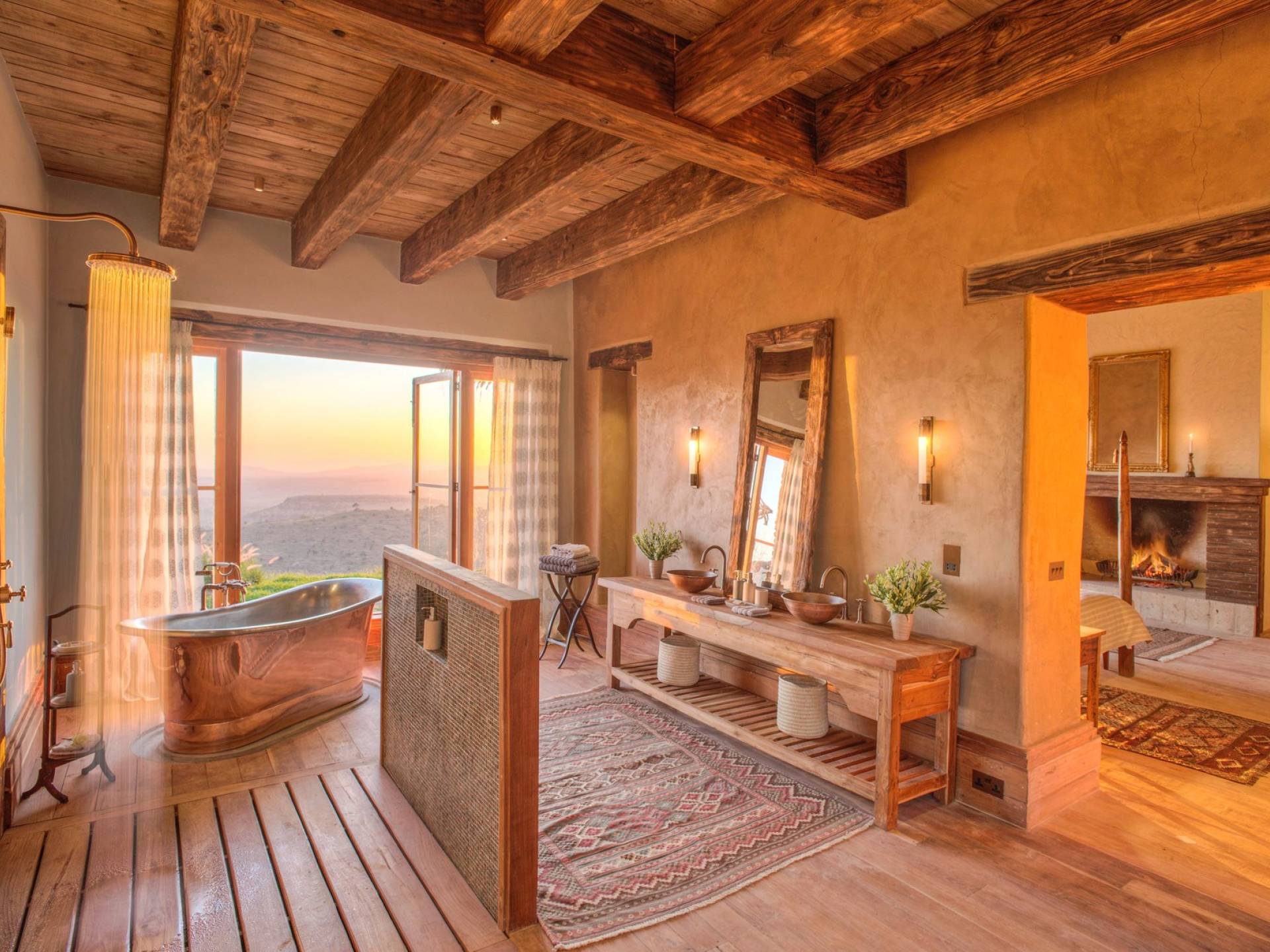 Nestled into a ridge with stunning views across the Laikipia plains and deep into the Northern Frontier, Lengishu is a luxury home for up to 12 guests, offering sustainable tourism and safari adventures in one of Kenya’s leading wildlife destinations. Villa Lengishu Kenya features six beautifully appointed bedrooms within four cottages, which are situated apart from the main house. All rooms face East over the valley below, offering spectacular sunrise views. All bedrooms are spacious with fireplaces or wood-burning stoves for the cooler evenings and have en-suite bathrooms with rain showers and freestanding copper bathtubs. Floor to ceiling windows provide majestic views of the undulating plains beyond, perfect for bathtub game viewing