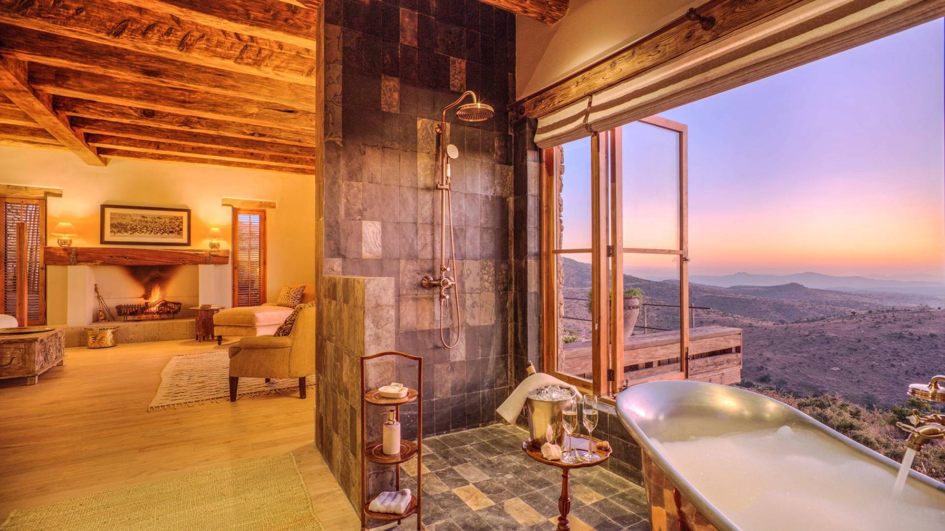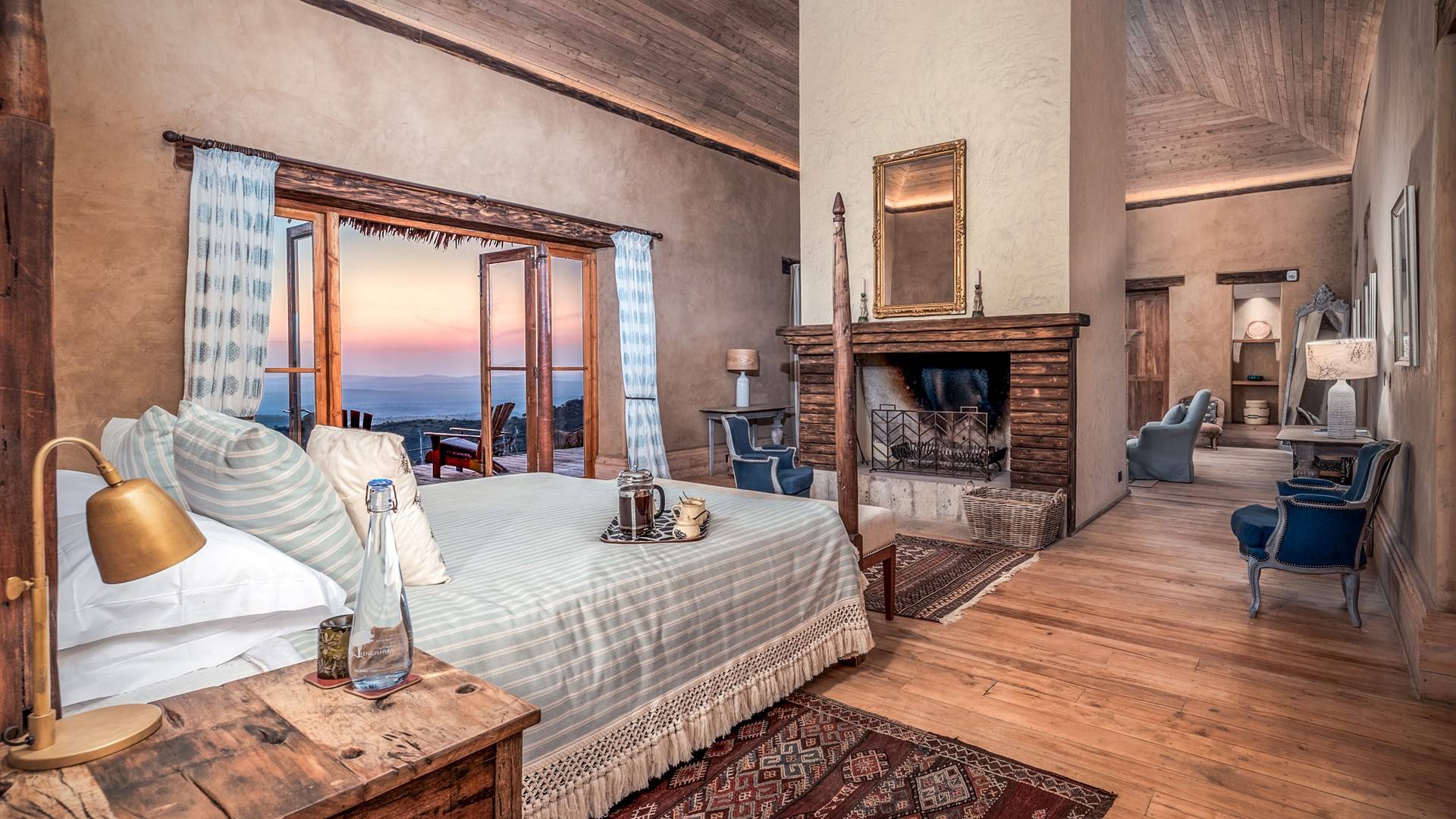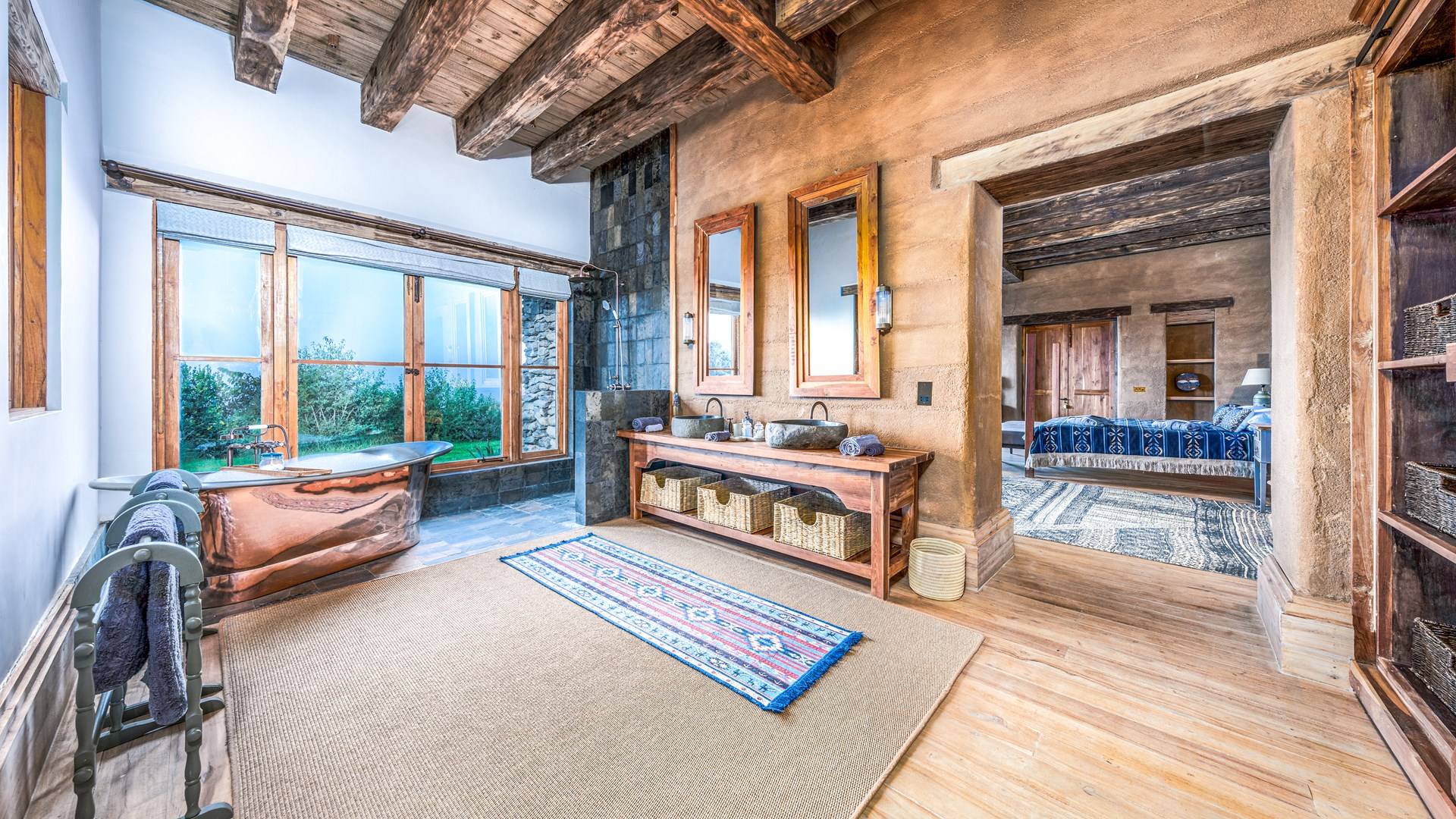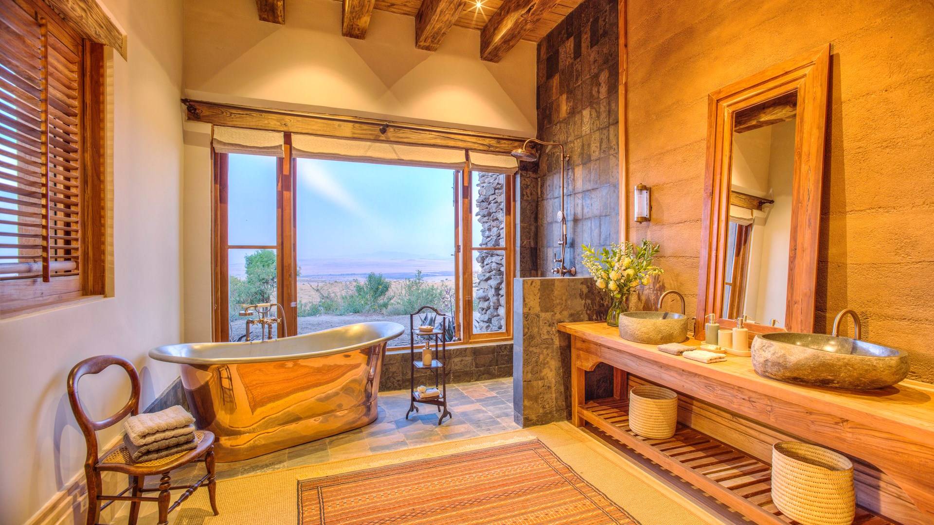 Nestled into a ridge with stunning views across the Laikipia plains and deep into the Northern Frontier, Lengishu is a luxury home for up to 12 guests, offering sustainable tourism and safari adventures in one of Kenya’s leading wildlife destinations. Villa Lengishu Kenya features six beautifully appointed bedrooms within four cottages, which are situated apart from the main house. All rooms face East over the valley below, offering spectacular sunrise views. All bedrooms are spacious with fireplaces or wood-burning stoves for the cooler evenings and have en-suite bathrooms with rain showers and freestanding copper bathtubs. Floor to ceiling windows provide majestic views of the undulating plains beyond, perfect for bathtub game viewing