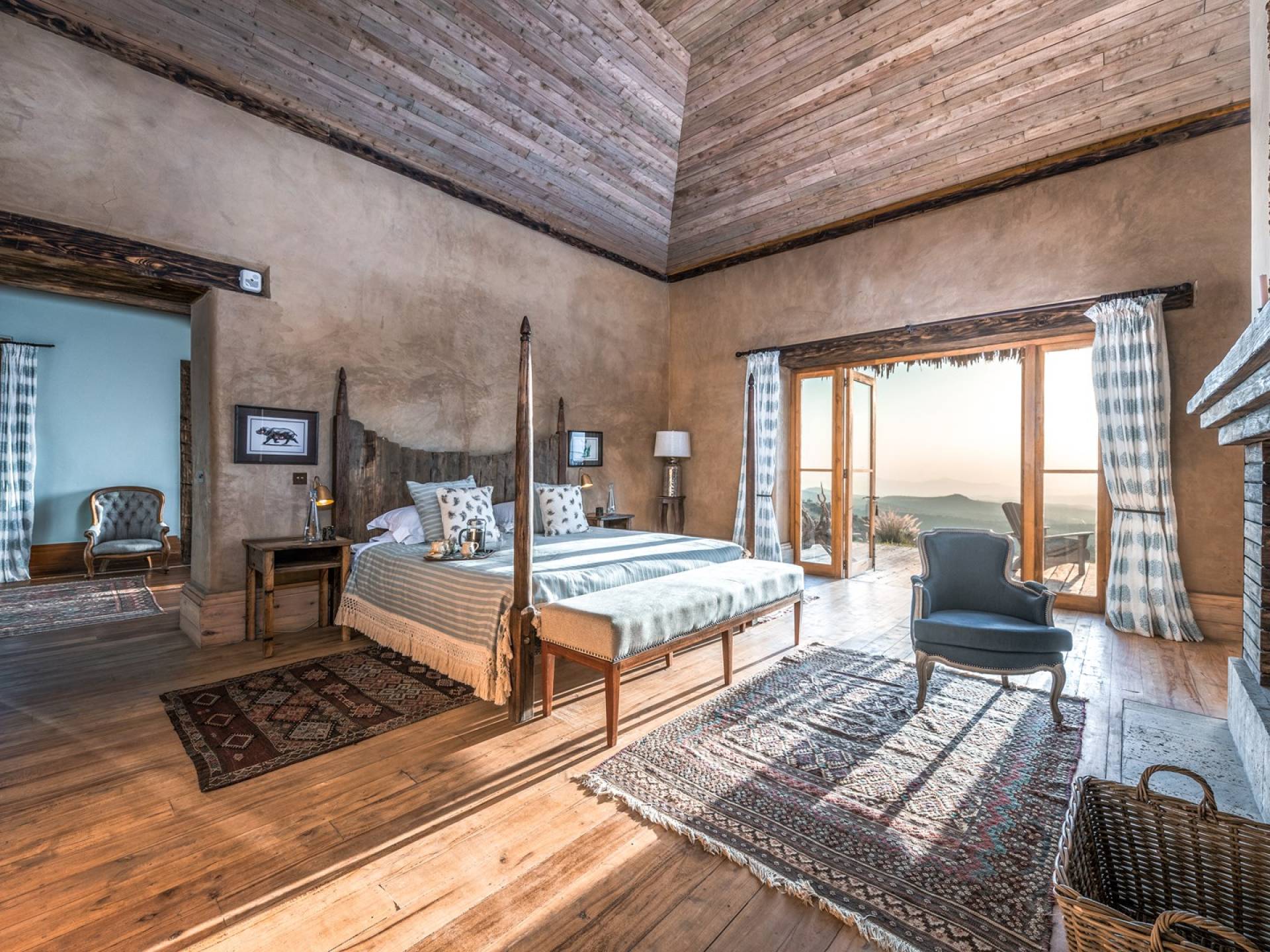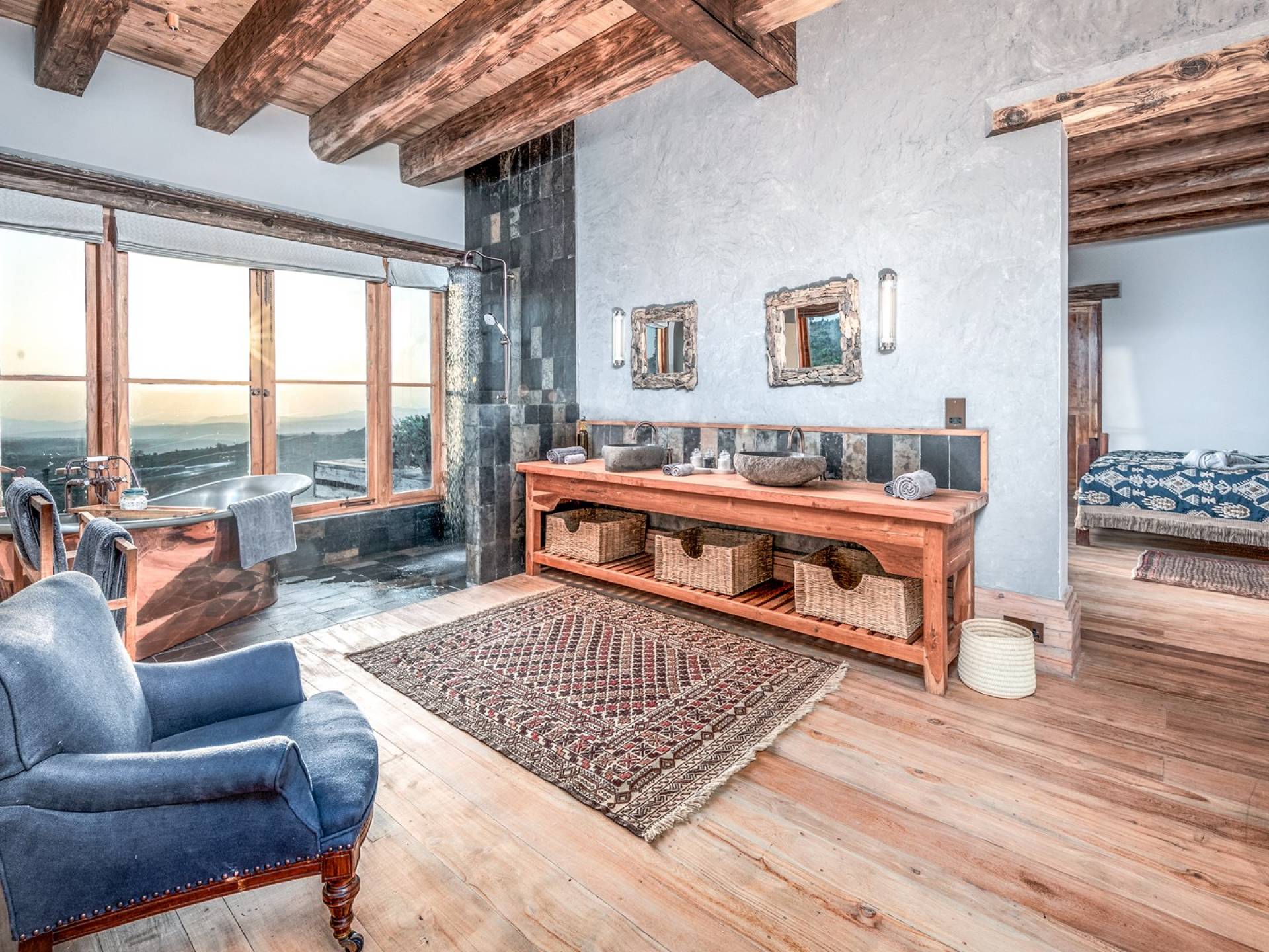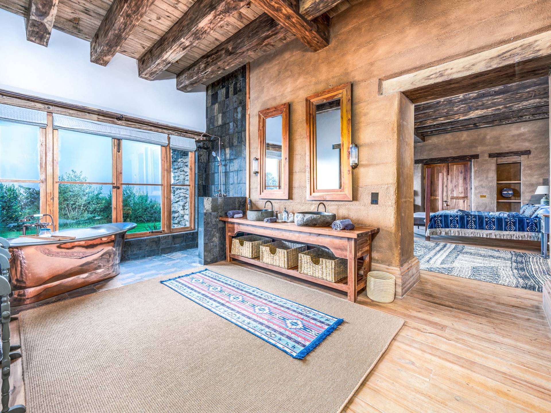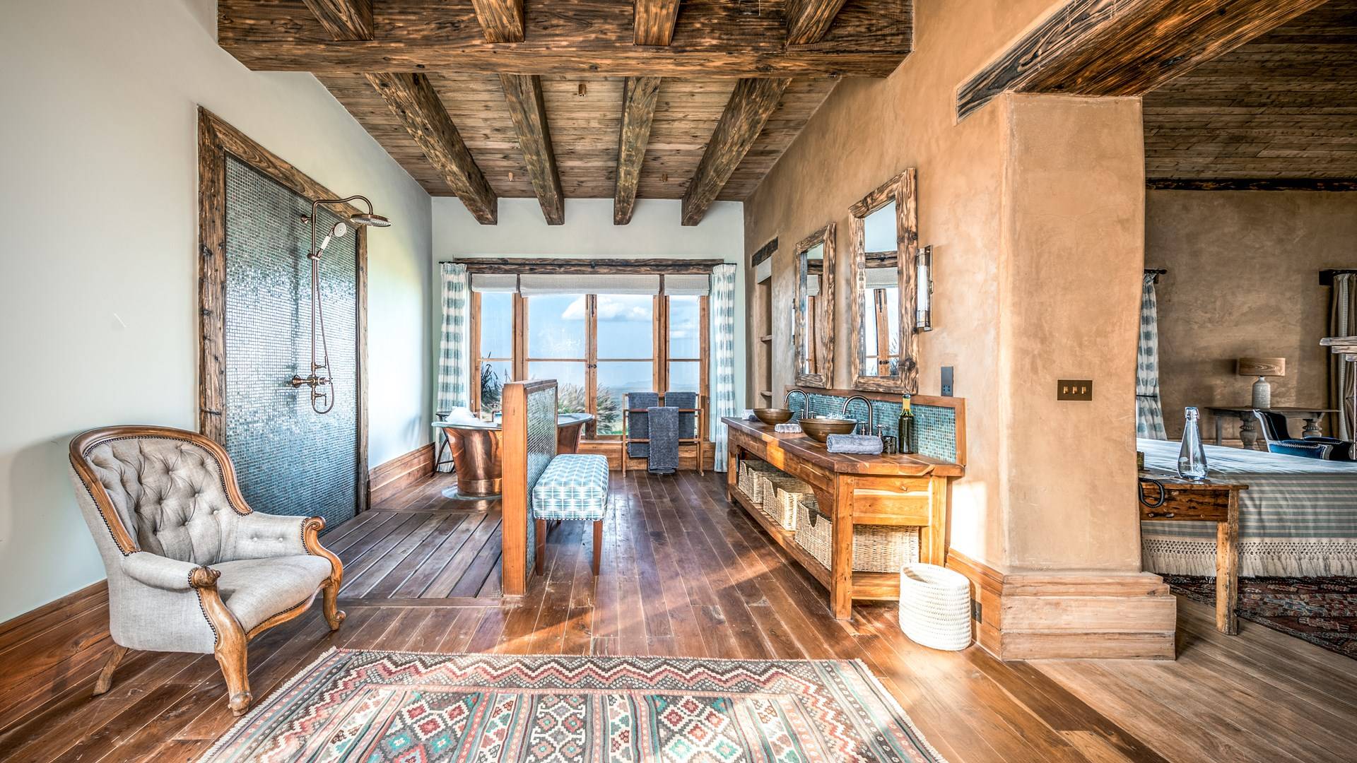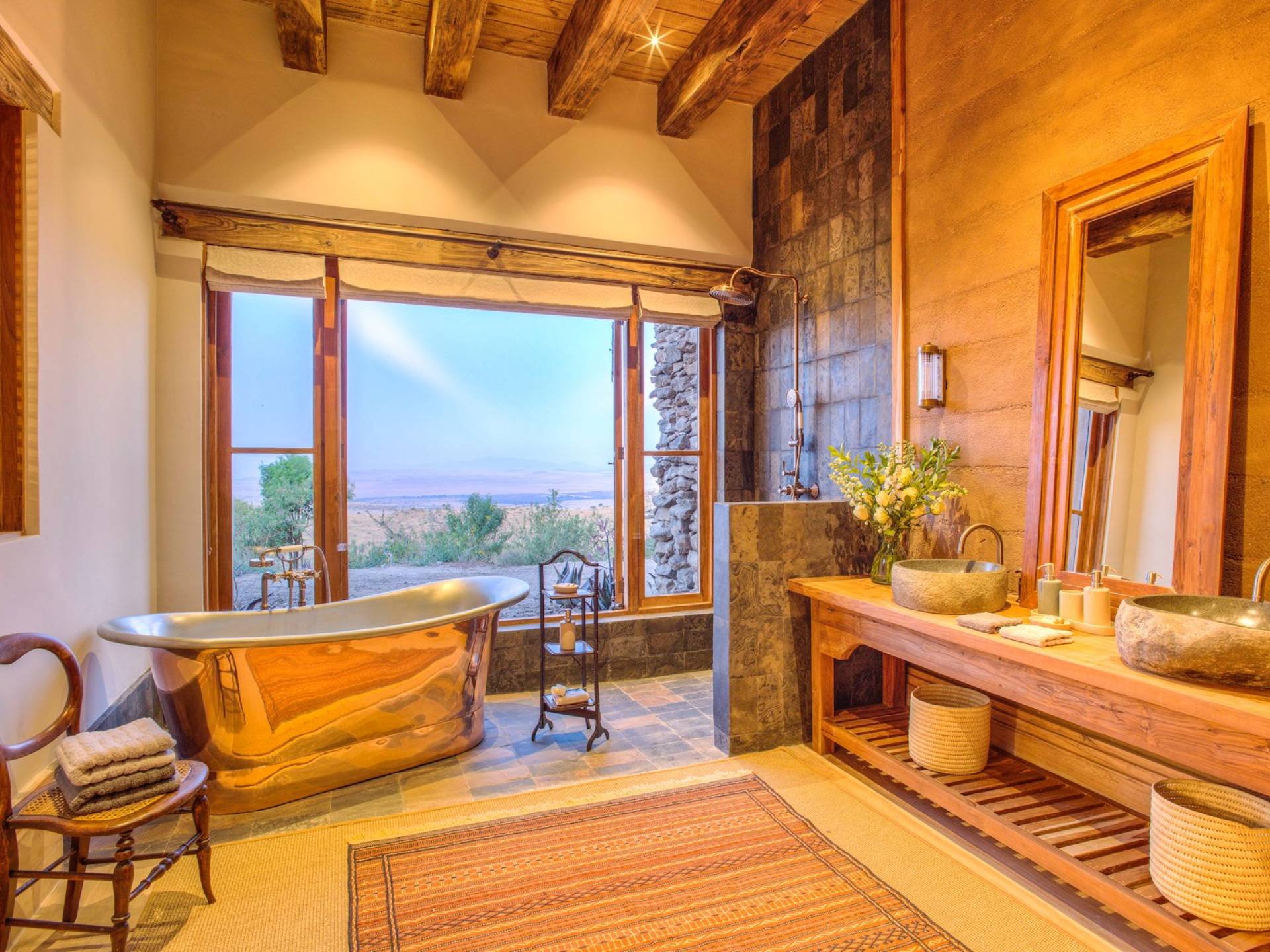 Nestled into a ridge with stunning views across the Laikipia plains and deep into the Northern Frontier, Lengishu is a luxury home for up to 12 guests, offering sustainable tourism and safari adventures in one of Kenya’s leading wildlife destinations. Villa Lengishu Kenya features six beautifully appointed bedrooms within four cottages, which are situated apart from the main house. All rooms face East over the valley below, offering spectacular sunrise views. All bedrooms are spacious with fireplaces or wood-burning stoves for the cooler evenings and have en-suite bathrooms with rain showers and freestanding copper bathtubs. Floor to ceiling windows provide majestic views of the undulating plains beyond, perfect for bathtub game viewing