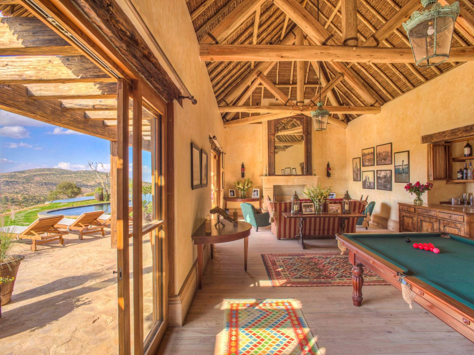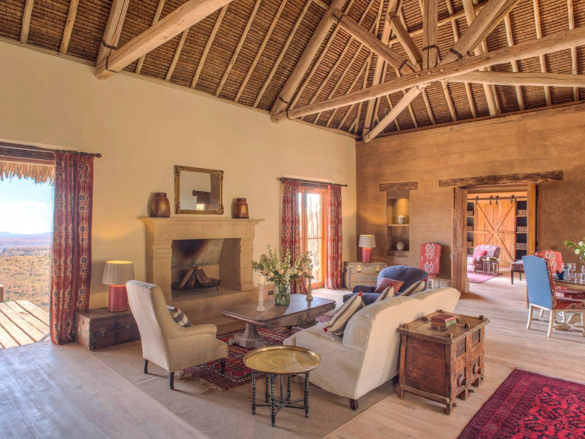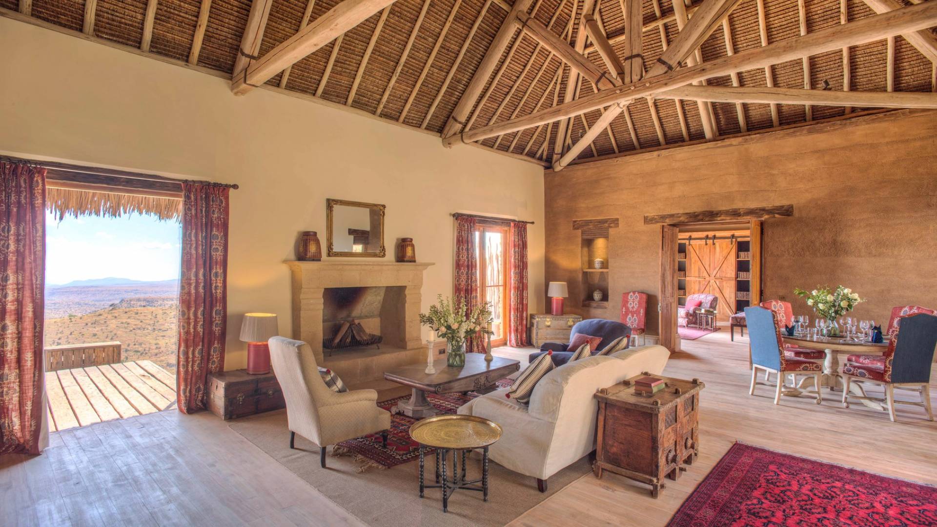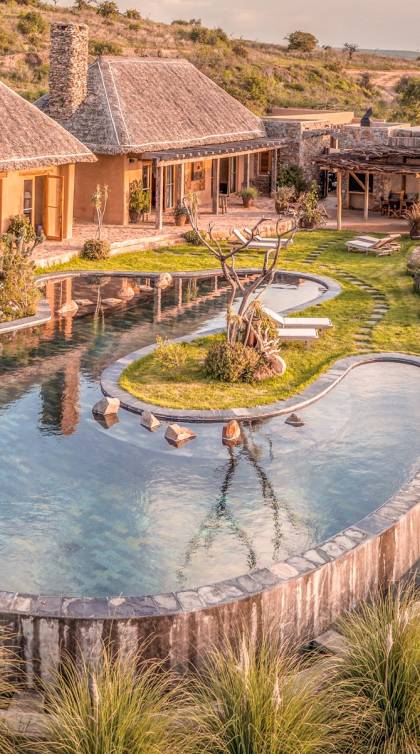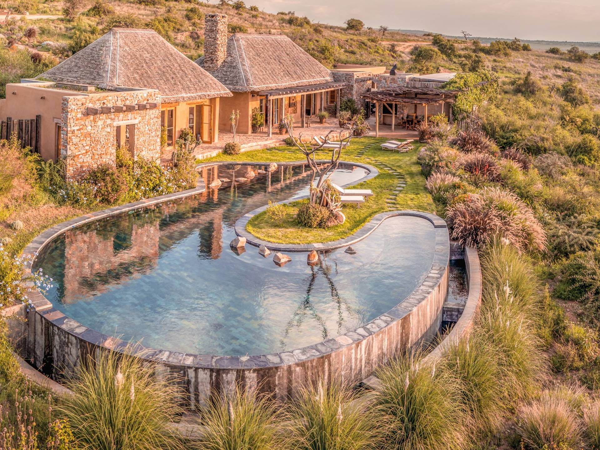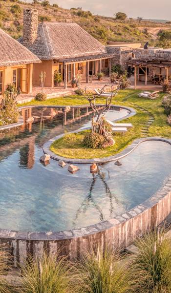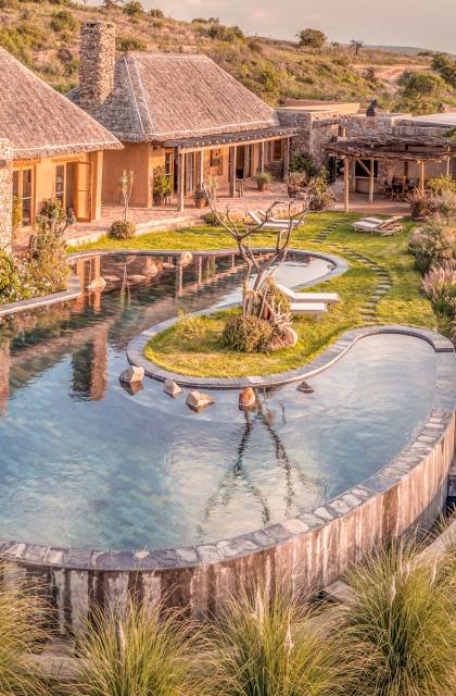 Lengishu is built with locally sourced materials and designed to blend in with the surrounding environment. Expertly crafted by local artisans, the house features beautiful exposed Kenyan timber work while stone for the floors and intricate design features were excavated from the site itself. The interiors are tastefully decorated in neutral tones with splashes of red in a nod to the owner’s Scottish heritage and that of their neighbors; the Maasai community. The main house is central to the design with a large entrance hall leading to a study and dining room with two inviting fireplaces and an impressive vaulted ceiling. A covered veranda with a pizza oven is a delightful hub for al fresco breakfasts or sundowners under an African sky.
