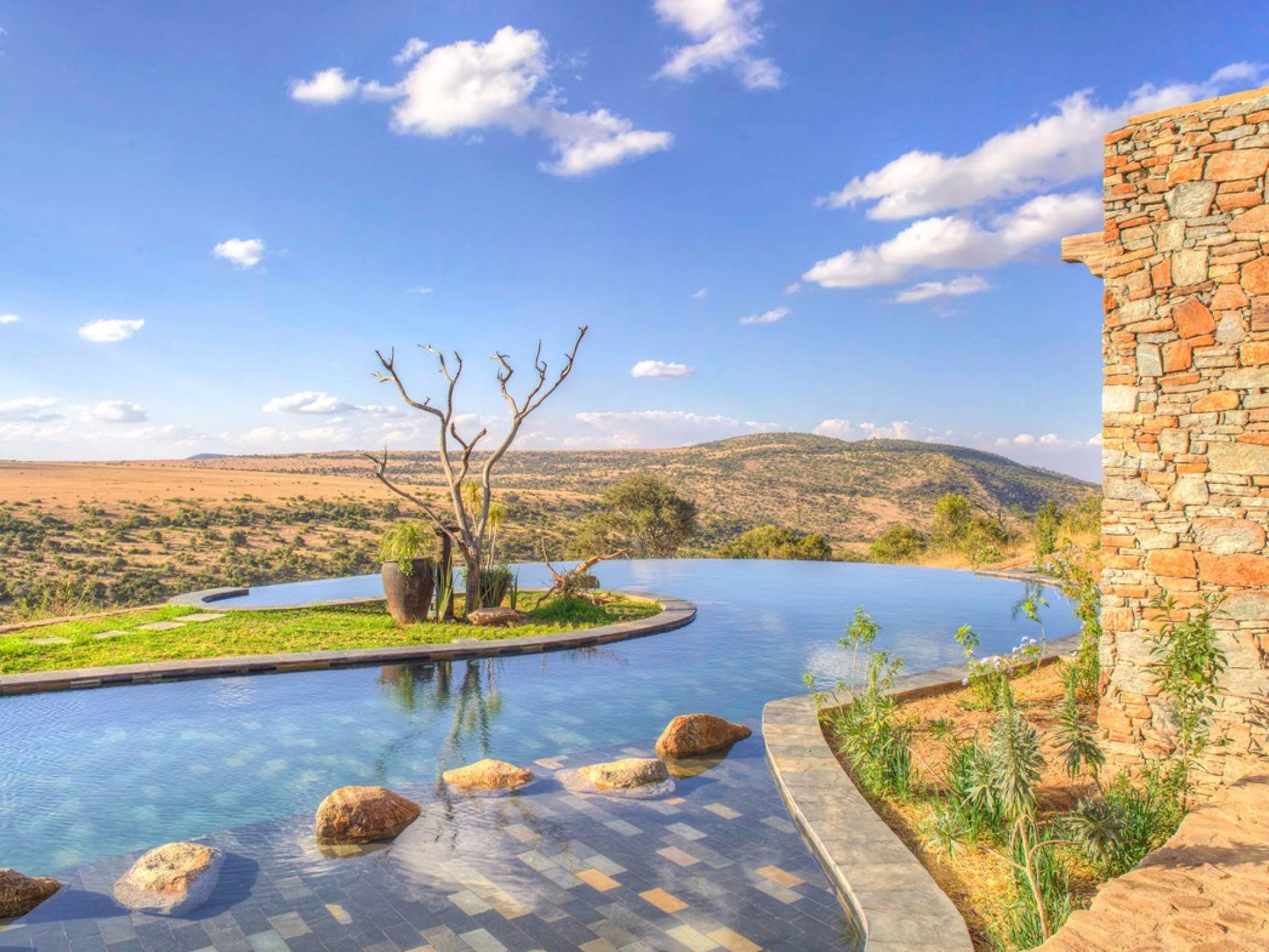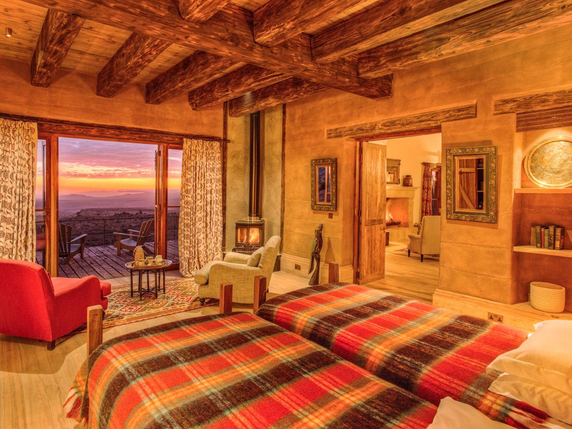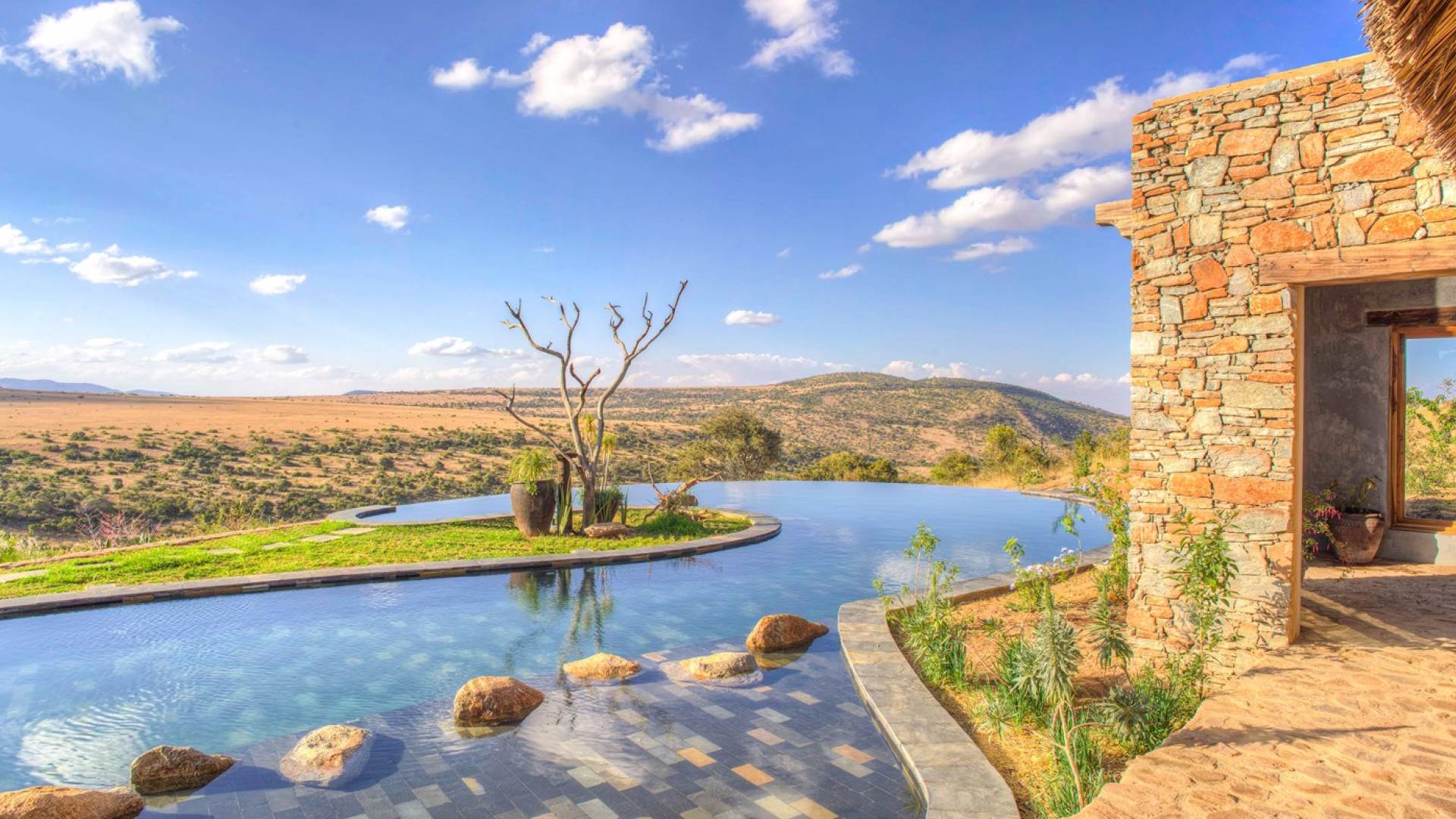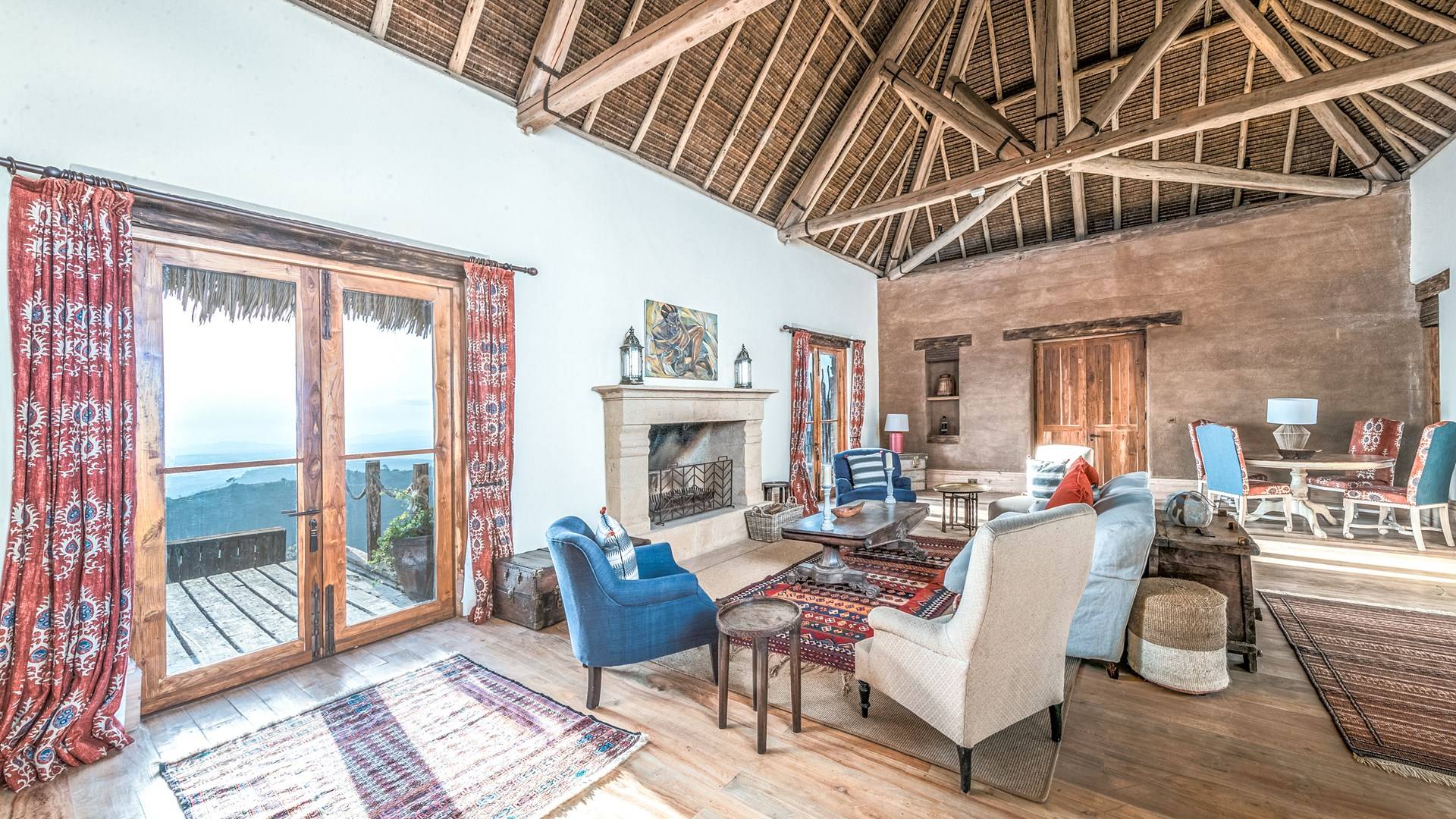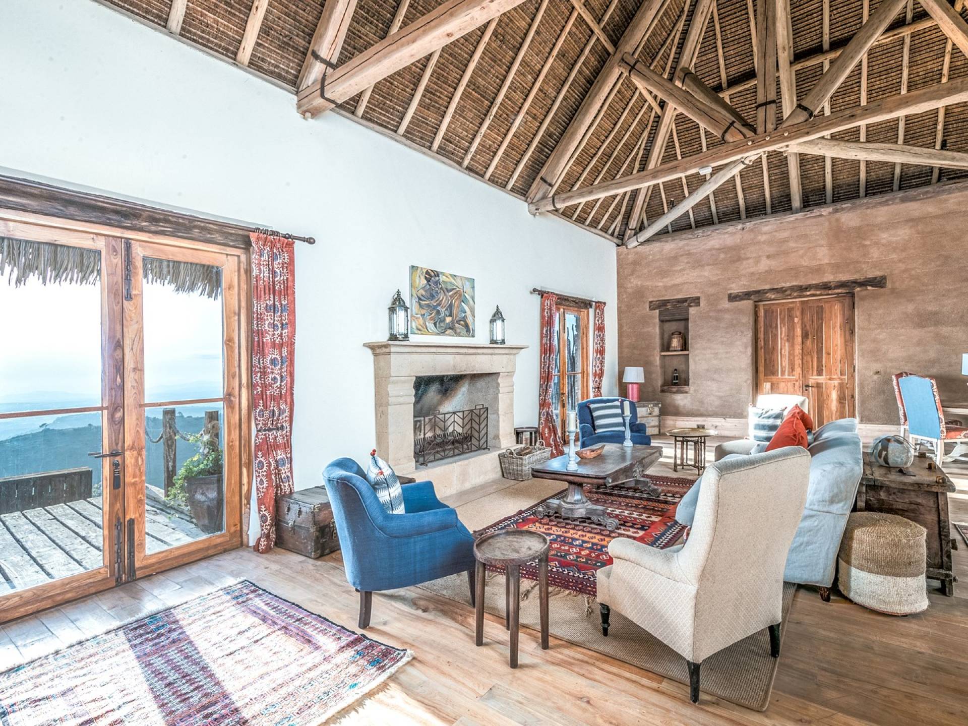 Lengishu is built with locally sourced materials and designed to blend in with the surrounding environment. Expertly crafted by local artisans, the house features beautiful exposed Kenyan timber work while stone for the floors and intricate design features were excavated from the site itself. The interiors are tastefully decorated in neutral tones with splashes of red in a nod to the owner’s Scottish heritage and that of their neighbors; the Maasai community. The main house is central to the design with a large entrance hall leading to a study and dining room with two inviting fireplaces and an impressive vaulted ceiling. A covered veranda with a pizza oven is a delightful hub for al fresco breakfasts or sundowners under an African sky.
