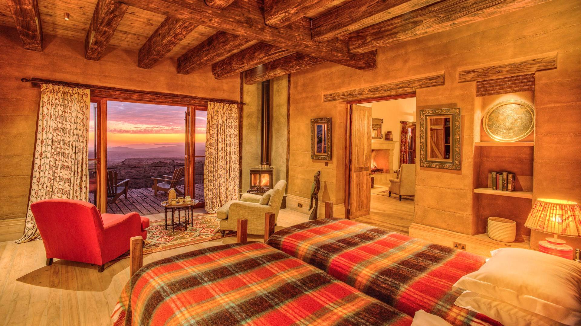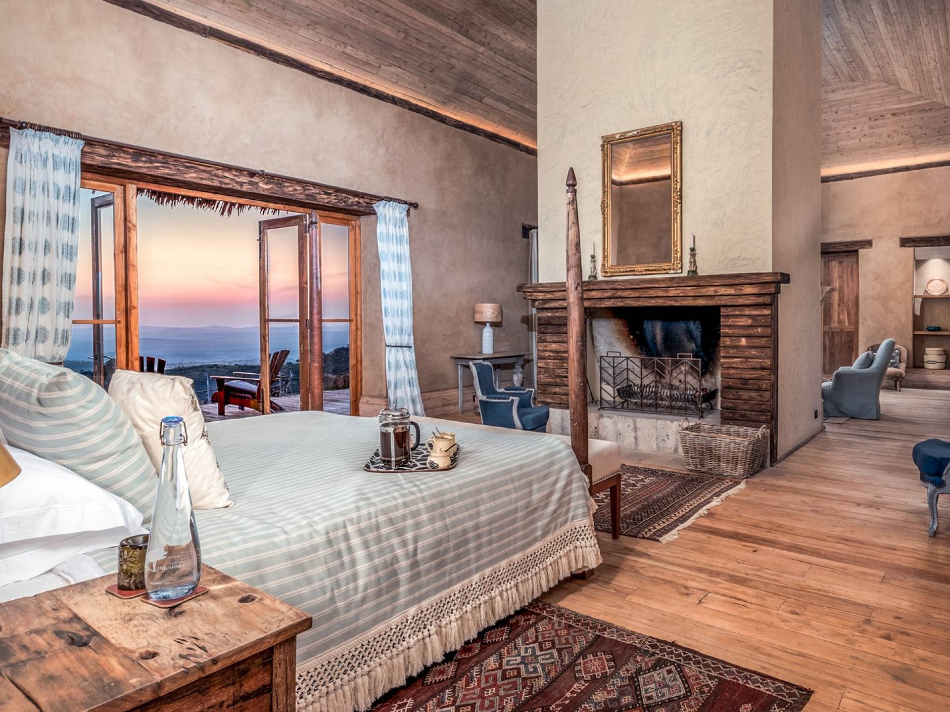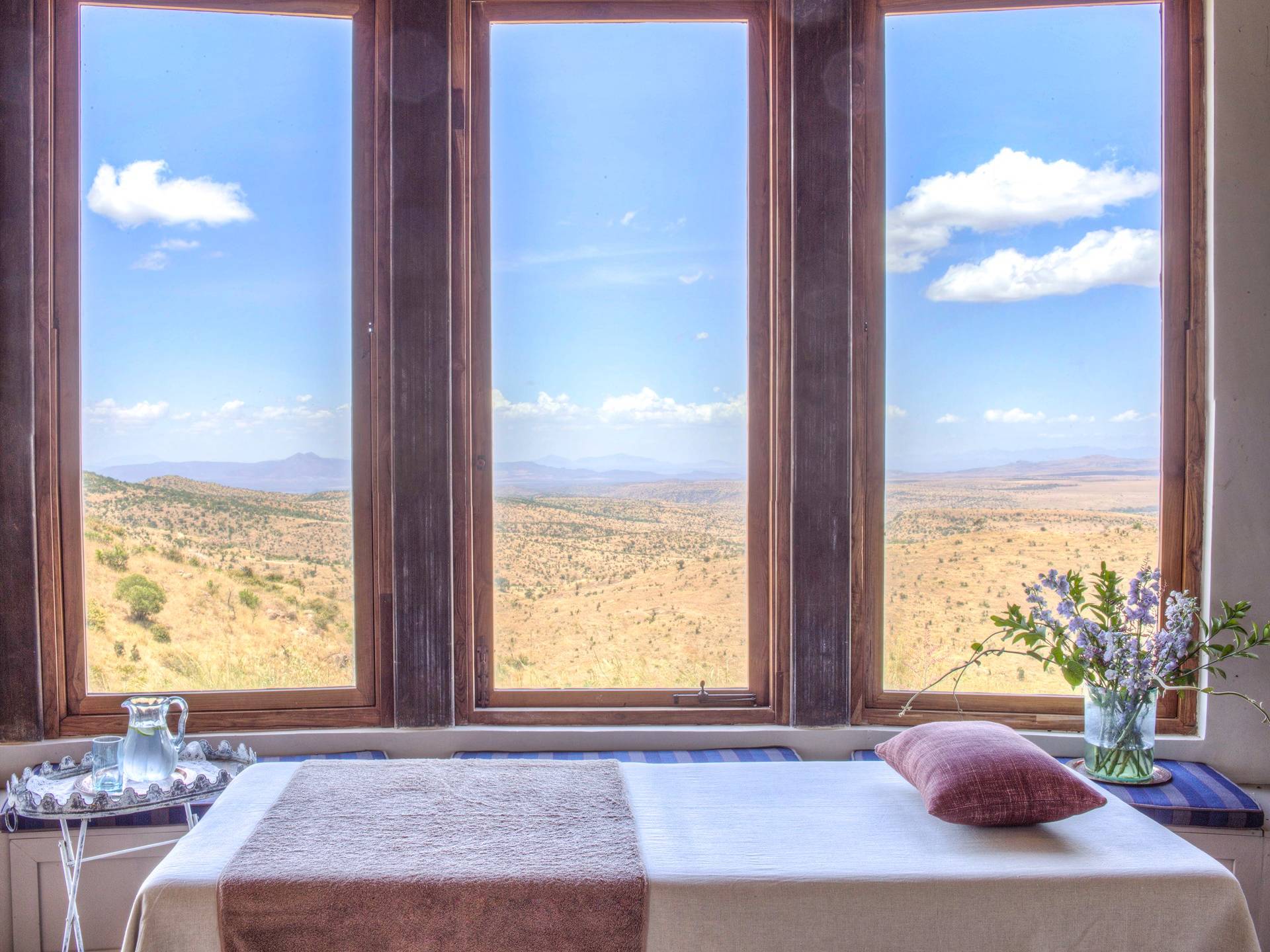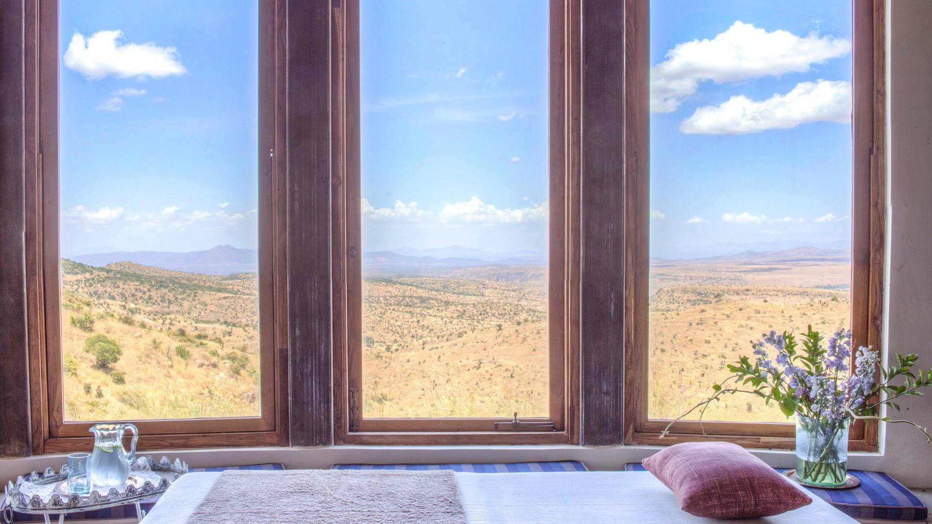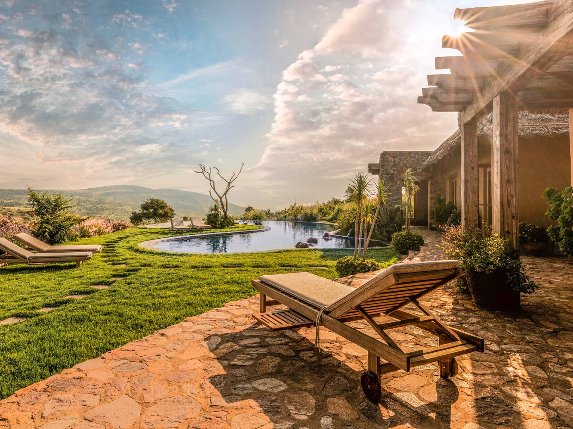 Lengishu is built with locally sourced materials and designed to blend in with the surrounding environment. Expertly crafted by local artisans, the house features beautiful exposed Kenyan timber work while stone for the floors and intricate design features were excavated from the site itself. The interiors are tastefully decorated in neutral tones with splashes of red in a nod to the owner’s Scottish heritage and that of their neighbors; the Maasai community. The main house is central to the design with a large entrance hall leading to a study and dining room with two inviting fireplaces and an impressive vaulted ceiling. A covered veranda with a pizza oven is a delightful hub for al fresco breakfasts or sundowners under an African sky.