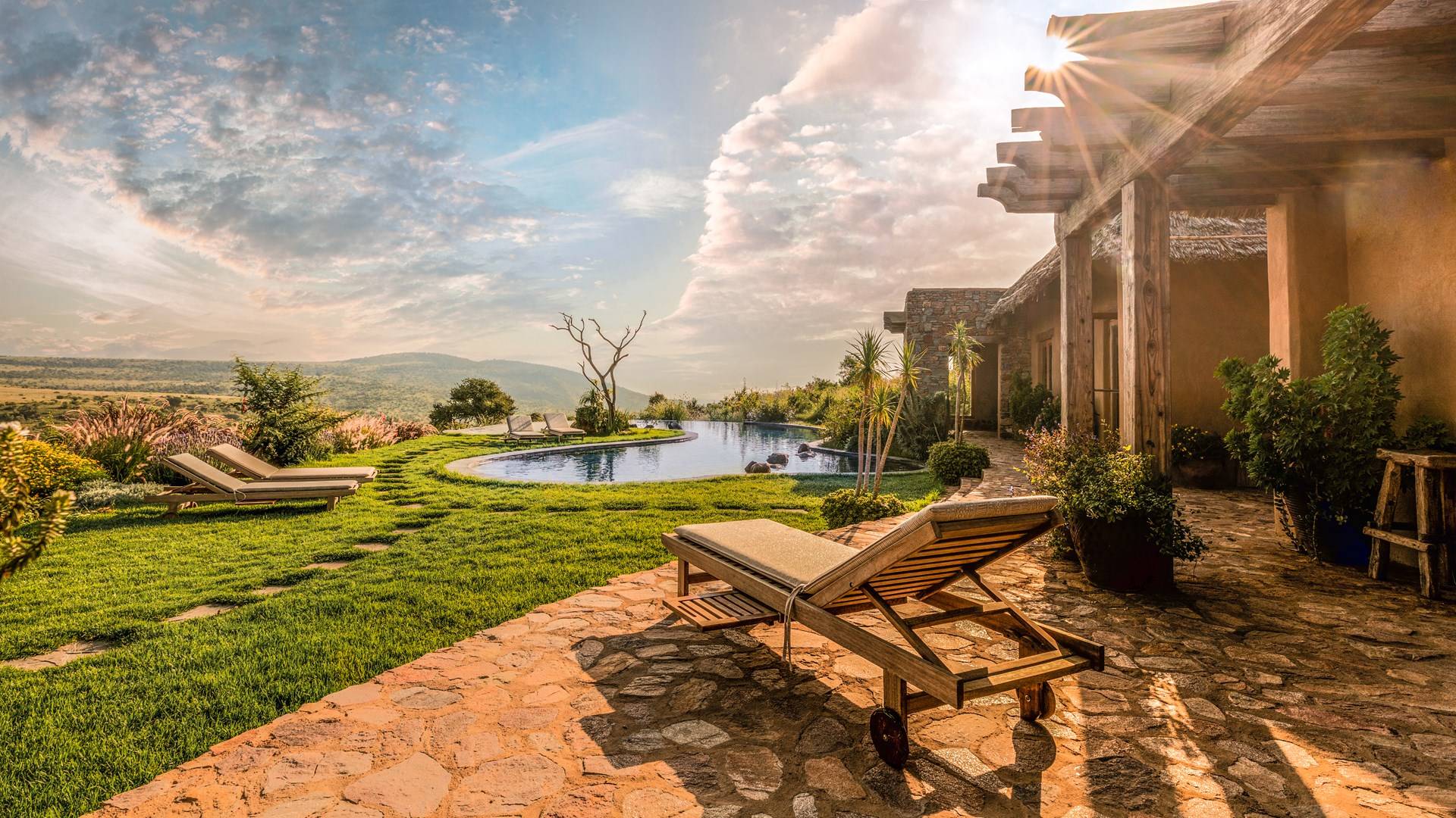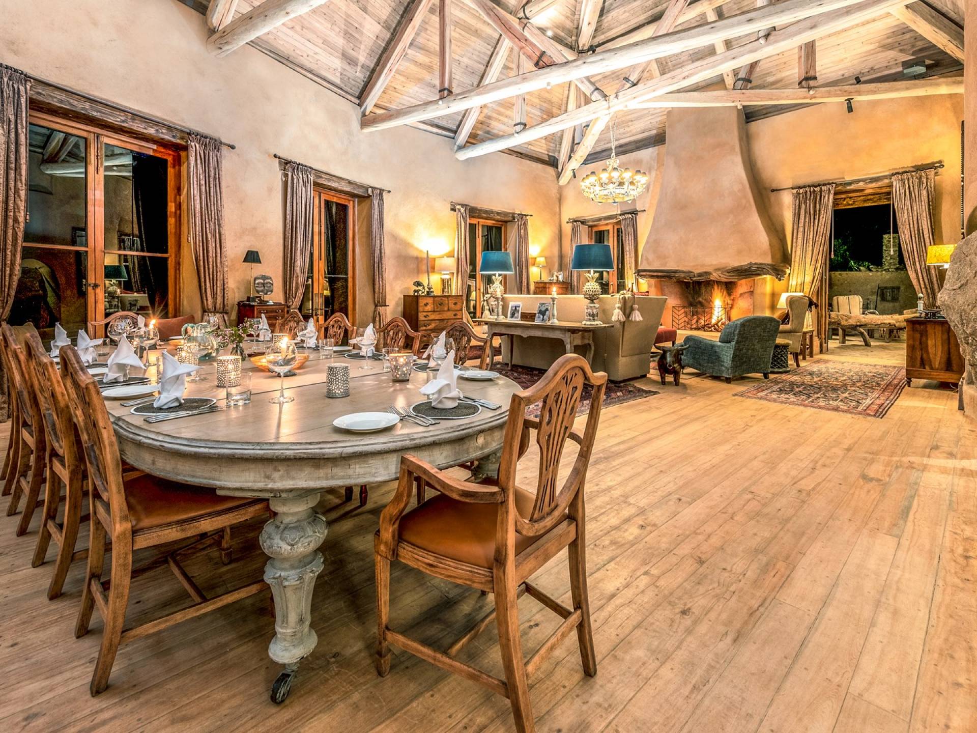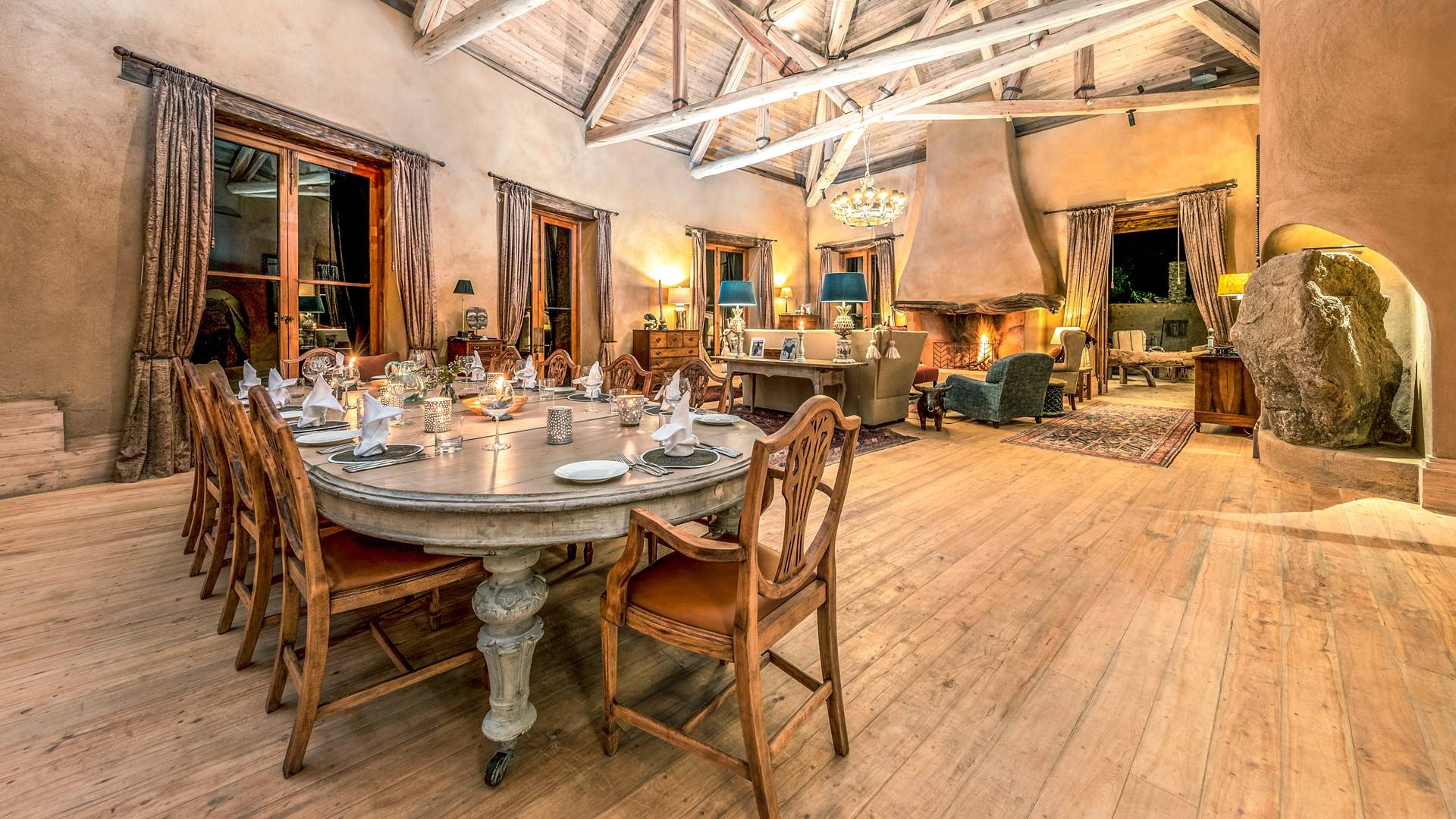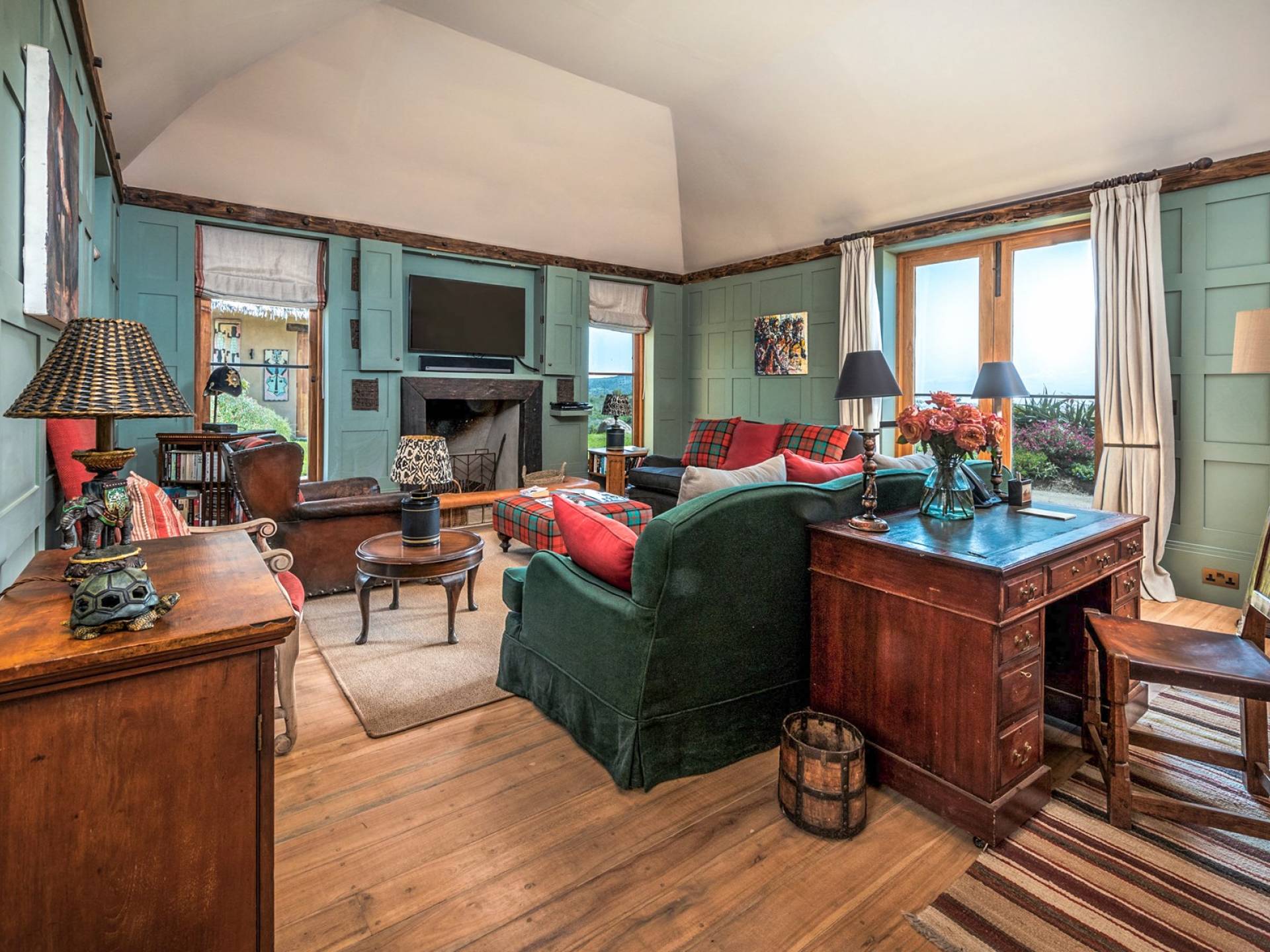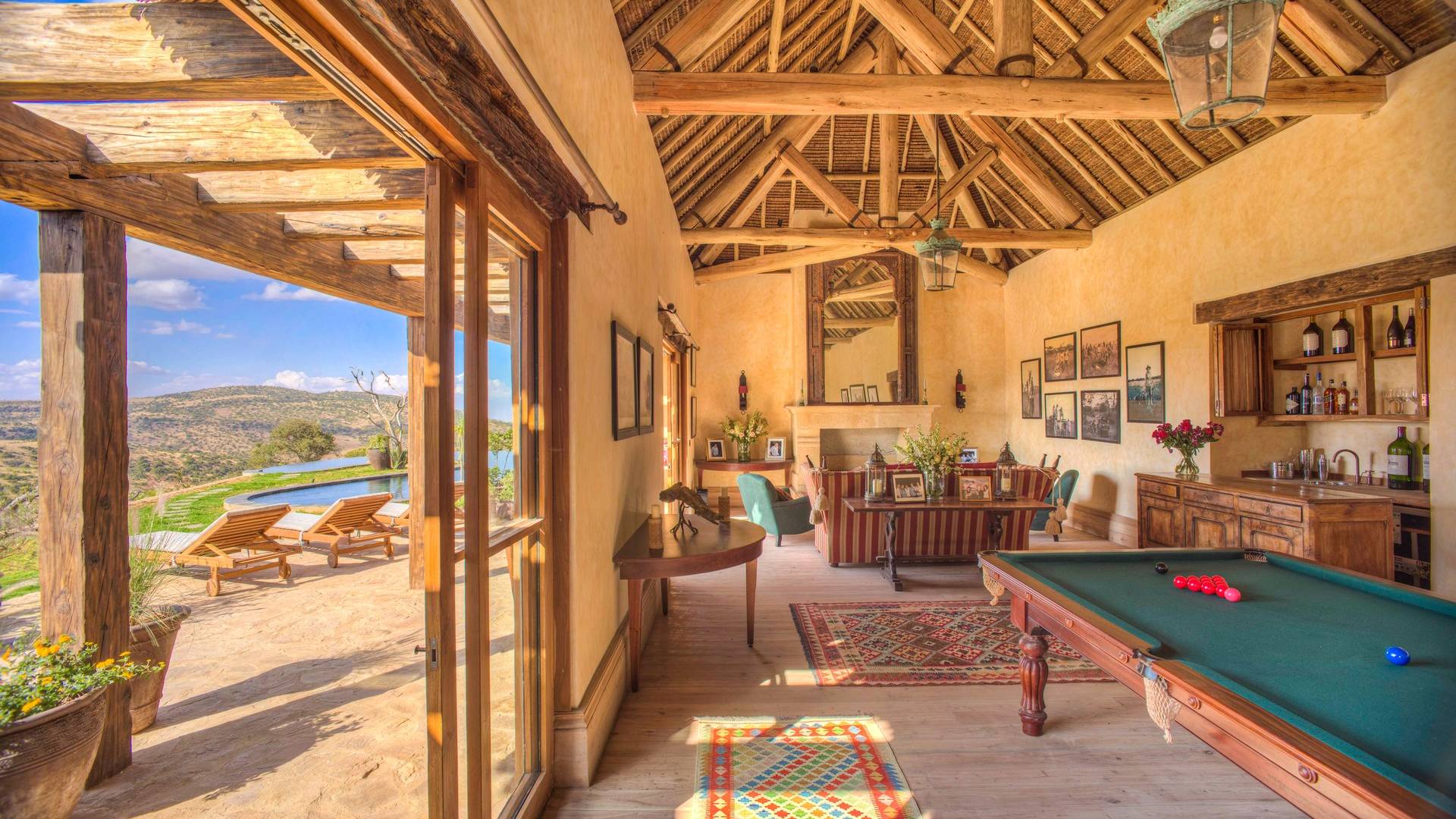 Lengishu is built with locally sourced materials and designed to blend in with the surrounding environment. Expertly crafted by local artisans, the house features beautiful exposed Kenyan timber work while stone for the floors and intricate design features were excavated from the site itself. The interiors are tastefully decorated in neutral tones with splashes of red in a nod to the owner’s Scottish heritage and that of their neighbors; the Maasai community. The main house is central to the design with a large entrance hall leading to a study and dining room with two inviting fireplaces and an impressive vaulted ceiling. A covered veranda with a pizza oven is a delightful hub for al fresco breakfasts or sundowners under an African sky.