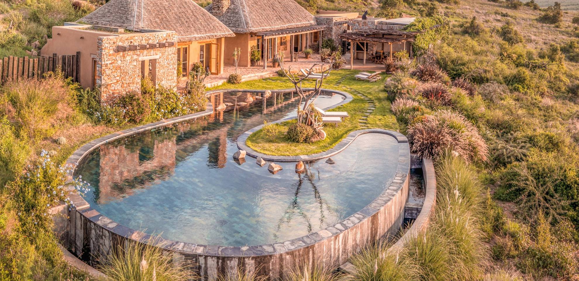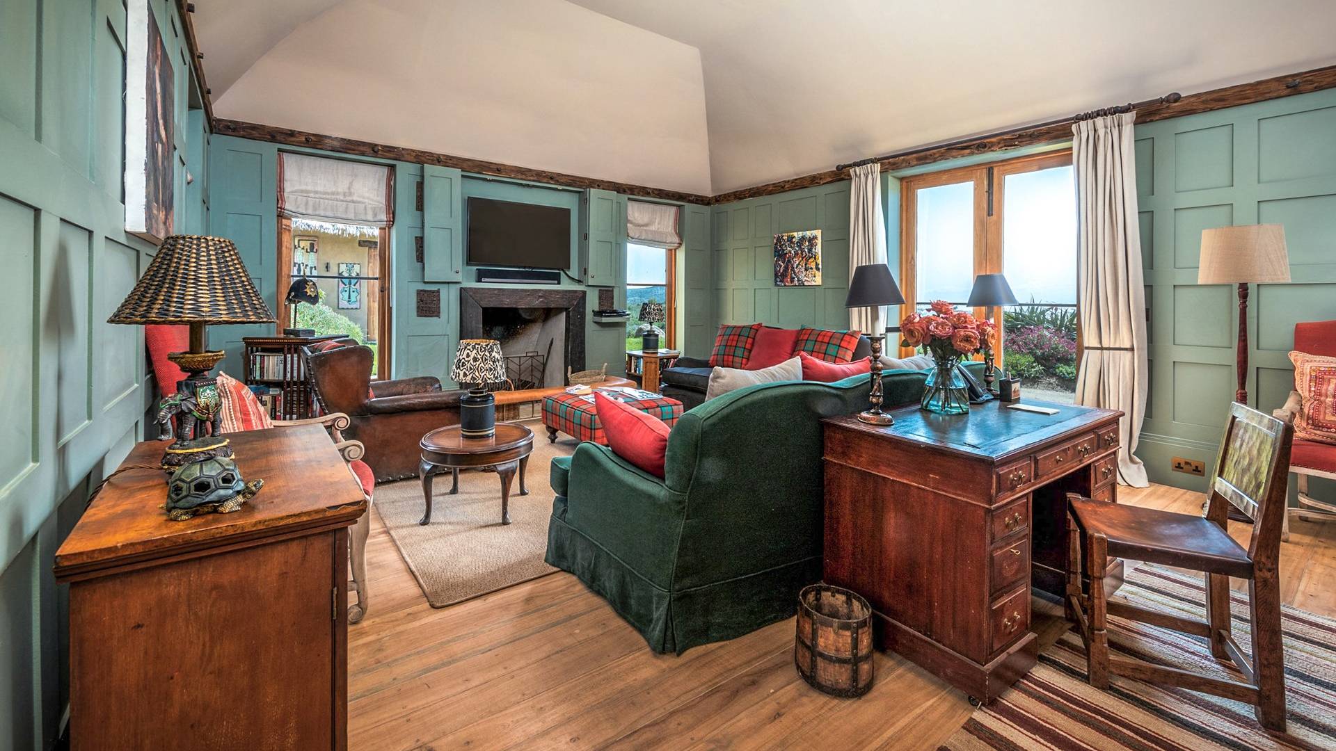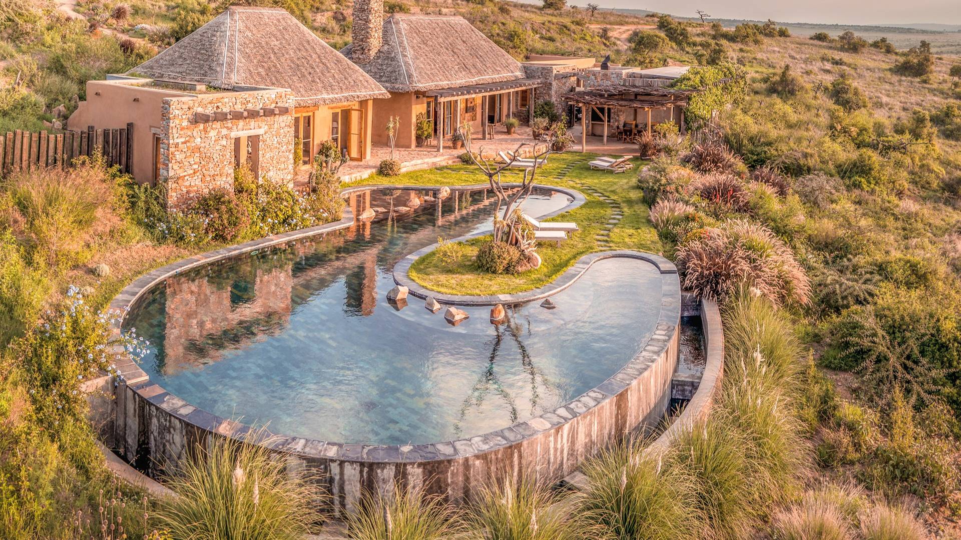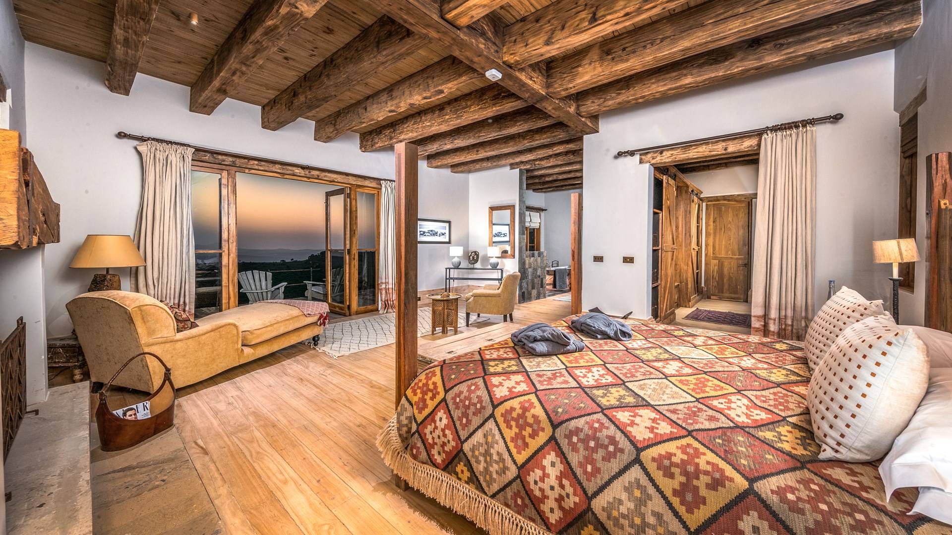 Lengishu is built with locally sourced materials and designed to blend in with the surrounding environment. Expertly crafted by local artisans, the house features beautiful exposed Kenyan timber work while stone for the floors and intricate design features were excavated from the site itself. The interiors are tastefully decorated in neutral tones with splashes of red in a nod to the owner’s Scottish heritage and that of their neighbors; the Maasai community. The main house is central to the design with a large entrance hall leading to a study and dining room with two inviting fireplaces and an impressive vaulted ceiling. A covered veranda with a pizza oven is a delightful hub for al fresco breakfasts or sundowners under an African sky.