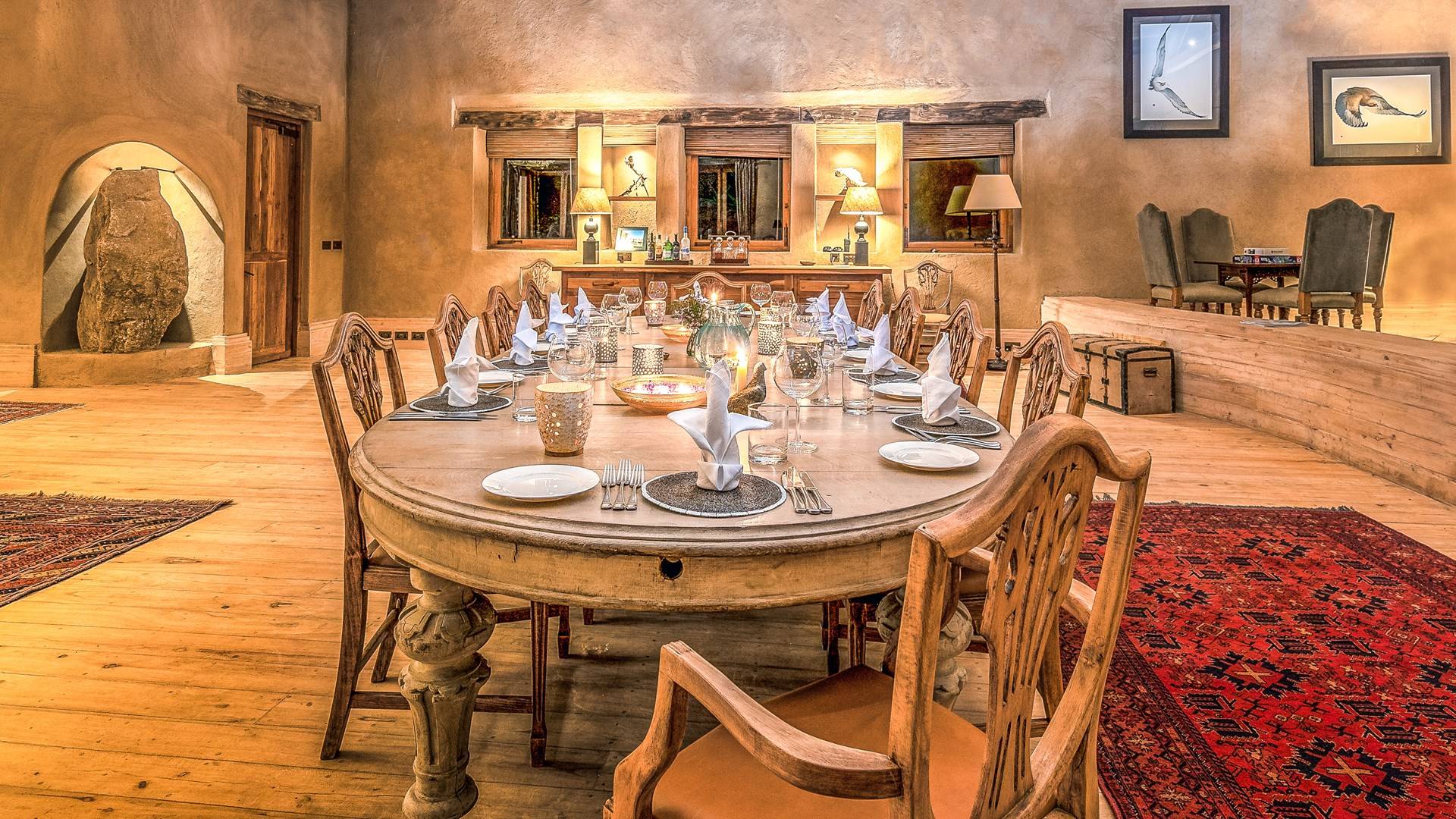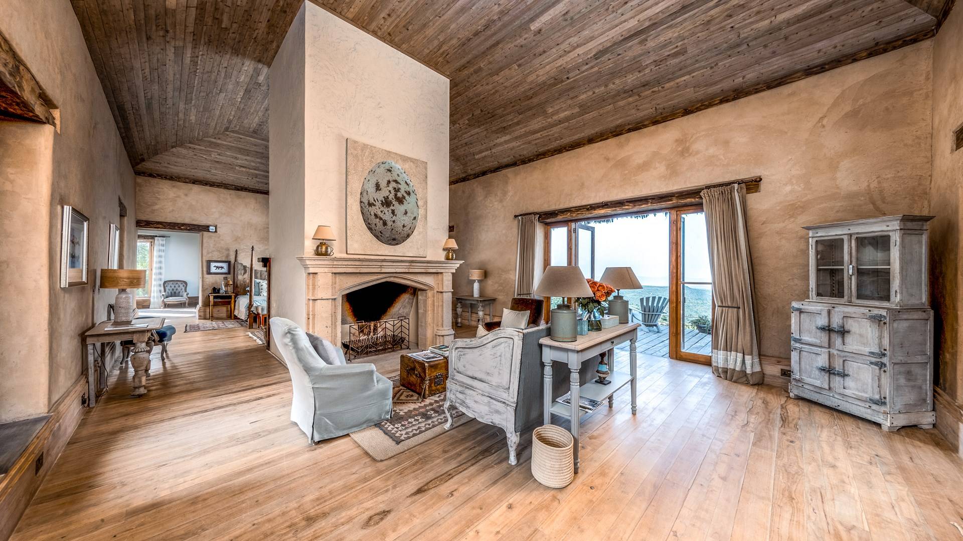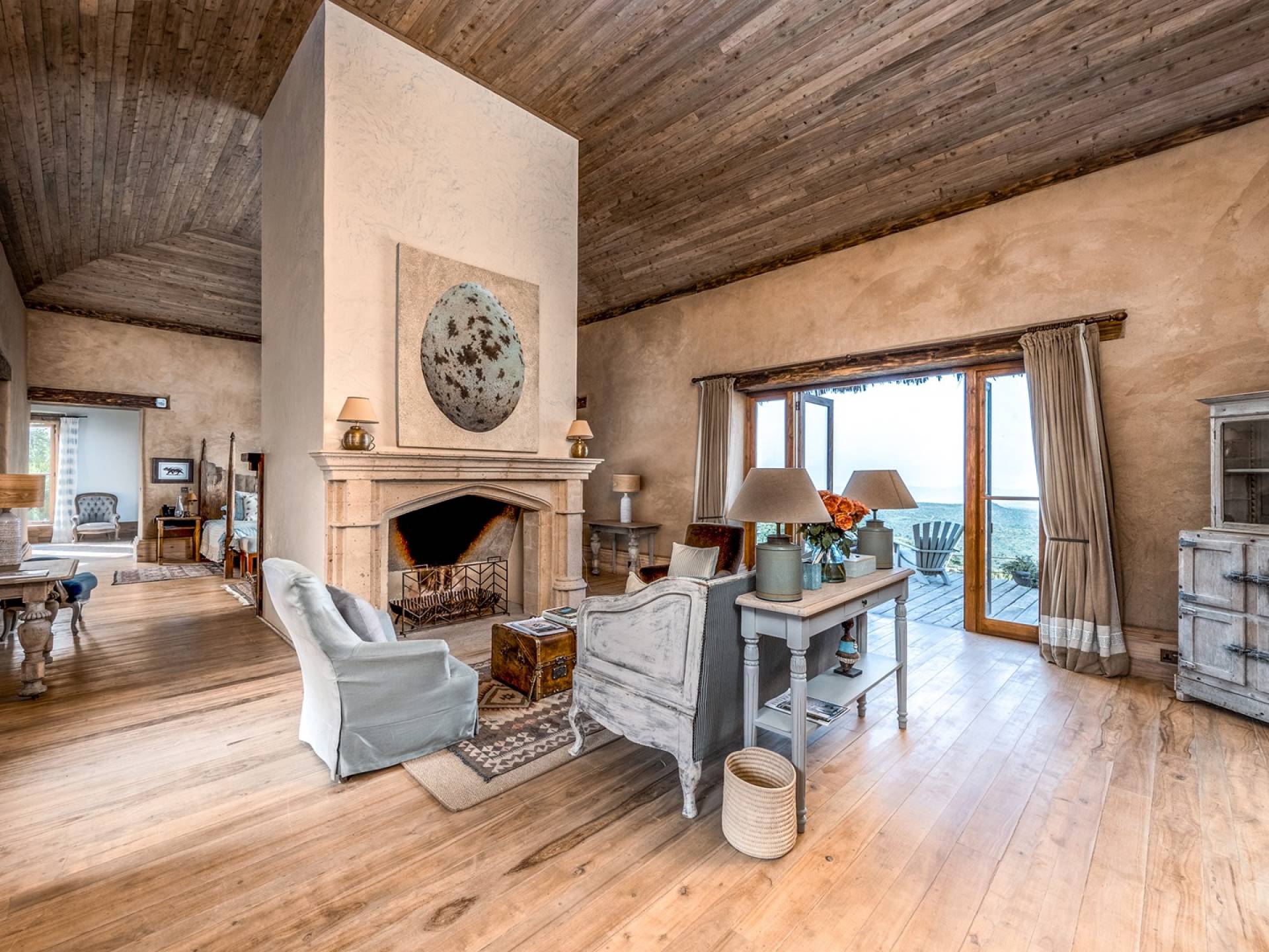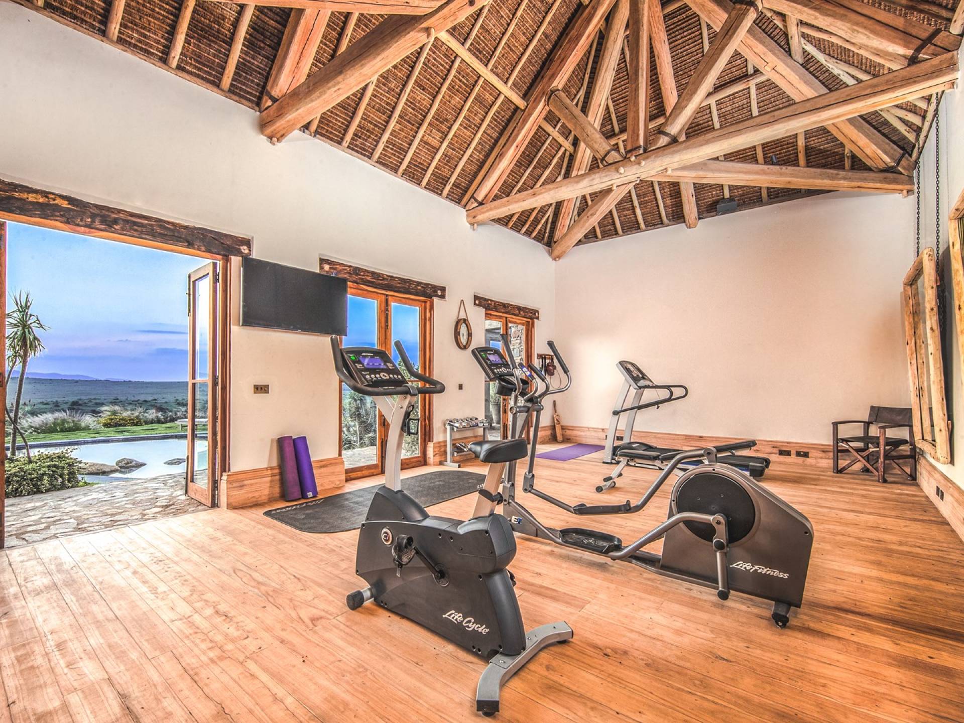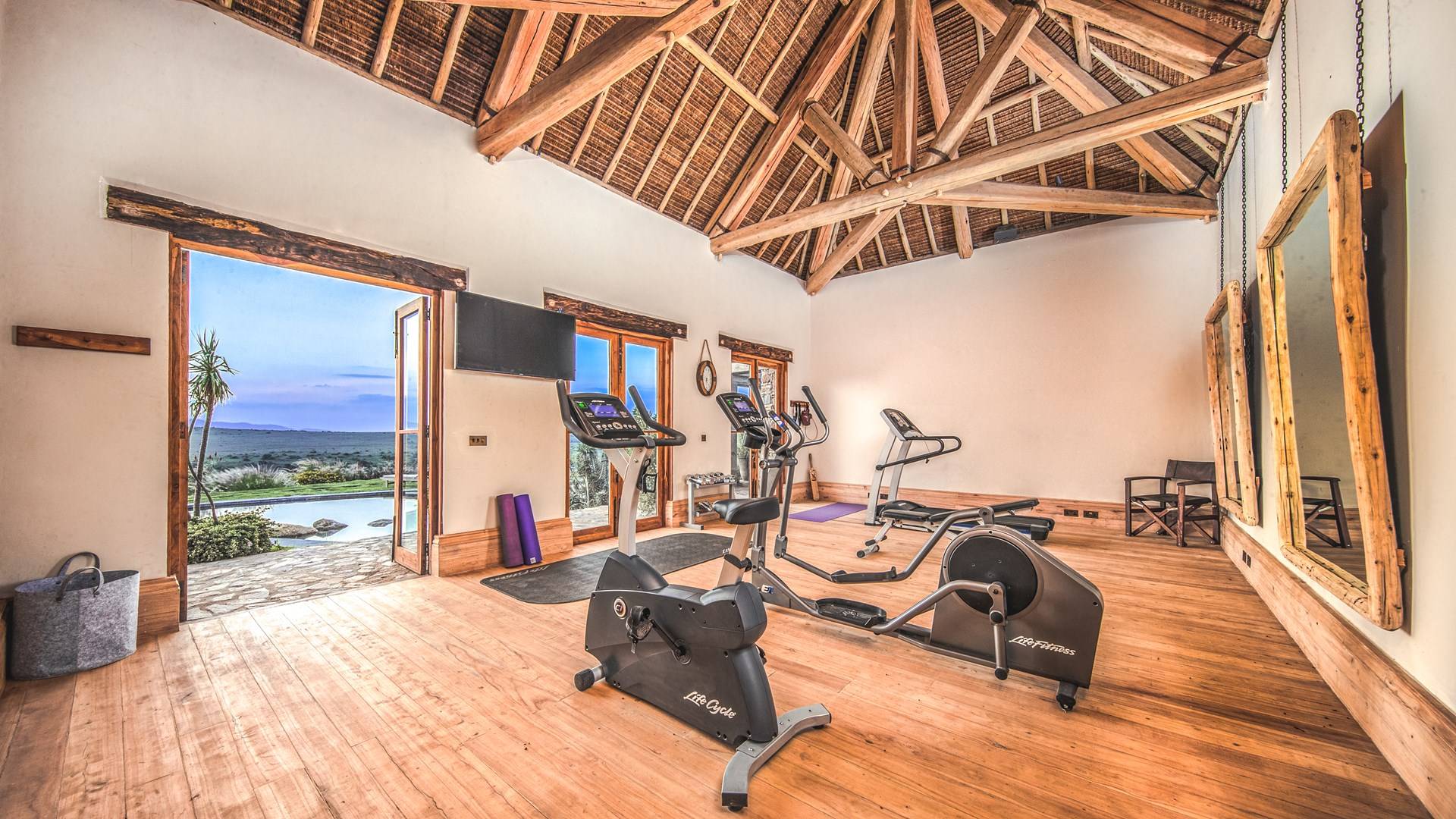 Lengishu is built with locally sourced materials and designed to blend in with the surrounding environment. Expertly crafted by local artisans, the house features beautiful exposed Kenyan timber work while stone for the floors and intricate design features were excavated from the site itself. The interiors are tastefully decorated in neutral tones with splashes of red in a nod to the owner’s Scottish heritage and that of their neighbors; the Maasai community. The main house is central to the design with a large entrance hall leading to a study and dining room with two inviting fireplaces and an impressive vaulted ceiling. A covered veranda with a pizza oven is a delightful hub for al fresco breakfasts or sundowners under an African sky.