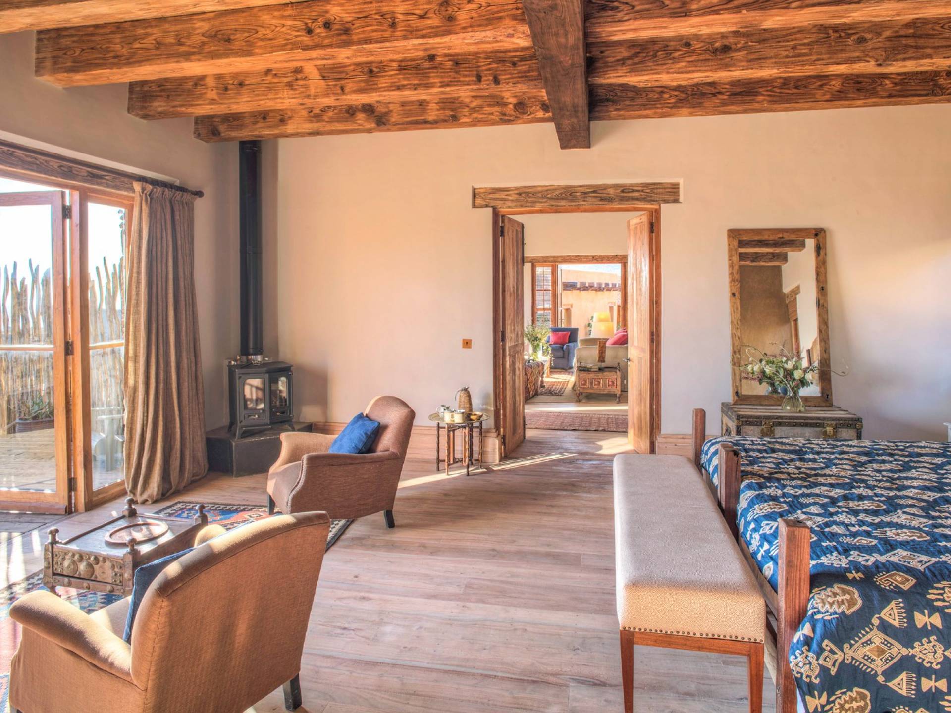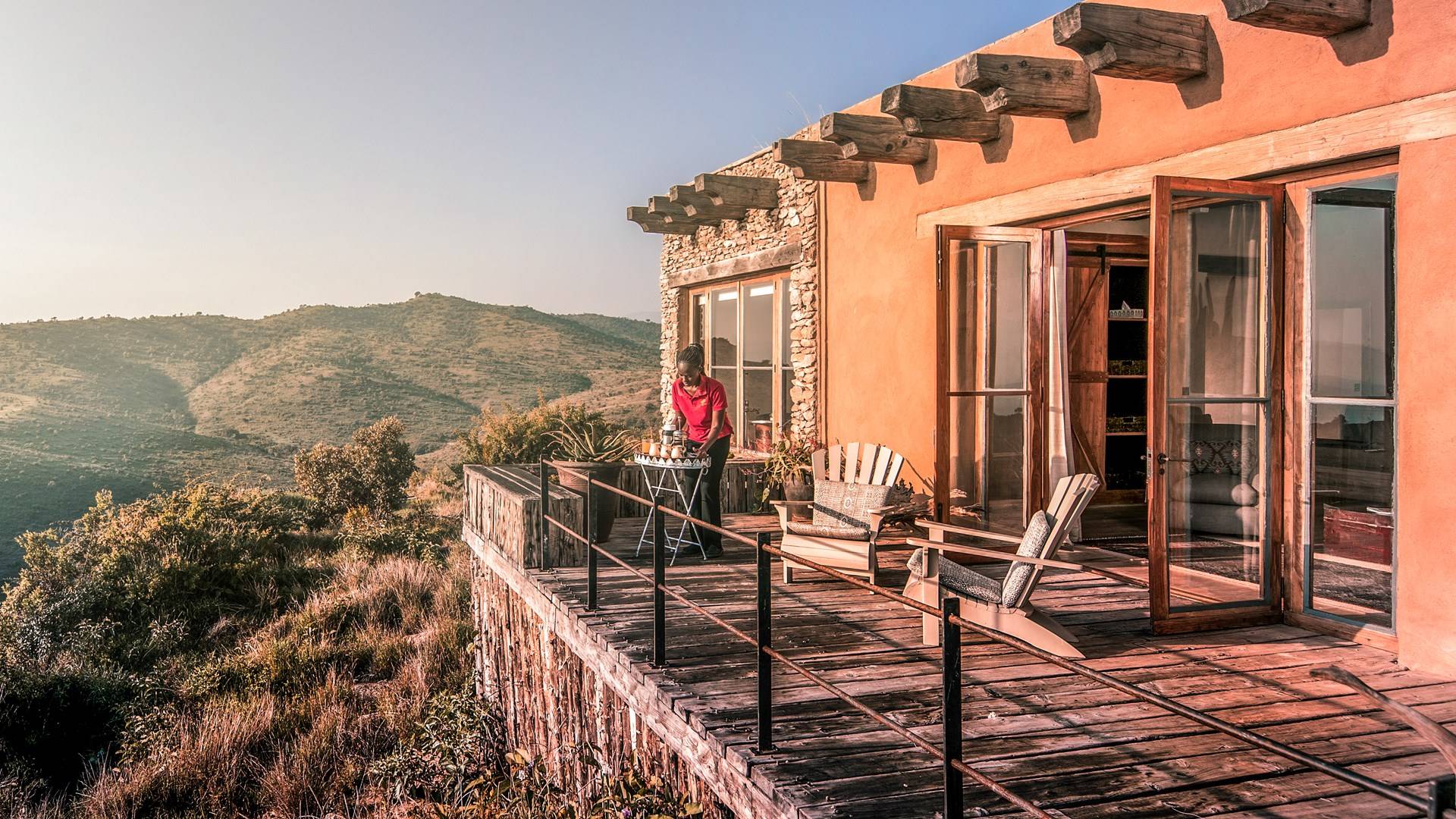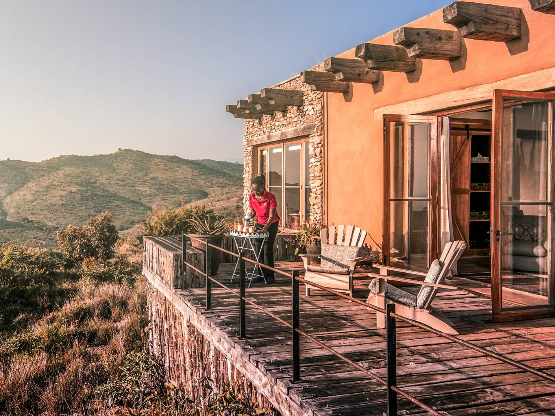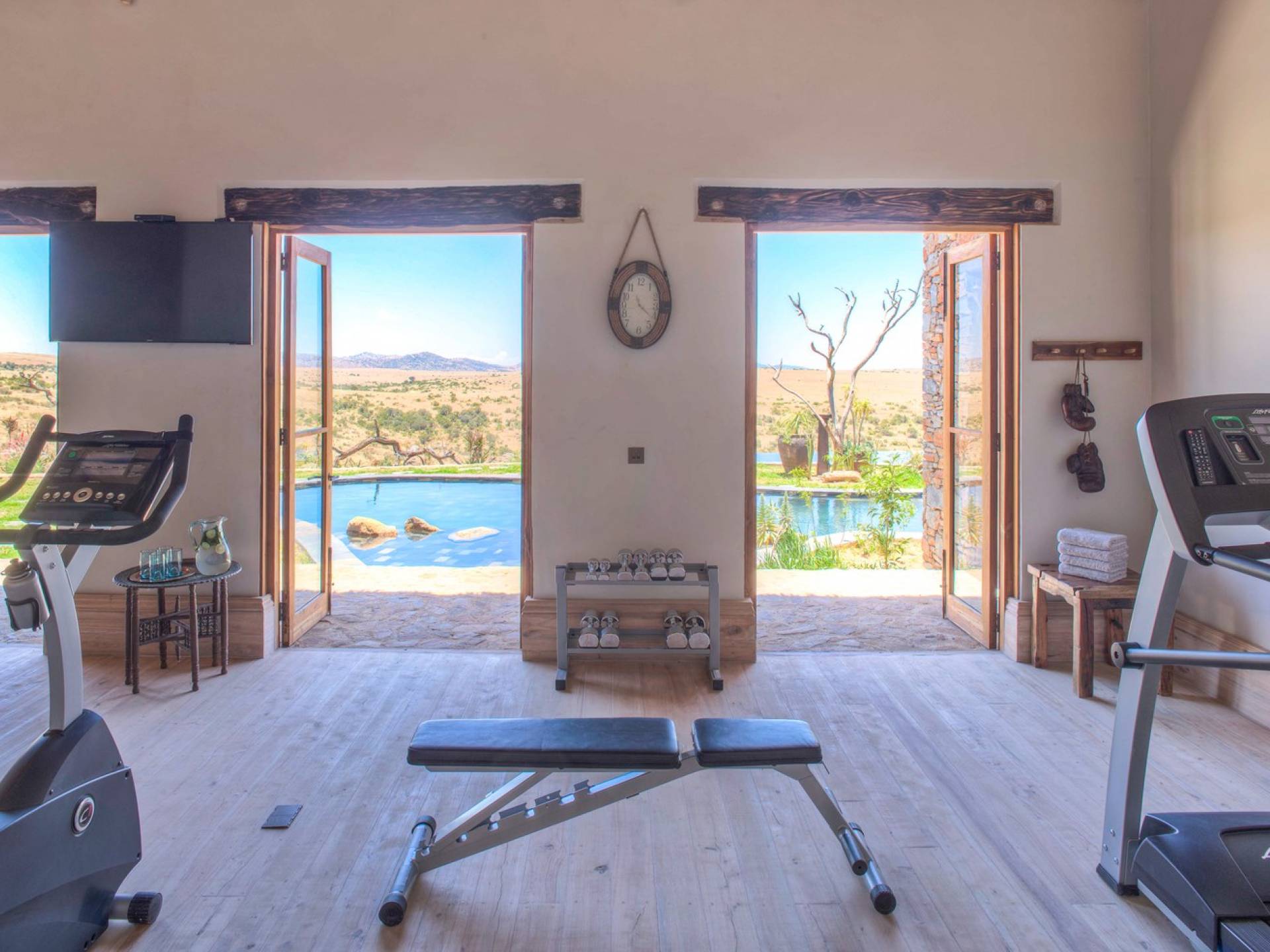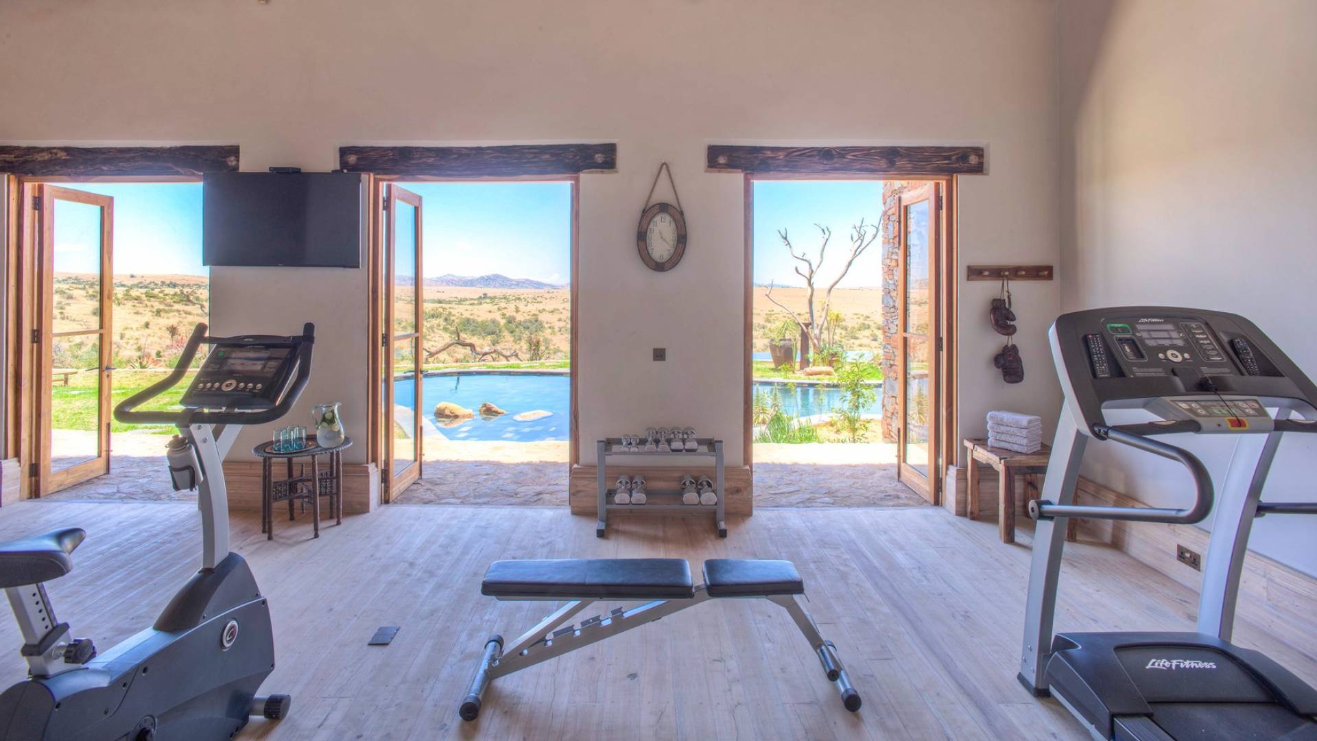 Lengishu is built with locally sourced materials and designed to blend in with the surrounding environment. Expertly crafted by local artisans, the house features beautiful exposed Kenyan timber work while stone for the floors and intricate design features were excavated from the site itself. The interiors are tastefully decorated in neutral tones with splashes of red in a nod to the owner’s Scottish heritage and that of their neighbors; the Maasai community. The main house is central to the design with a large entrance hall leading to a study and dining room with two inviting fireplaces and an impressive vaulted ceiling. A covered veranda with a pizza oven is a delightful hub for al fresco breakfasts or sundowners under an African sky.