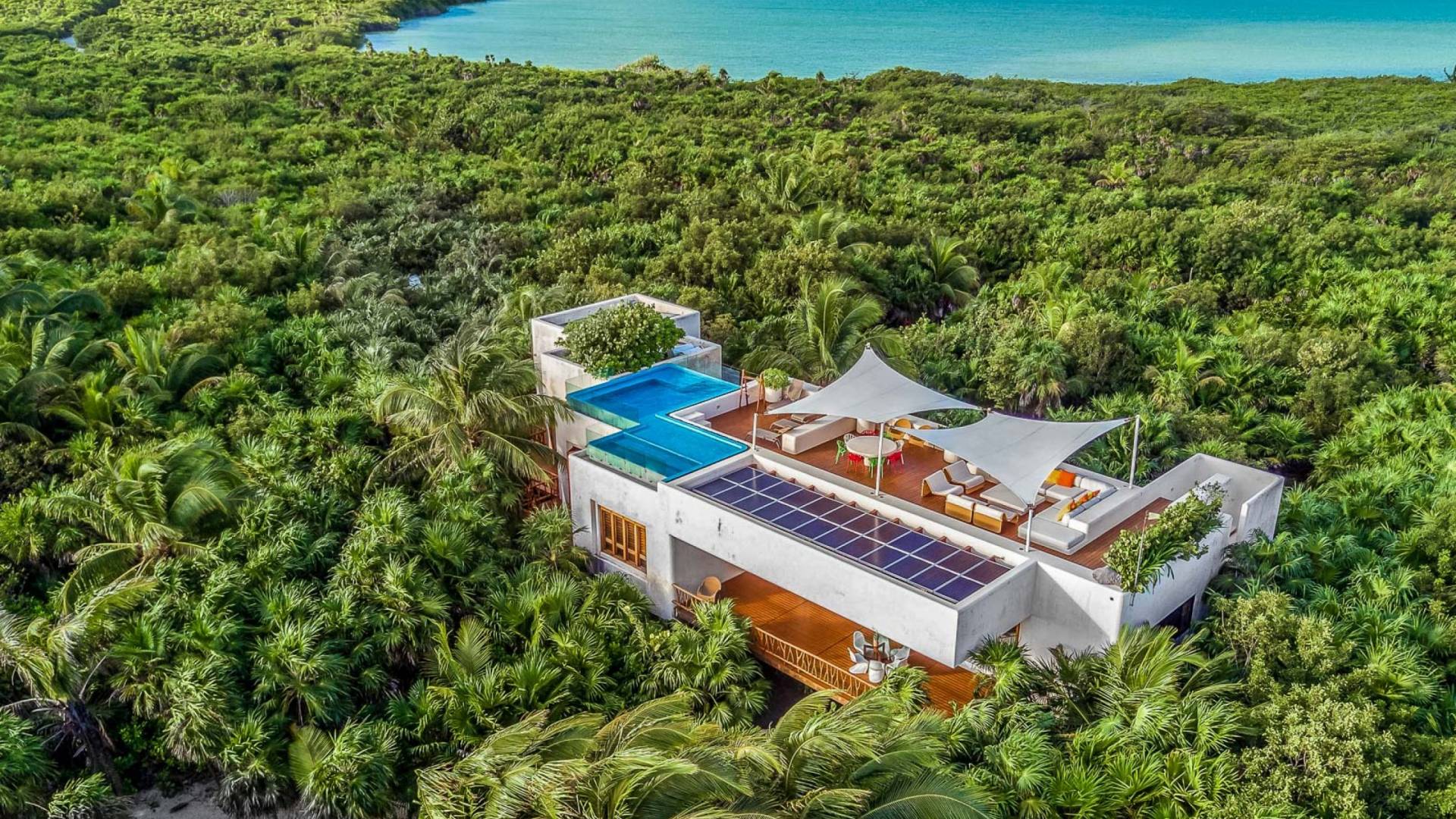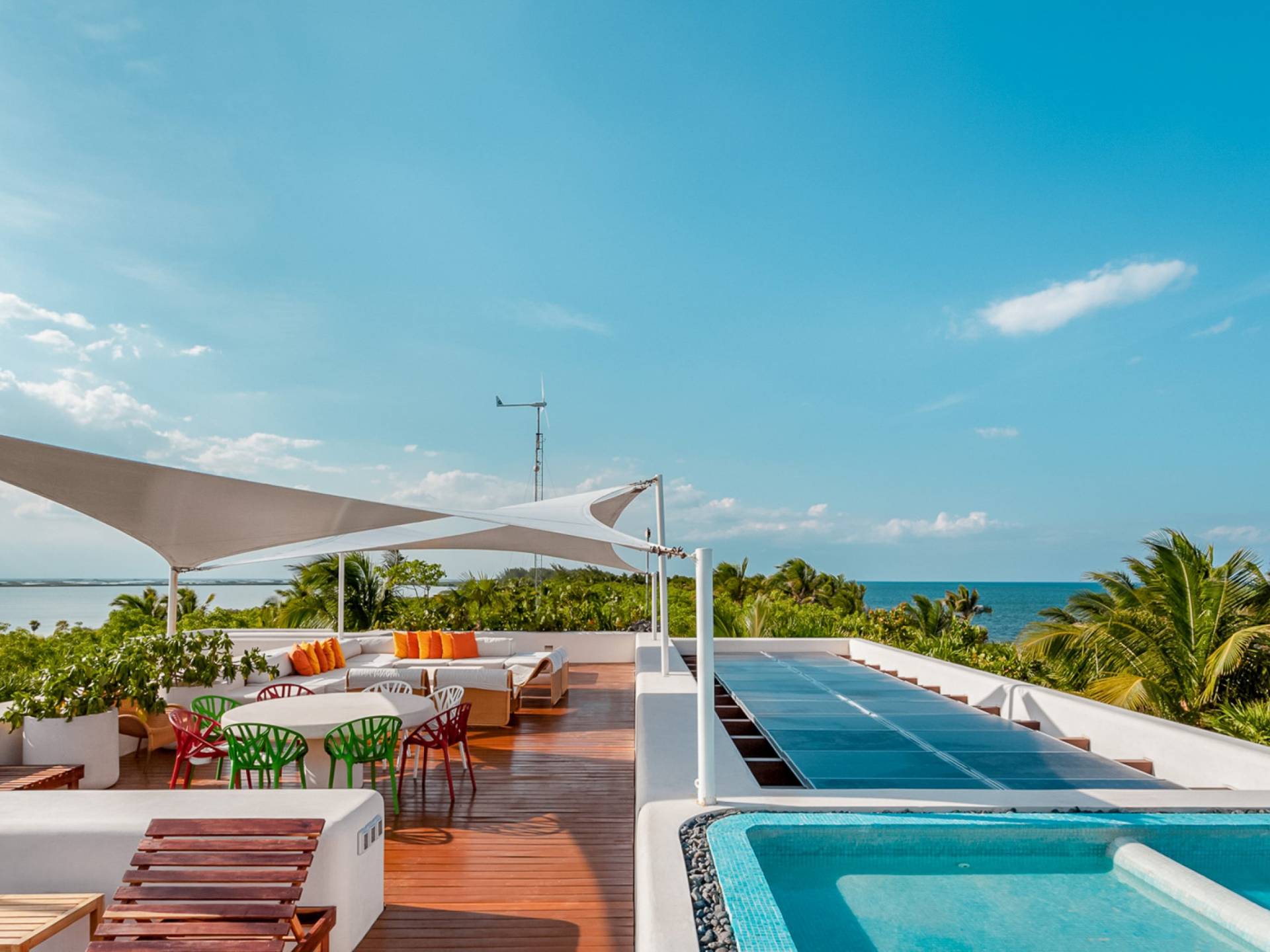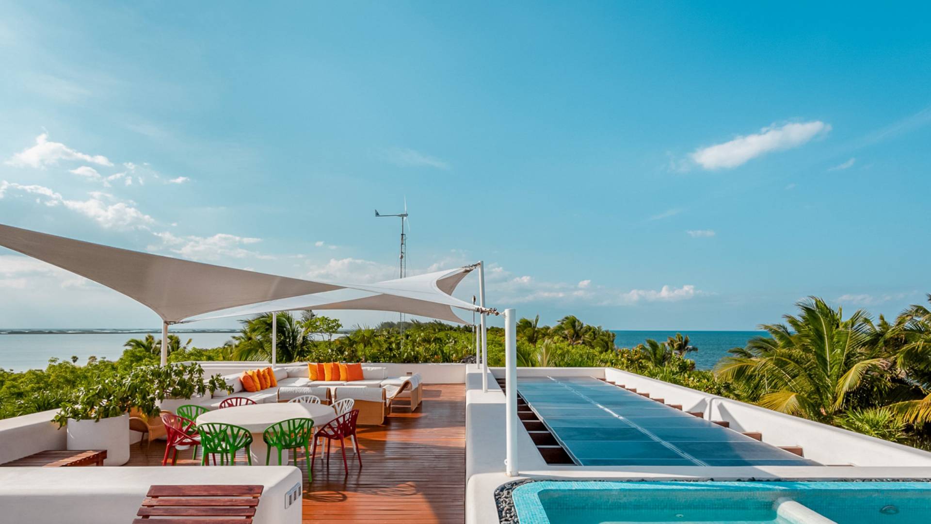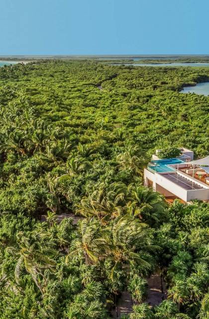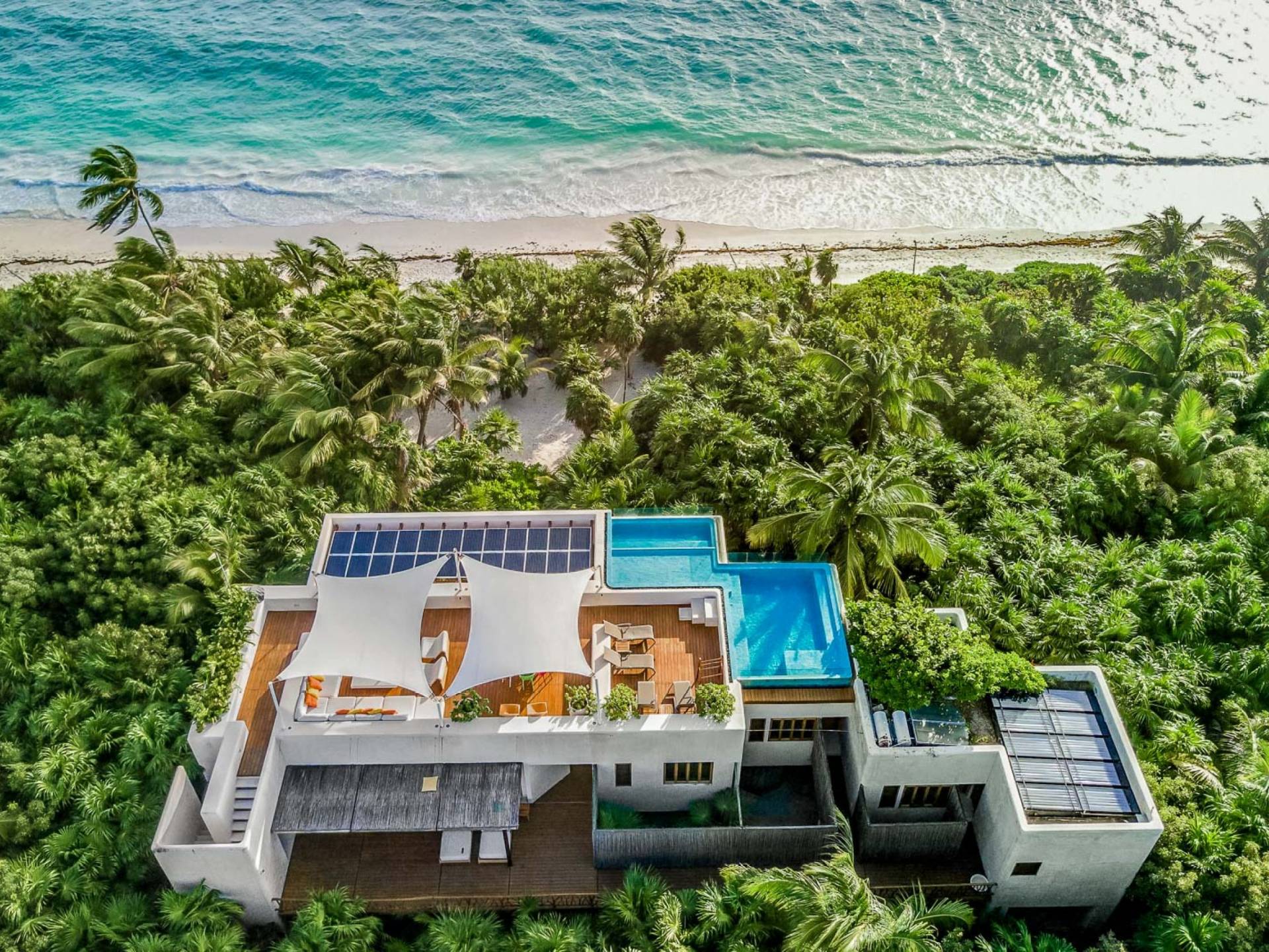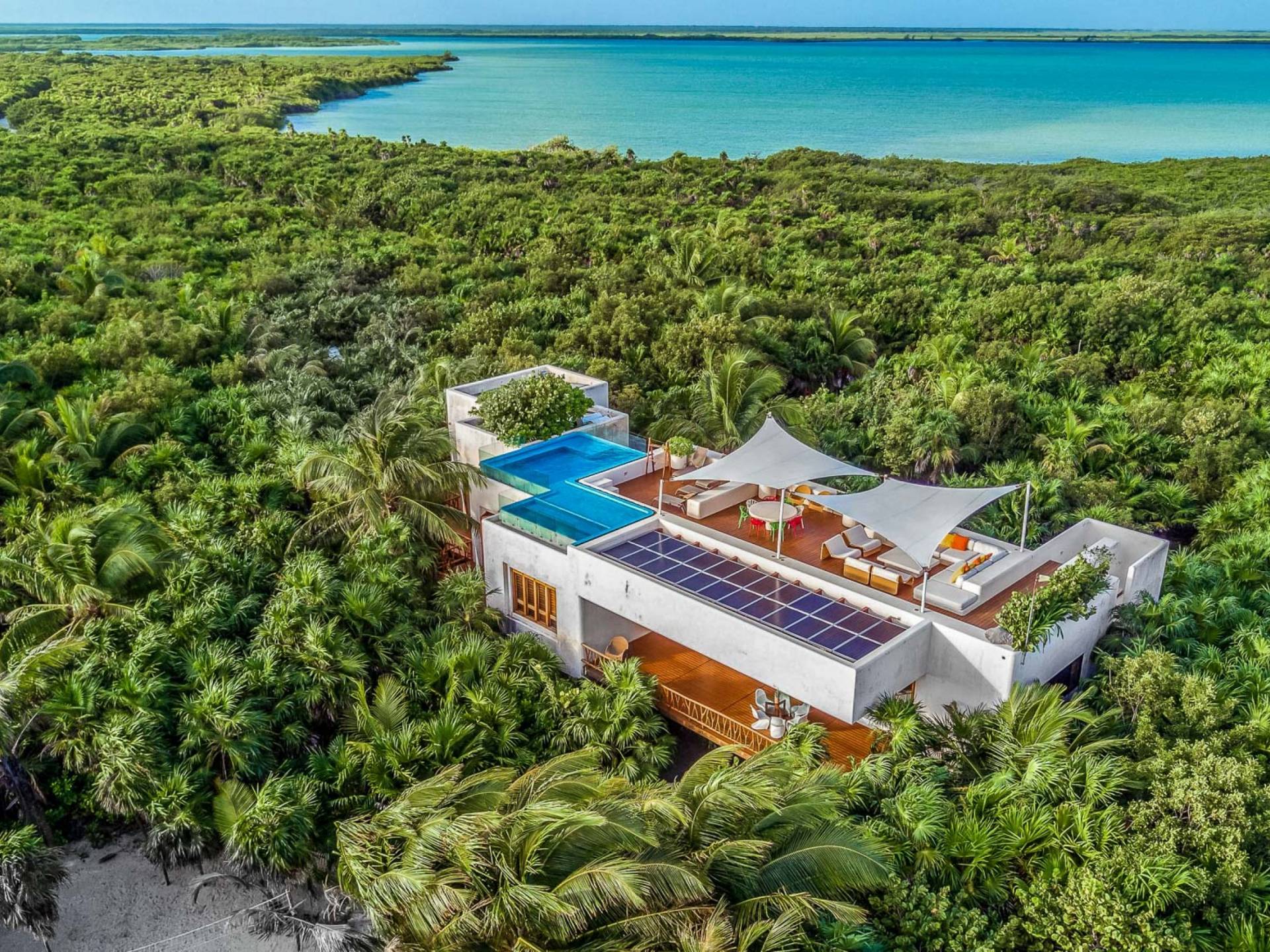 Casa Ikal Tulum is a luxury villa rental with 4 bedrooms and a private pool. The stunning beach-front villa inside the biosphere reserve of Sian Ka’an, the house has a wonderful open-plan living/dining area, fully fitted kitchen, storage room, 4 bedrooms and 5 bathrooms (4 ensuites) and plenty of exterior decks. The rooftop has hardwood decking, green roofs, and a double infinity swimming pool with fiber optics lighting, and with spectacular views of the sea, lagoon, and lush vegetation all around.