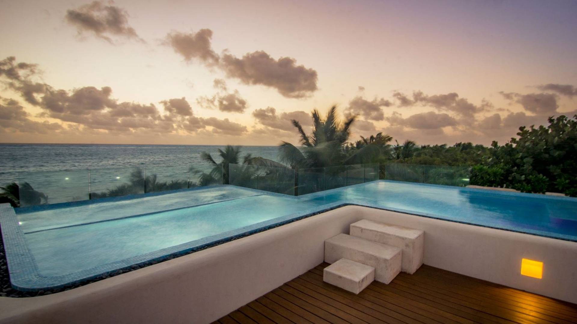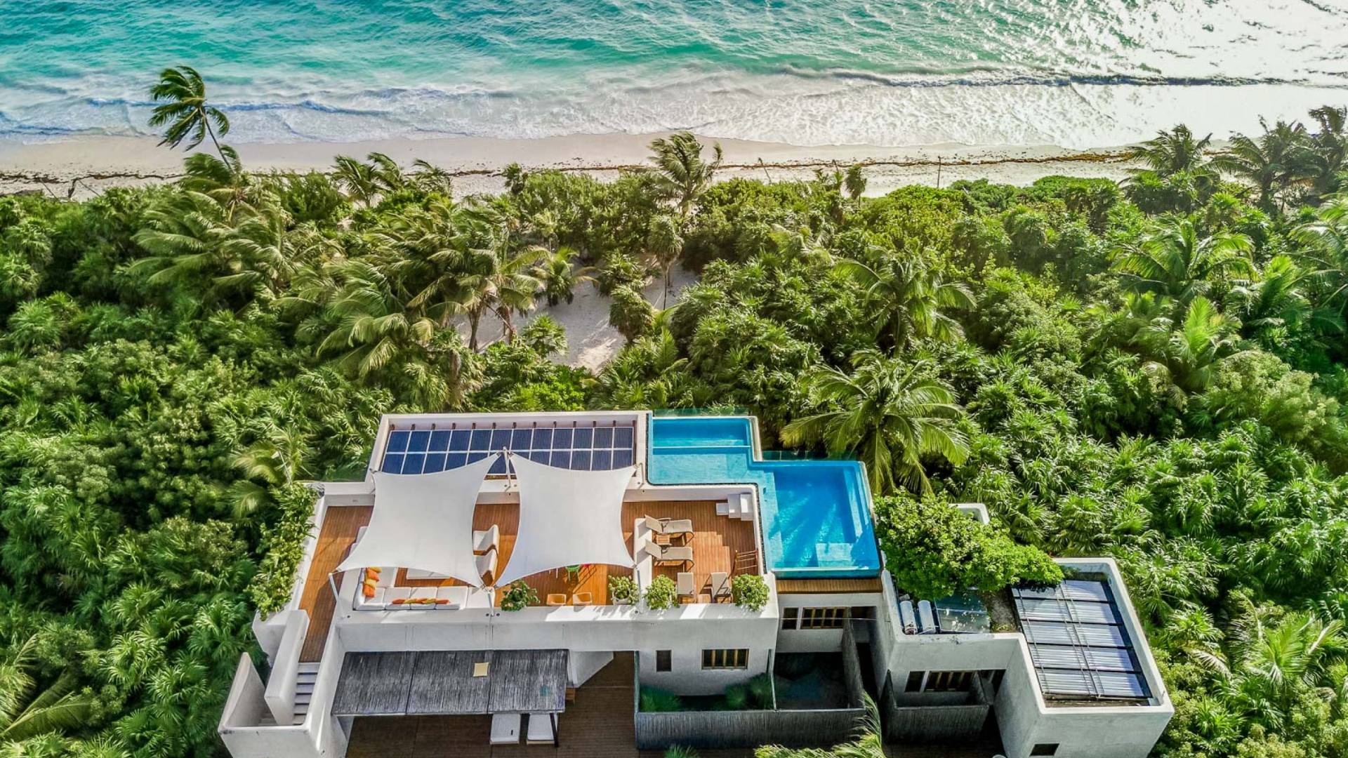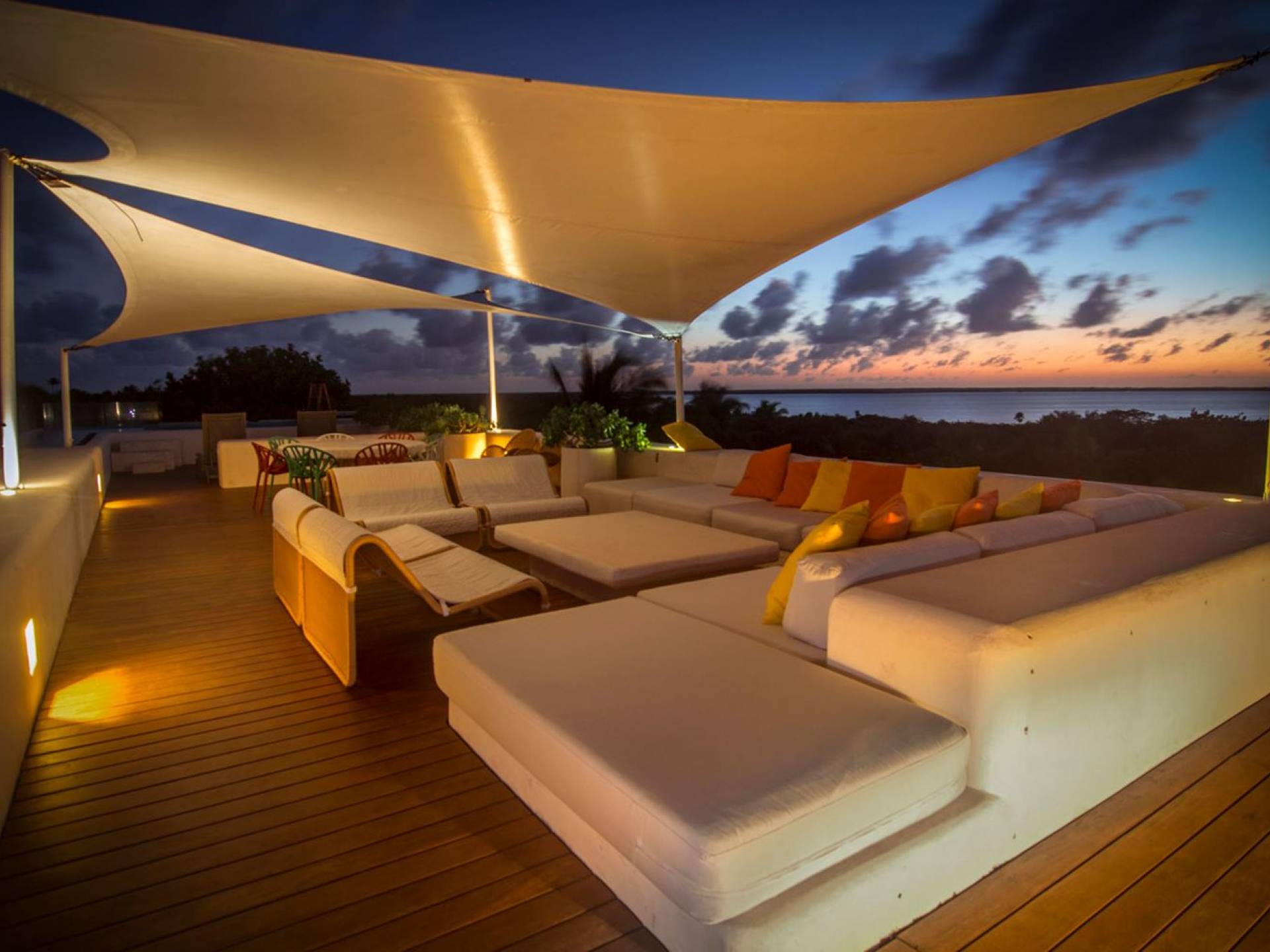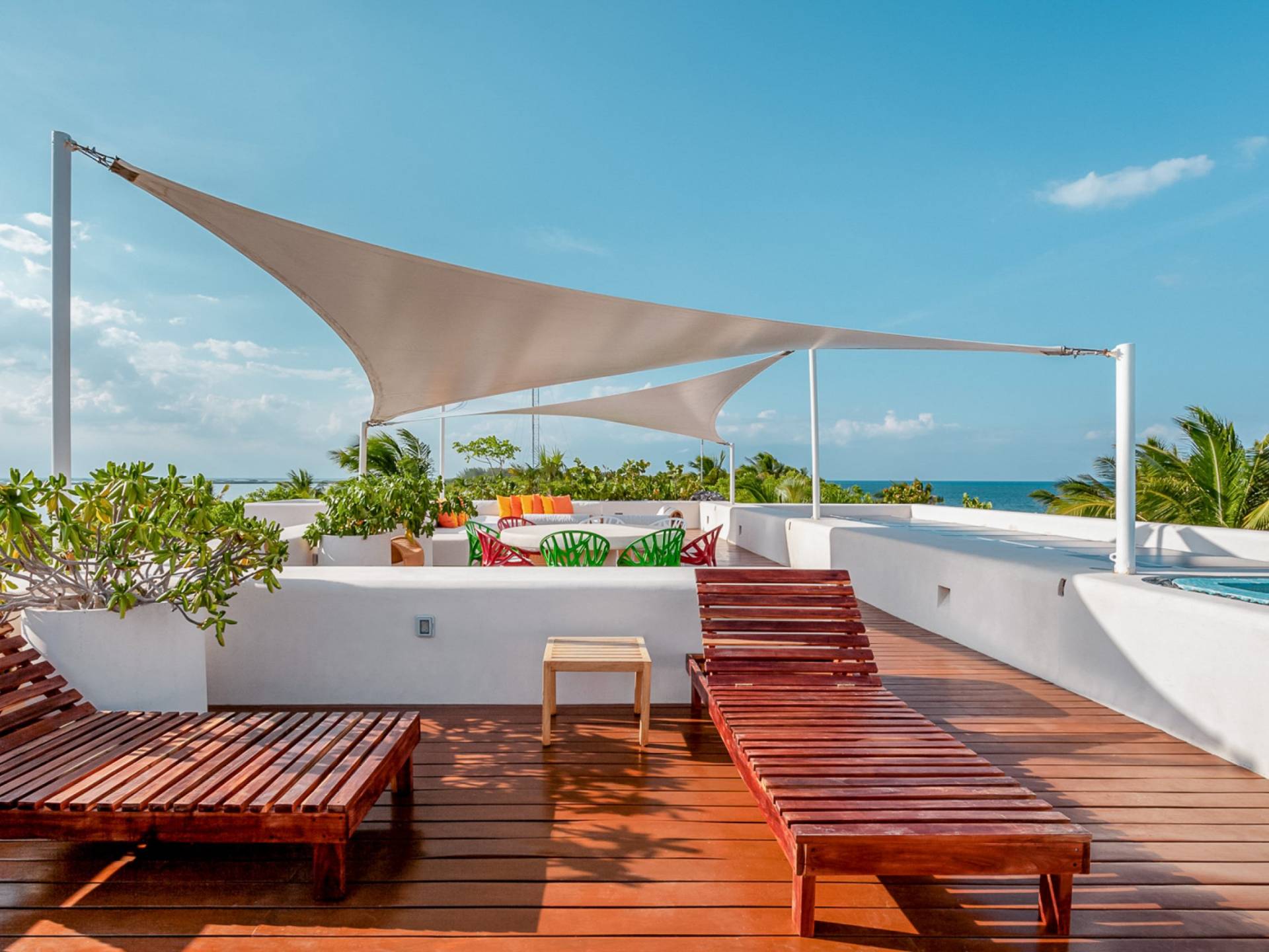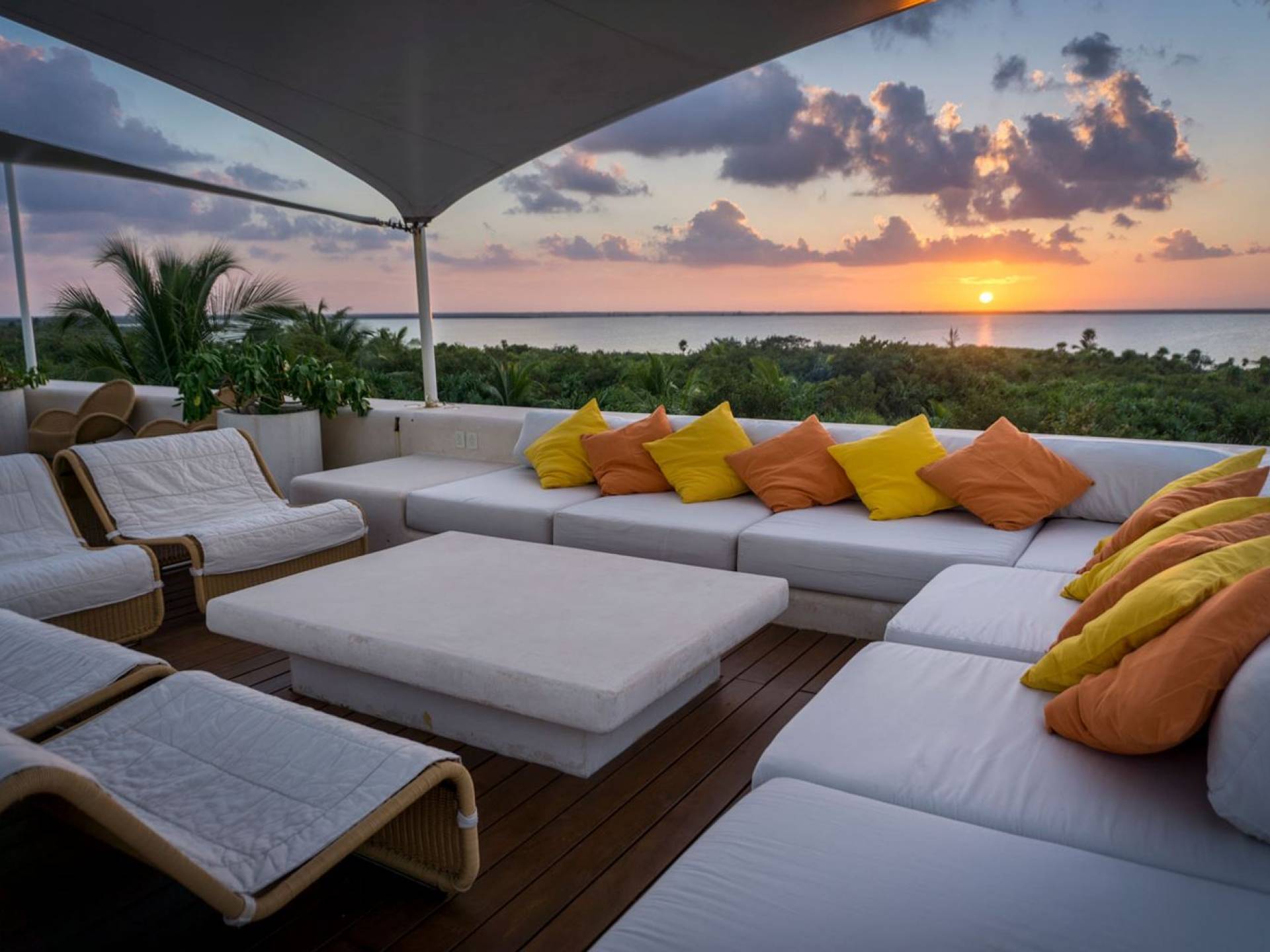 Casa Ikal Tulum is a luxury villa rental with 4 bedrooms and a private pool. The stunning beach-front villa inside the biosphere reserve of Sian Ka’an, the house has a wonderful open-plan living/dining area, fully fitted kitchen, storage room, 4 bedrooms and 5 bathrooms (4 ensuites) and plenty of exterior decks. The rooftop has hardwood decking, green roofs, and a double infinity swimming pool with fiber optics lighting, and with spectacular views of the sea, lagoon, and lush vegetation all around.