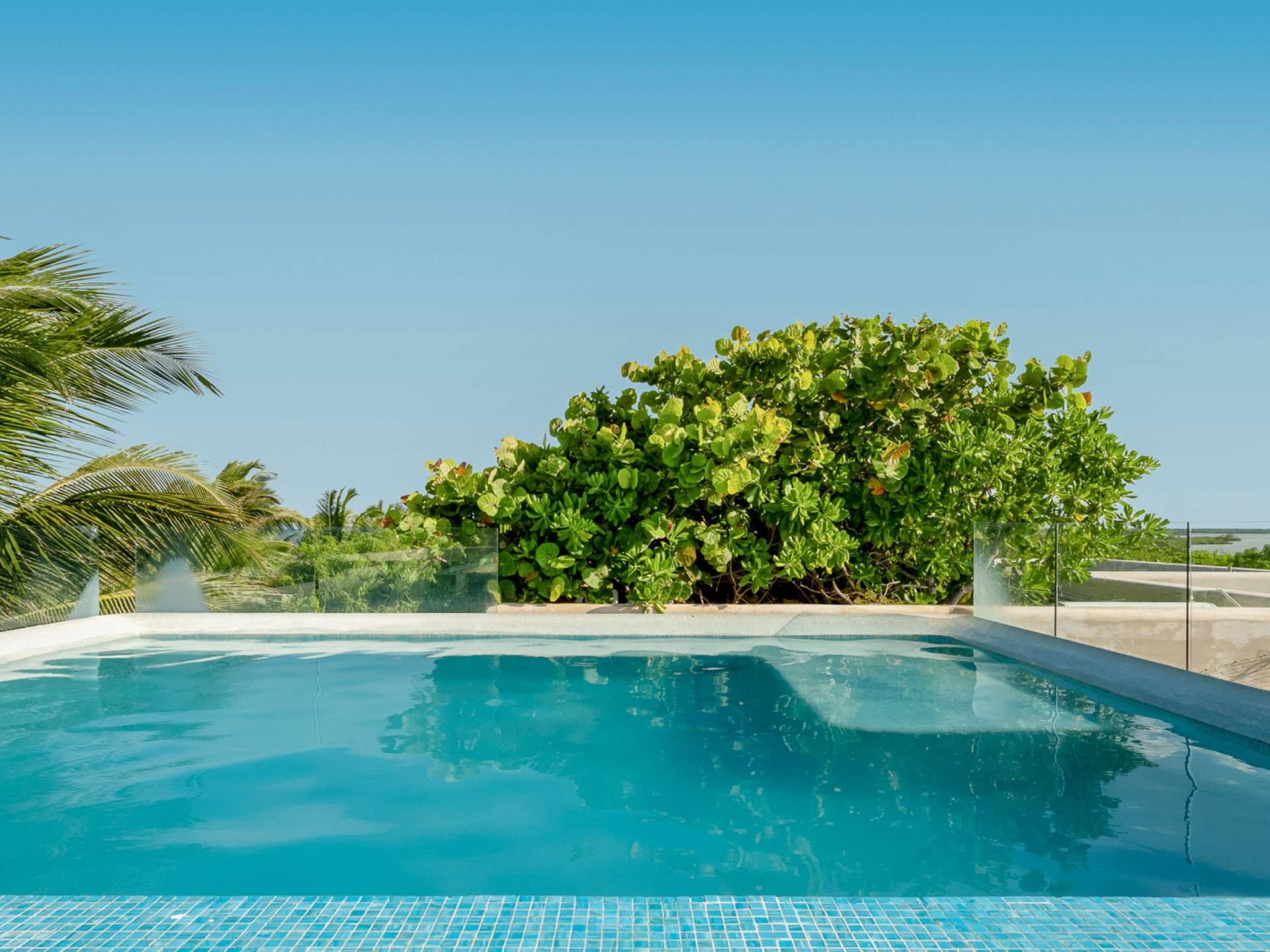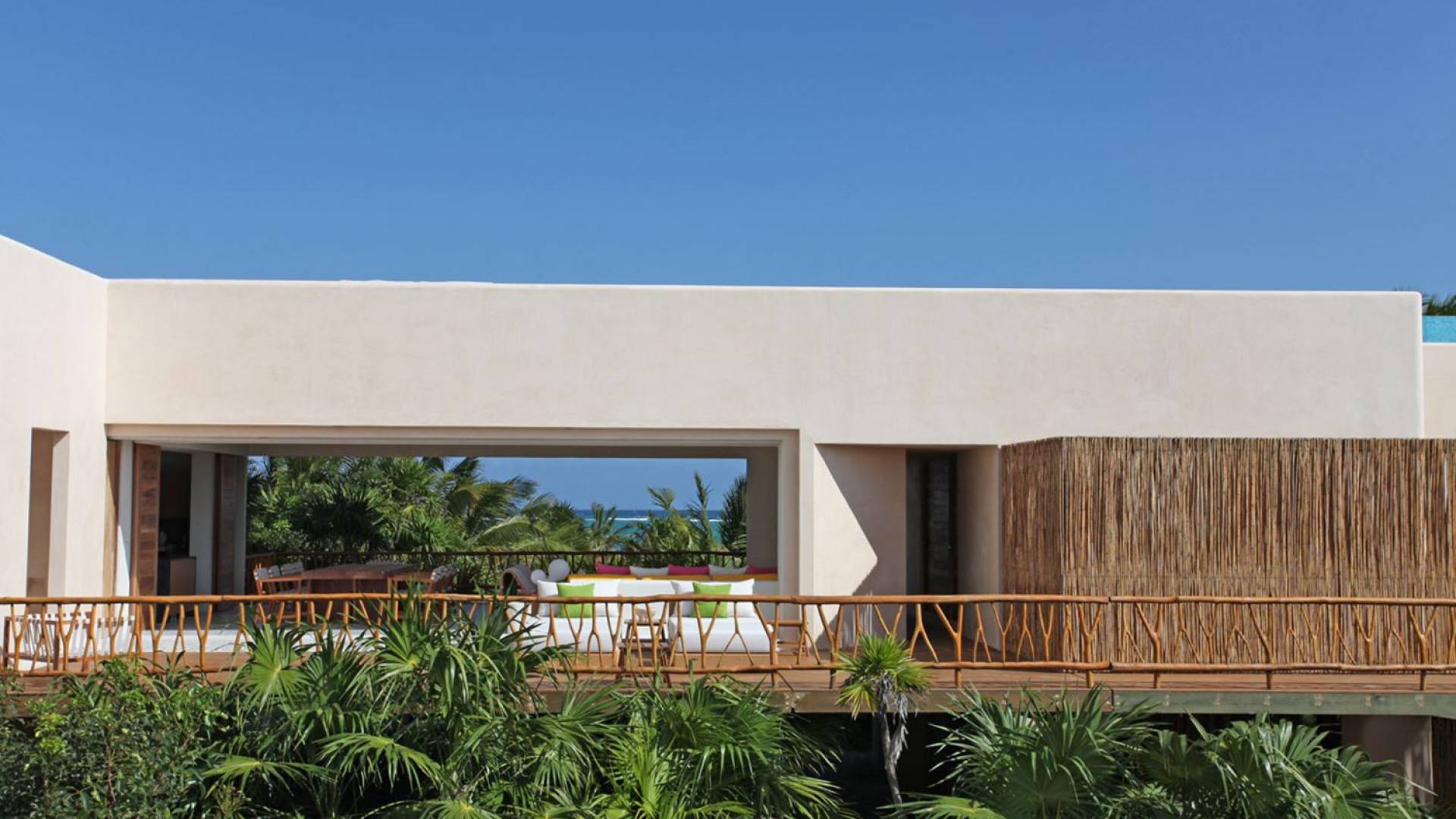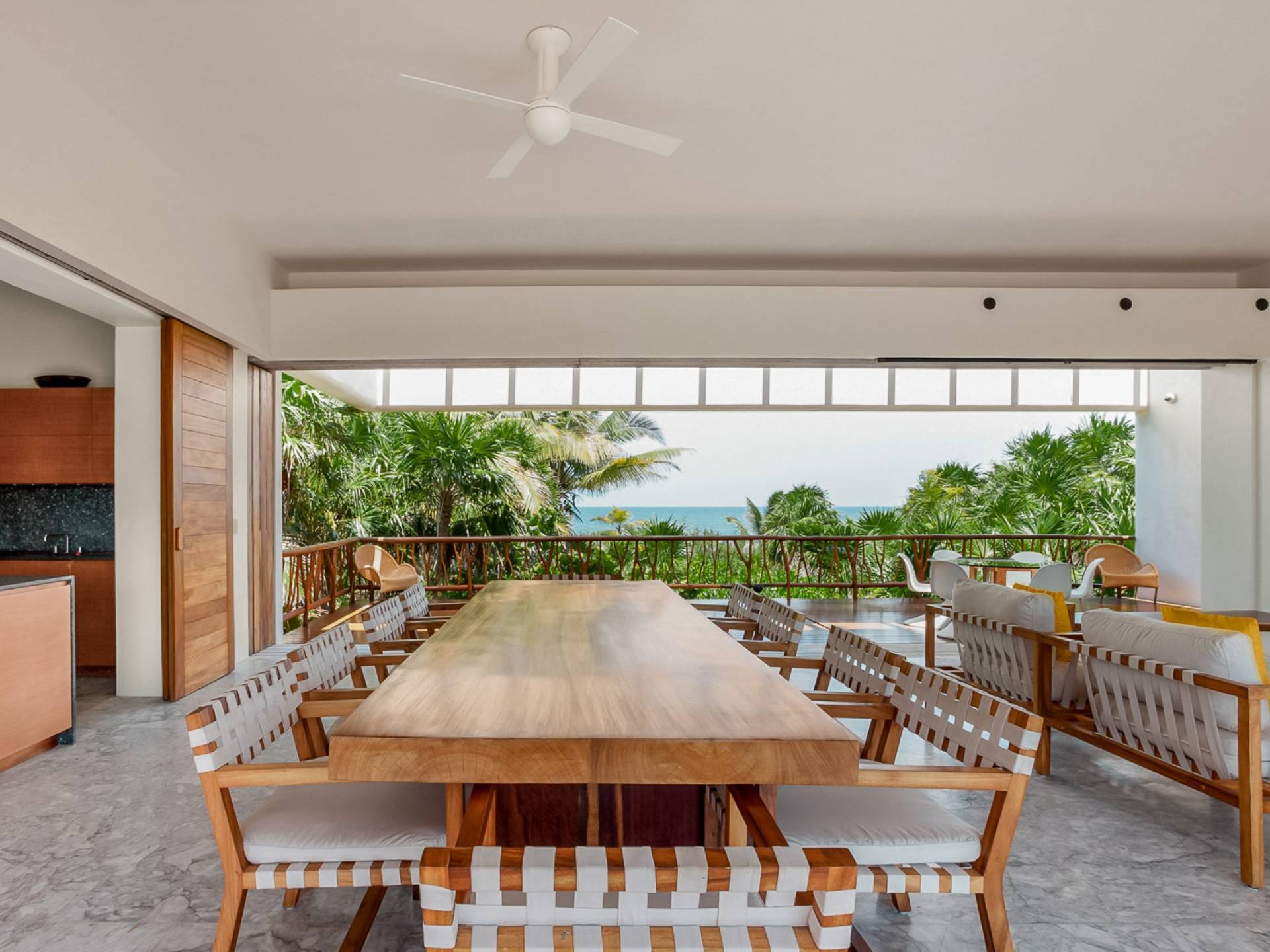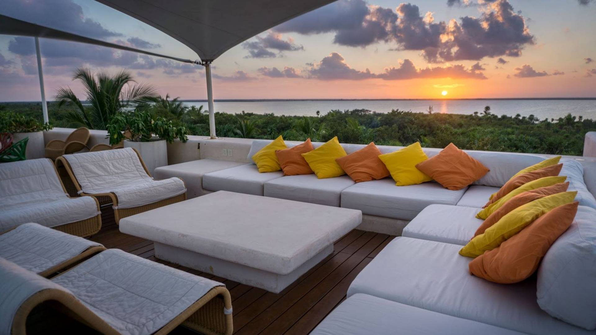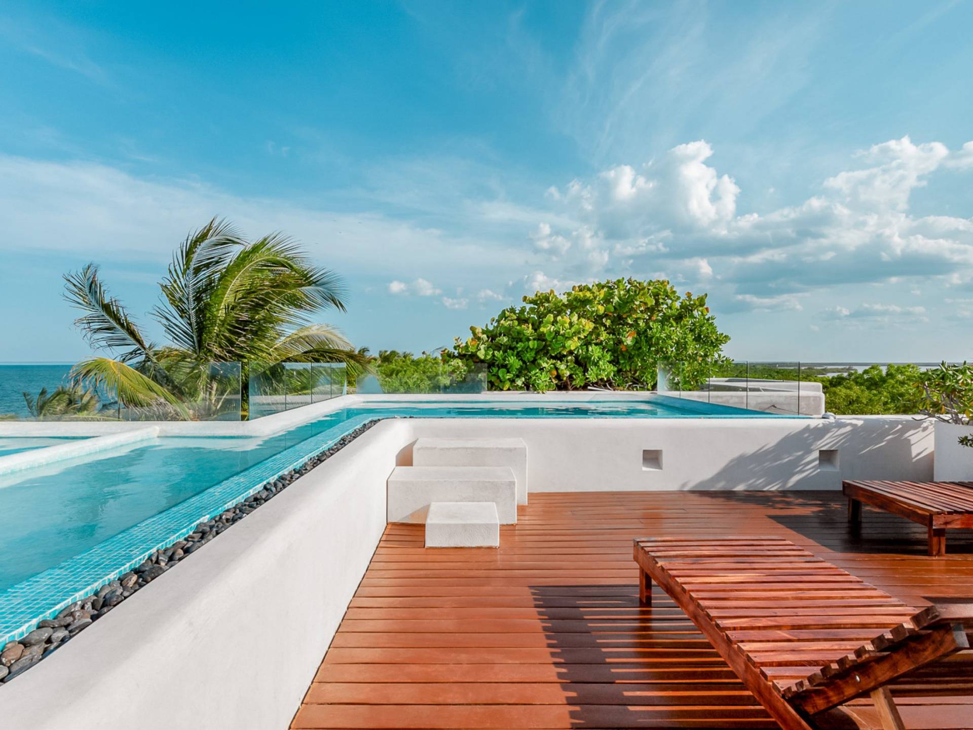 Casa Ikal Tulum is a luxury villa rental with 4 bedrooms and a private pool. The stunning beach-front villa inside the biosphere reserve of Sian Ka’an, the house has a wonderful open-plan living/dining area, fully fitted kitchen, storage room, 4 bedrooms and 5 bathrooms (4 ensuites) and plenty of exterior decks. The rooftop has hardwood decking, green roofs, and a double infinity swimming pool with fiber optics lighting, and with spectacular views of the sea, lagoon, and lush vegetation all around.