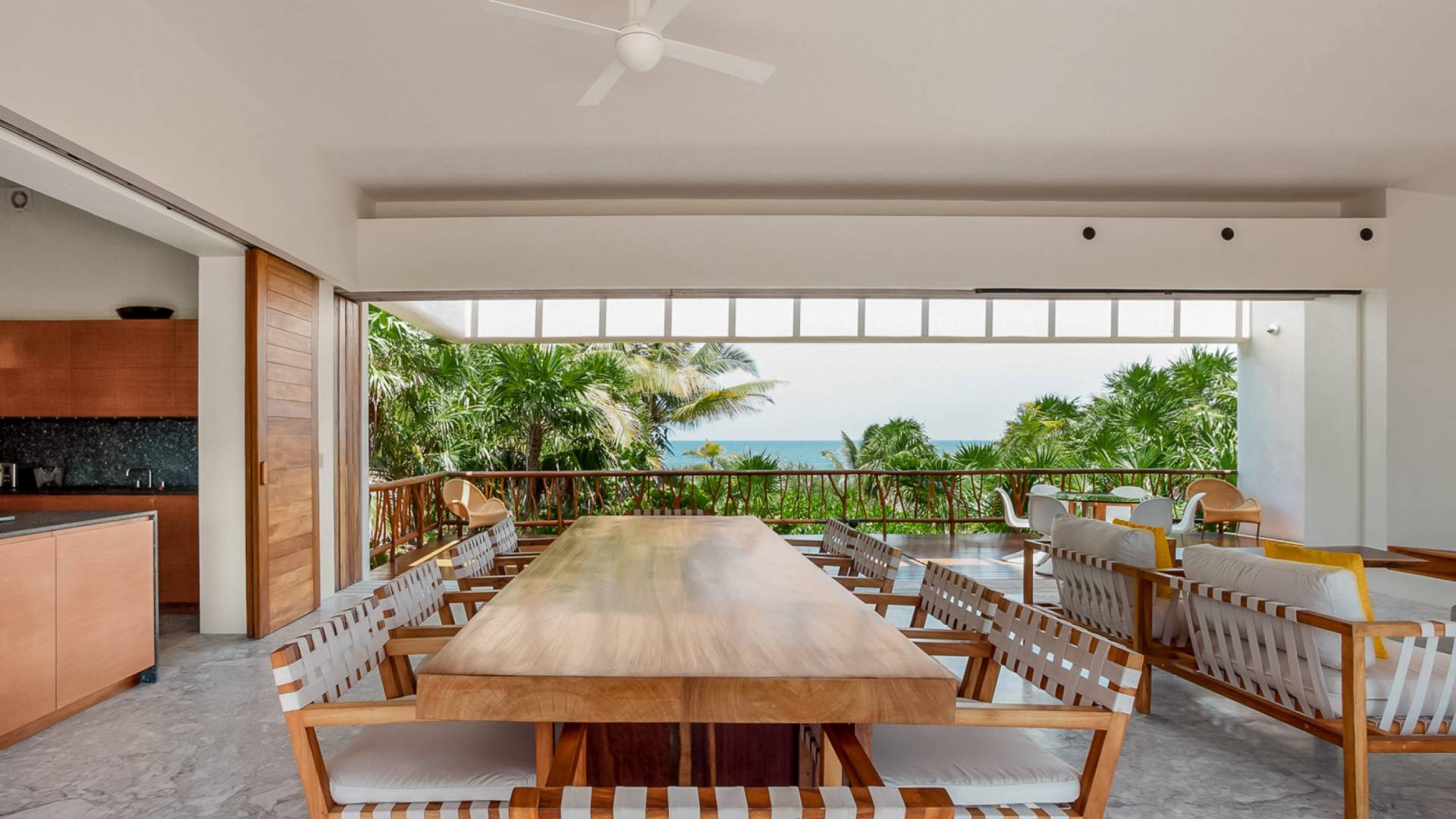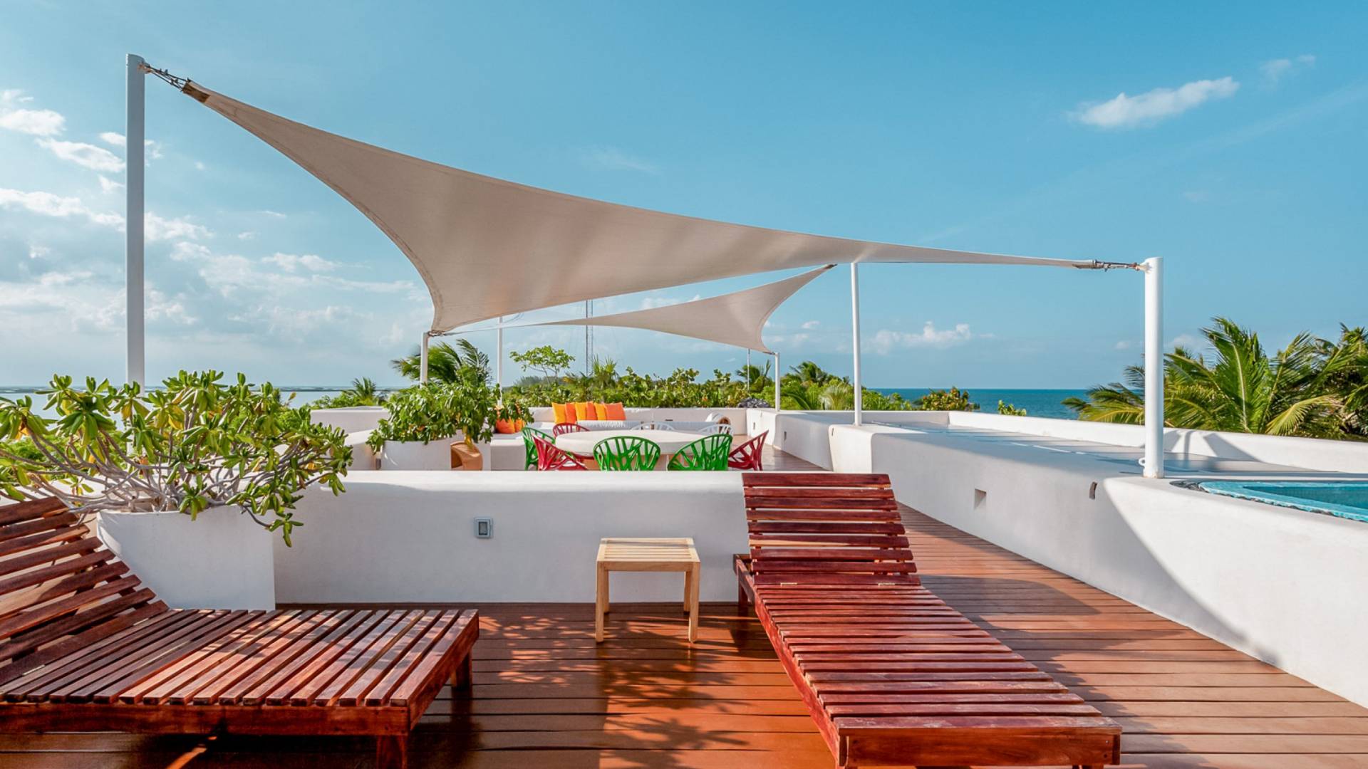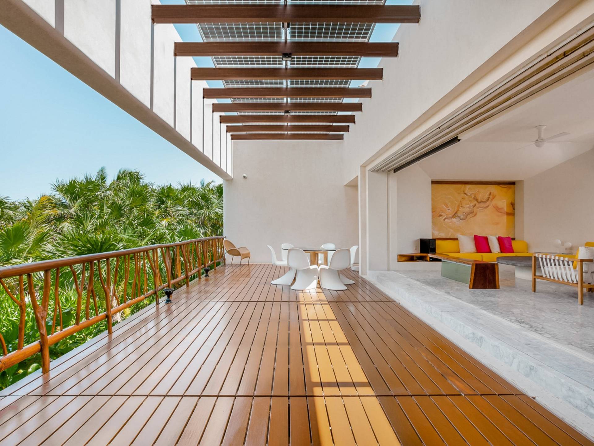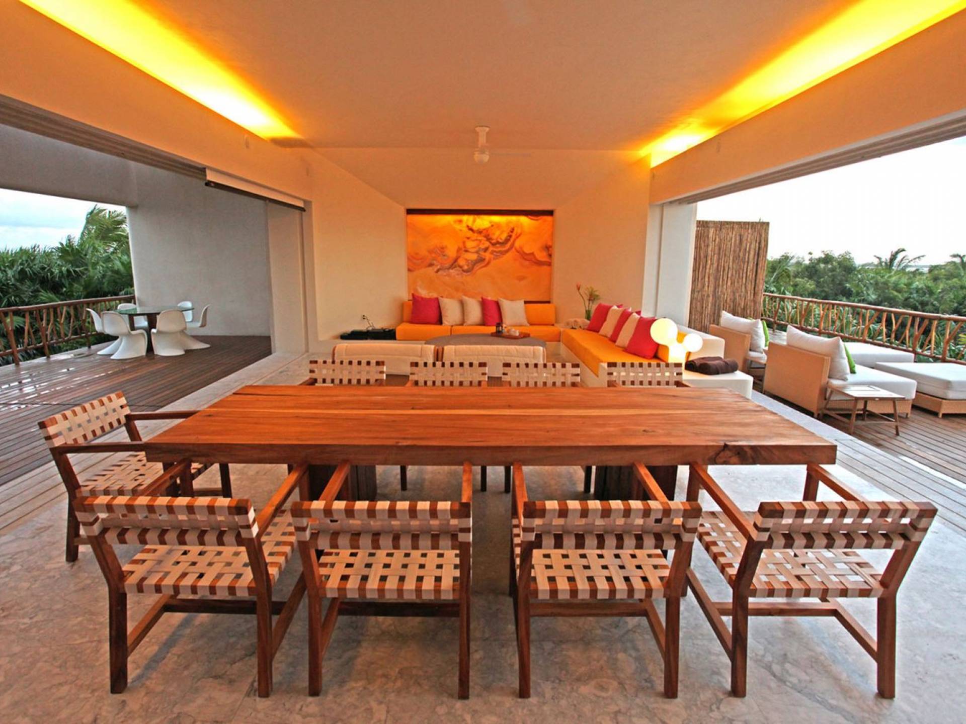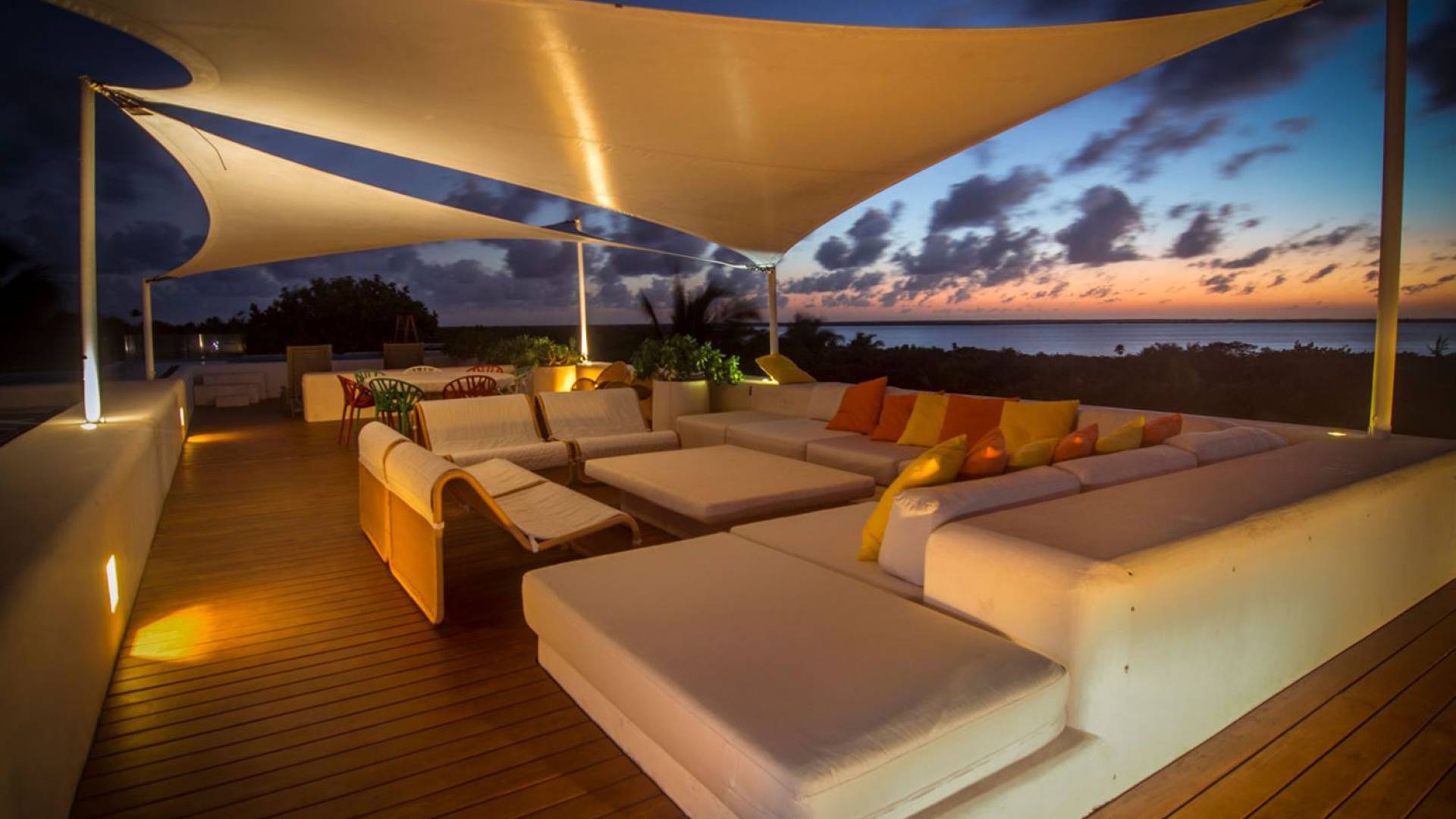 Casa Ikal Tulum is a luxury villa rental with 4 bedrooms and a private pool. The stunning beach-front villa inside the biosphere reserve of Sian Ka’an, the house has a wonderful open-plan living/dining area, fully fitted kitchen, storage room, 4 bedrooms and 5 bathrooms (4 ensuites) and plenty of exterior decks. The rooftop has hardwood decking, green roofs, and a double infinity swimming pool with fiber optics lighting, and with spectacular views of the sea, lagoon, and lush vegetation all around.