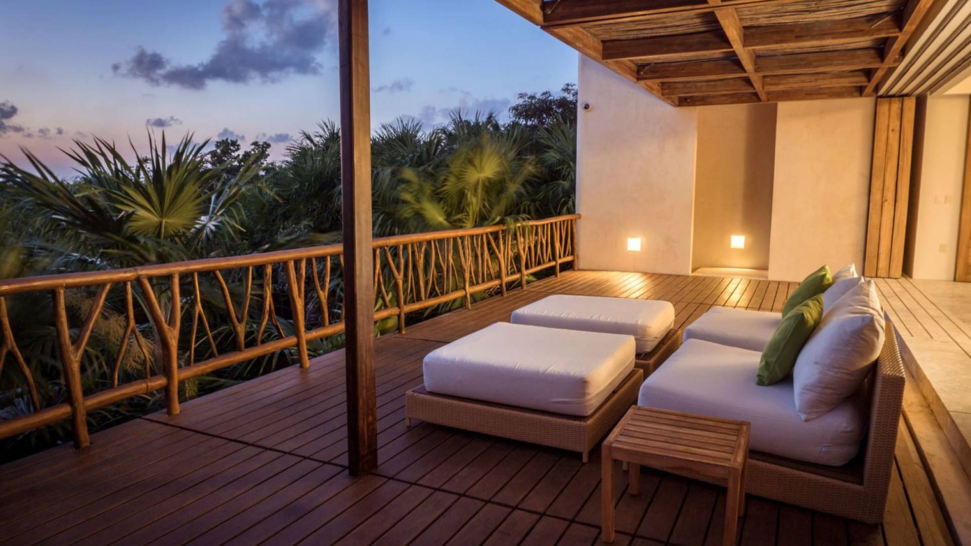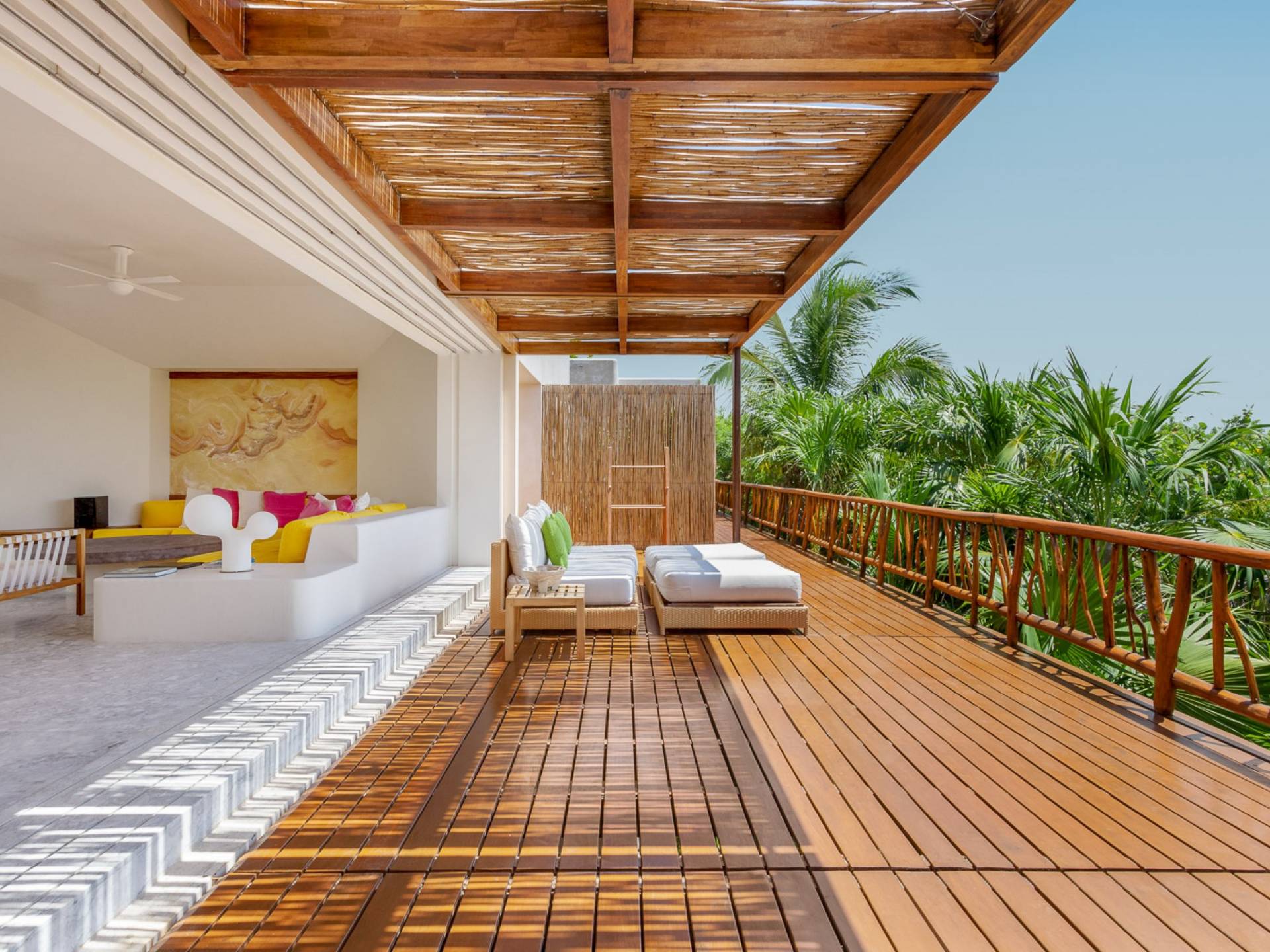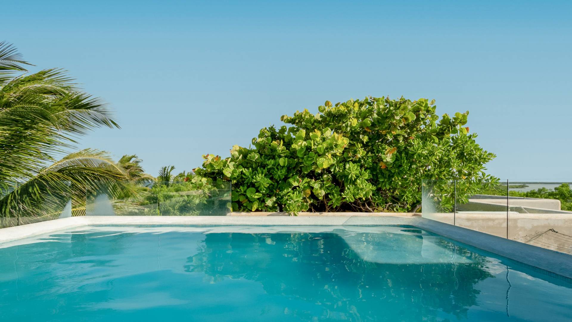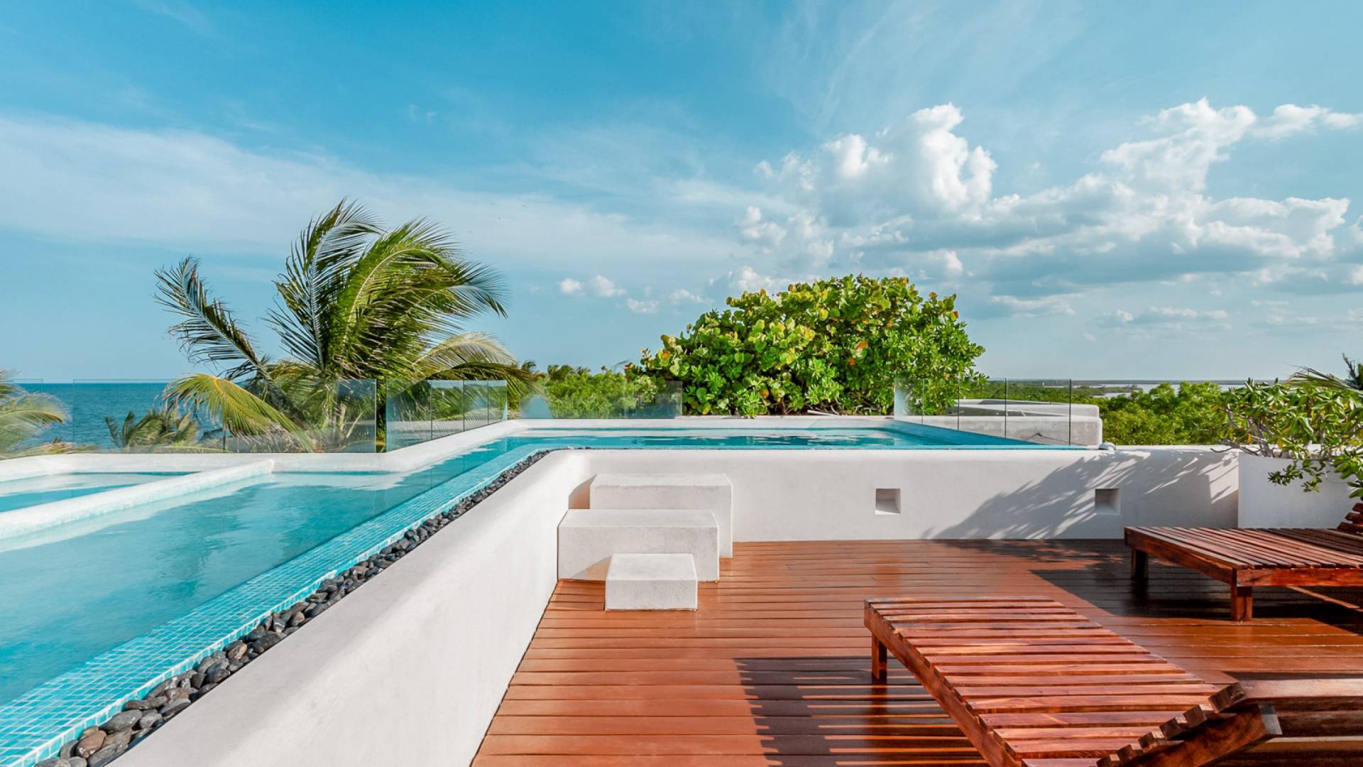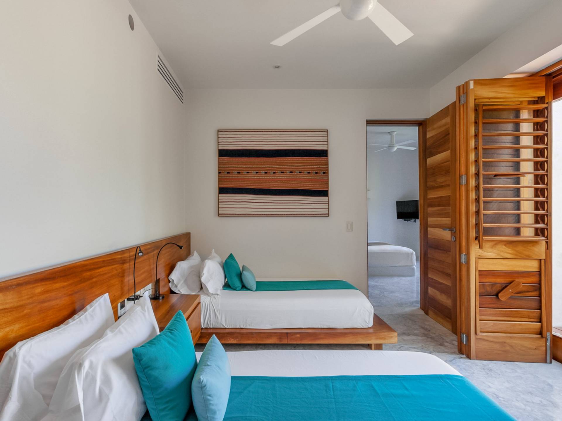Casa Ikal Tulum is a luxury villa rental with 4 bedrooms and a private pool. The stunning beach-front villa inside the biosphere reserve of Sian Ka’an, the house has a wonderful open-plan living/dining area, fully fitted kitchen, storage room, 4 bedrooms and 5 bathrooms (4 ensuites) and plenty of exterior decks. The rooftop has hardwood decking, green roofs, and a double infinity swimming pool with fiber optics lighting, and with spectacular views of the sea, lagoon, and lush vegetation all around.