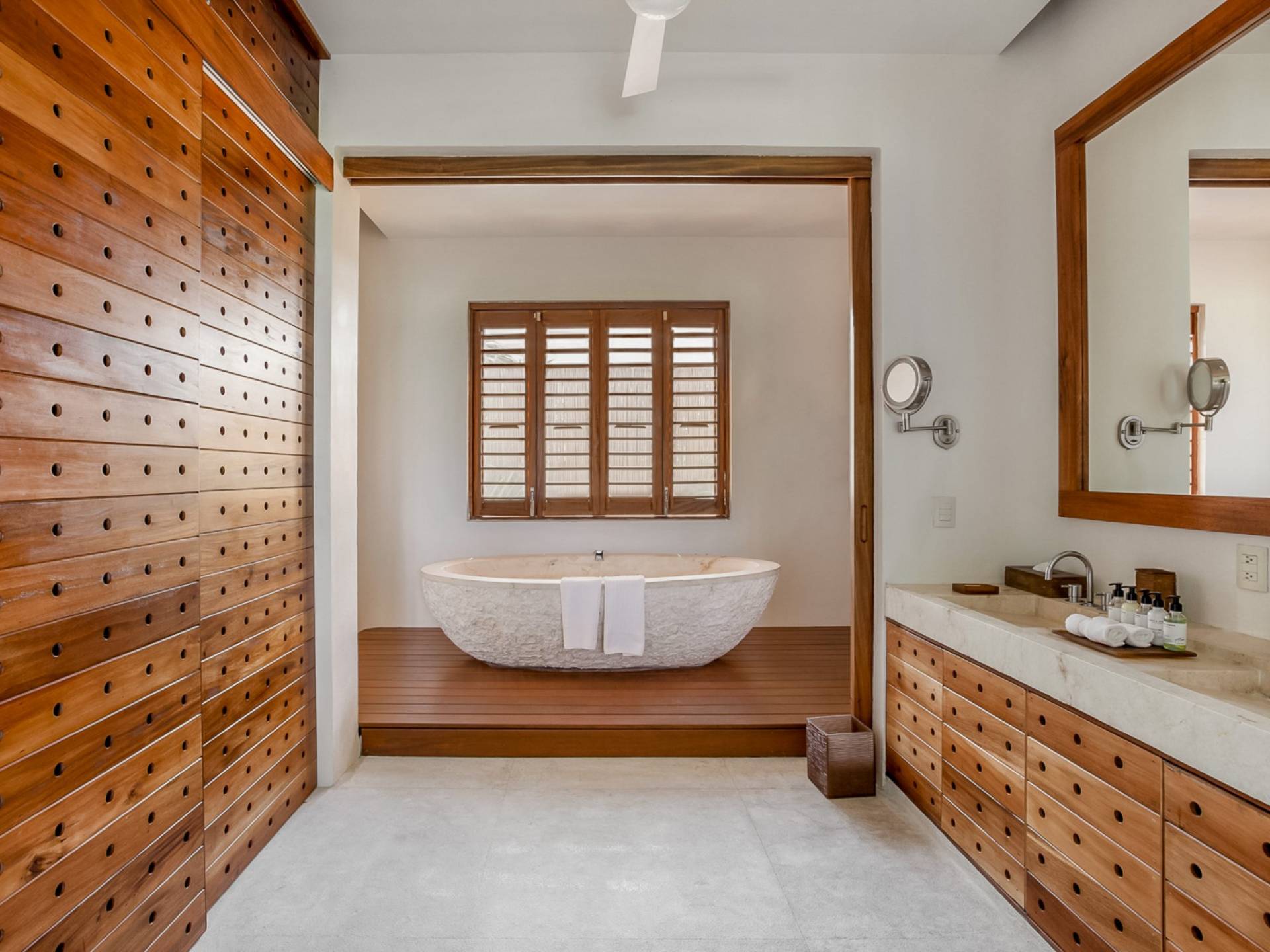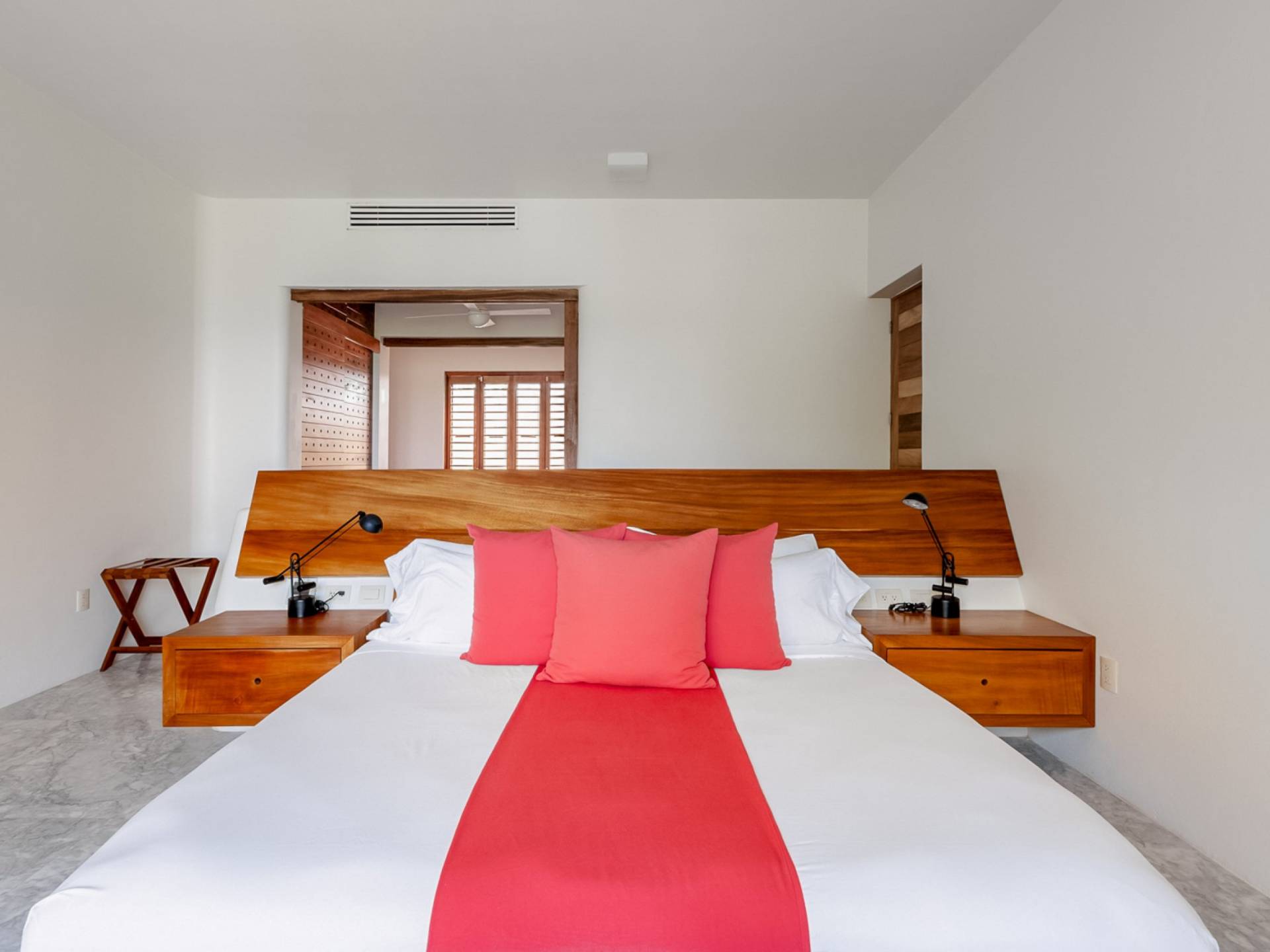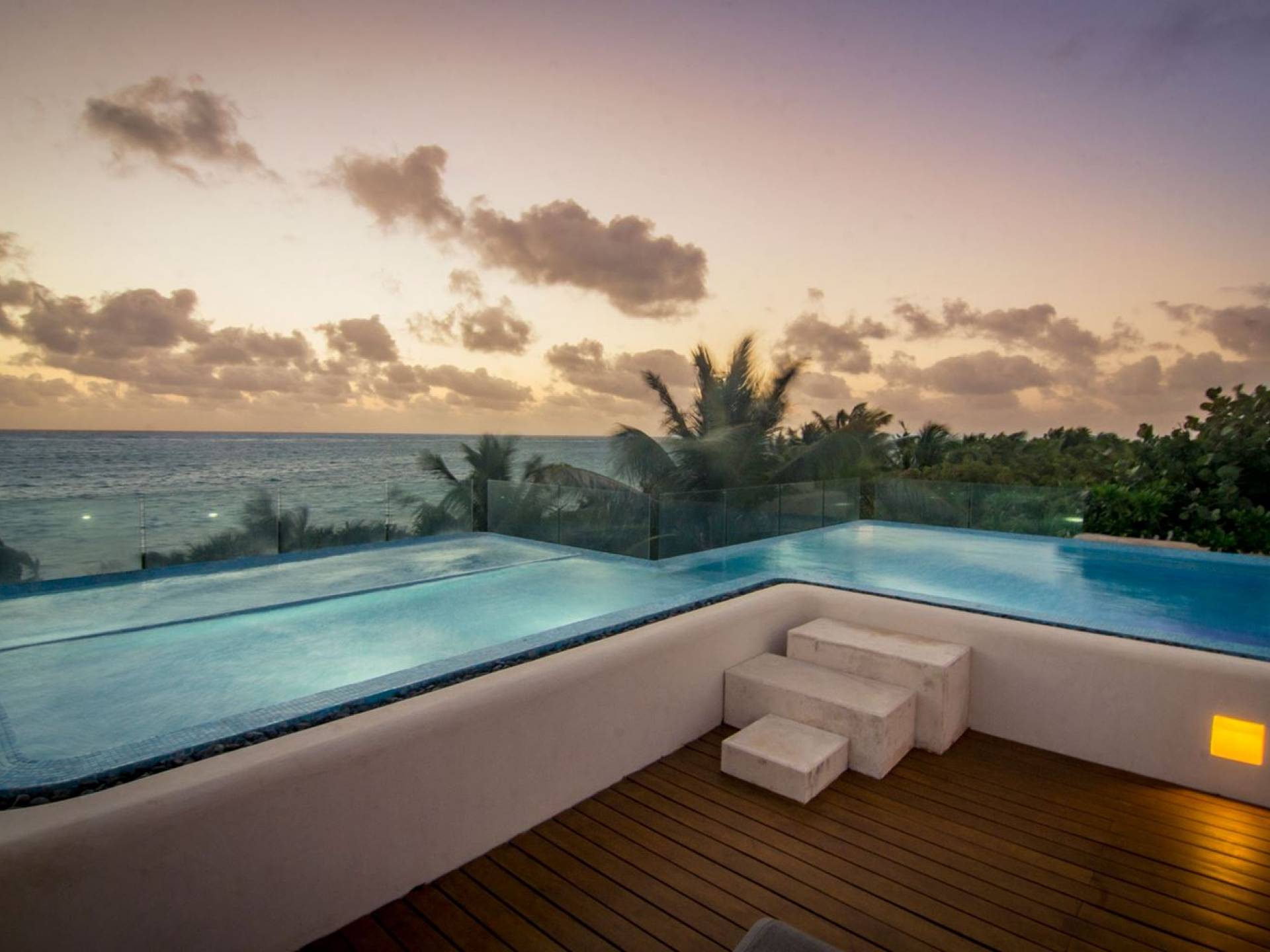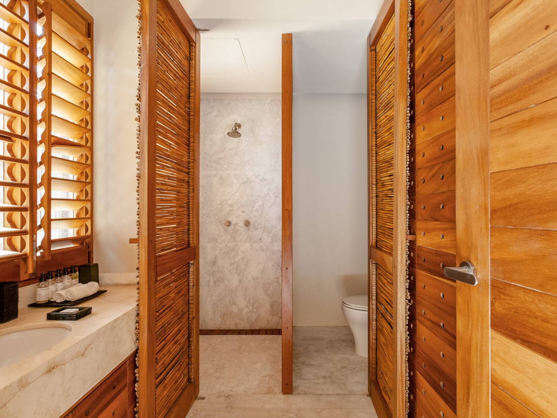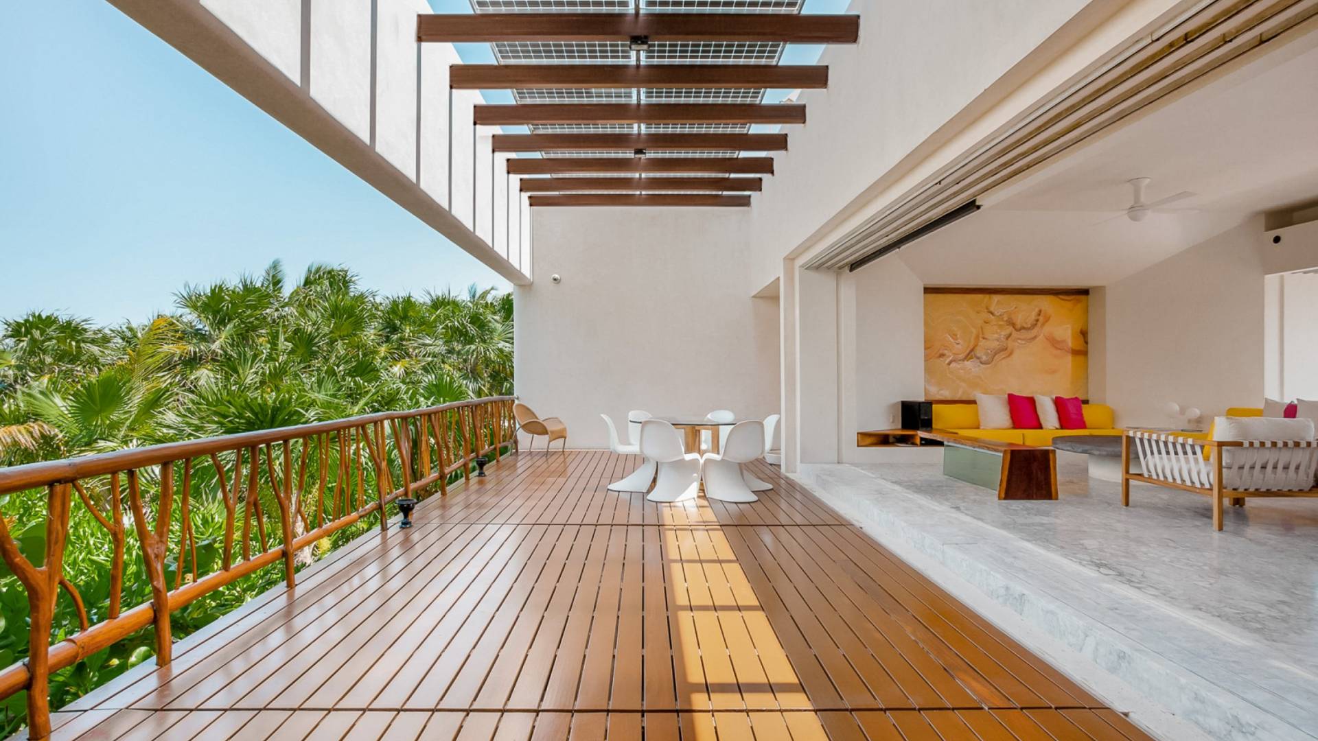 Casa Ikal Tulum is a luxury villa rental with 4 bedrooms and a private pool. The stunning beach-front villa inside the biosphere reserve of Sian Ka’an, the house has a wonderful open-plan living/dining area, fully fitted kitchen, storage room, 4 bedrooms and 5 bathrooms (4 ensuites) and plenty of exterior decks. The rooftop has hardwood decking, green roofs, and a double infinity swimming pool with fiber optics lighting, and with spectacular views of the sea, lagoon, and lush vegetation all around.
