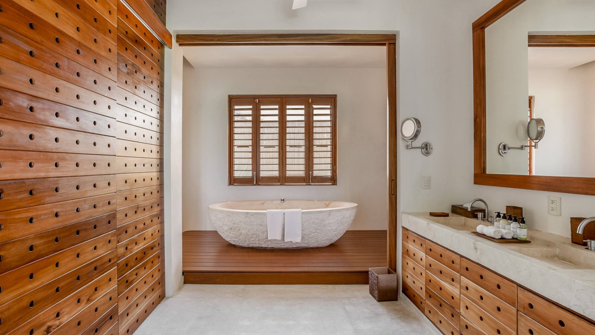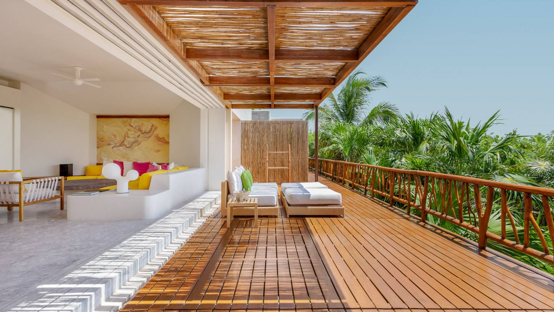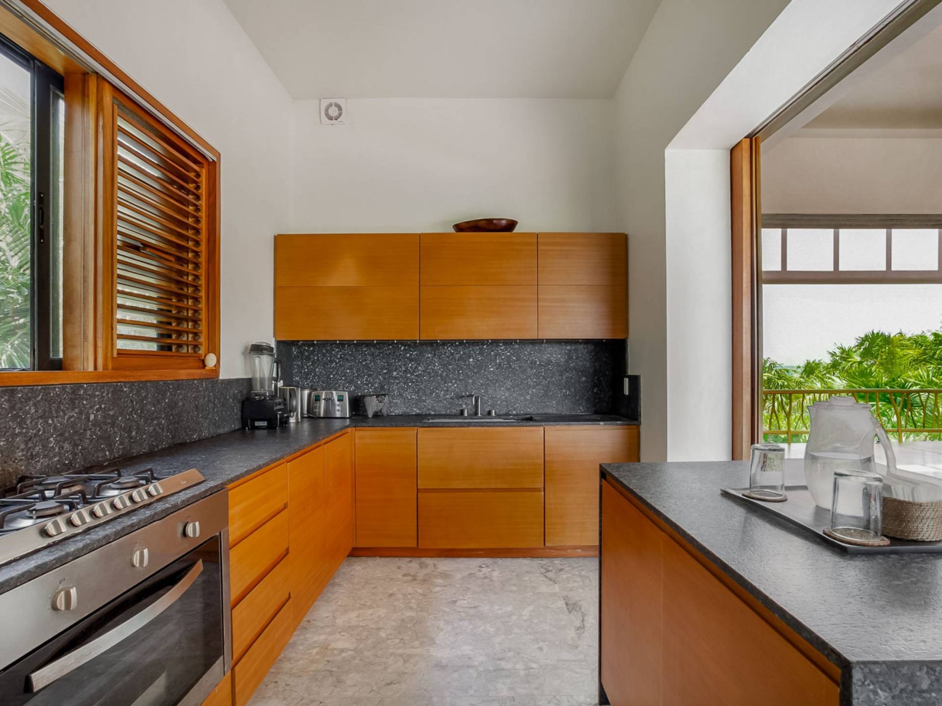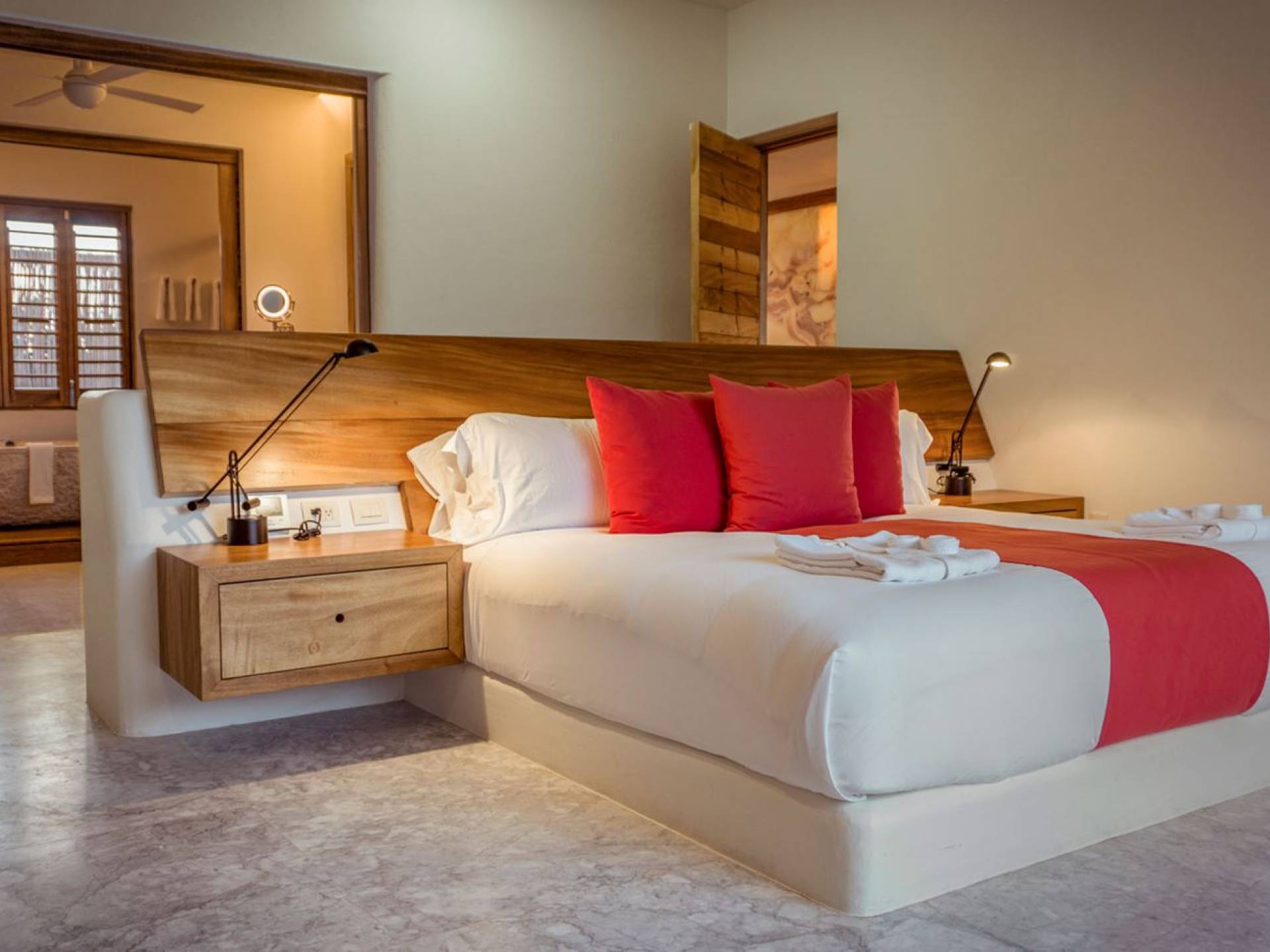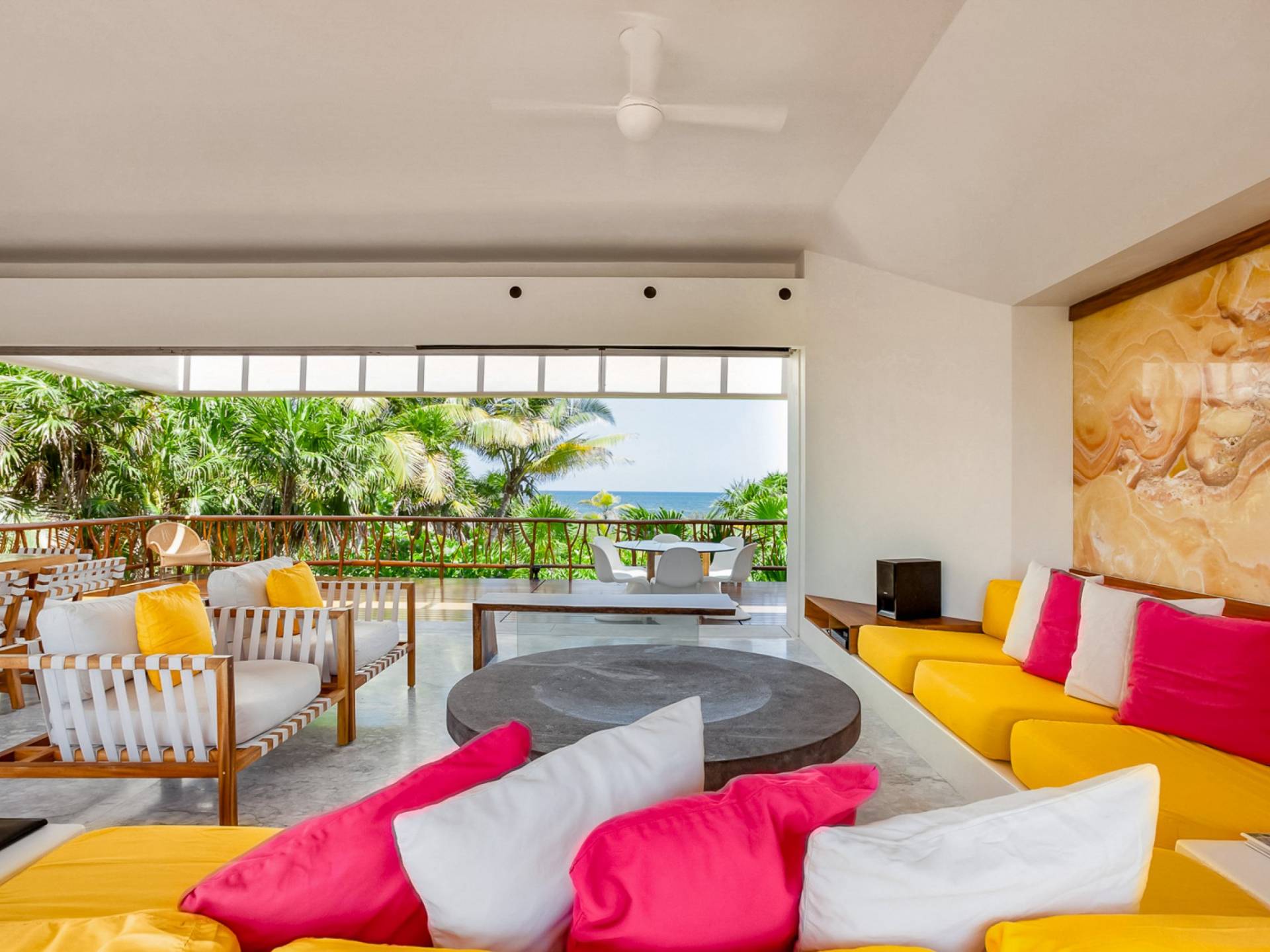 Casa Ikal Tulum is a luxury villa rental with 4 bedrooms and a private pool. The stunning beach-front villa inside the biosphere reserve of Sian Ka’an, the house has a wonderful open-plan living/dining area, fully fitted kitchen, storage room, 4 bedrooms and 5 bathrooms (4 ensuites) and plenty of exterior decks. The rooftop has hardwood decking, green roofs, and a double infinity swimming pool with fiber optics lighting, and with spectacular views of the sea, lagoon, and lush vegetation all around.