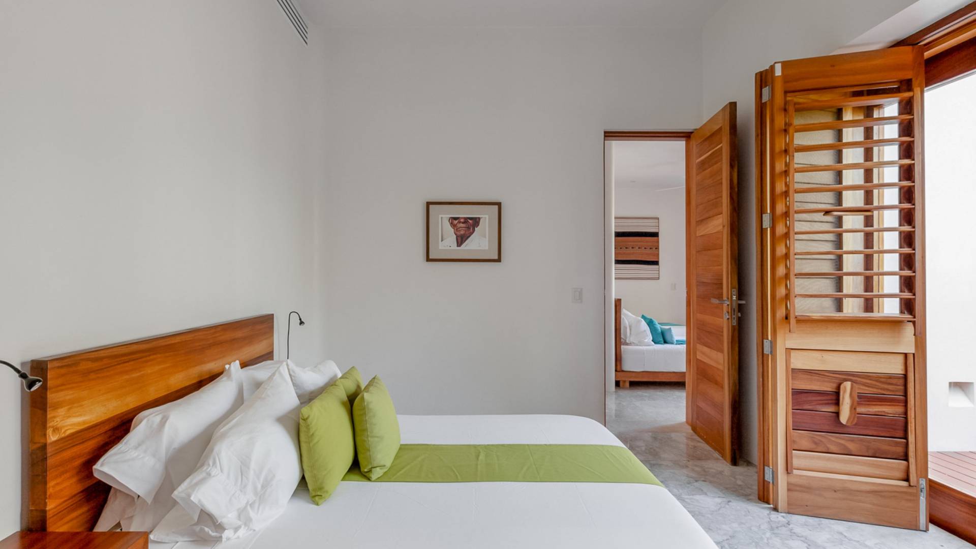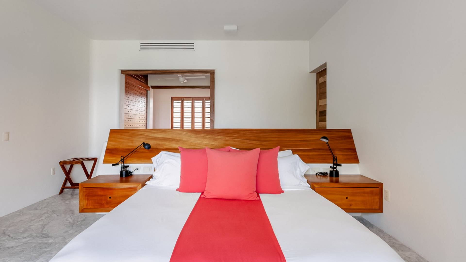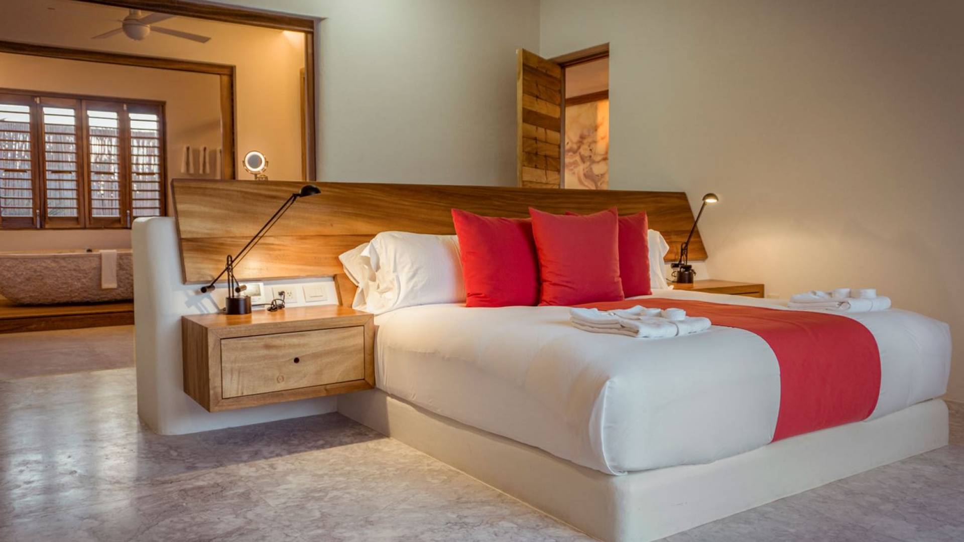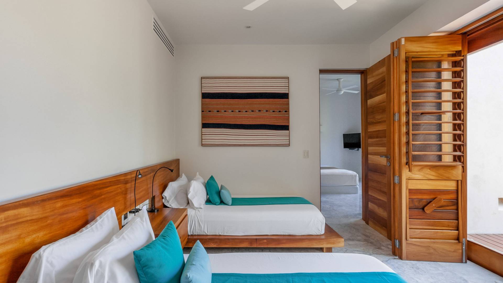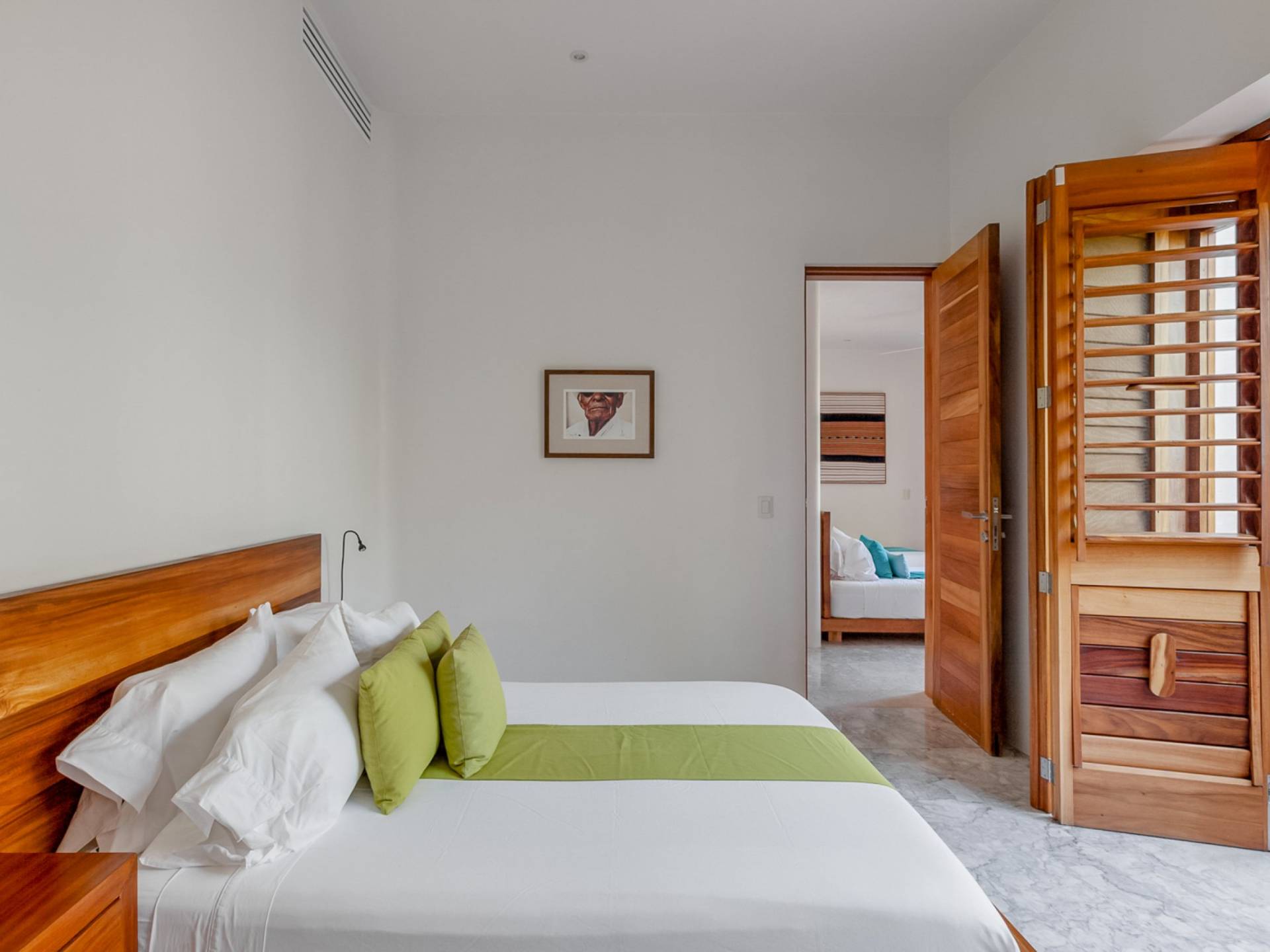Casa Ikal Tulum is a luxury villa rental with 4 bedrooms and a private pool. The stunning beach-front villa inside the biosphere reserve of Sian Ka’an, the house has a wonderful open-plan living/dining area, fully fitted kitchen, storage room, 4 bedrooms and 5 bathrooms (4 ensuites) and plenty of exterior decks. The rooftop has hardwood decking, green roofs, and a double infinity swimming pool with fiber optics lighting, and with spectacular views of the sea, lagoon, and lush vegetation all around.
