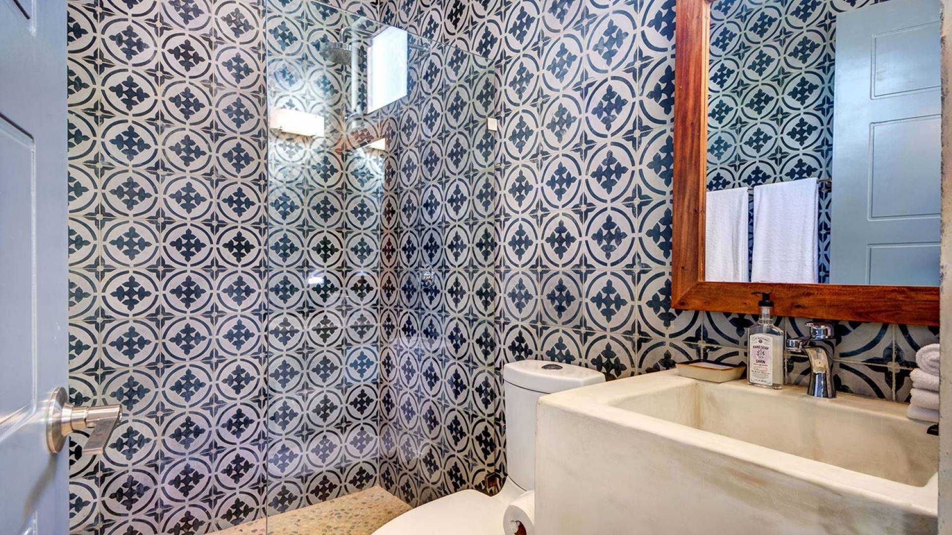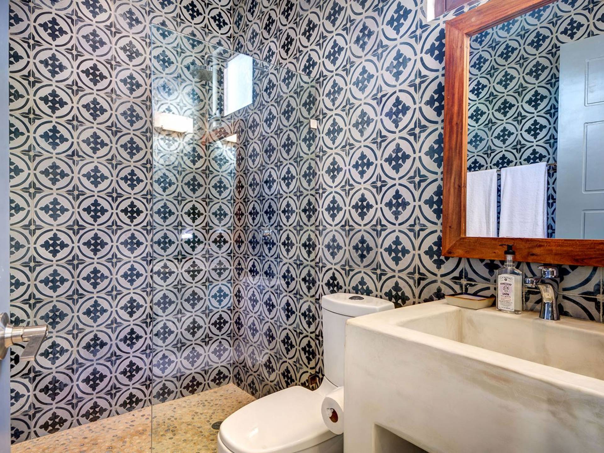 Near the street-side entrance is a private casita, separate from the main house, with its own kitchen, master bedroom, and bathroom also adorned with these unique hand-crafted tiles.