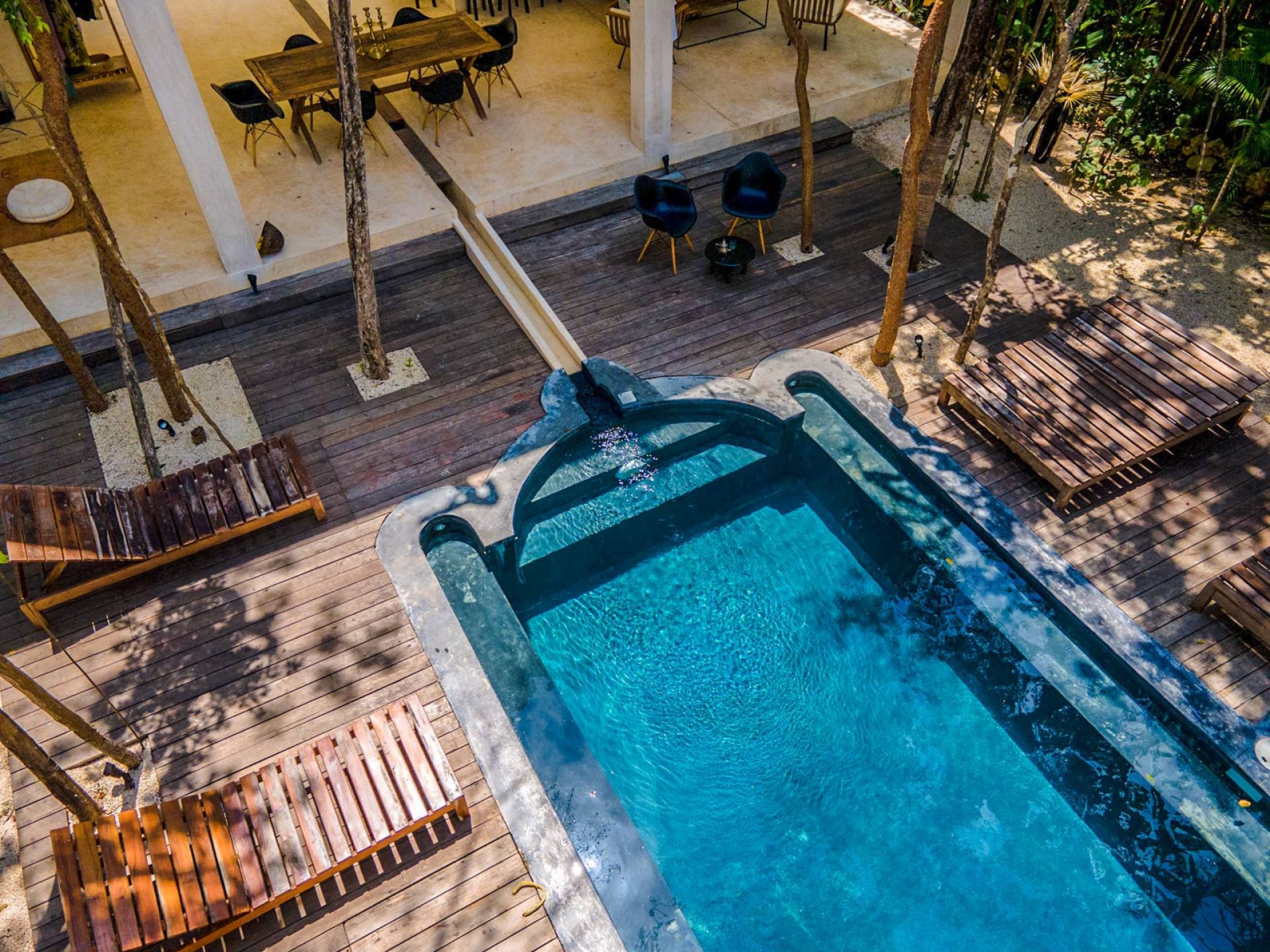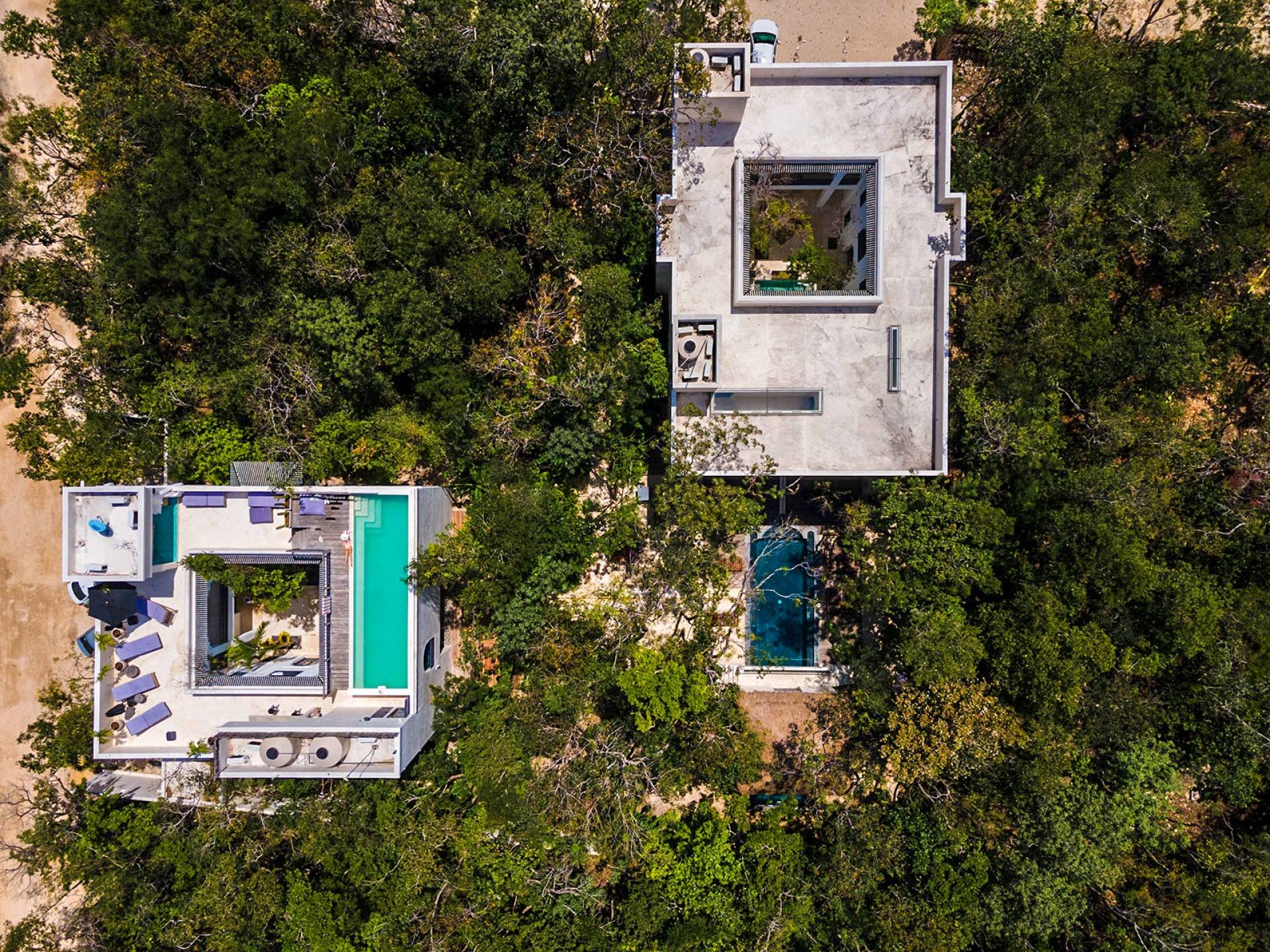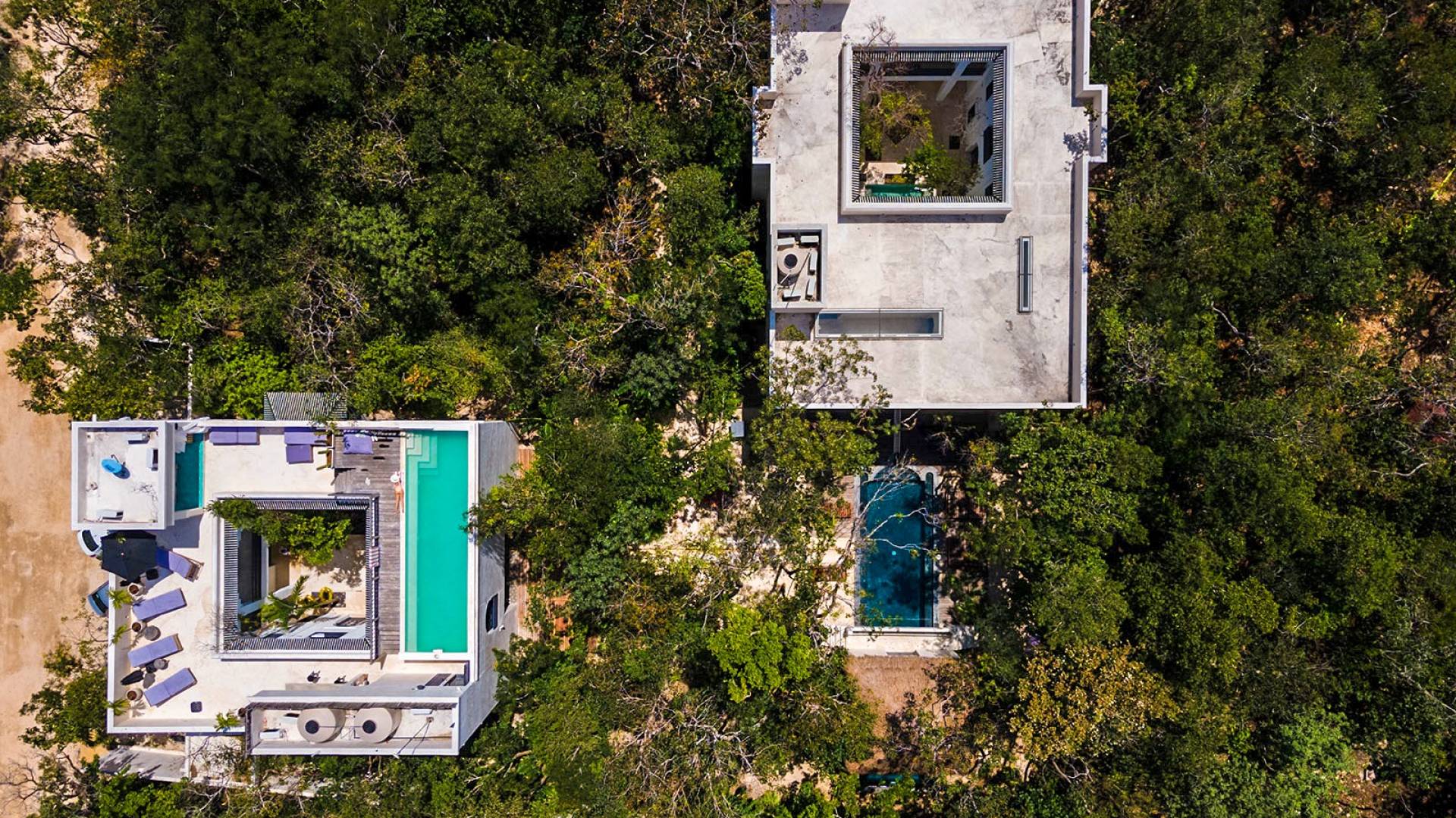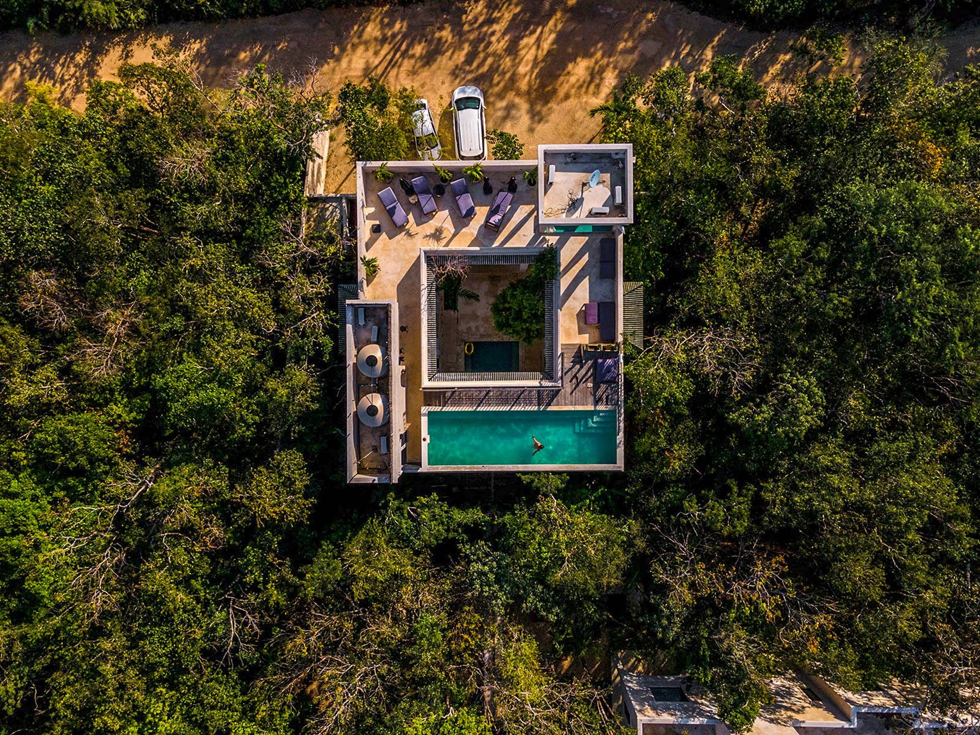 Formerly a boutique hotel, this elegant property is divided into two adjacent villas, to which you have full access upon booking. One of them has six bedrooms; the other, eight. Each of the fourteen suites has a king-size bed, a private bathroom, and a bathtub or stone jacuzzi tastefully integrated into the space. Further, both houses have their own sun lounge and swimming pool –one of them upon a rooftop terrace ideal for sunsets above the canopy.