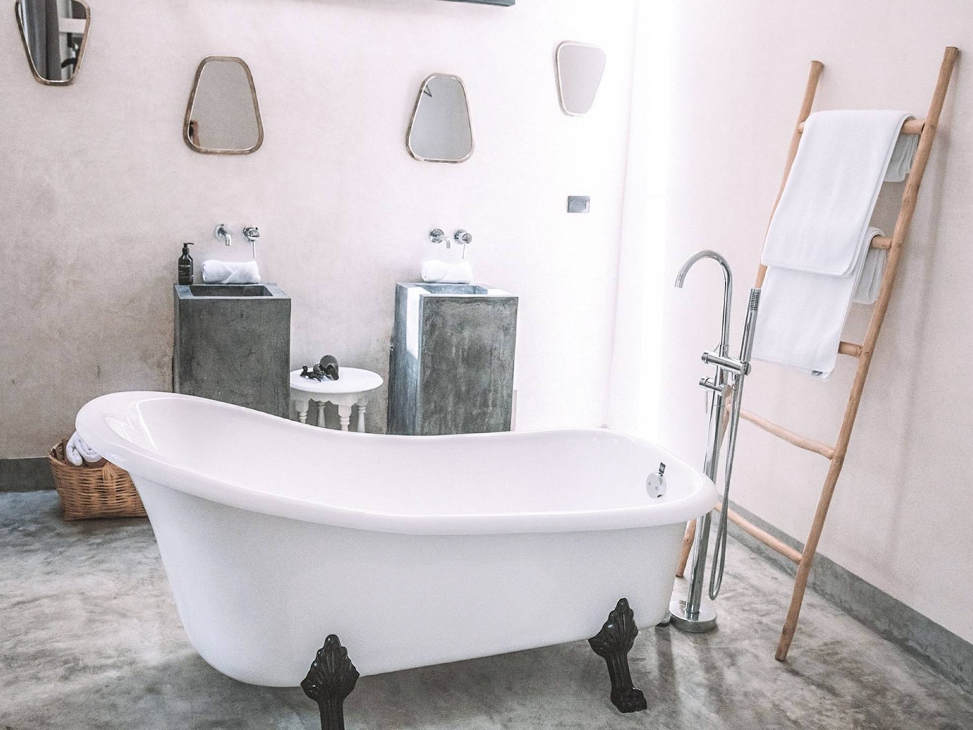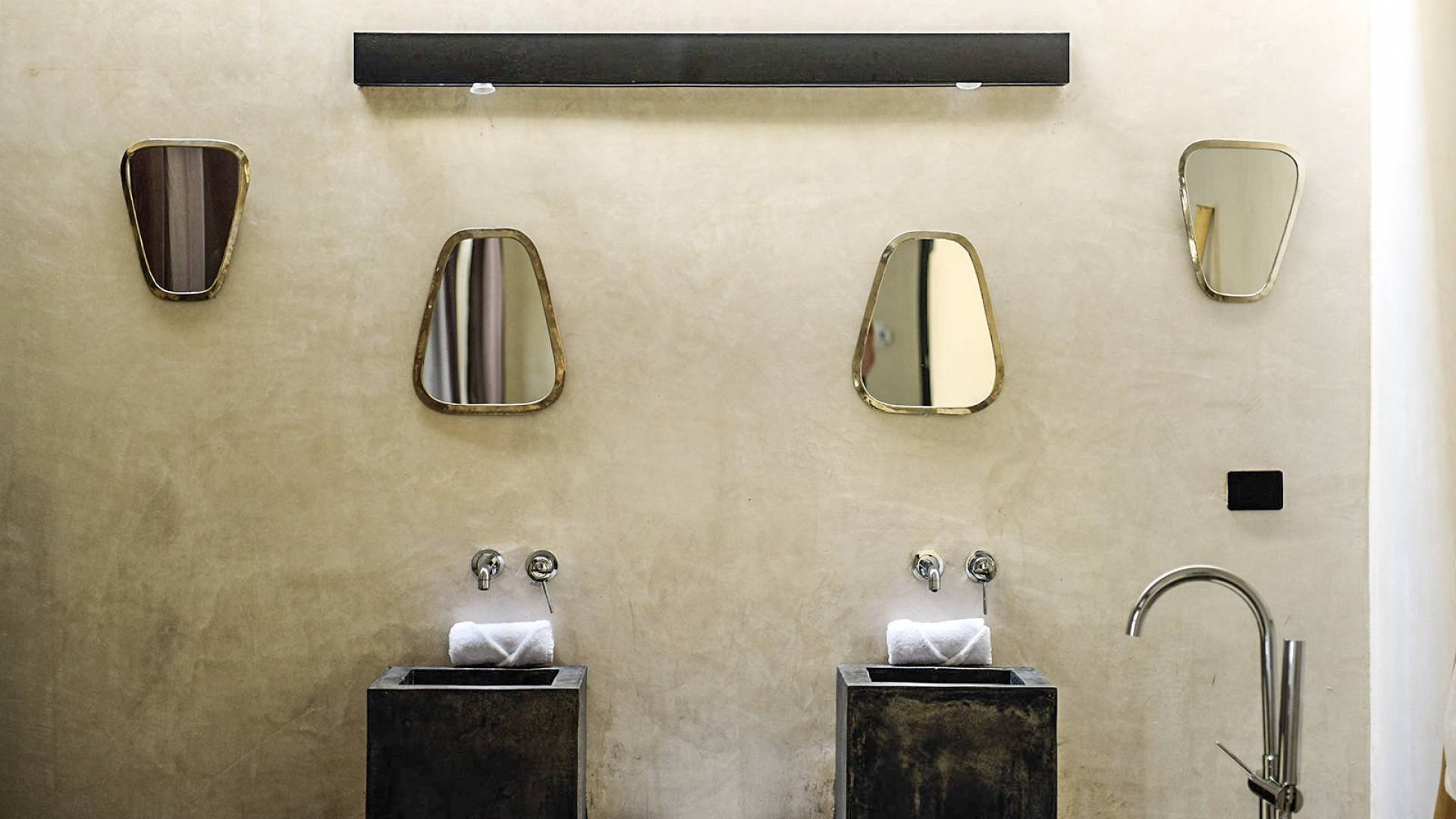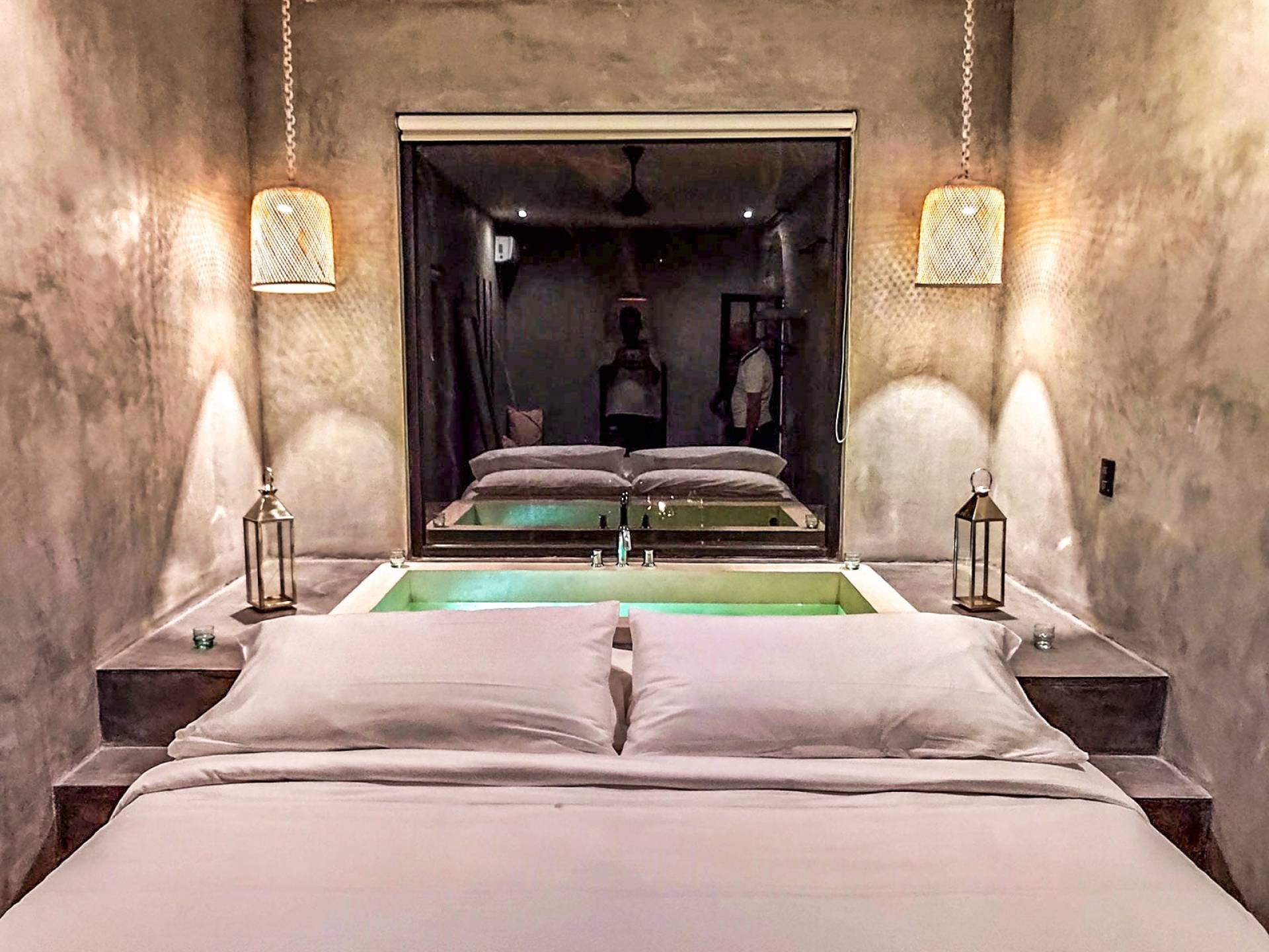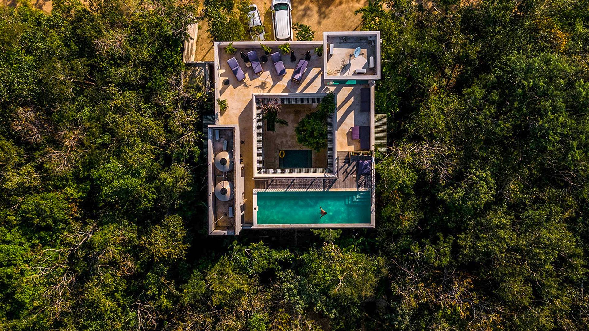 Formerly a boutique hotel, this elegant property is divided into two adjacent villas, to which you have full access upon booking. One of them has six bedrooms; the other, eight. Each of the fourteen suites has a king-size bed, a private bathroom, and a bathtub or stone jacuzzi tastefully integrated into the space. Further, both houses have their own sun lounge and swimming pool –one of them upon a rooftop terrace ideal for sunsets above the canopy.