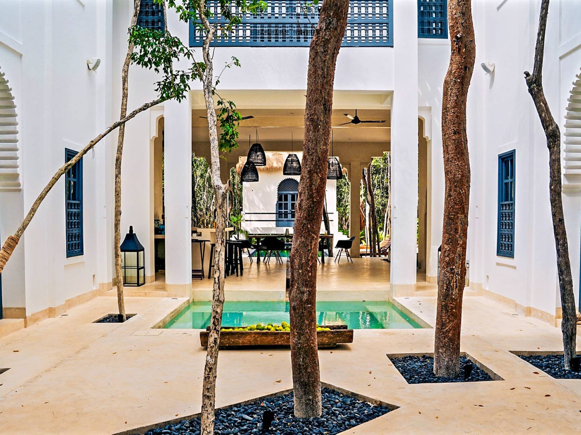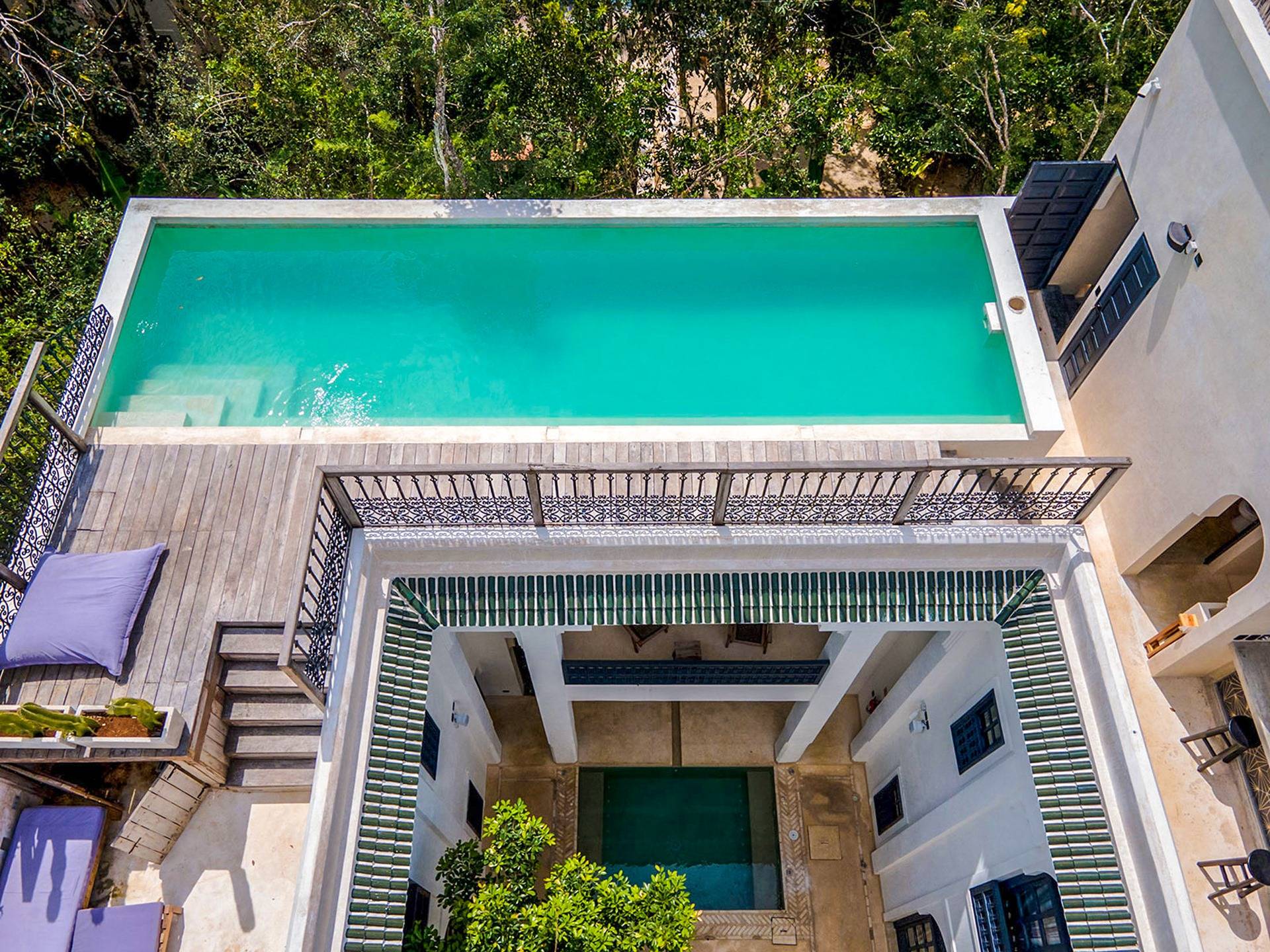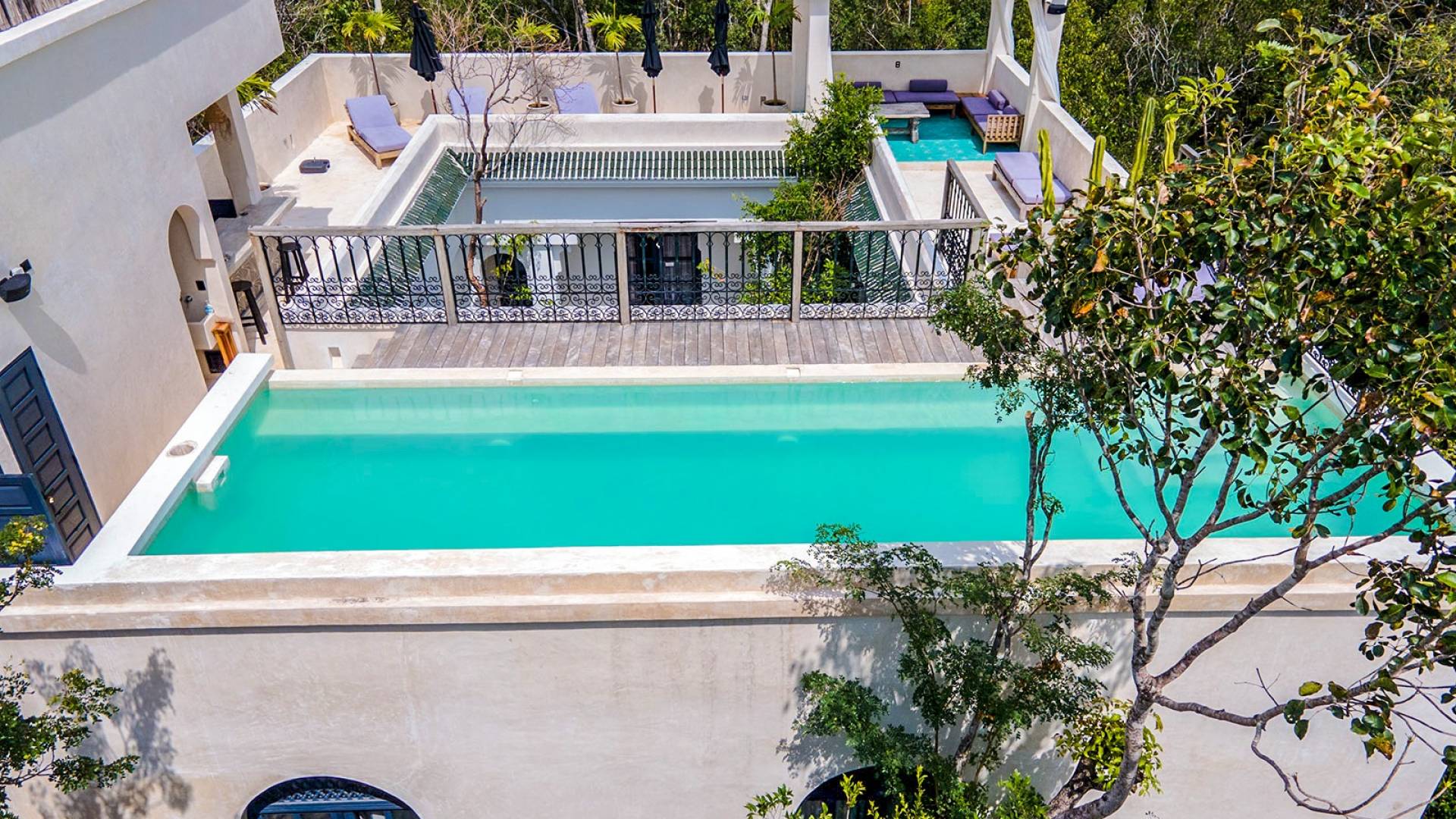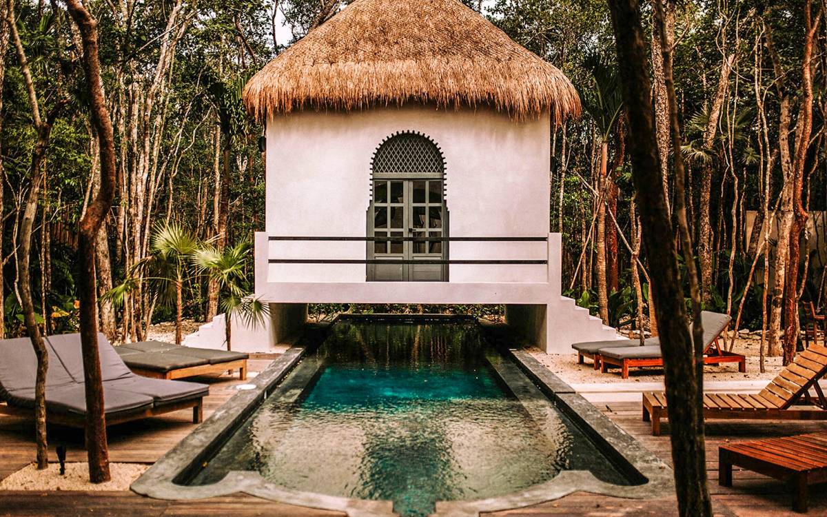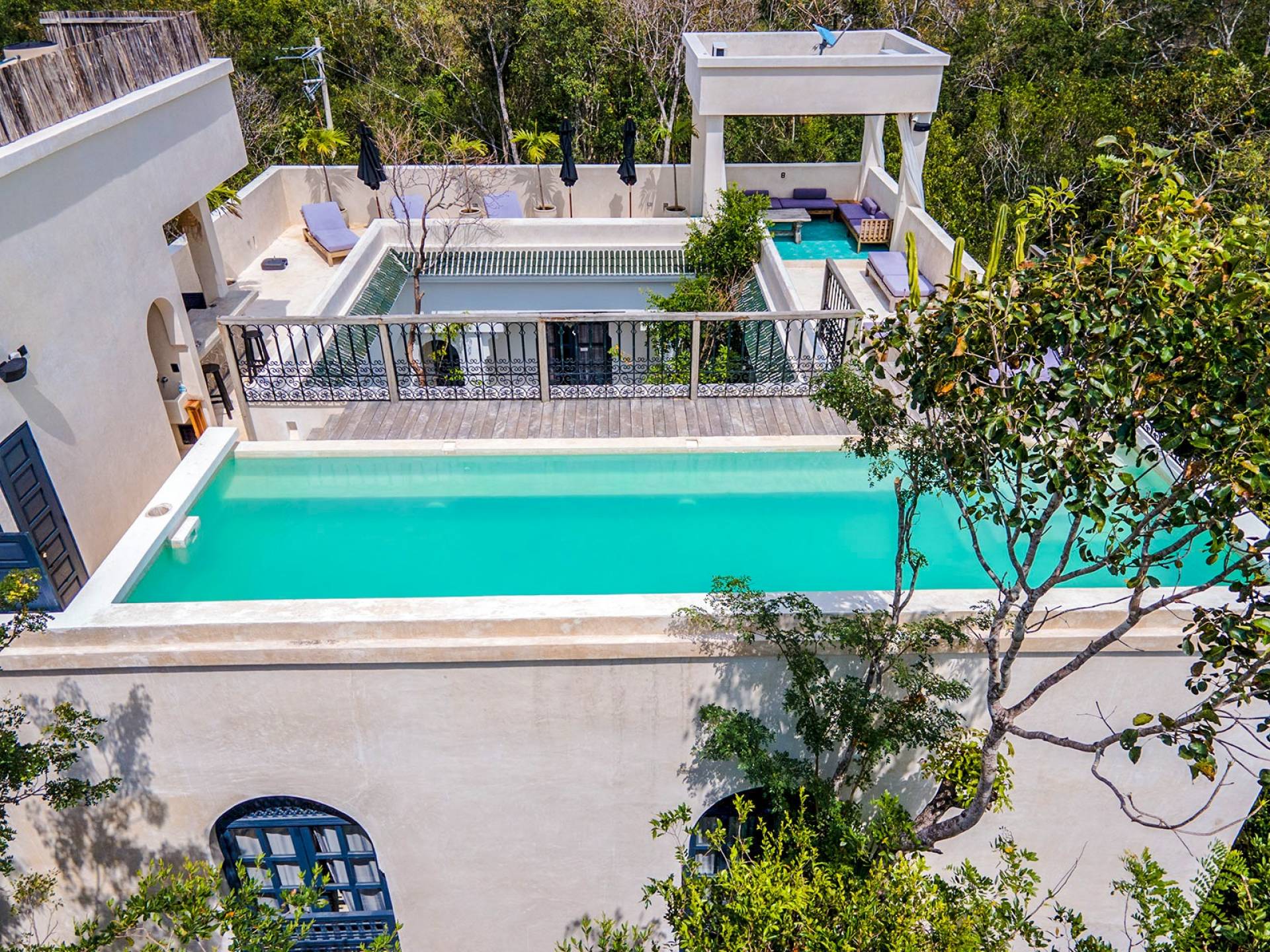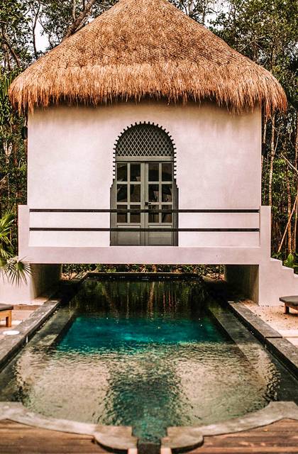 Like a Moorish castle in the middle of the jungle, this 14-bedroom residence in Tulum fuses Mexican-Moroccan design and a Caribbean vibe. Soft lines, round arches, stucco work, and jacuzzis for central fountain combine with top-level amenities to create a sophisticated riad in a tropical landscape.