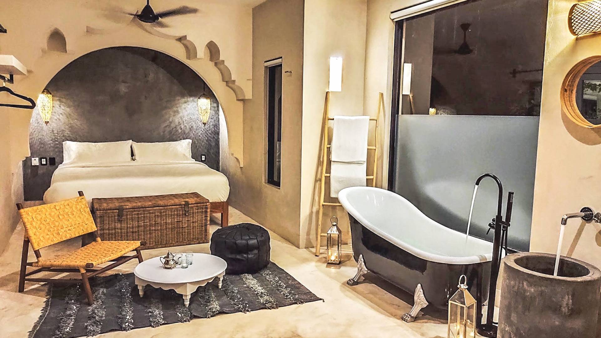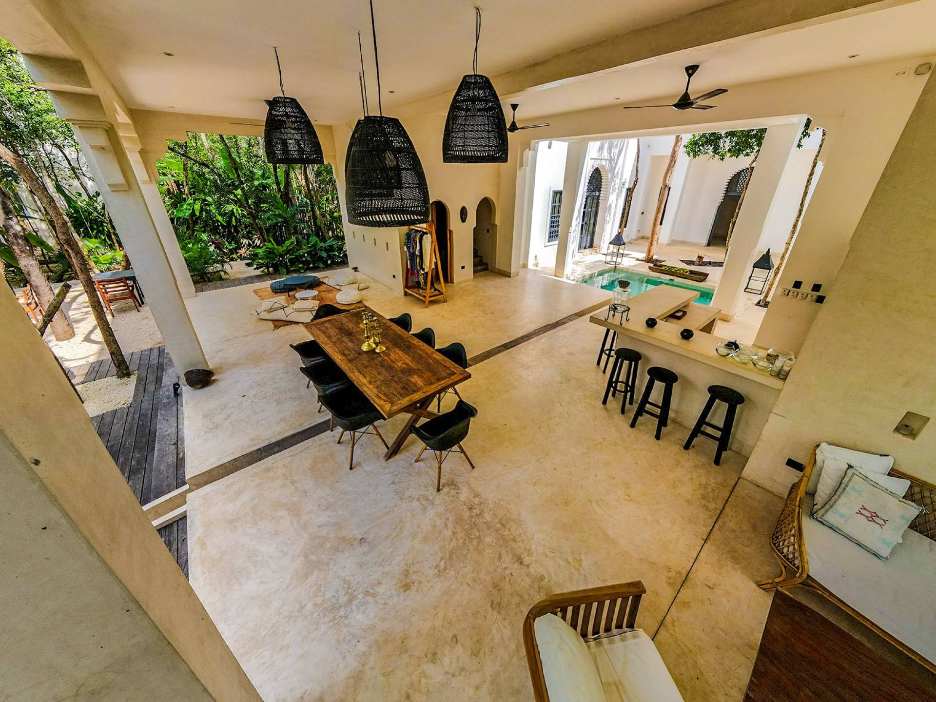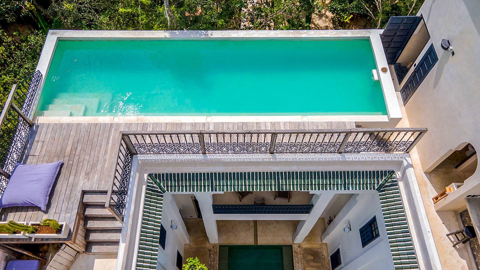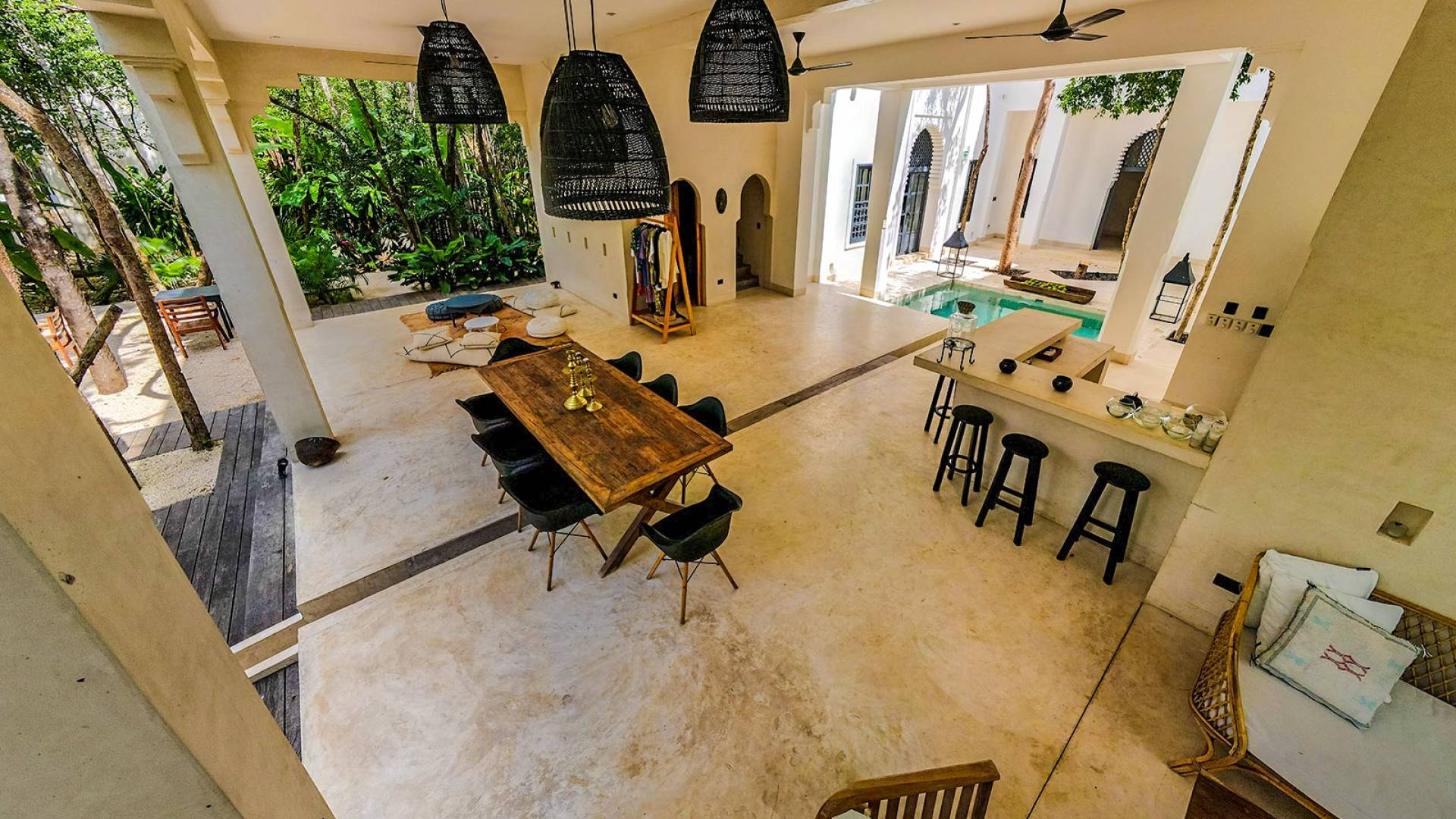 Like a Moorish castle in the middle of the jungle, this 14-bedroom residence in Tulum fuses Mexican-Moroccan design and a Caribbean vibe. Soft lines, round arches, stucco work, and jacuzzis for central fountain combine with top-level amenities to create a sophisticated riad in a tropical landscape.